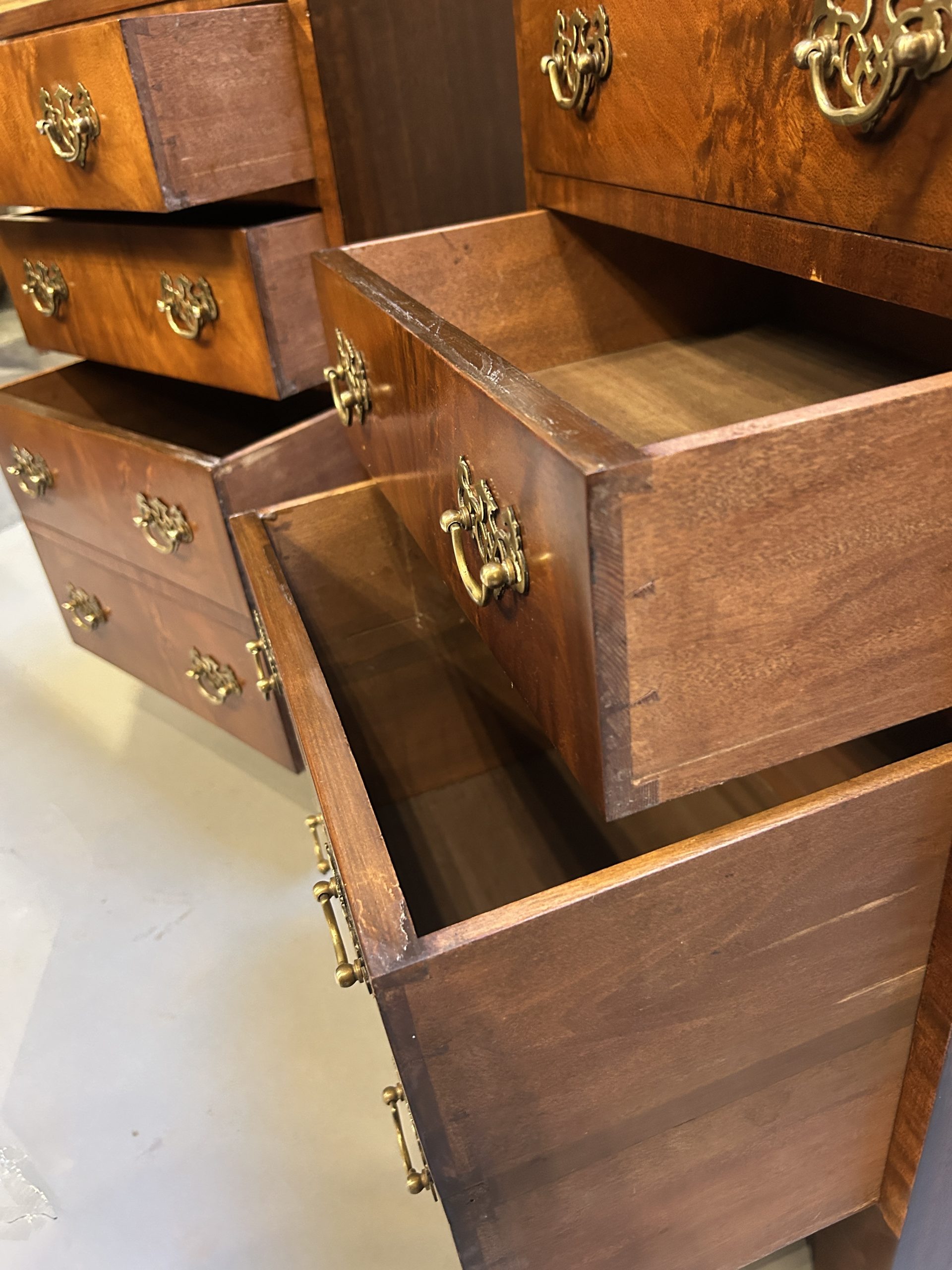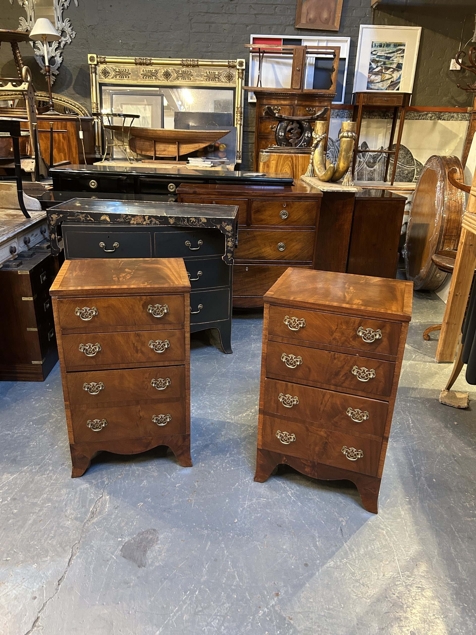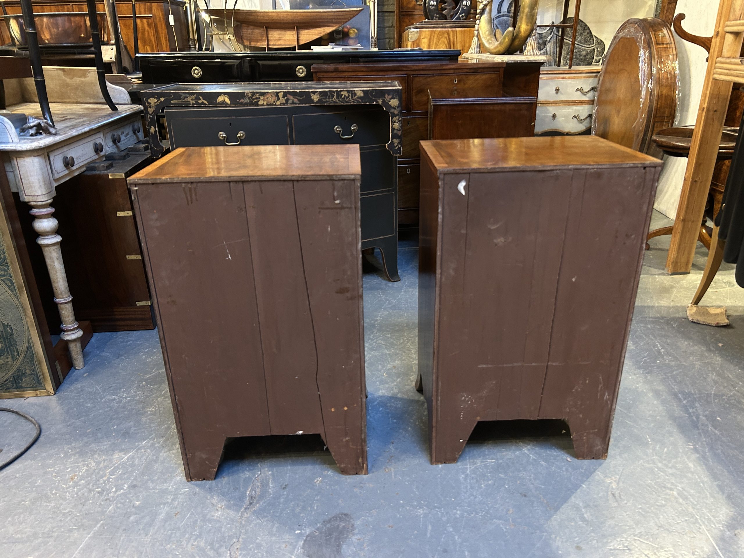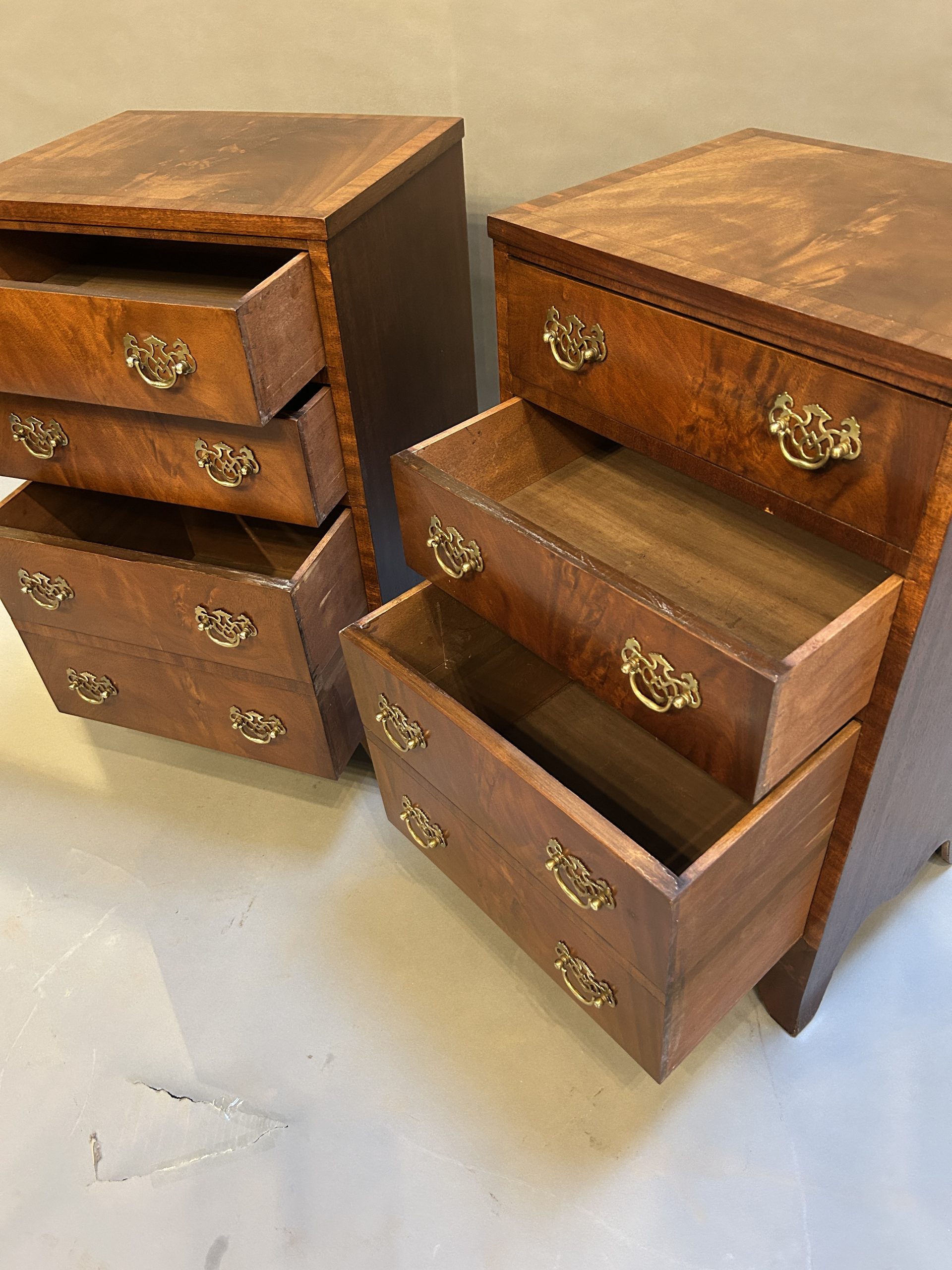 A pair of figured mahogany bedside chests the crossbanded tops over arrangement of graduated drawers with fret cut plate handles, raised on shaped apron and bracket feet.