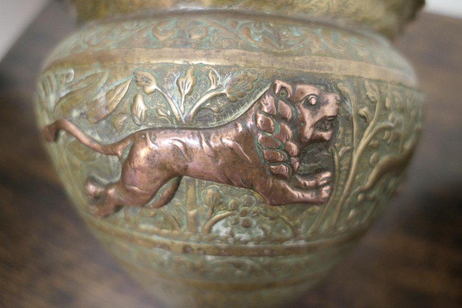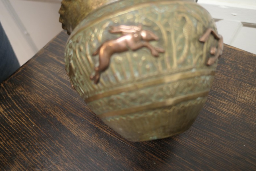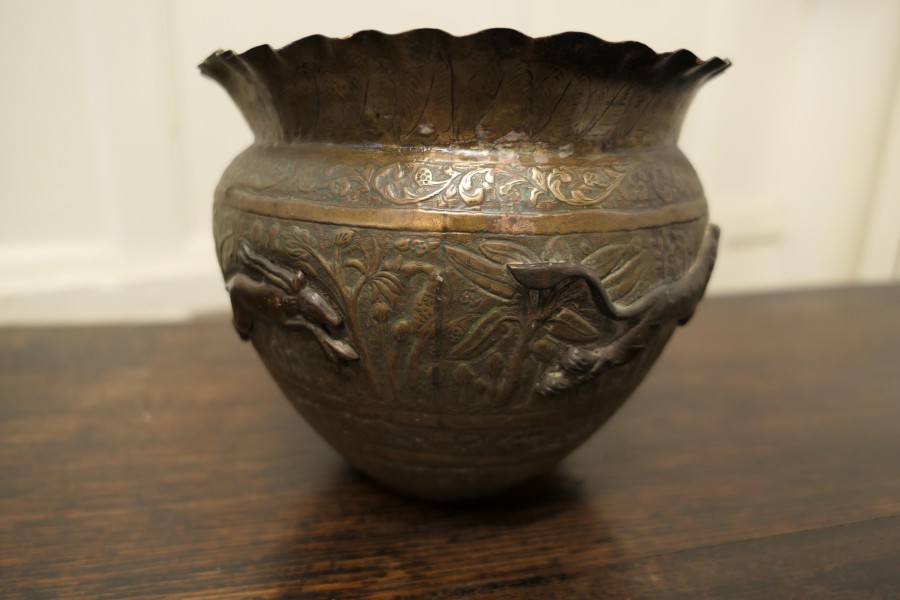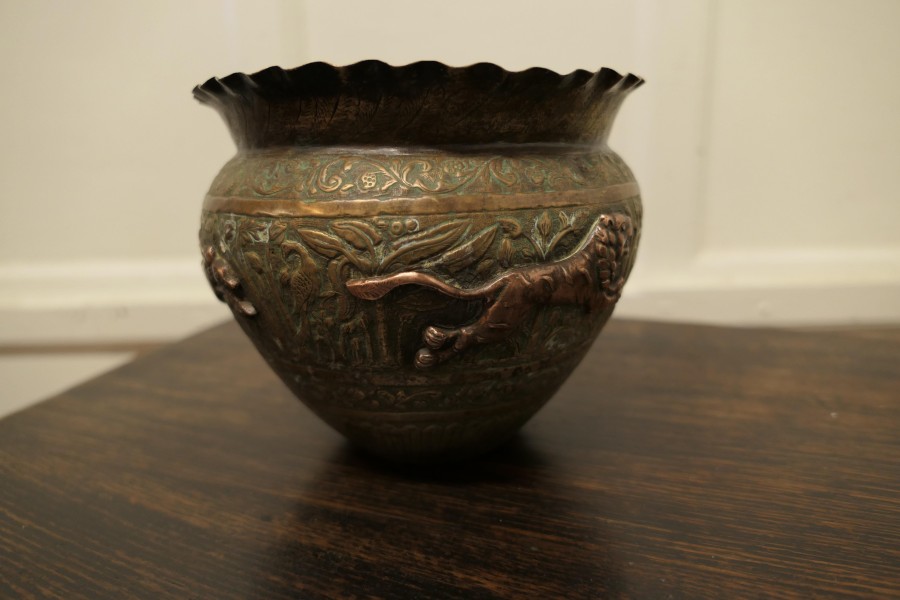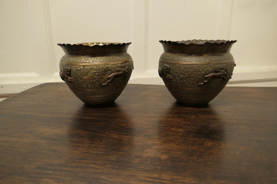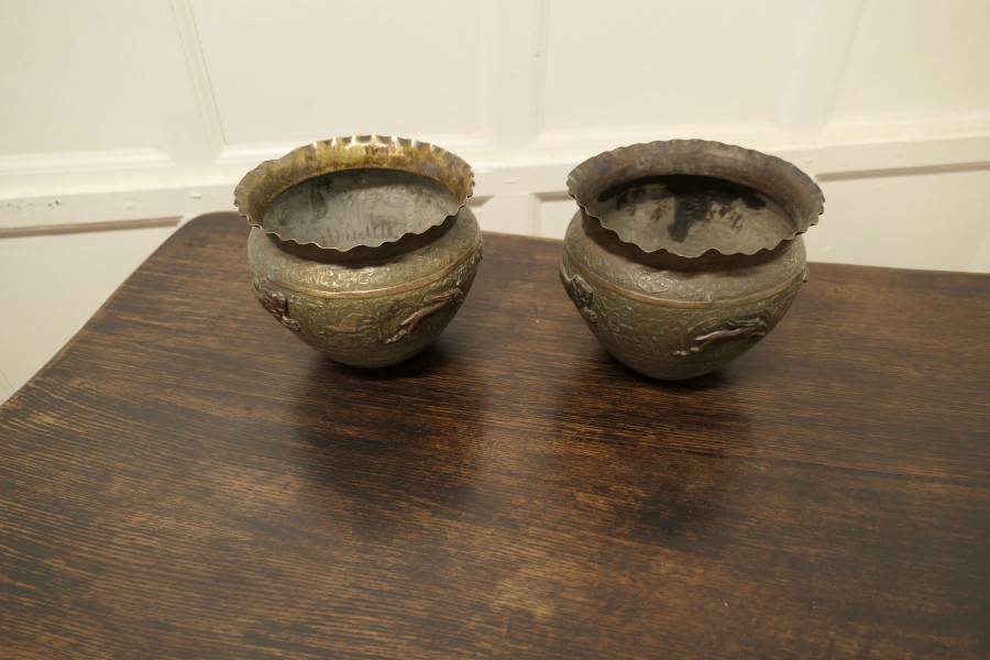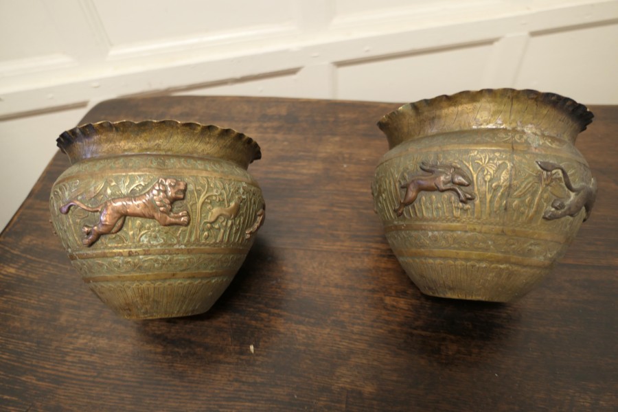 A pair of 19th century North African brass and copper Jardiniere pots These are superb hand made pieces, they are embossed and decorated with lively copper animals The pots have a waved collar The pots are wonderful looking pieces with natural patination In good antique condition for their age they are 7” high and 8” in diameter WD176. Manufacture Date : 1900 Materials : Brass
