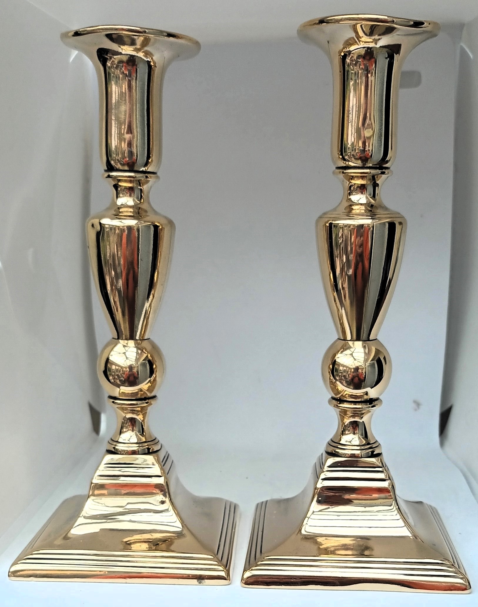 Timeless Georgian elegance ~ A really attractive Pair of Late 18th Century Antique English Georgian Brass Candlesticks, with that soft mellow colour that only comes from decades of hand polishing. Vase shaped columns rising from stepped and chamfered square bases, their internal wire push-ejectors still in working order.