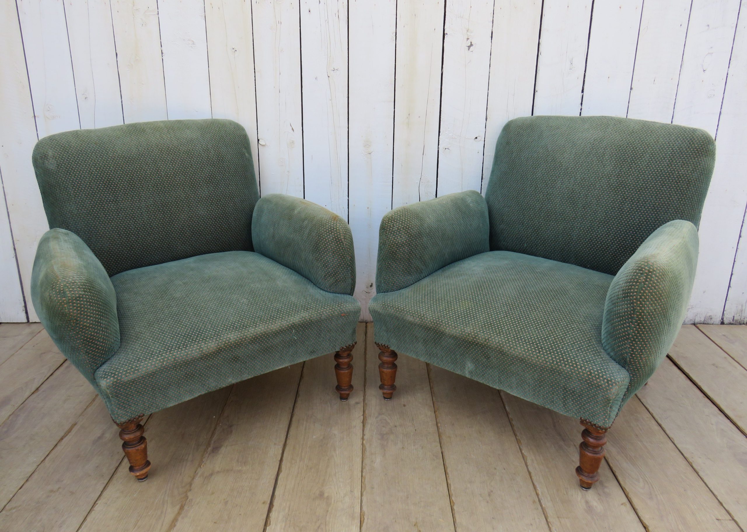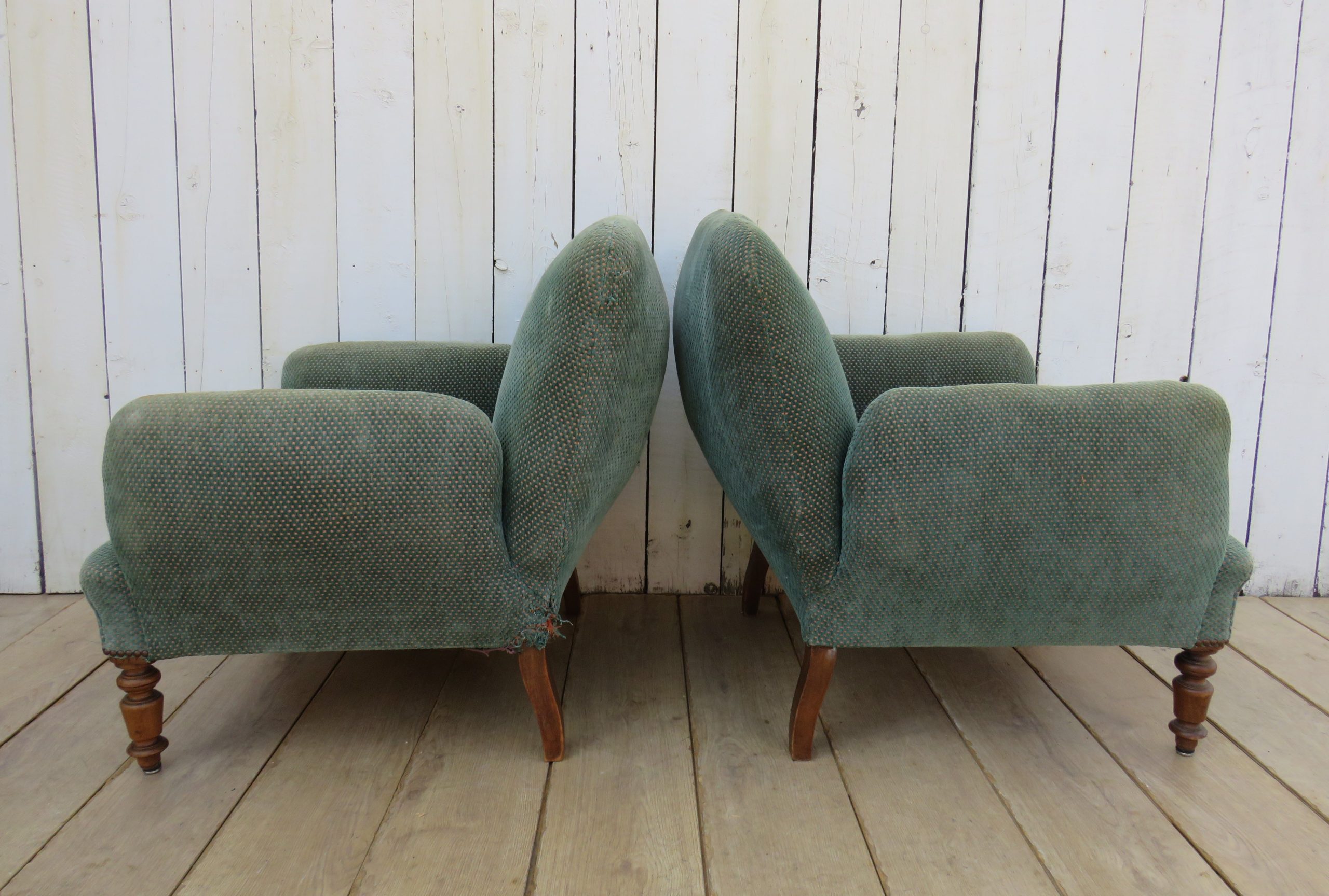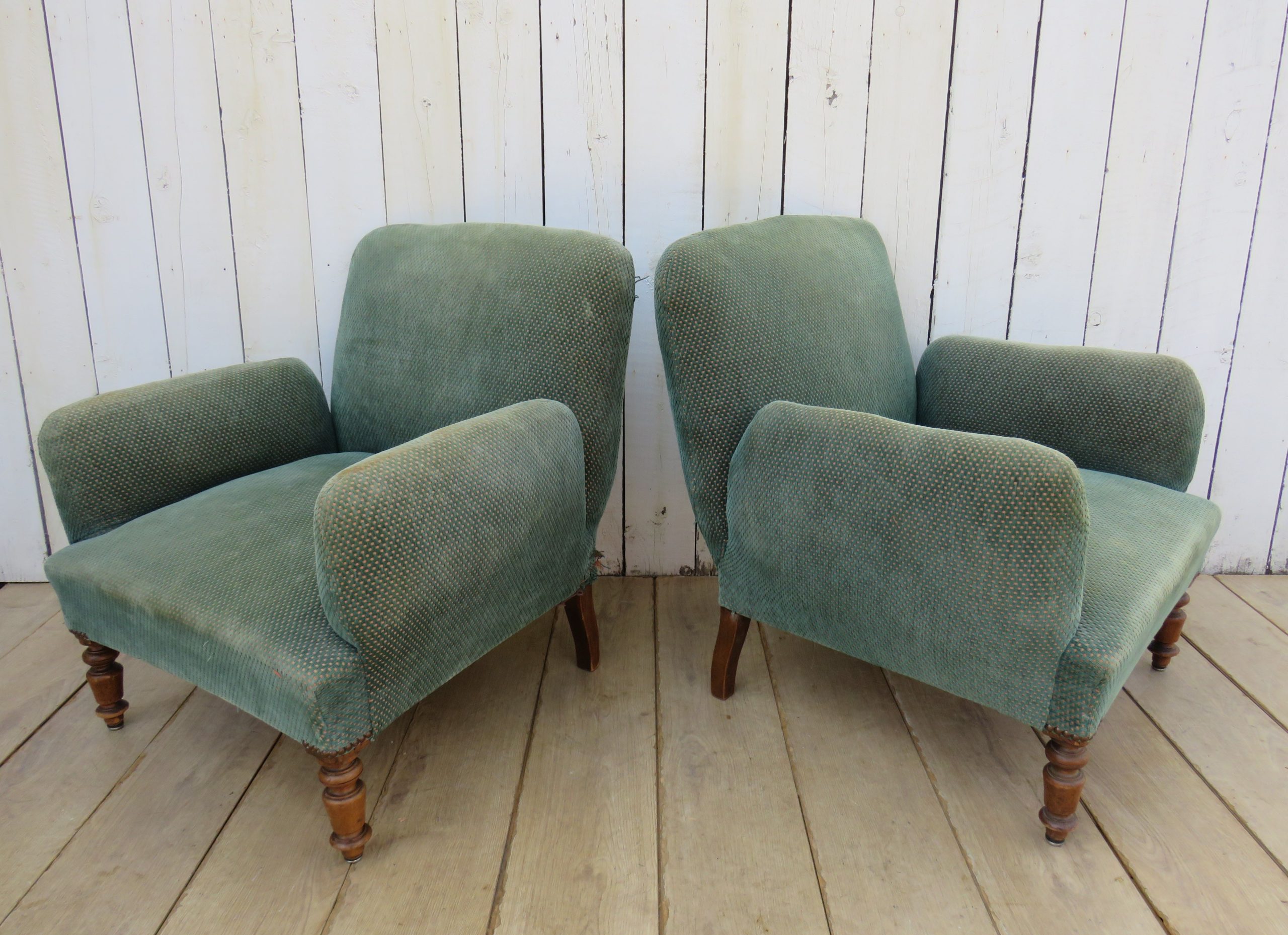 Shapely pair of sound, sturdy and sprung 19th century French fireside Napoleon III chauffeuse armchairs on oak legs for re-upholstery. Height 72cm, width 76cm, depth 74cm, seat height 38cm, seat depth 50cm.