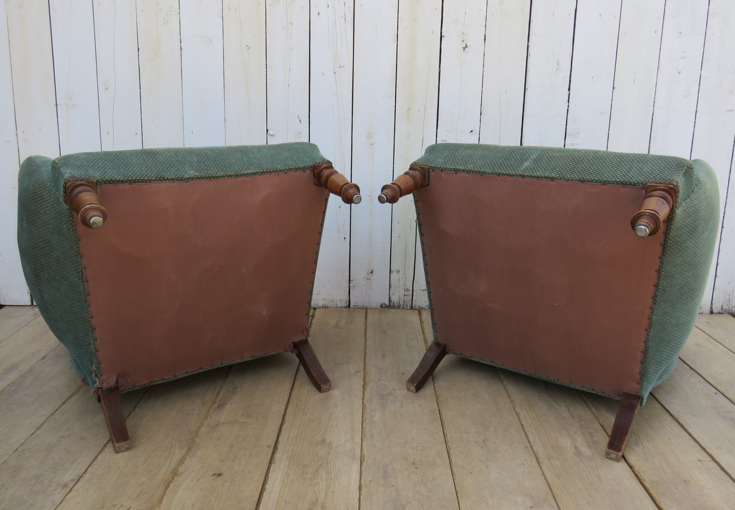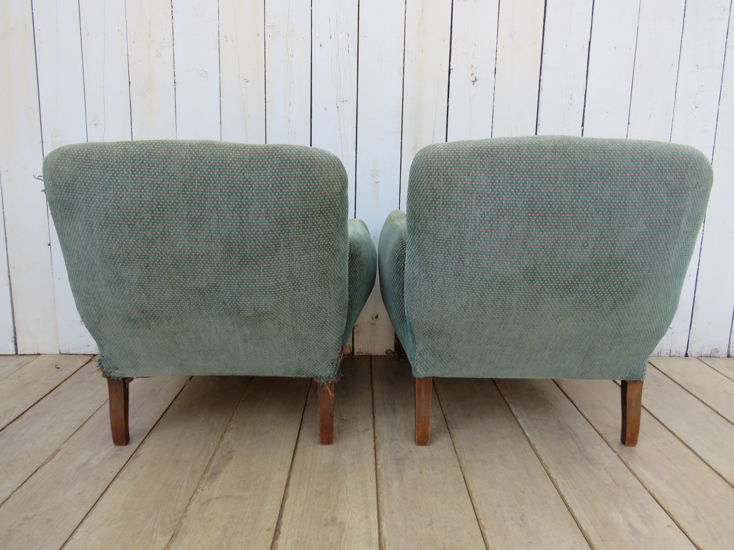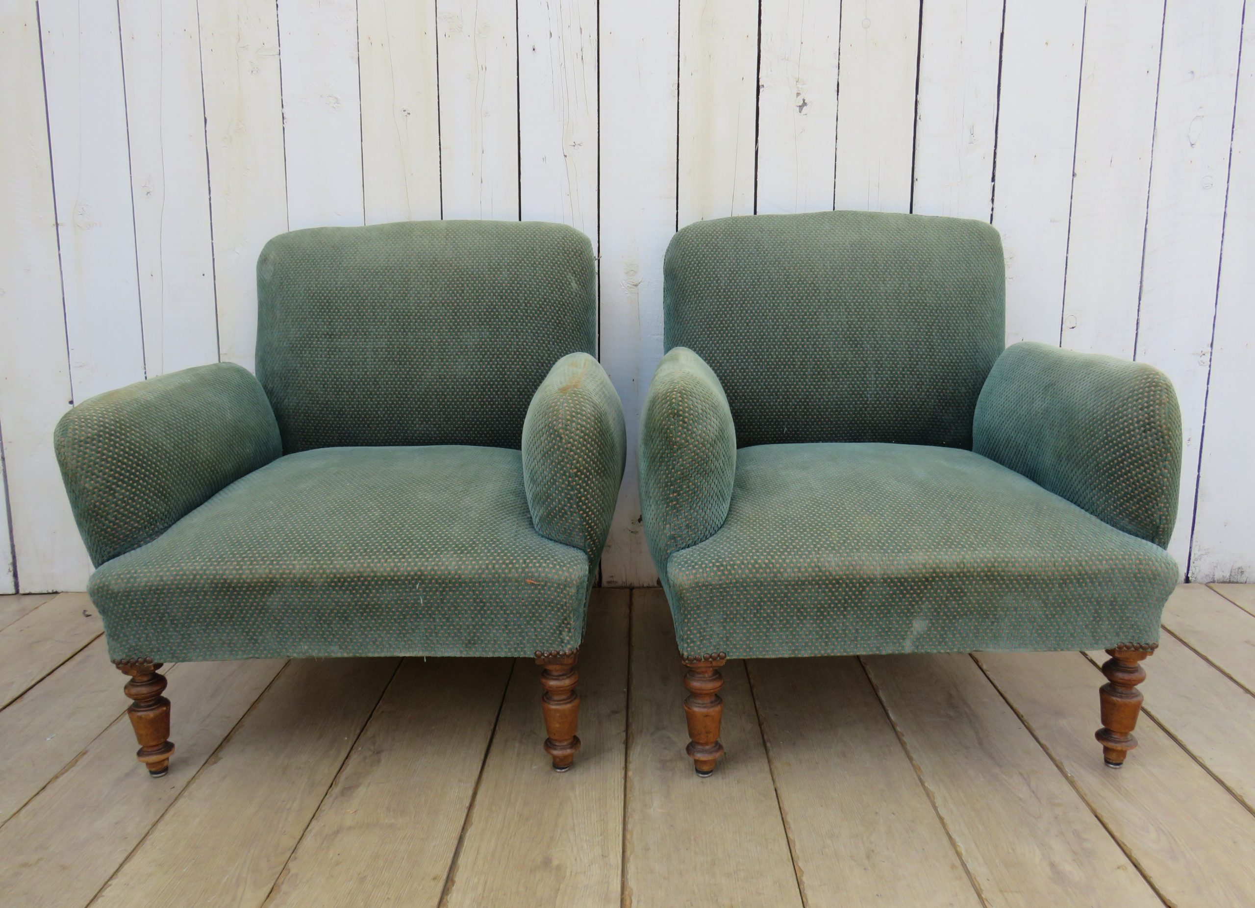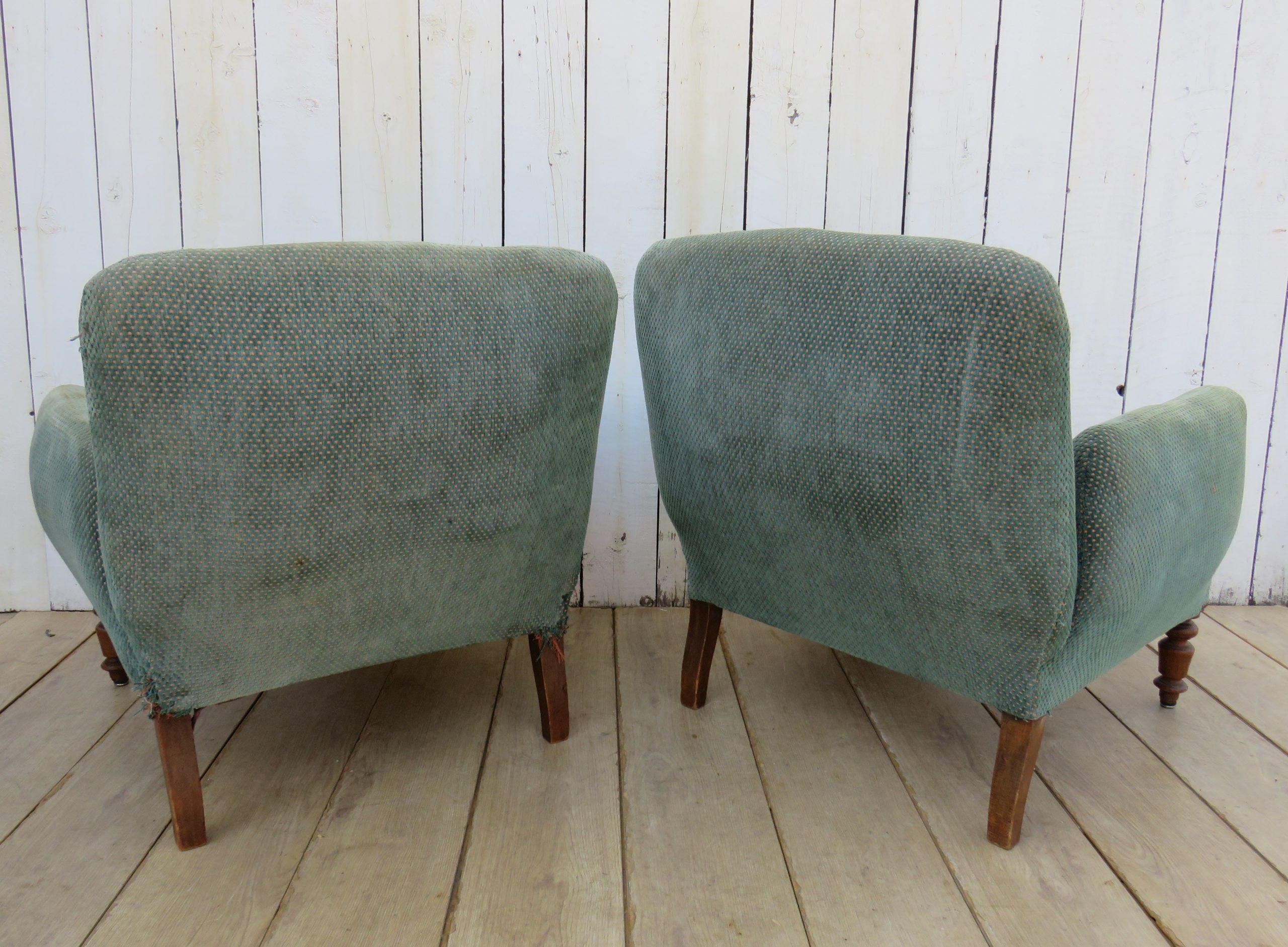 Shapely pair of sound, sturdy and sprung 19th century French fireside Napoleon III chauffeuse armchairs on oak legs for re-upholstery. Height 72cm, width 76cm, depth 74cm, seat height 38cm, seat depth 50cm.