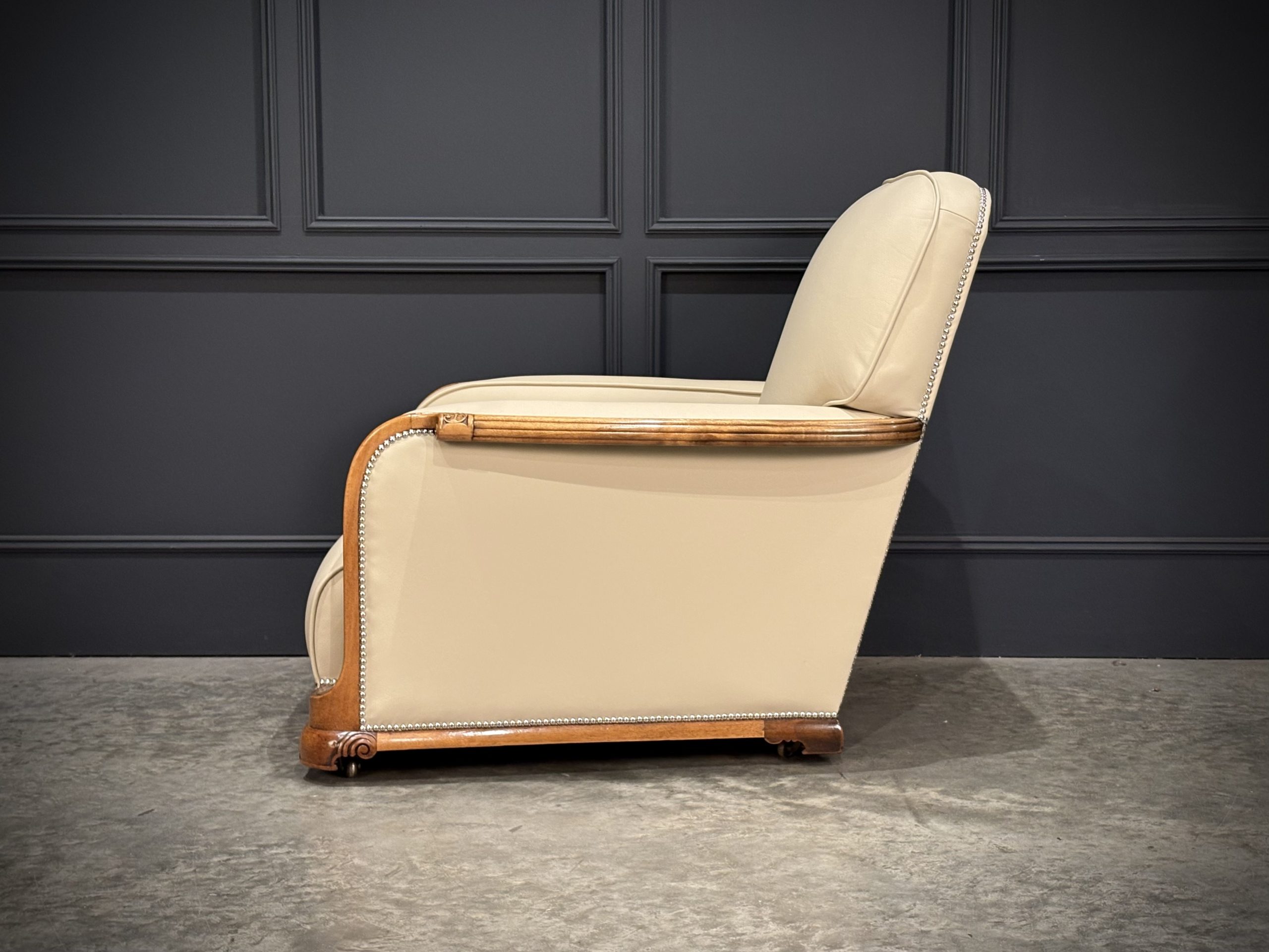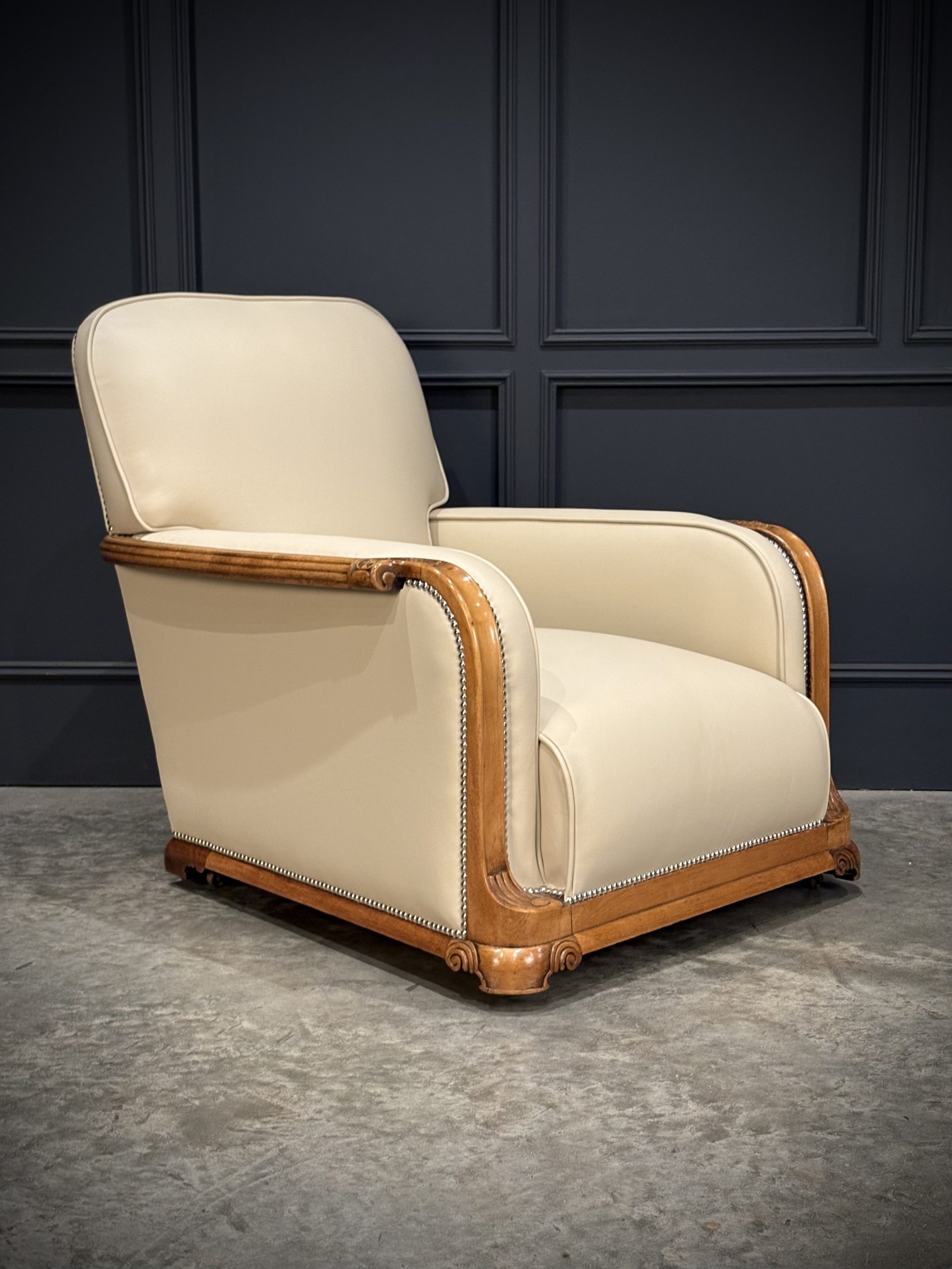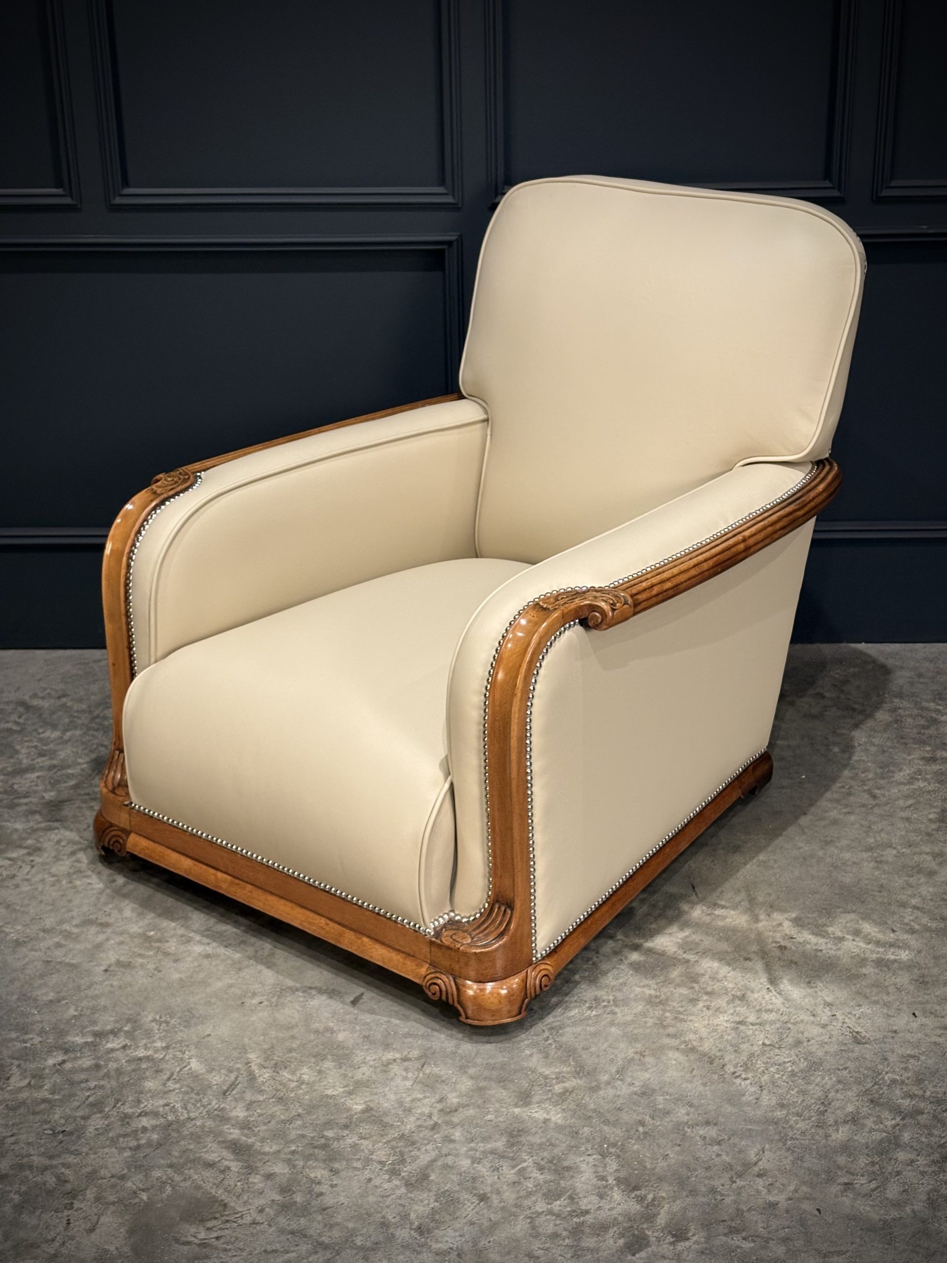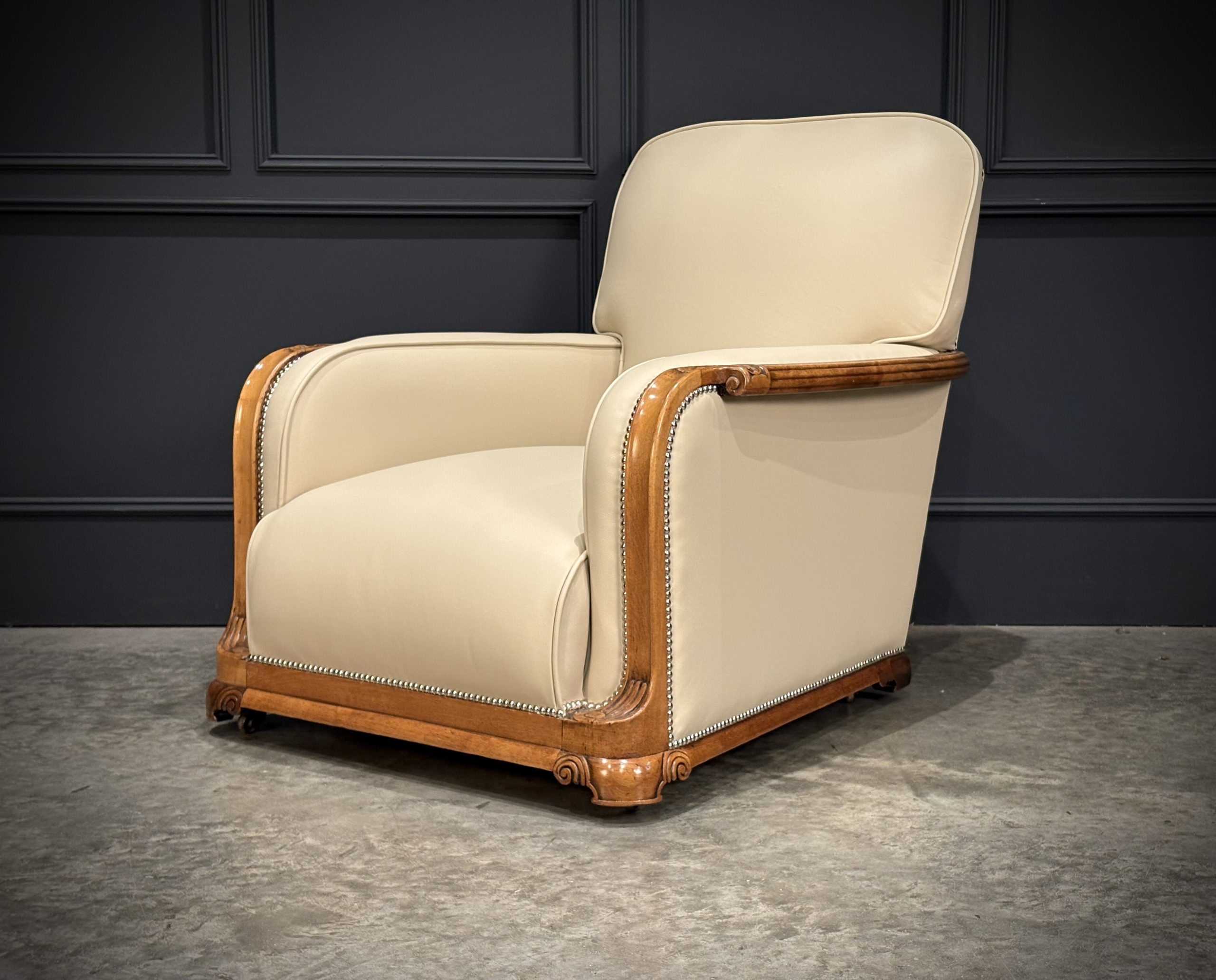 This exceptional pair of Art Deco armchairs , dating from the 1930s, combines timeless style with comfort. The beautifully crafted walnut frames feature intricate carved detailing, while the chairs elegant design is further enhanced by the newly upholstered, thick quality cream leather with a striking chrome studded trim.