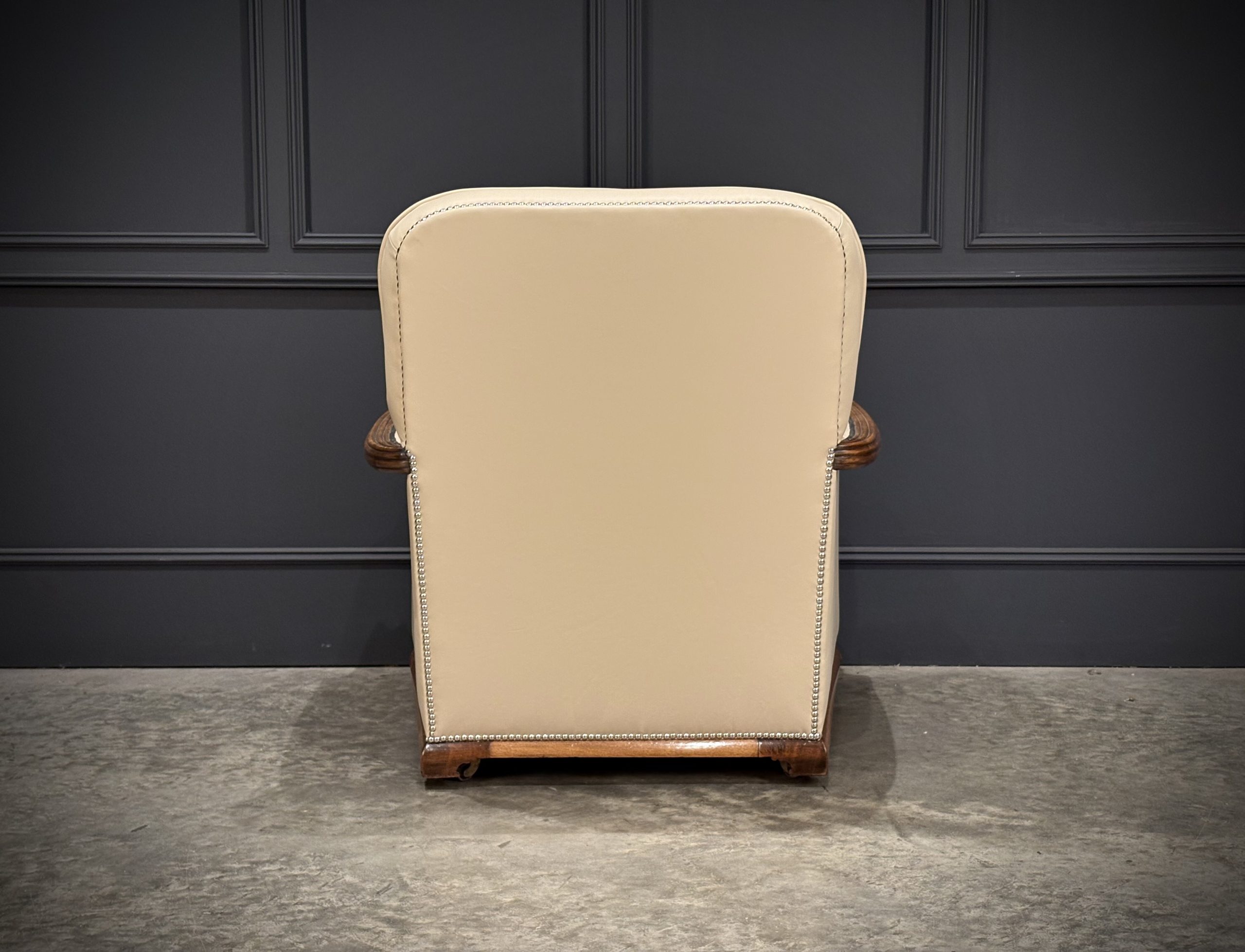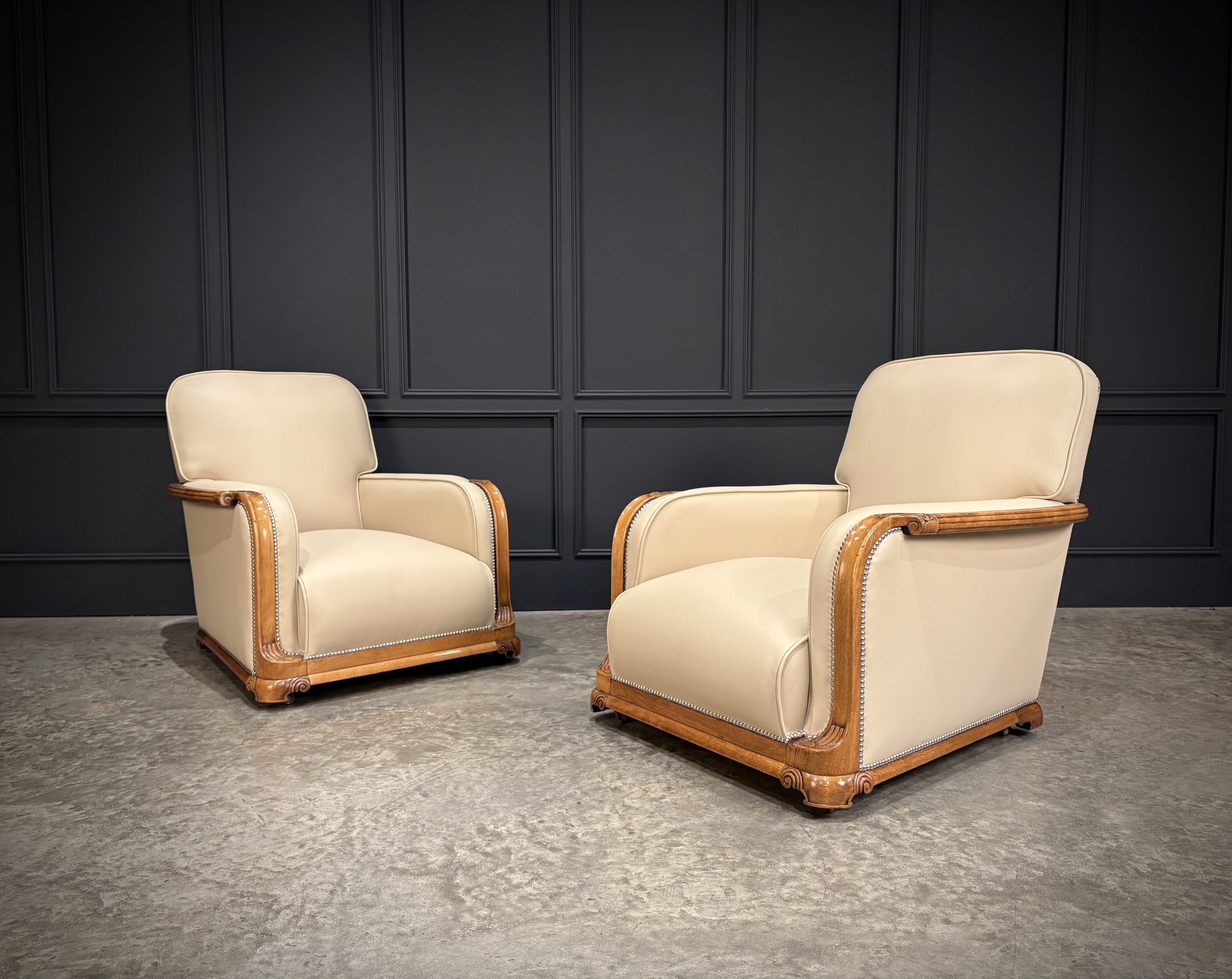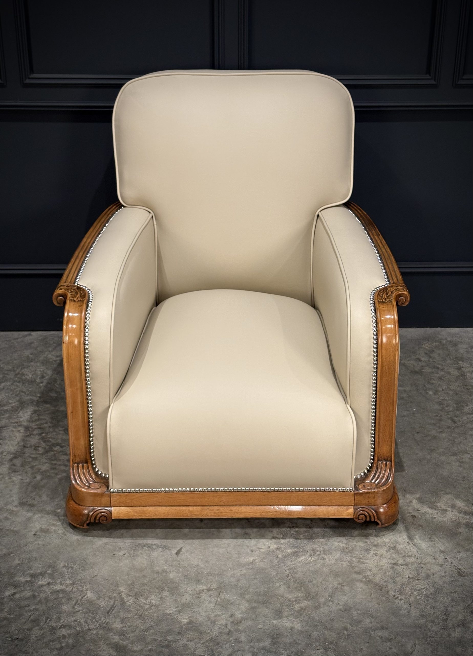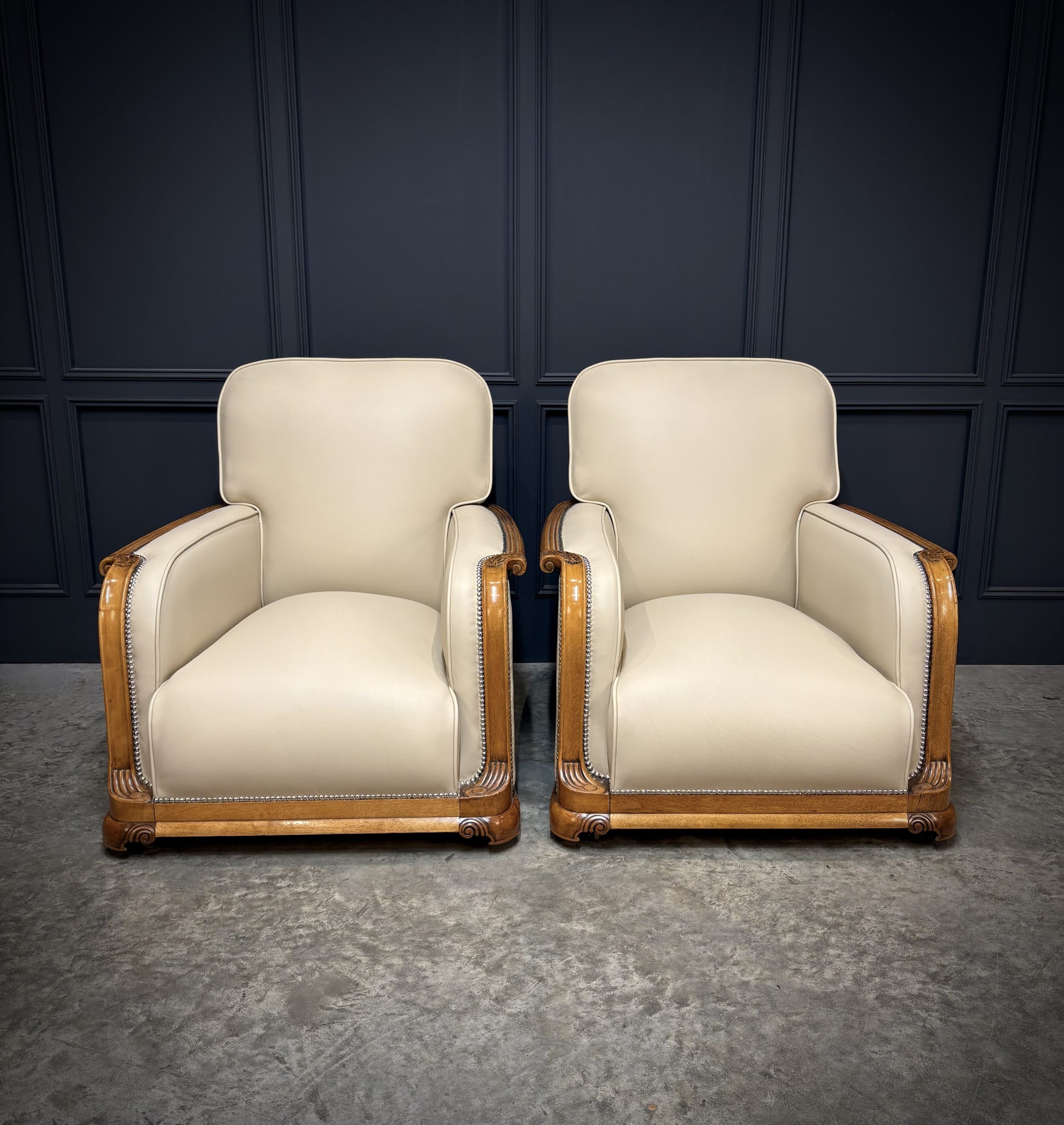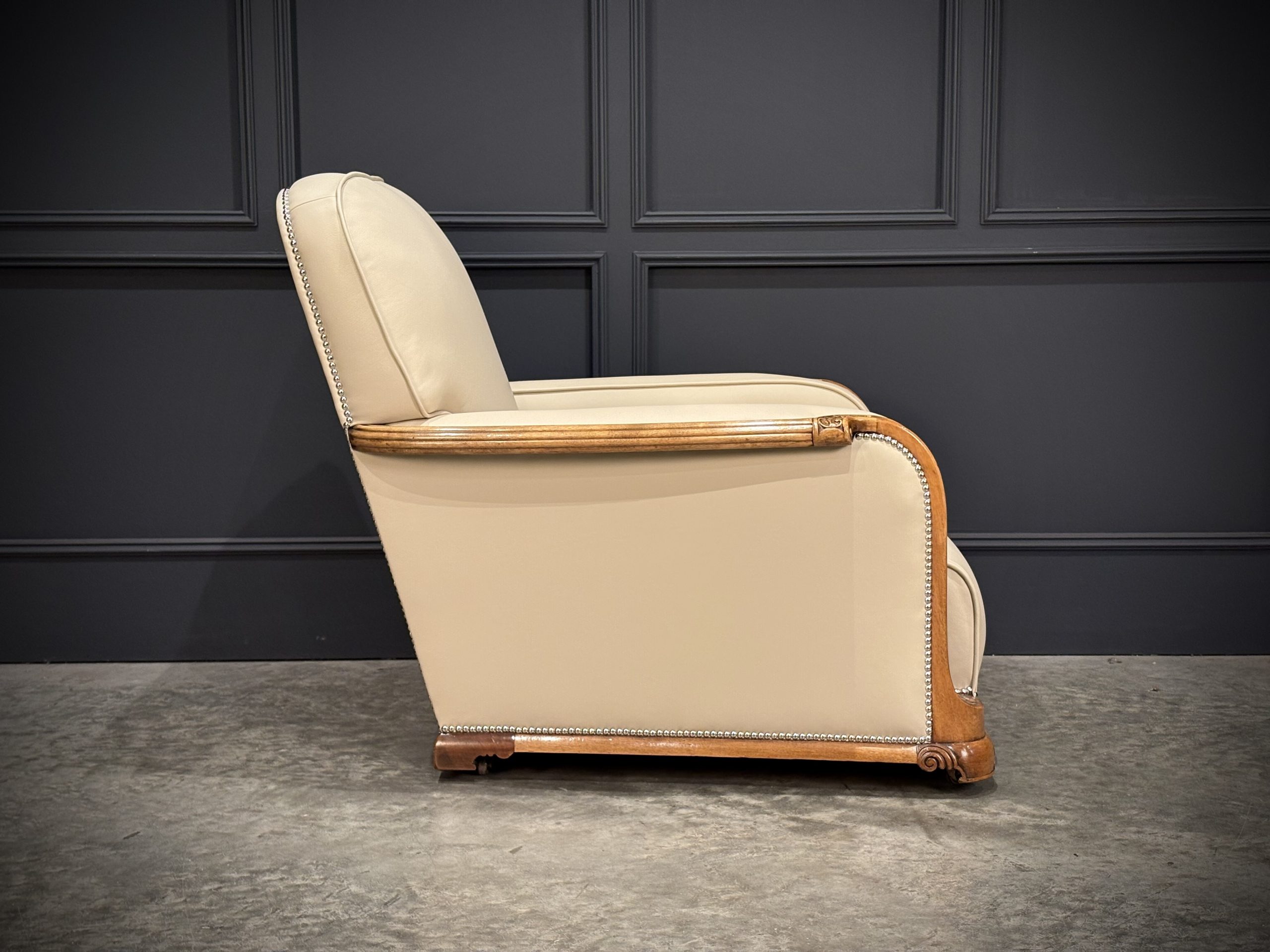 This exceptional pair of Art Deco armchairs , dating from the 1930s, combines timeless style with comfort. The beautifully crafted walnut frames feature intricate carved detailing, while the chairs elegant design is further enhanced by the newly upholstered, thick quality cream leather with a striking chrome studded trim.