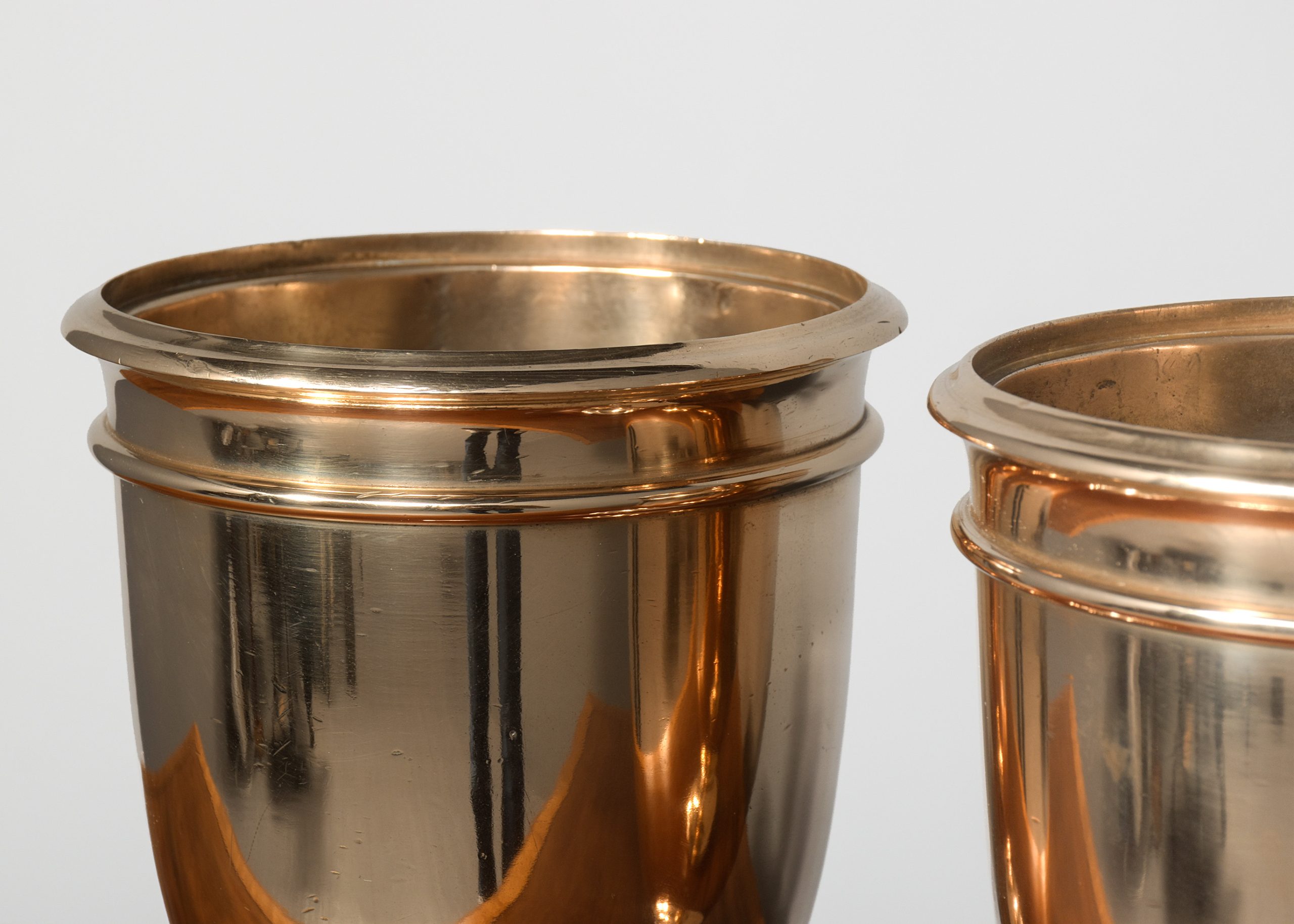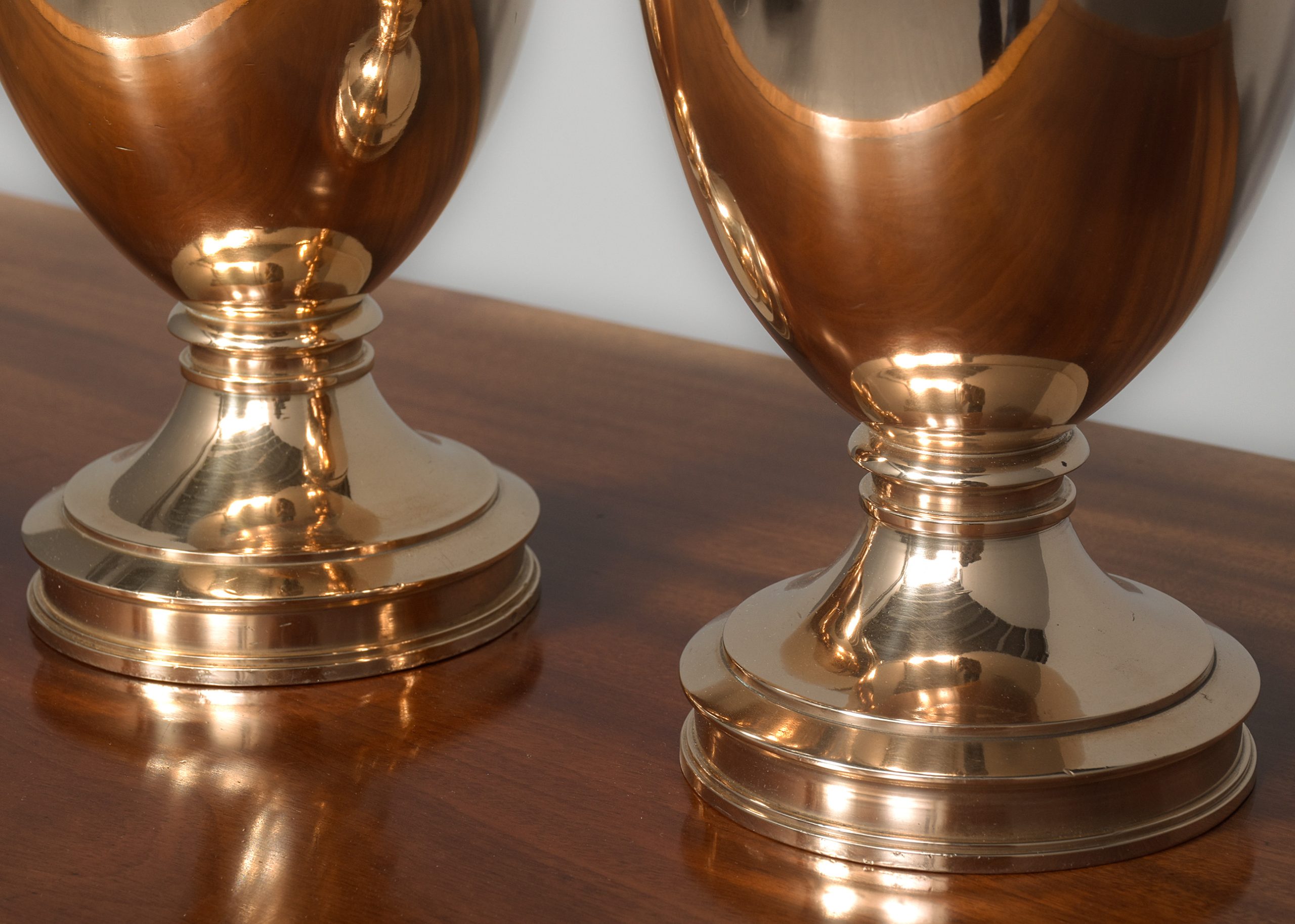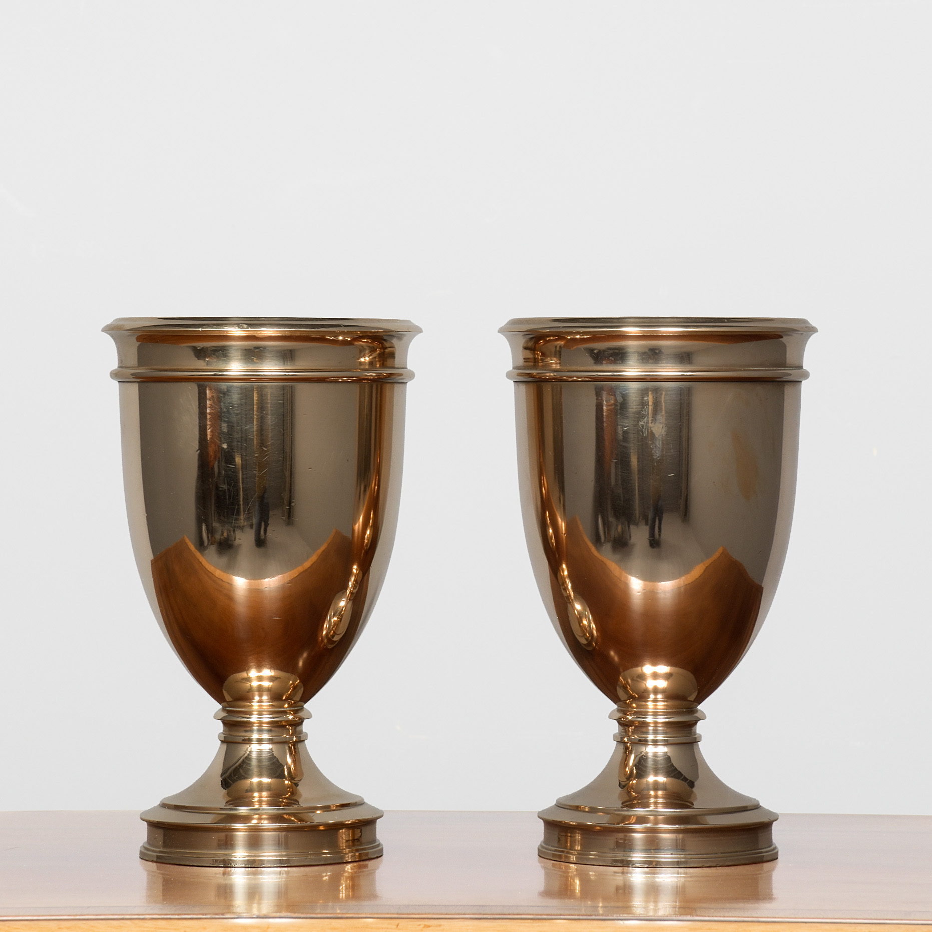 Circa 1900. A pair of cast bronze urns of circular form with a double moulded top, the tapering bodies rest on a circular stem with various mouldings finishing on a rounded footed pedestal