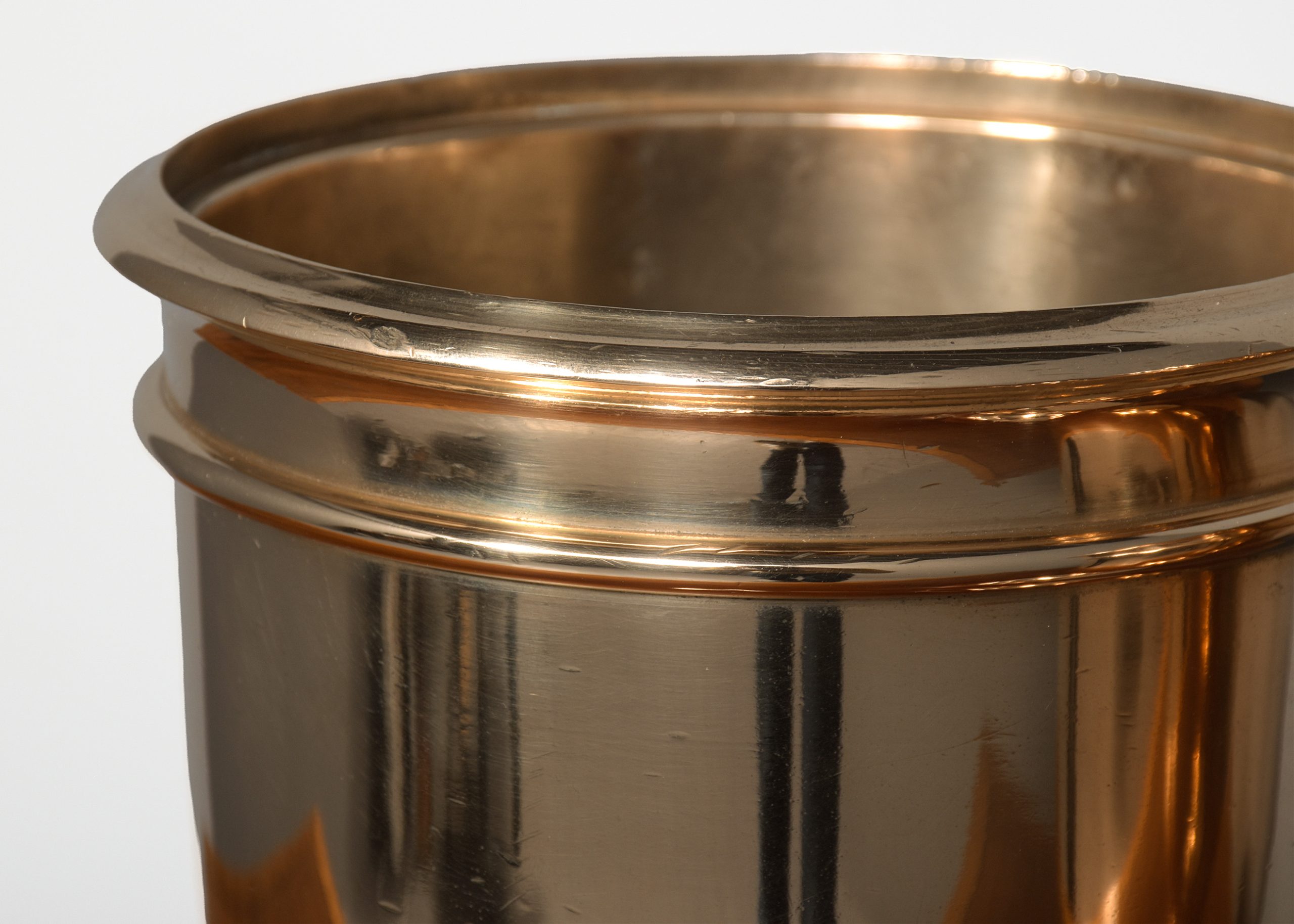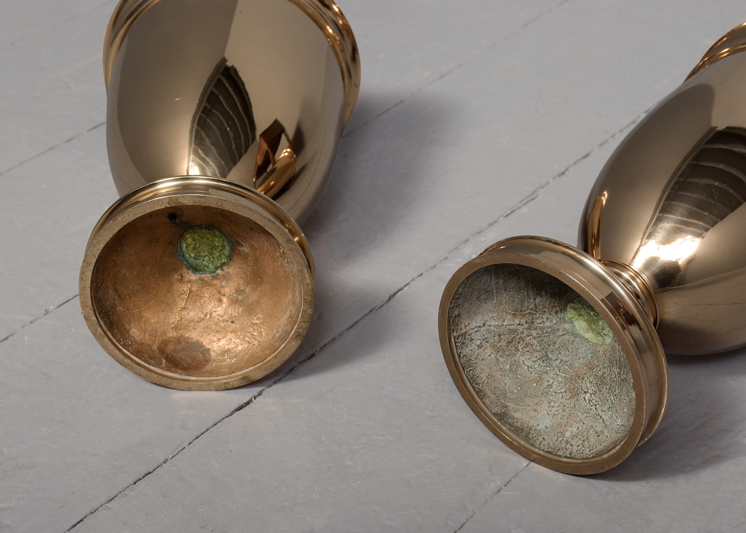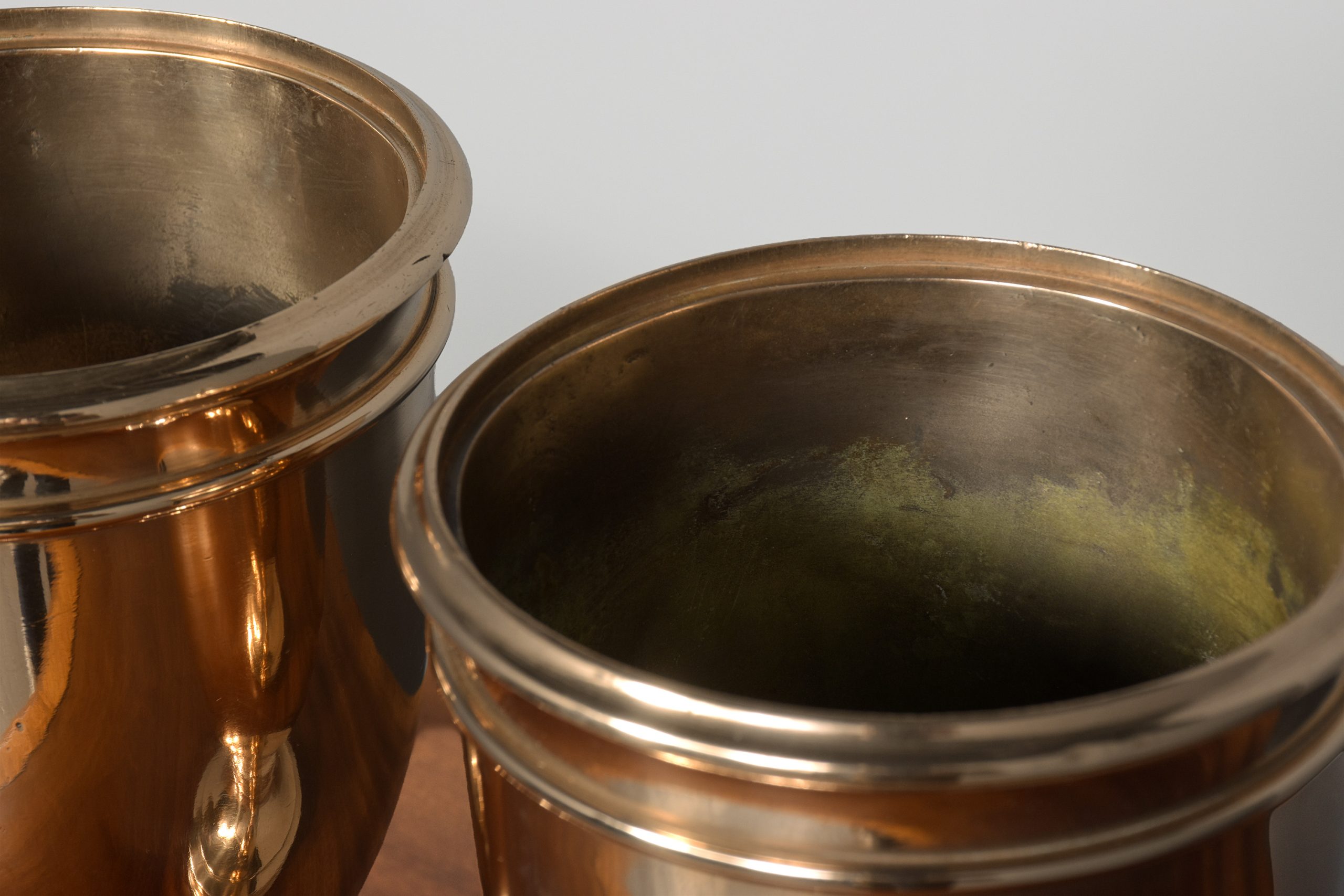 Circa 1900. A pair of cast bronze urns of circular form with a double moulded top, the tapering bodies rest on a circular stem with various mouldings finishing on a rounded footed pedestal