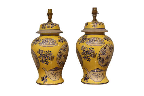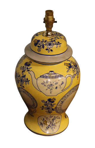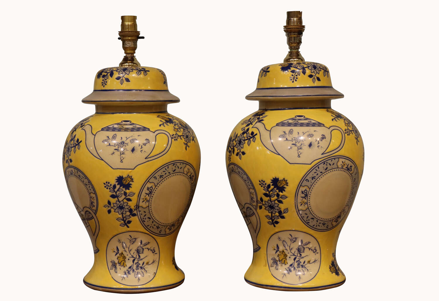 A charming pair of ceramic table lamps, each beautifully decorated in a cheerful yellow ground with blue floral motifs and whimsical teapot and teacup designs. The classic ginger-jar shape gives these lamps a timeless appeal, while the playful pattern adds a touch of character and vintage charm.