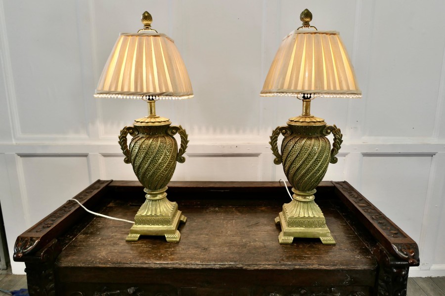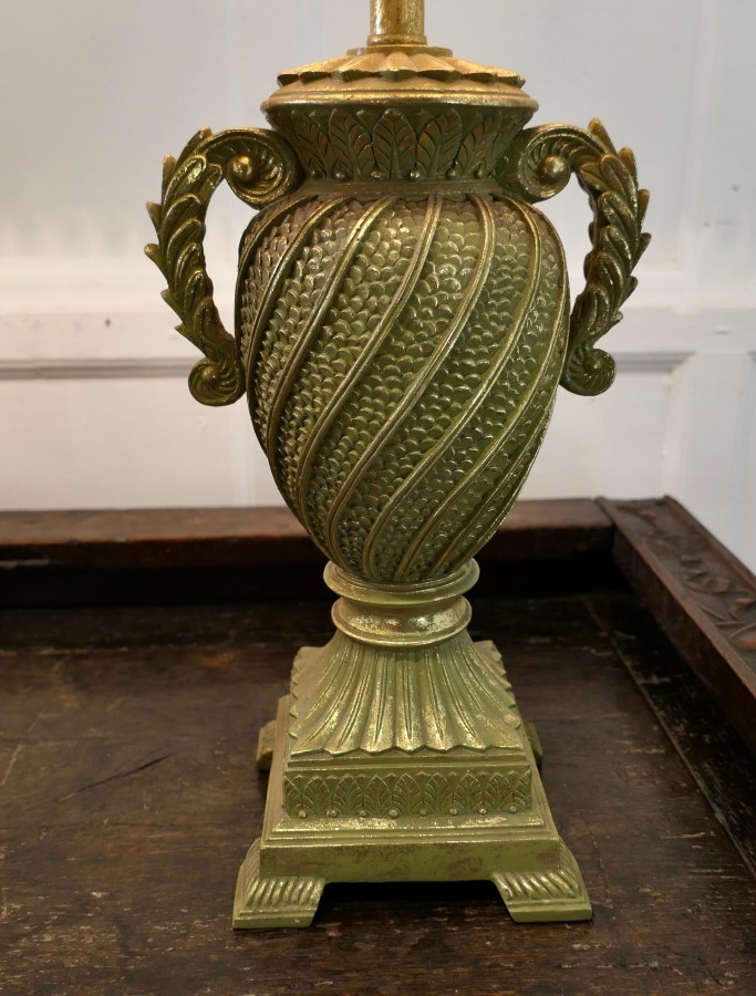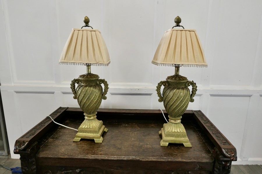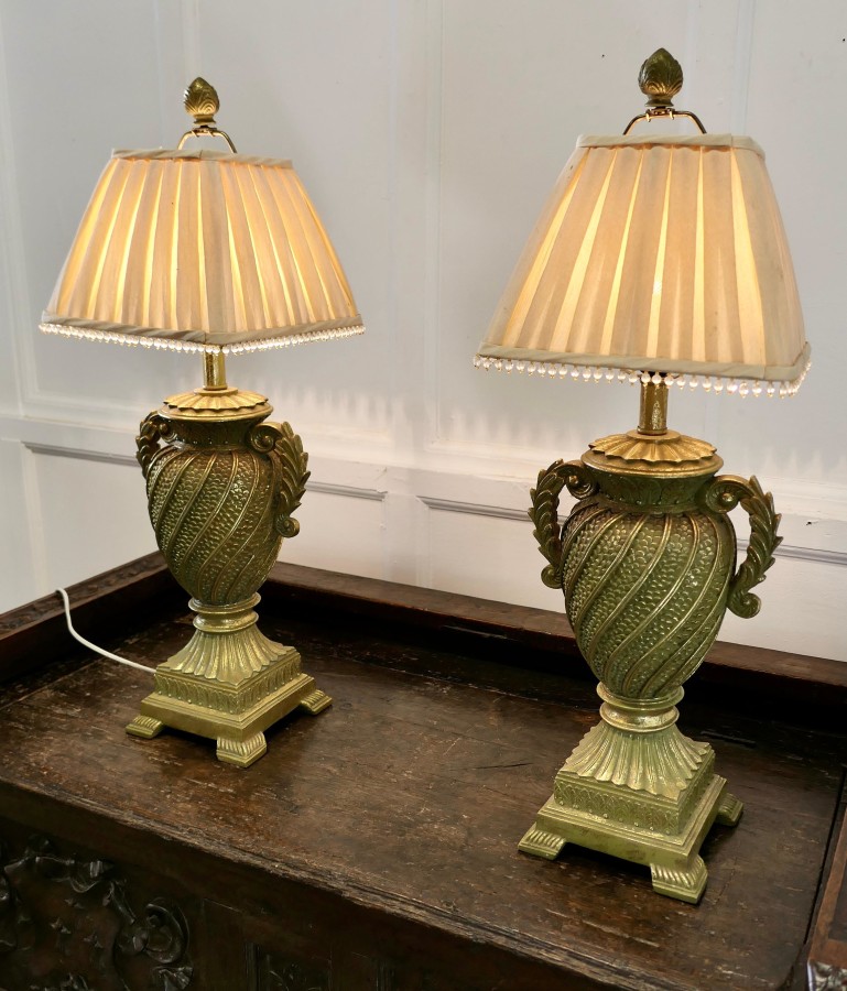 Pair of Decorative French Art Deco table lamps This is an exciting one off pair of lamps, they are large and decorative and come with pleated lampshades The lamps are made in a composition material, which is painted to simulate sculptured gilded metal The lamps are in good condition, the wiring is working, the shades shown came with the lamps but could be changed to ones of your own choice A Lovely decorative pair in good condition The lamps are 31” tall and 10” square TJK25. Manufacture Date : 1960 Materials : Composition