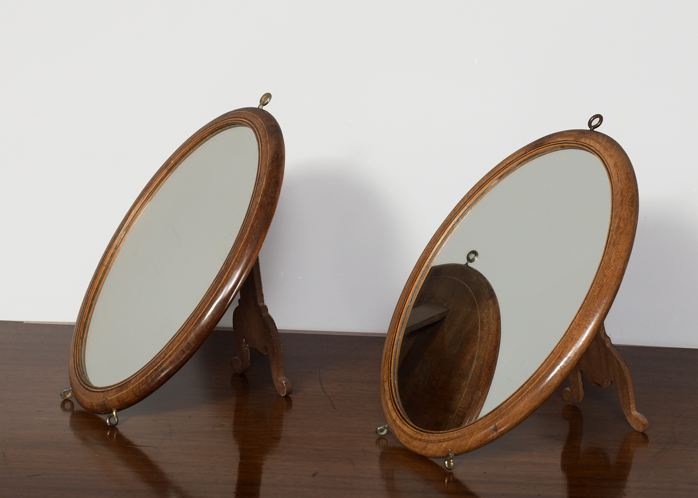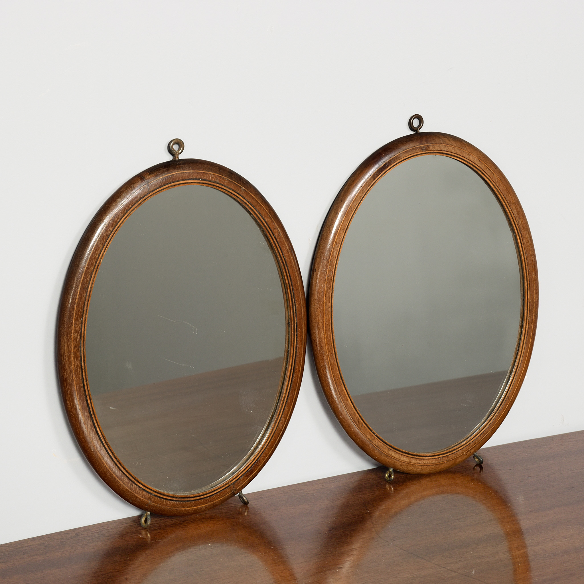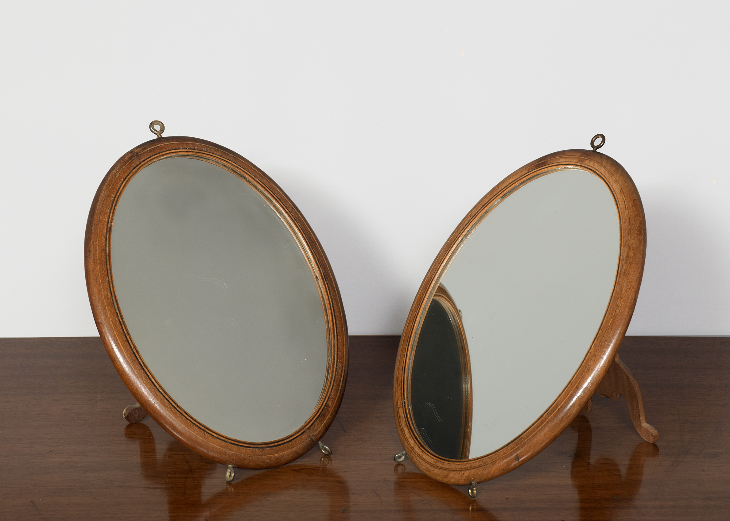 Circa 1900. An unusual, stylish pair of oval mahogany and inlaid strut or wall mirrors, each retaining the original mirror plate in good condition, with a triple string inlaid bezel, the frame with rounded corners the base with two small brass feet, the top with a hanging hoop, the back with a retractable shaped mahogany leg.