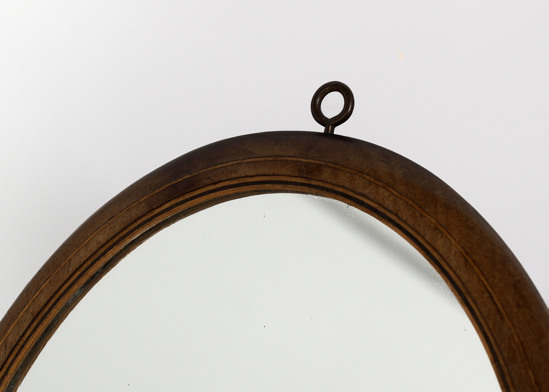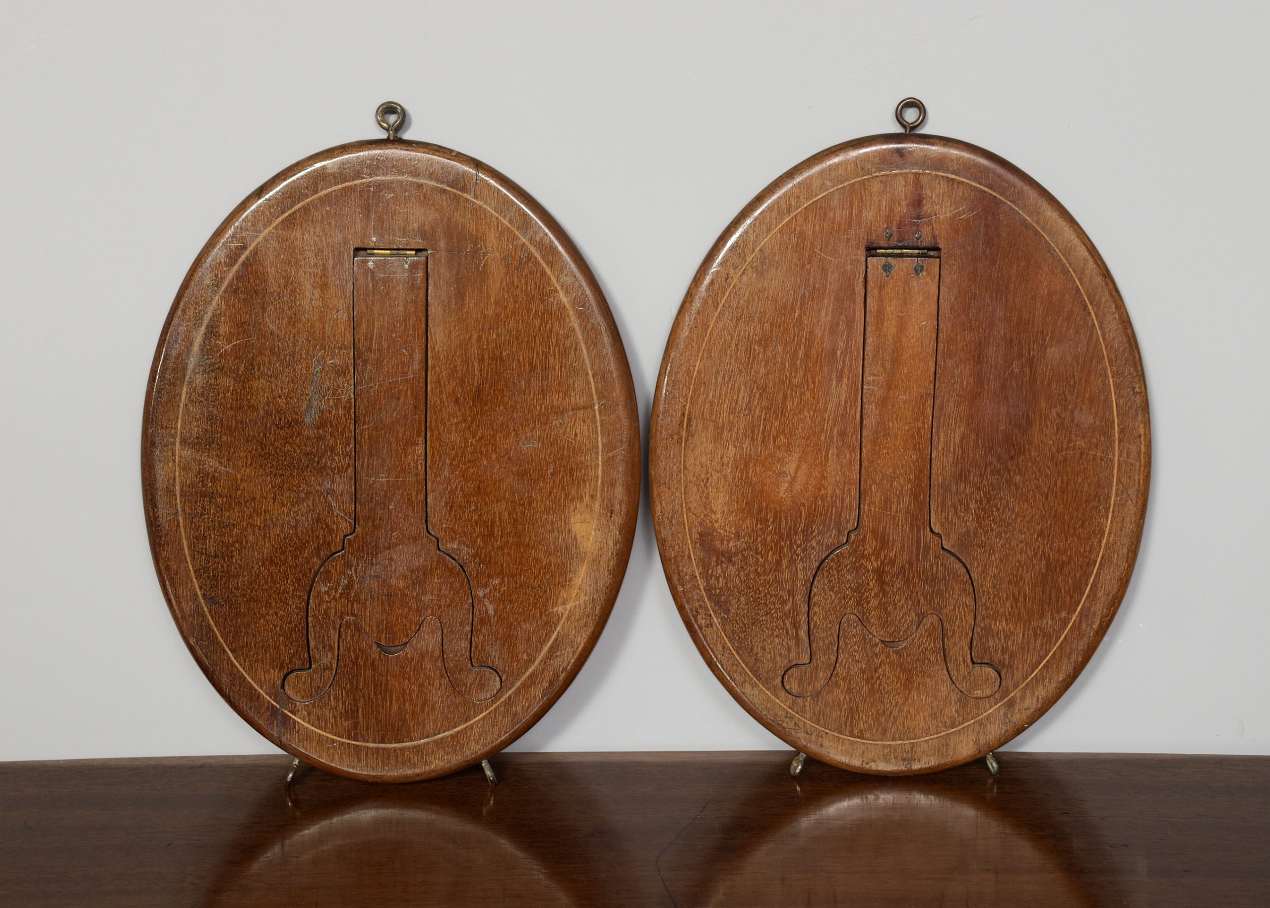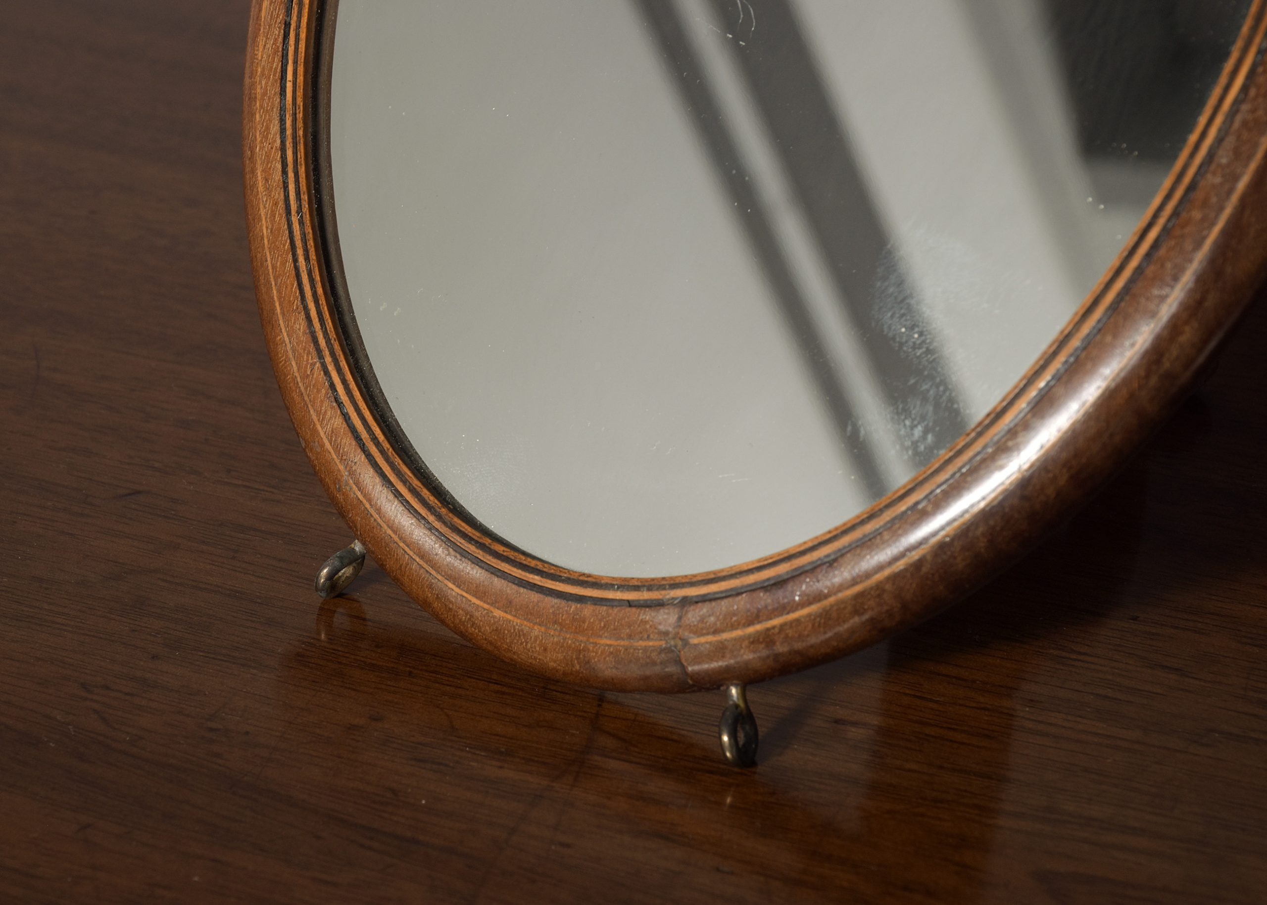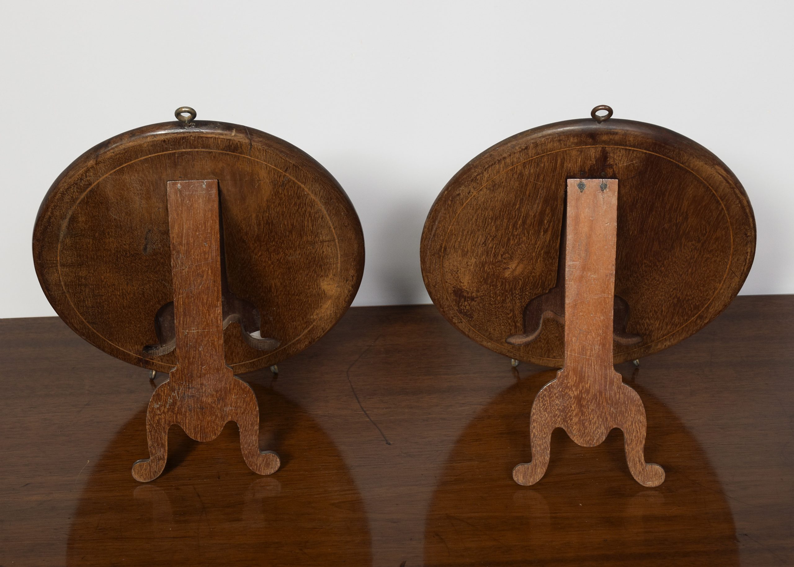 Circa 1900. An unusual, stylish pair of oval mahogany and inlaid strut or wall mirrors, each retaining the original mirror plate in good condition, with a triple string inlaid bezel, the frame with rounded corners the base with two small brass feet, the top with a hanging hoop, the back with a retractable shaped mahogany leg.