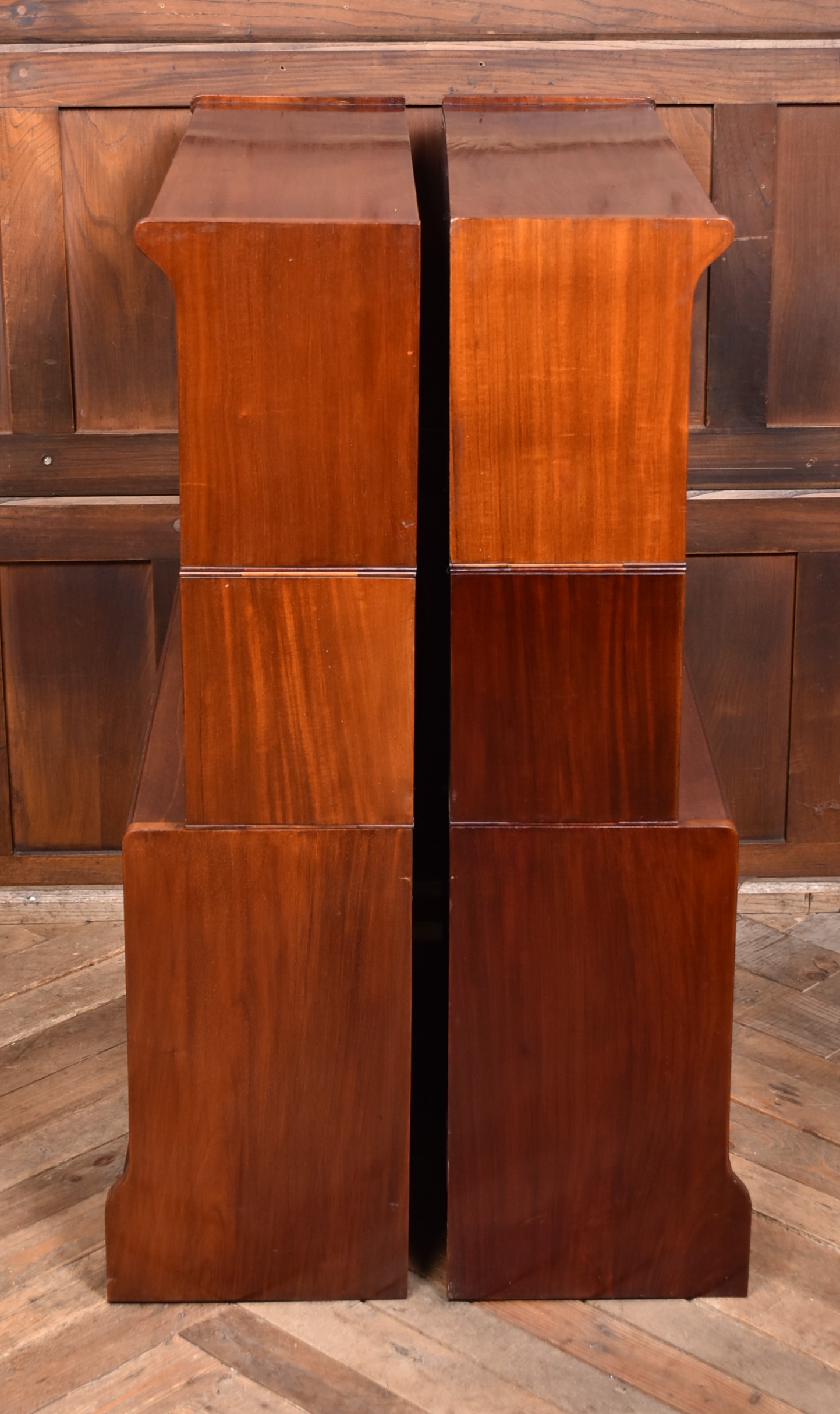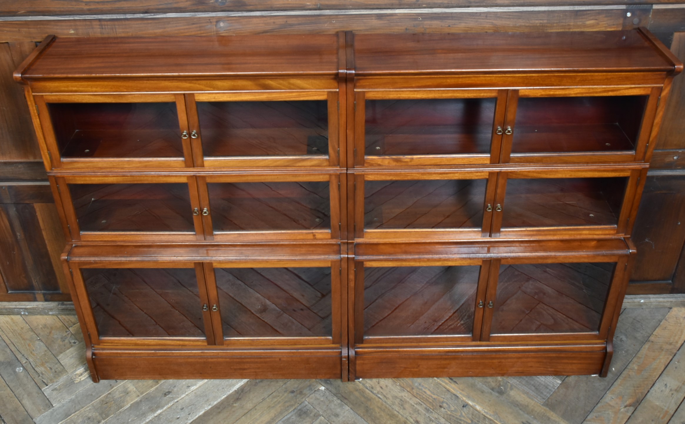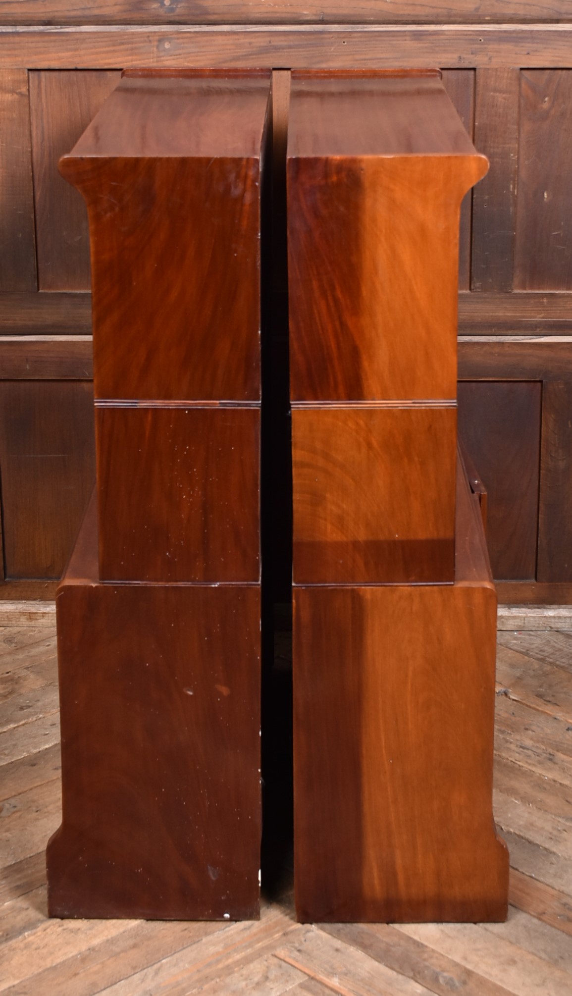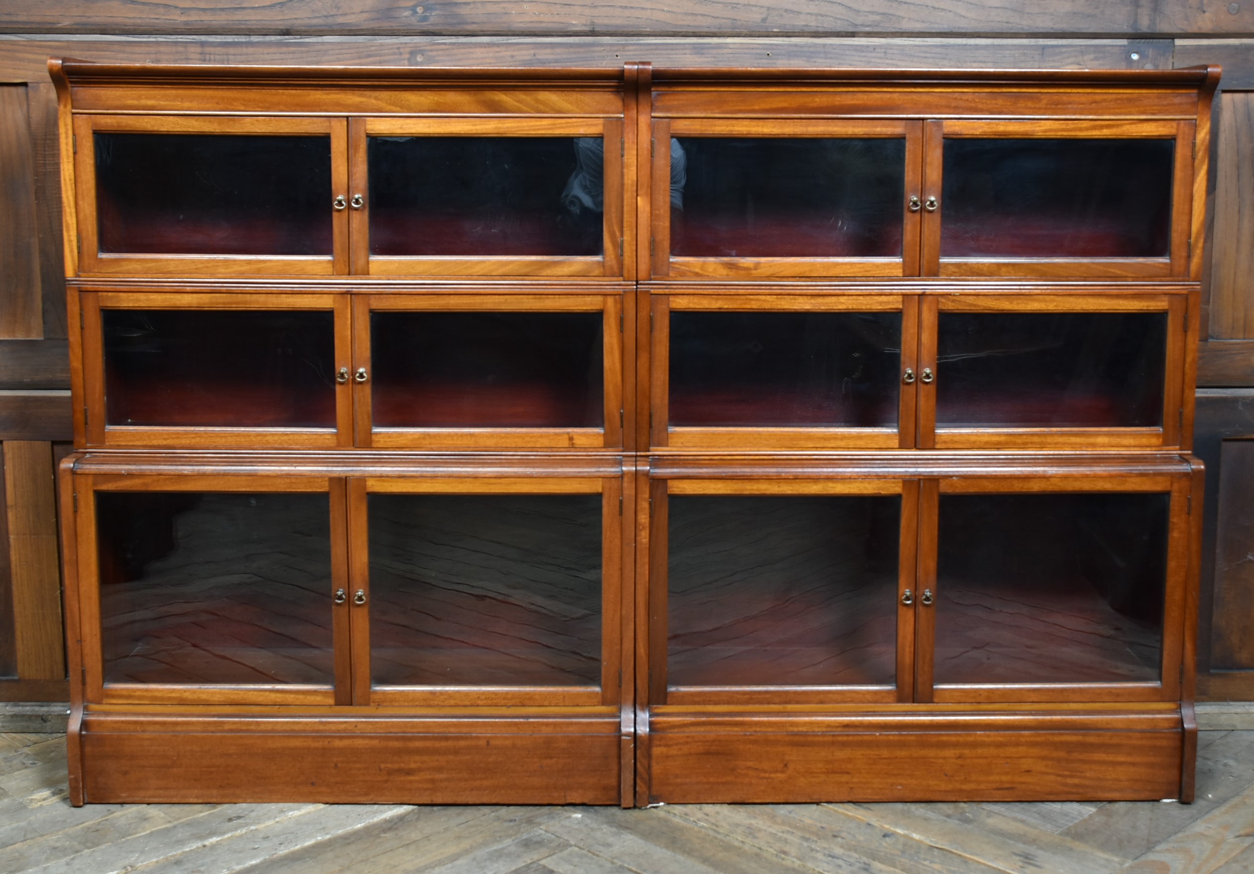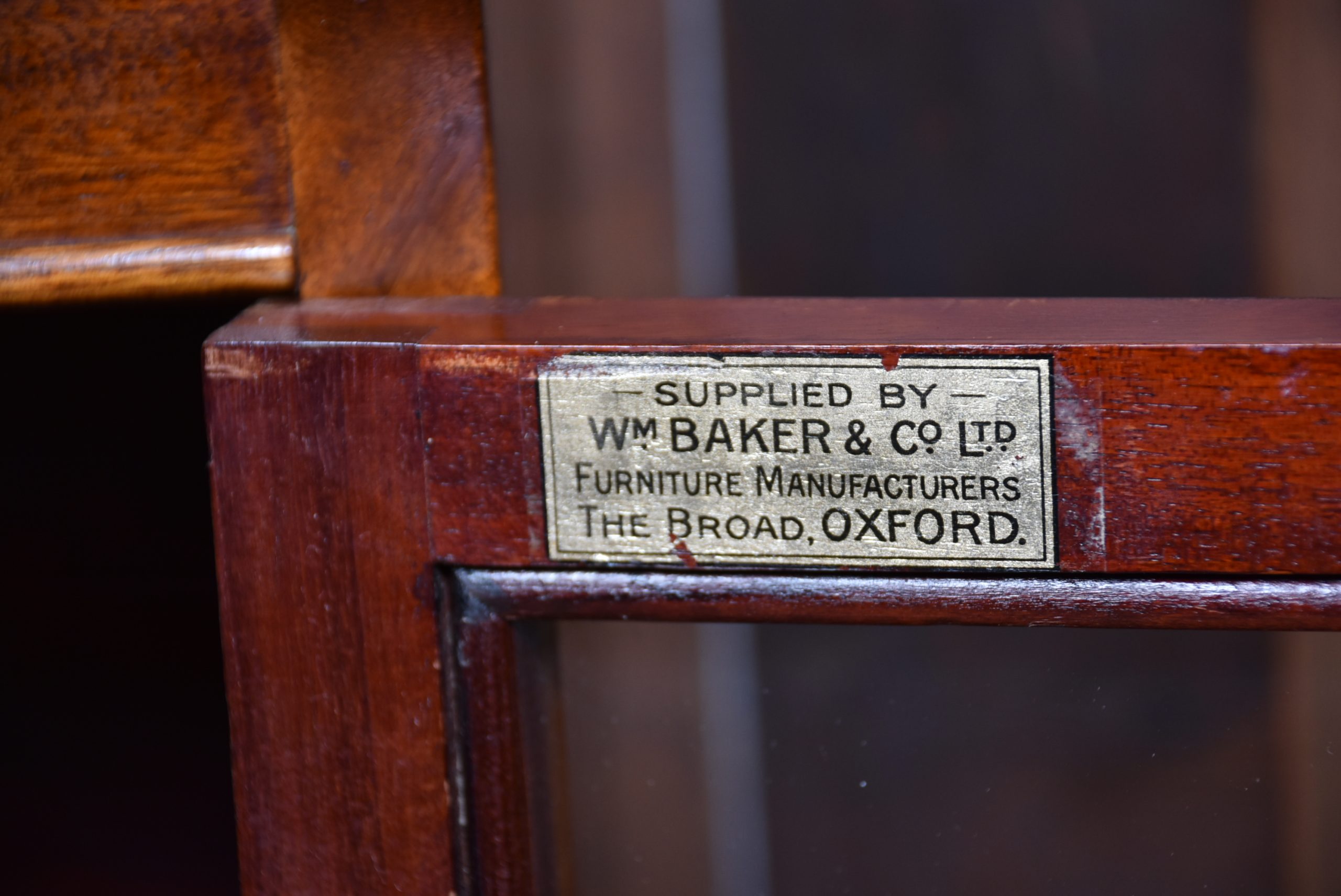 A handsome pair of Edwardian mahogany sectional barrister bookcases by Wm Baker & Co Ltd, Oxford. Each bookcase is constructed in three graduated double door sections, allowing for easy transport. The mahogany has developed a rich, warm patina, complemented by the original glazed fronts with small brass knobs. The proportions balance elegance and practicality, delivering generous storage without losing their composed, architectural character. Both bookcases retain their original maker’s plaques for Wm Baker & Co Ltd, Furniture Manufacturers, The Broad, Oxford, confirming their quality and provenance. A versatile and impressive pair, ideal for libraries, studies, or retail display, and increasingly scarce to find in matching sets.