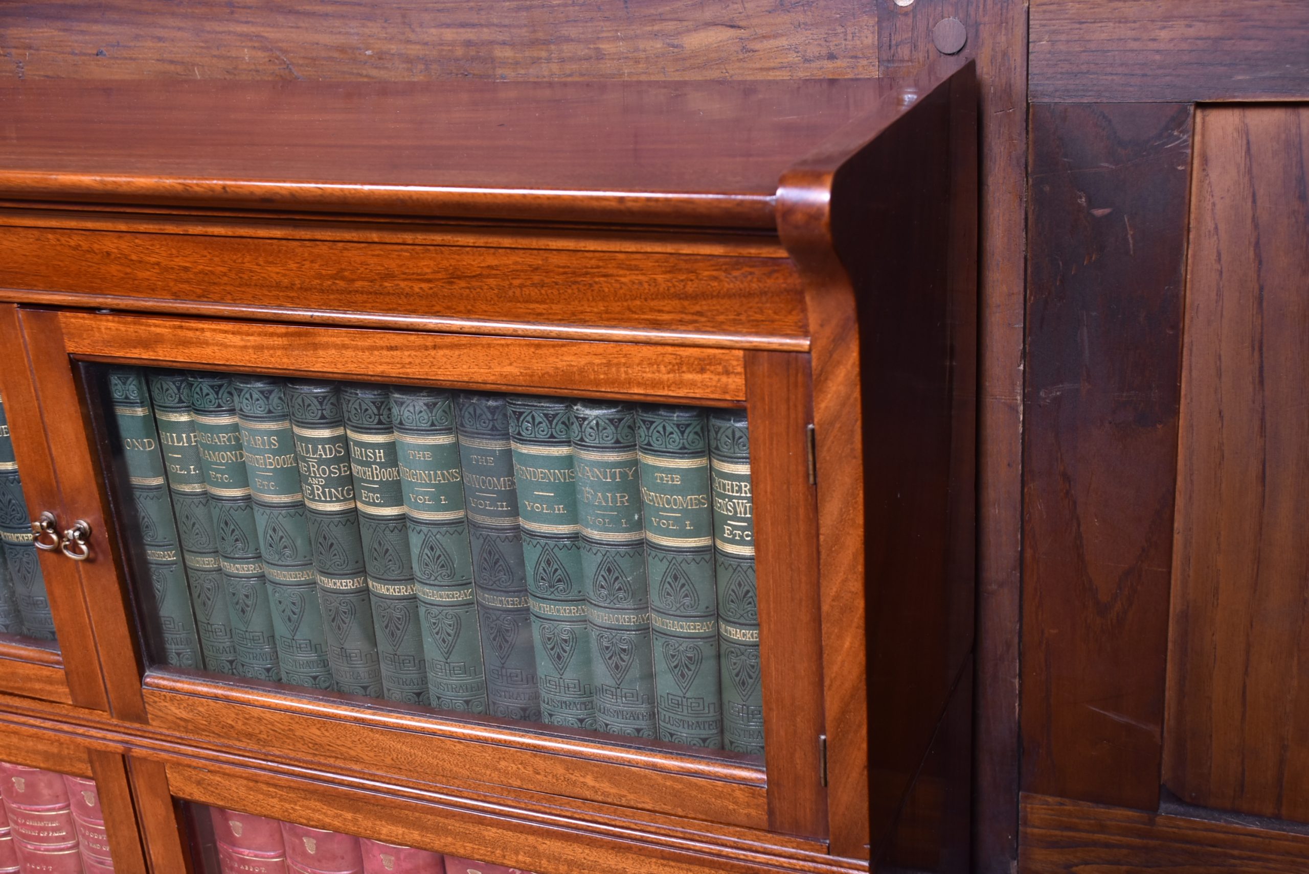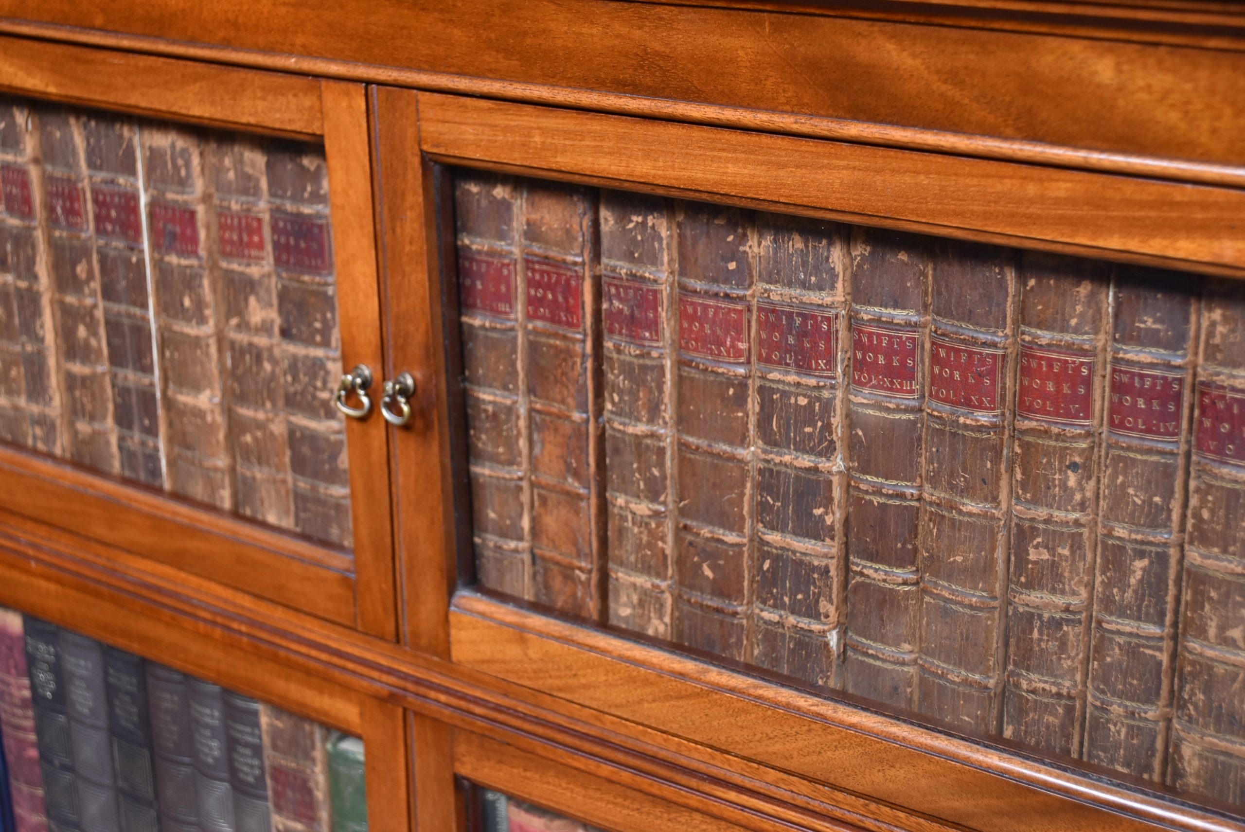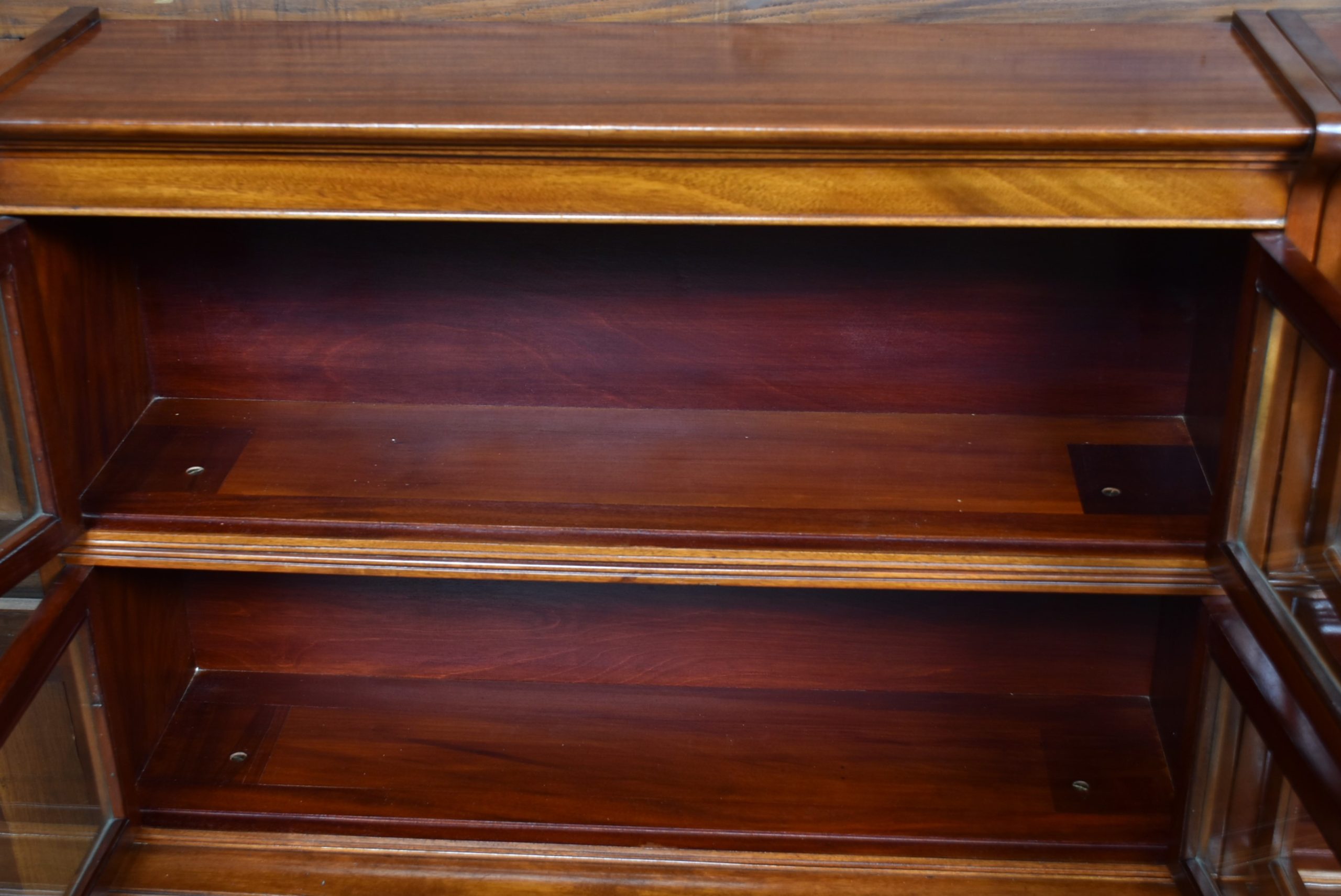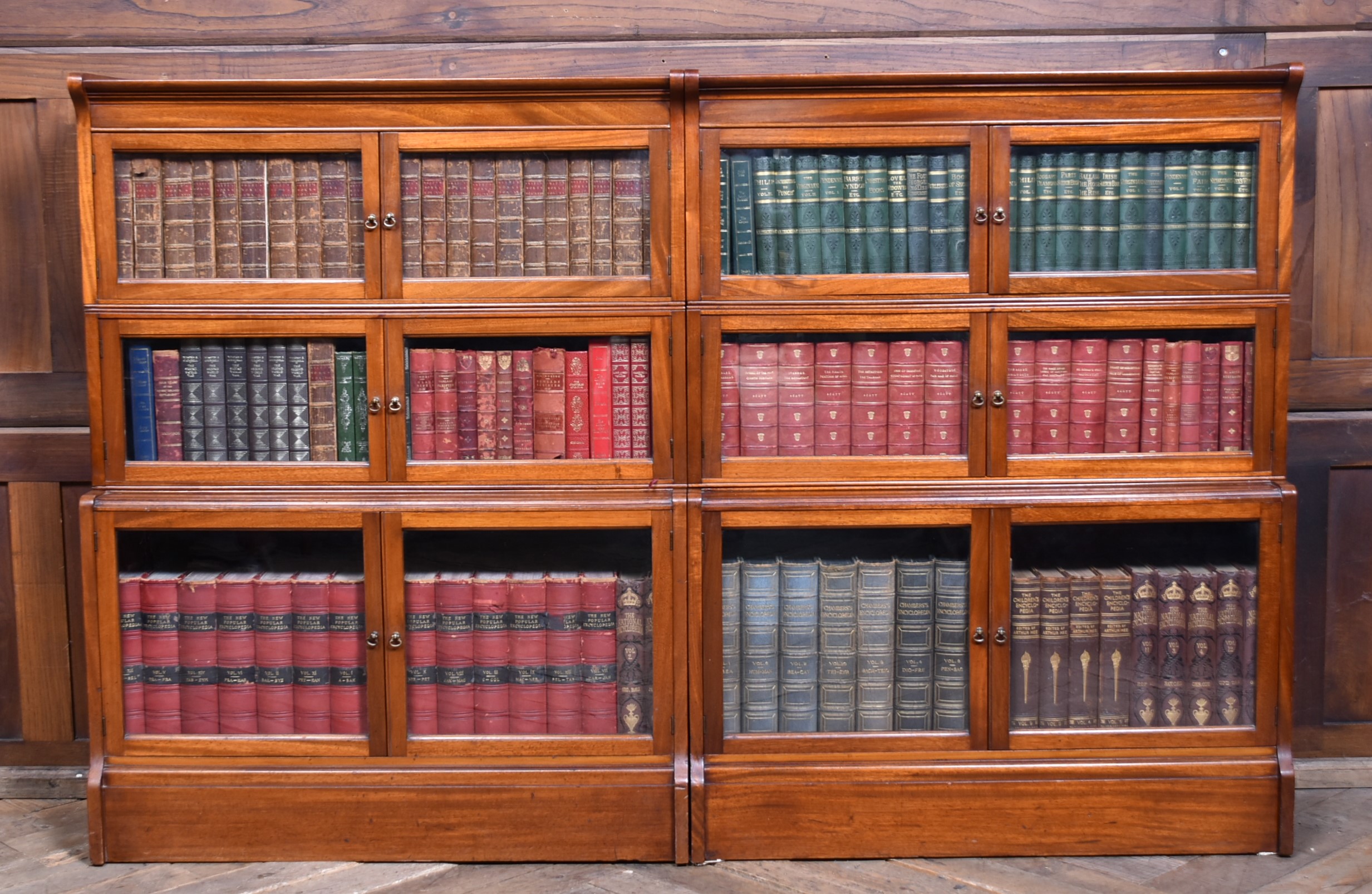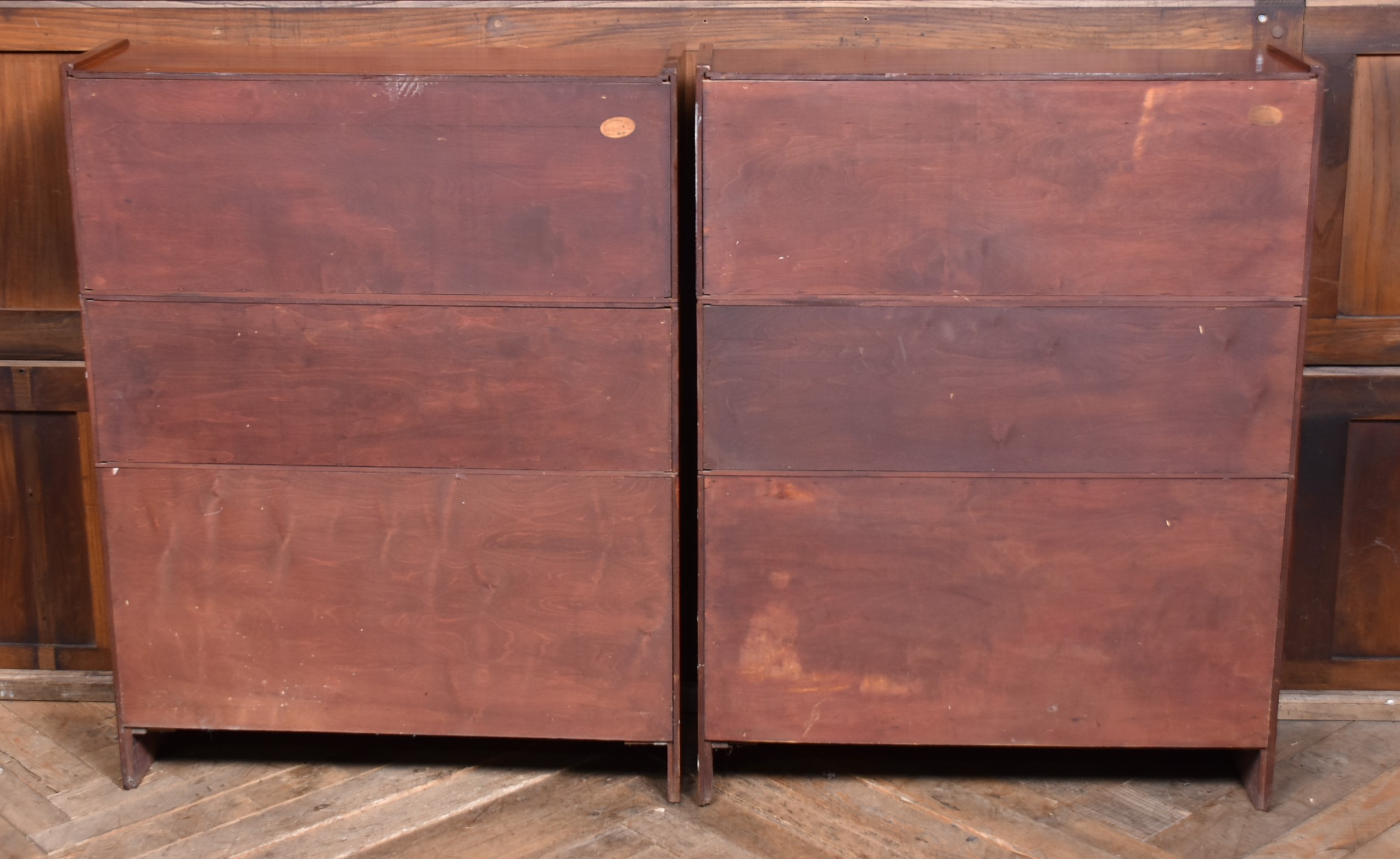 A handsome pair of Edwardian mahogany sectional barrister bookcases by Wm Baker & Co Ltd, Oxford. Each bookcase is constructed in three graduated double door sections, allowing for easy transport. The mahogany has developed a rich, warm patina, complemented by the original glazed fronts with small brass knobs. The proportions balance elegance and practicality, delivering generous storage without losing their composed, architectural character. Both bookcases retain their original maker’s plaques for Wm Baker & Co Ltd, Furniture Manufacturers, The Broad, Oxford, confirming their quality and provenance. A versatile and impressive pair, ideal for libraries, studies, or retail display, and increasingly scarce to find in matching sets.
