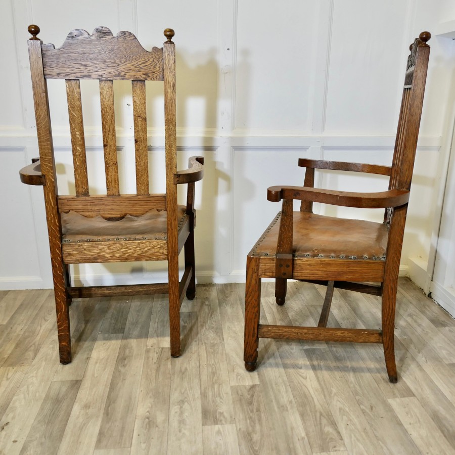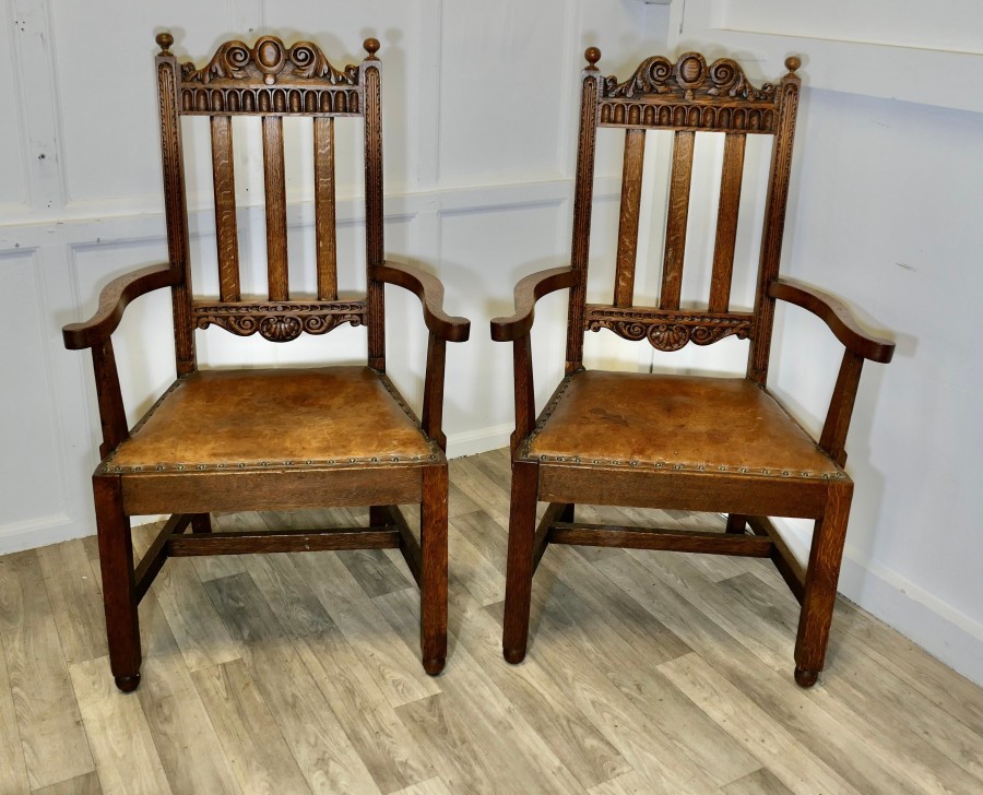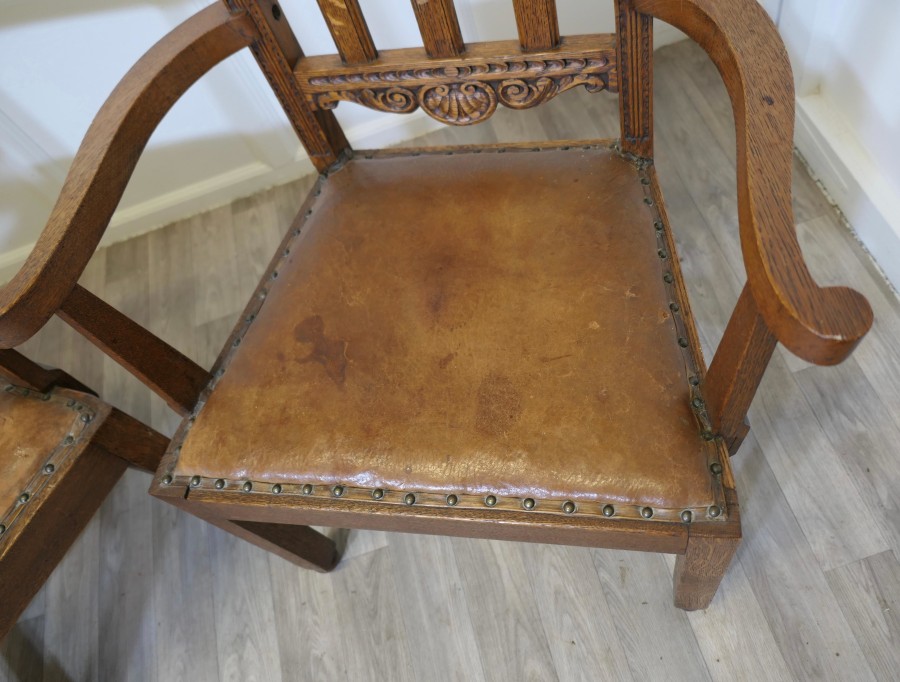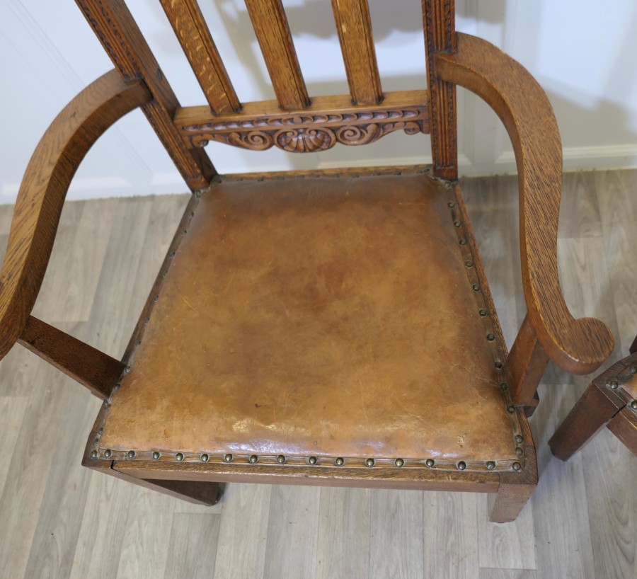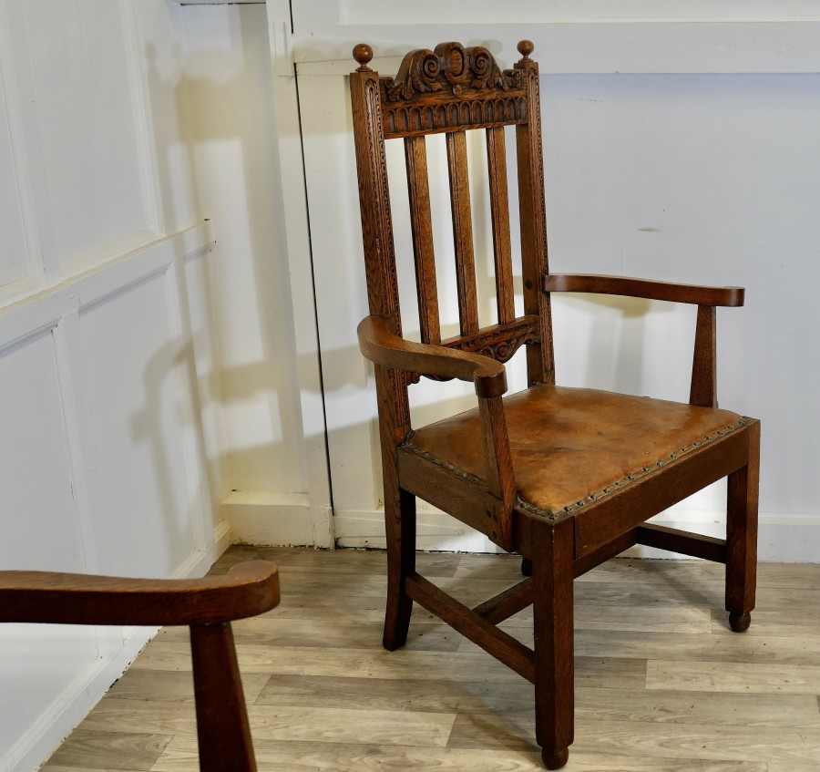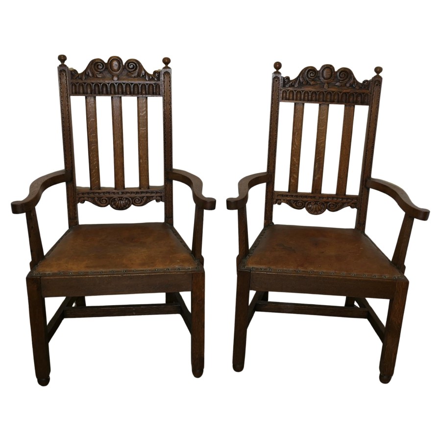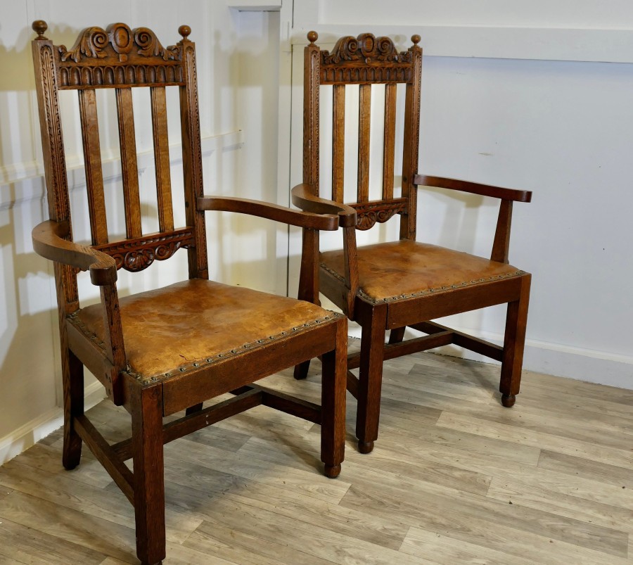Pair of Excellent Quality Arts and Crafts Carved Oak Carver Chairs A good pair of chairs very stout and sturdy, in the Arts and Crafts style with gothic style carving and wide stats to the back, the Oak has a lovely patina and the original leather upholstery is soft The chairs are 44” high, 27” wide and 20” deep TZX47 Manufacture Date : 1880 Materials : Oak