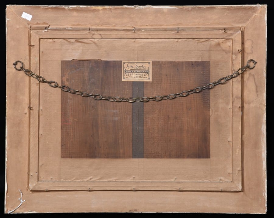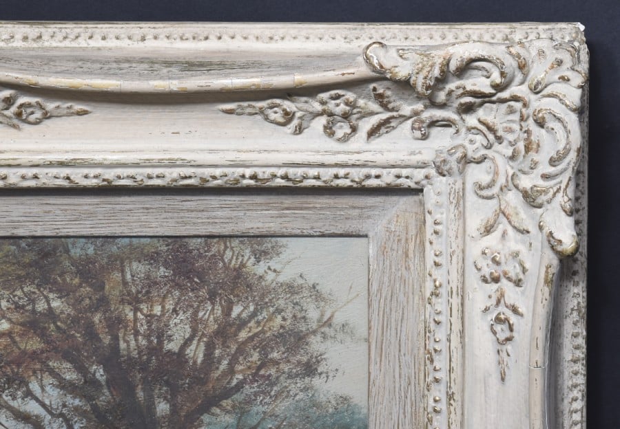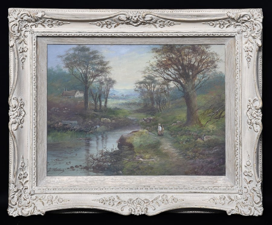 Pair of framed oil paintings by James Wallace, 1872– 1911 a Scottish Artist, noted for his landscapes, showing rural landscape with figures by a streams. Finely painted and both in excellent condition and with cream and gilded frames supplied by label: Aitken Dott and Sons established 1842, 20 Castle Street Edinburgh. Decorative items of Scottish interest.