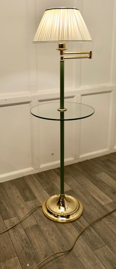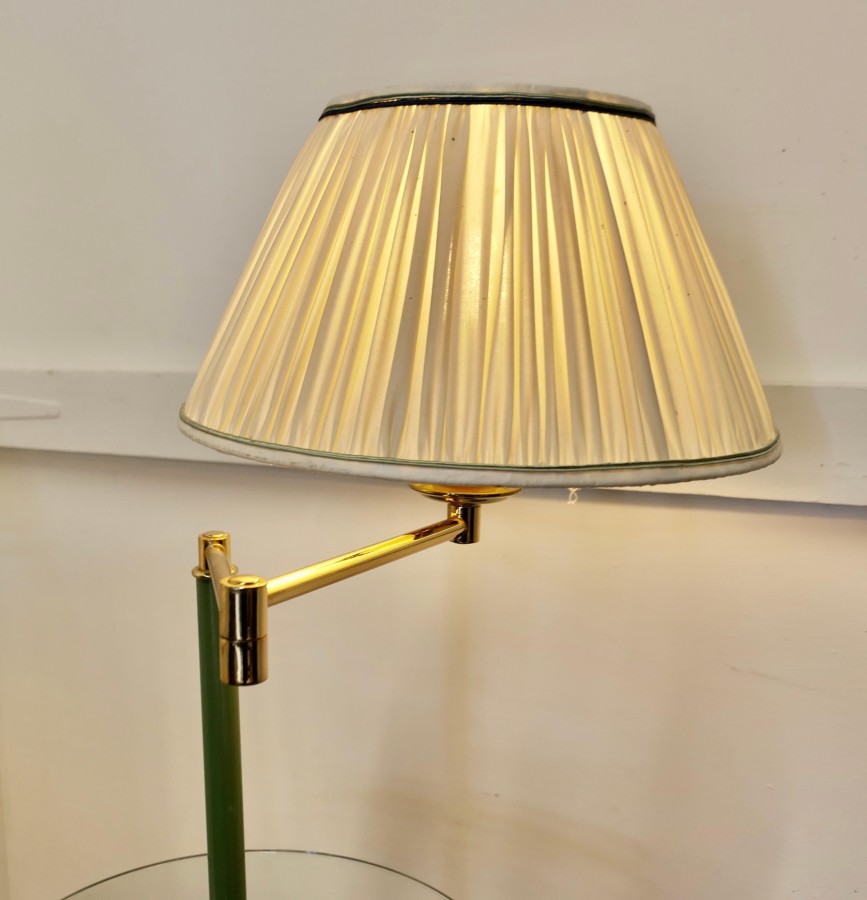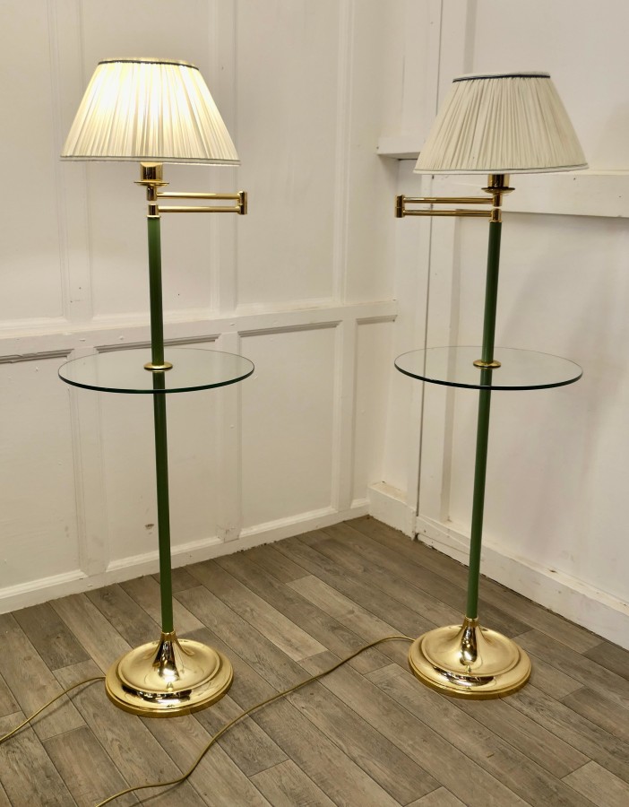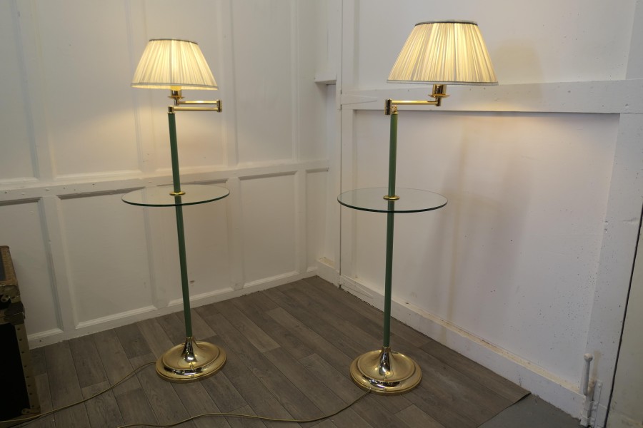 A Pair of French Art Deco adjustable swing arm floor lamps, reading Lamps These are beautifully designed pieces, the lamps have a heavy brass base which supports a green column with an adjustable Swing Arm on a full height column, this can be moved to adjust the position of the light, at the centre of each lamp there is a plate glass table The lamps are both working and have their original linen cone shaped shades A very attractive pair of lamps, they are 52” tall and the tables are 15” in diameter TJK81. Manufacture Date : 1960 Materials : Brass