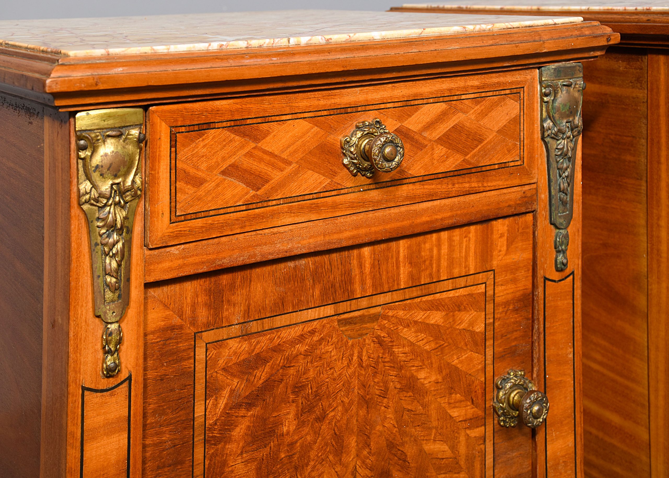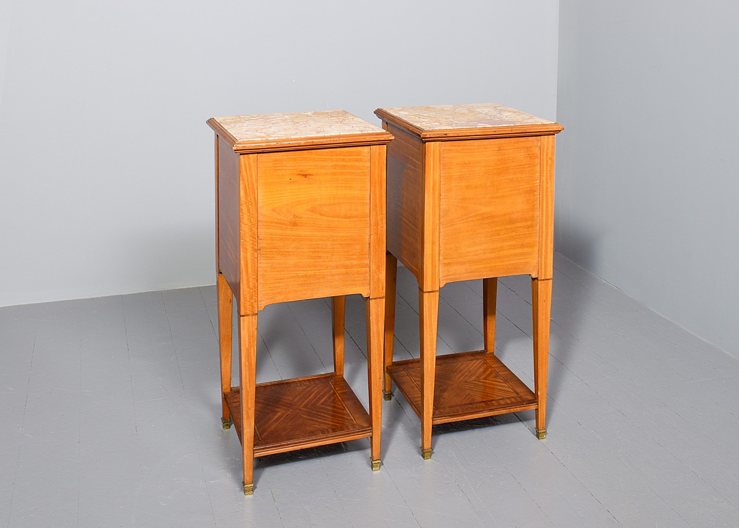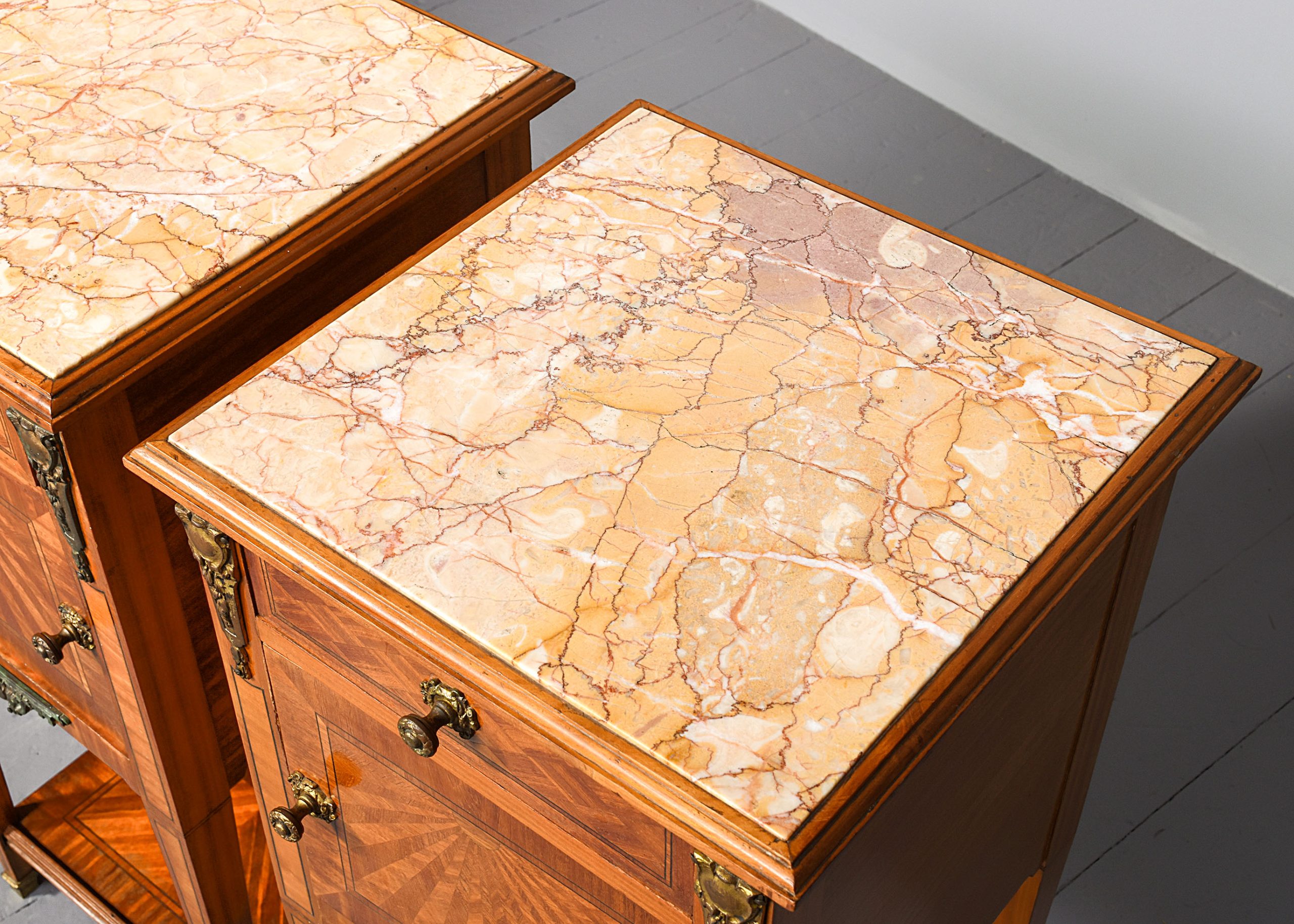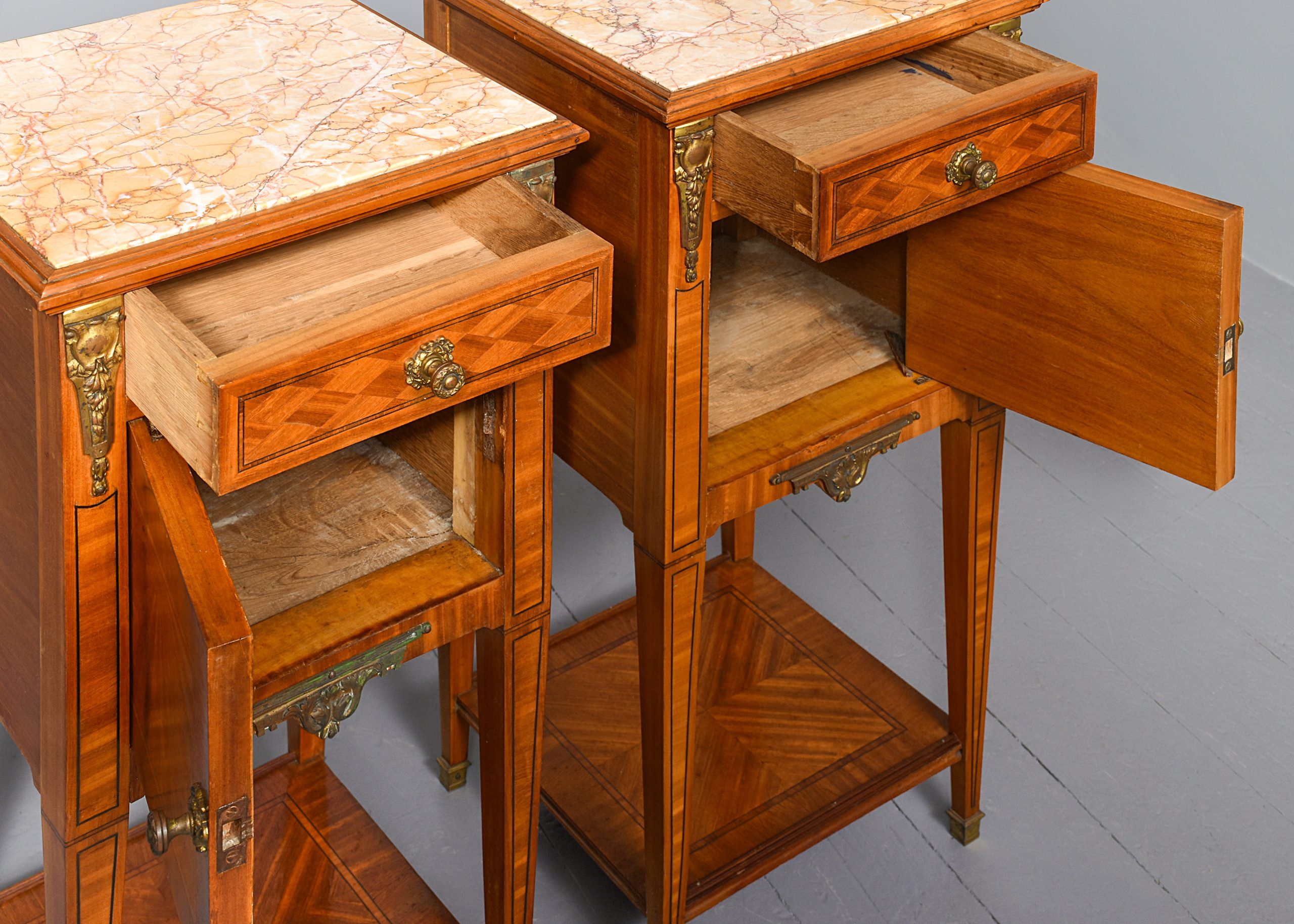 Circa 1880. A pair of exhibition quality French pink variegated marble top bedside pedestals, the tops in wonderful pink variegated marble within a moulded frame, the frieze with a full-length drawer with broad banding, inlay and geometric parquetry, flanked by a pair of gilded mounts, below a cupboard with a similar handle and a sunburst in geometric patterns with satinwood and kingwood inlay, the frieze with a stylish mount, resting of four square tapering inlaid legs, intersected by a shelf with similar inlay to the doors, on cast brass feet, the pair of pedestals are polished on all sides making them freestanding.