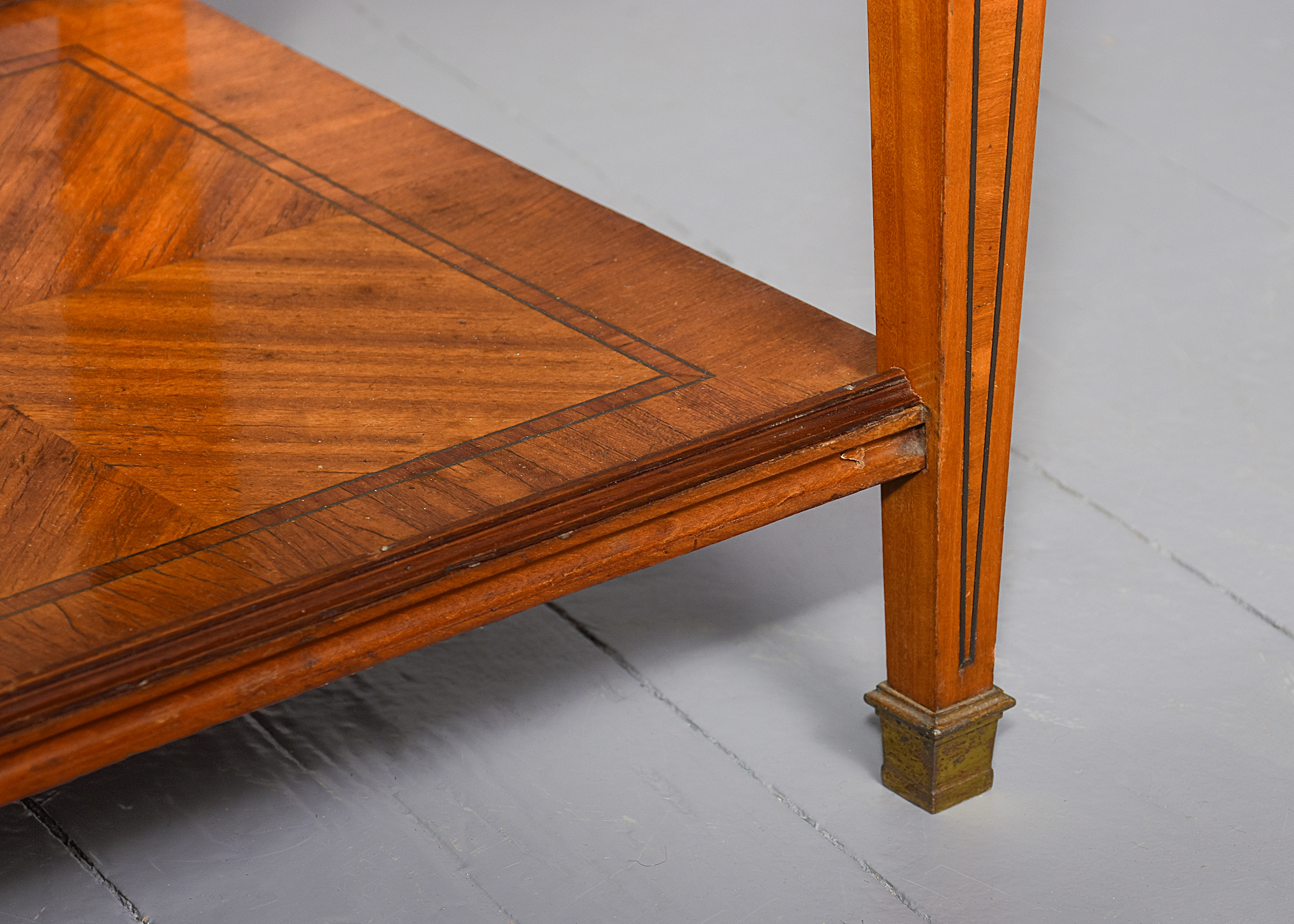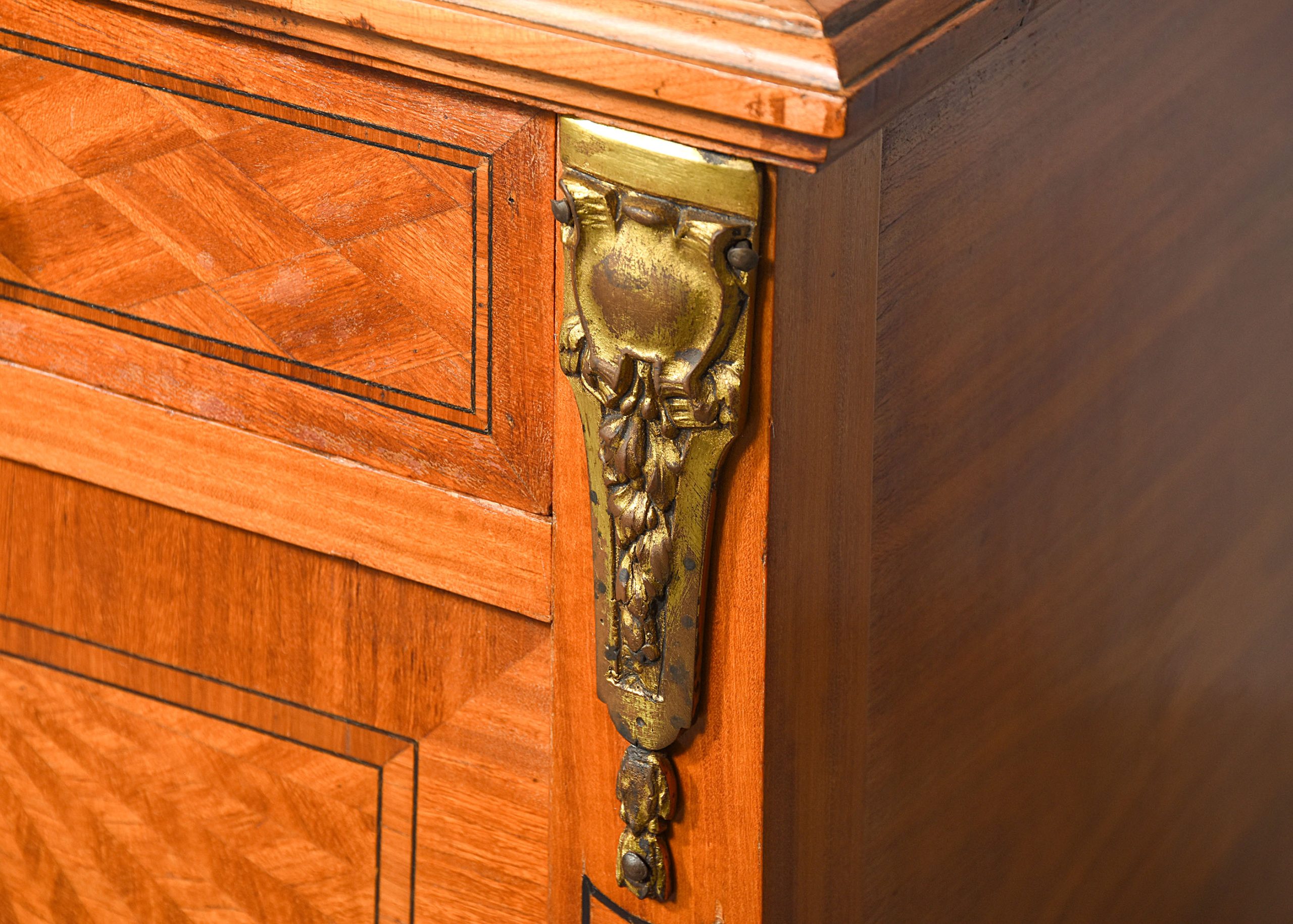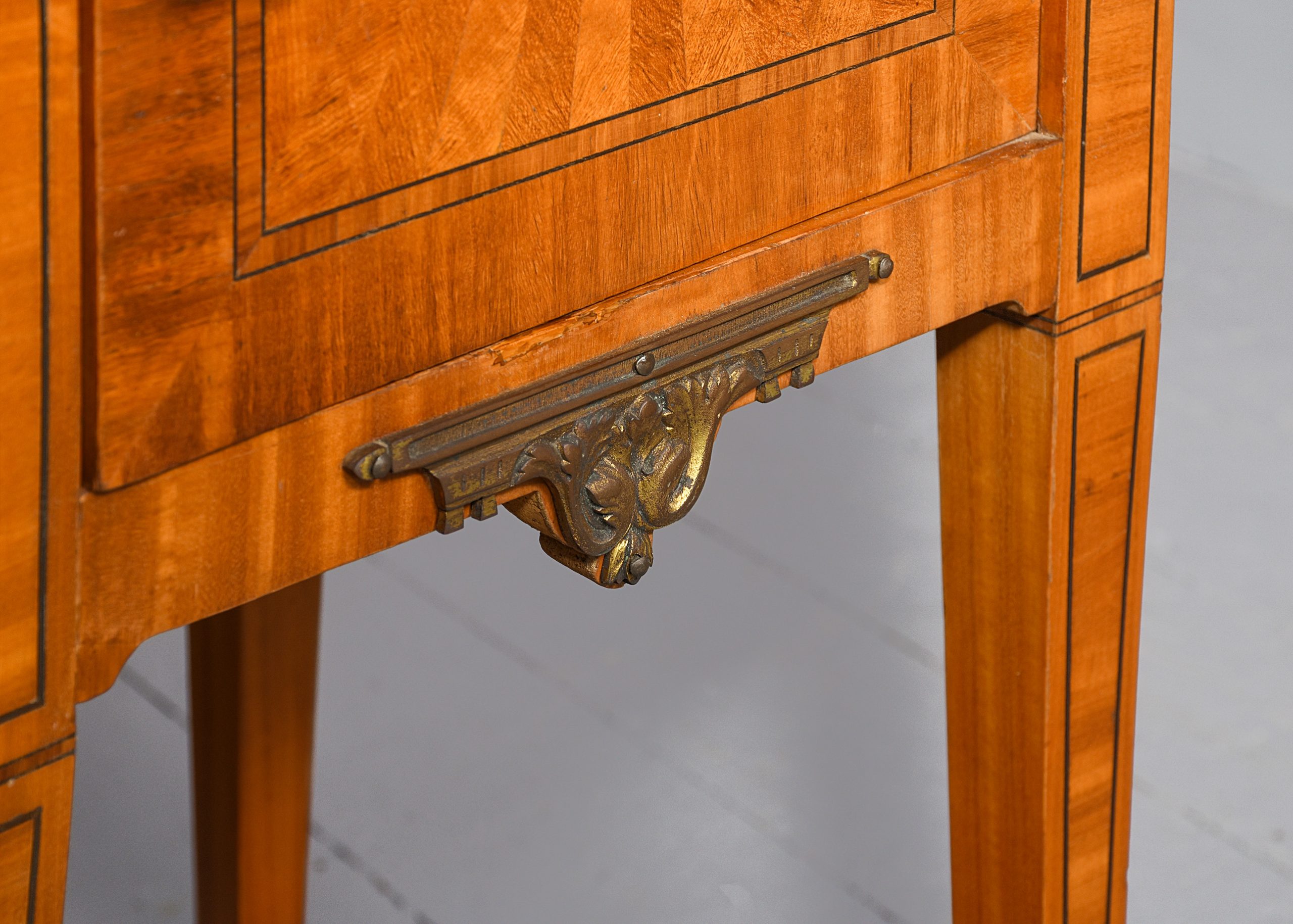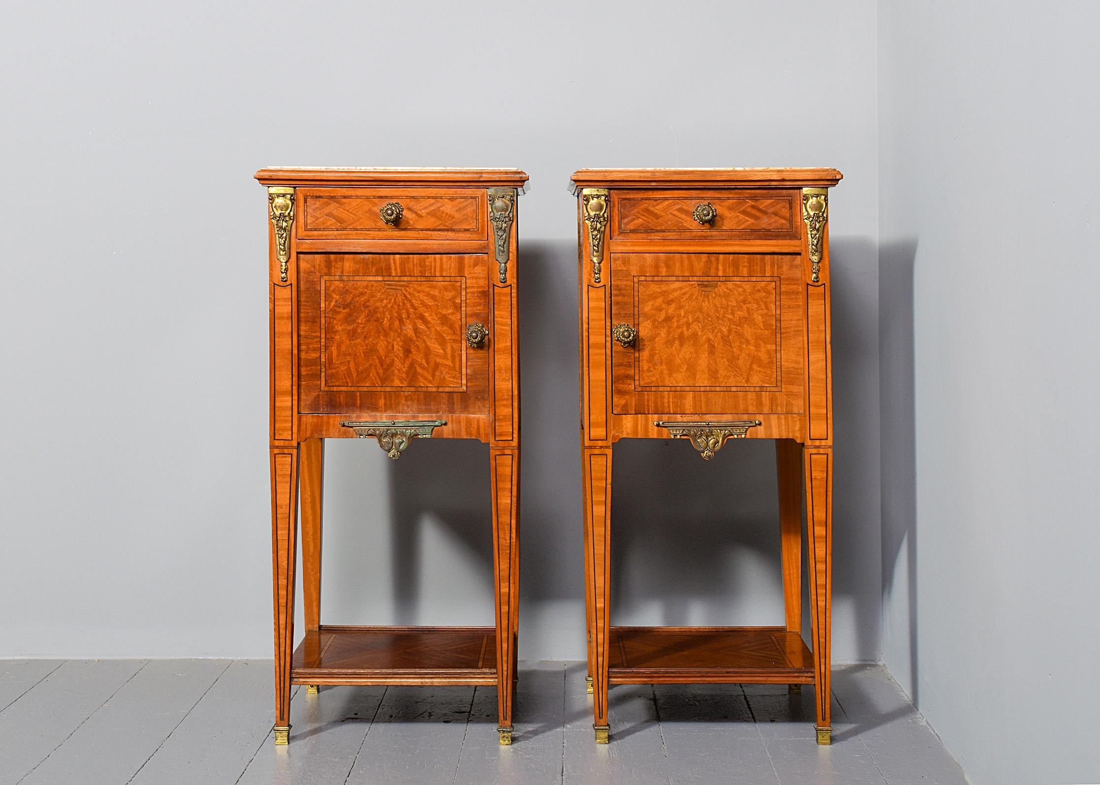 Circa 1880. A pair of exhibition quality French pink variegated marble top bedside pedestals, the tops in wonderful pink variegated marble within a moulded frame, the frieze with a full-length drawer with broad banding, inlay and geometric parquetry, flanked by a pair of gilded mounts, below a cupboard with a similar handle and a sunburst in geometric patterns with satinwood and kingwood inlay, the frieze with a stylish mount, resting of four square tapering inlaid legs, intersected by a shelf with similar inlay to the doors, on cast brass feet, the pair of pedestals are polished on all sides making them freestanding.