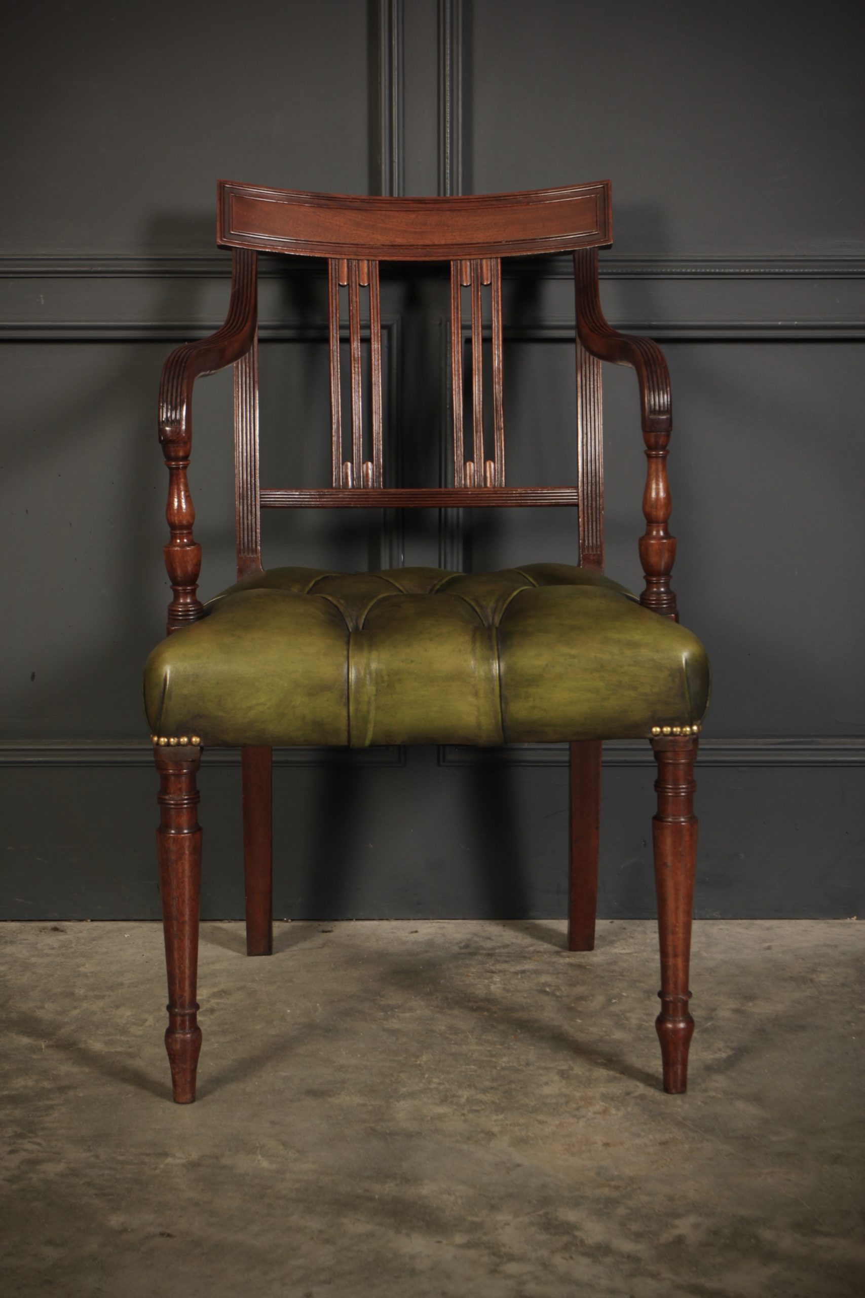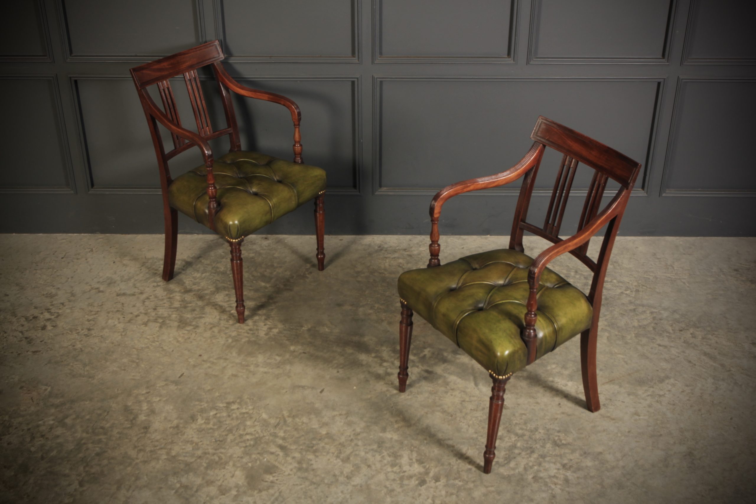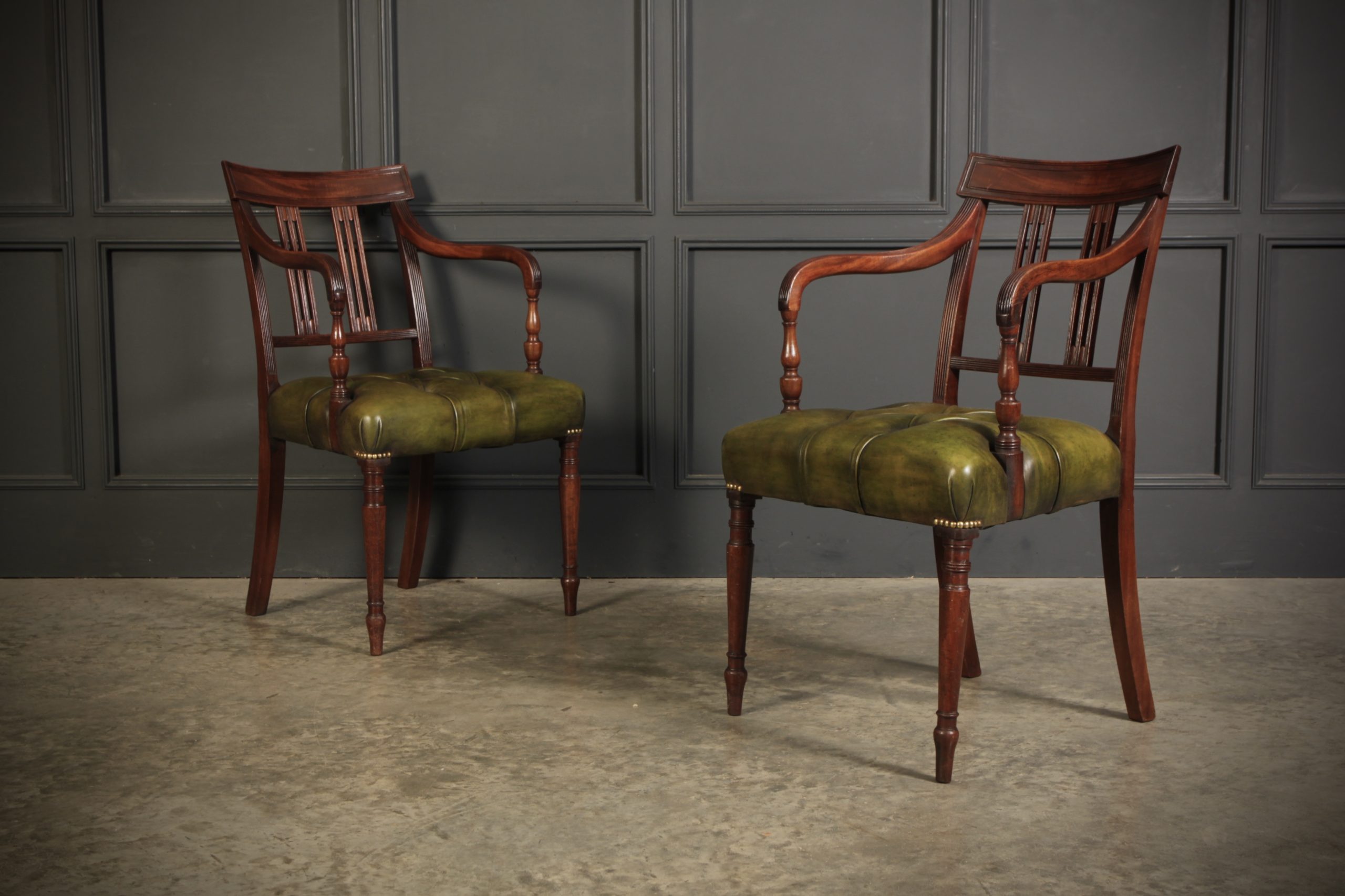 The mahogany frames have bar back supports, with reeded detailing down the arms and lovely turned legs.