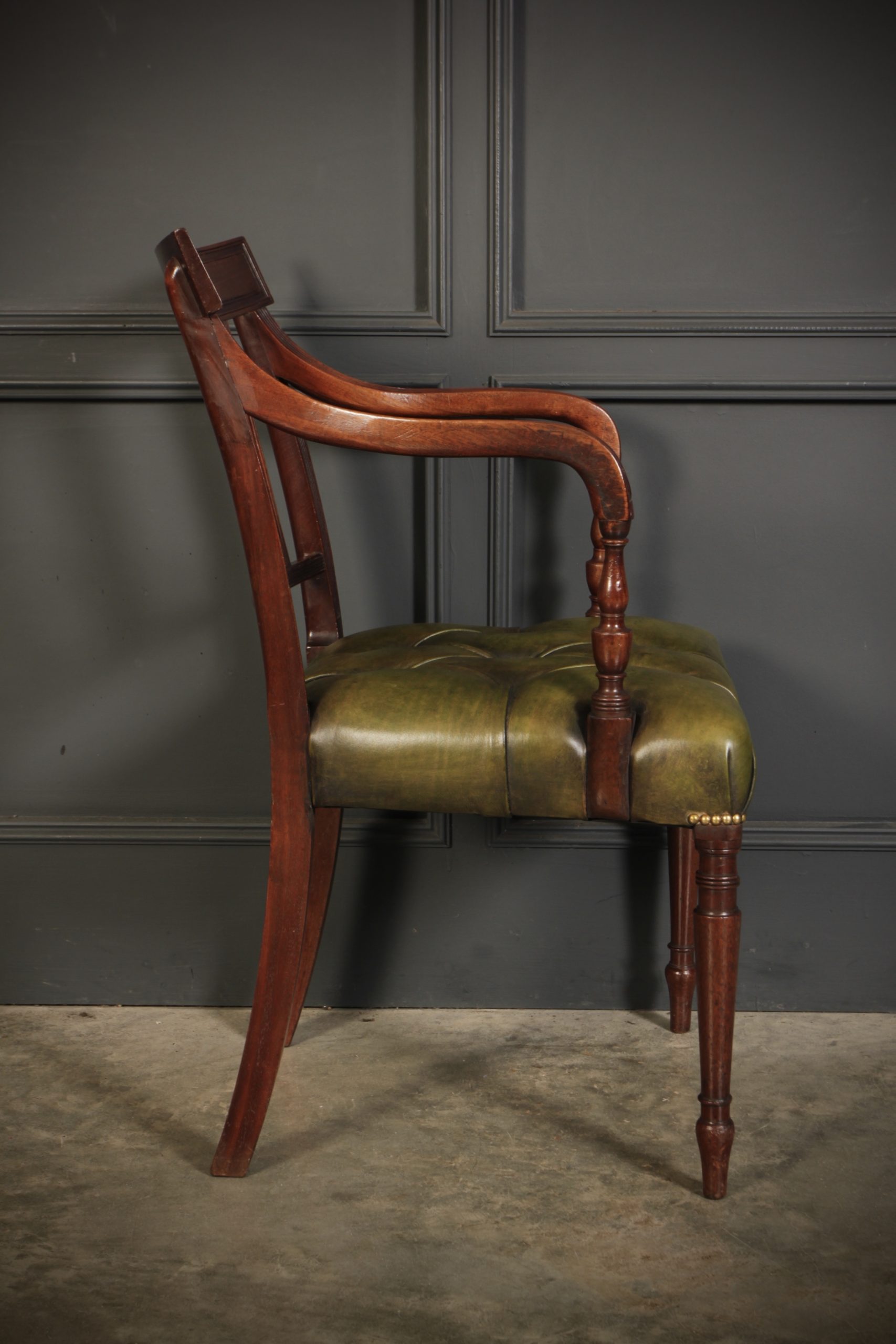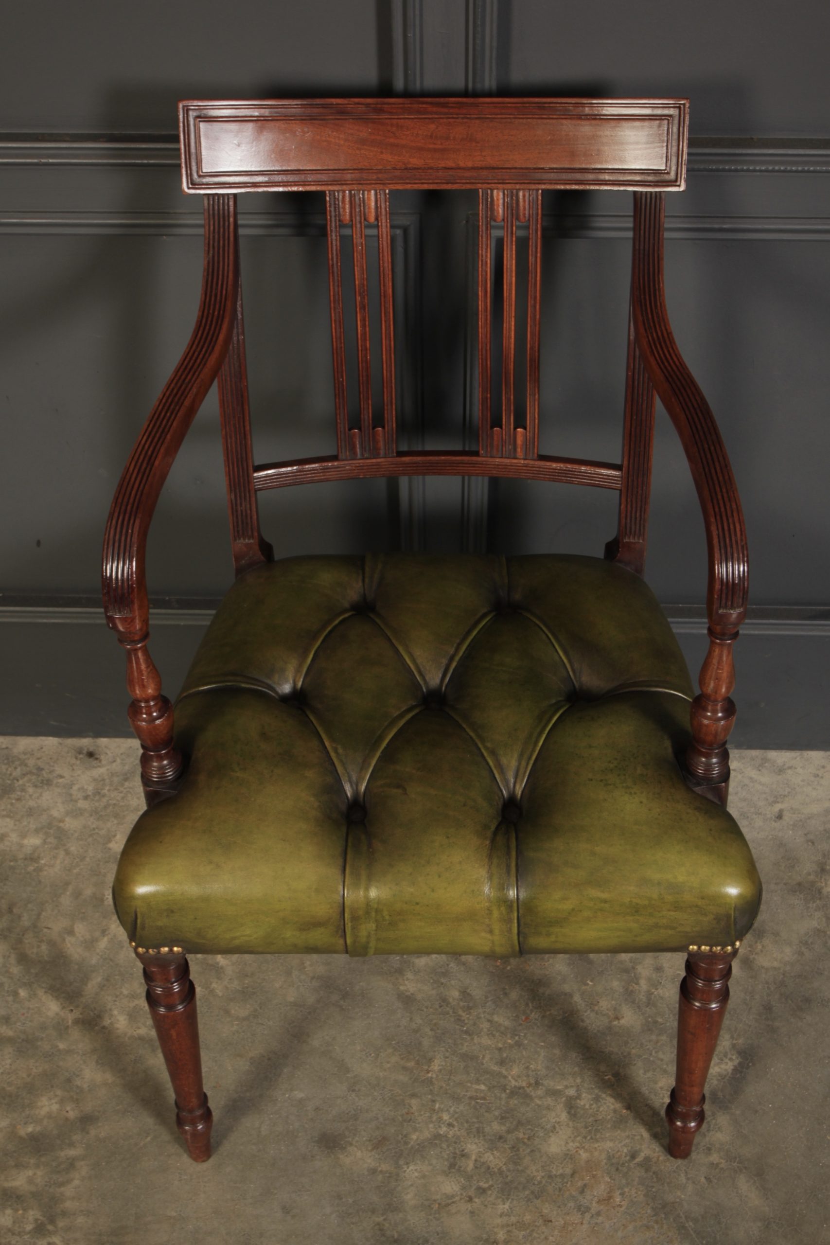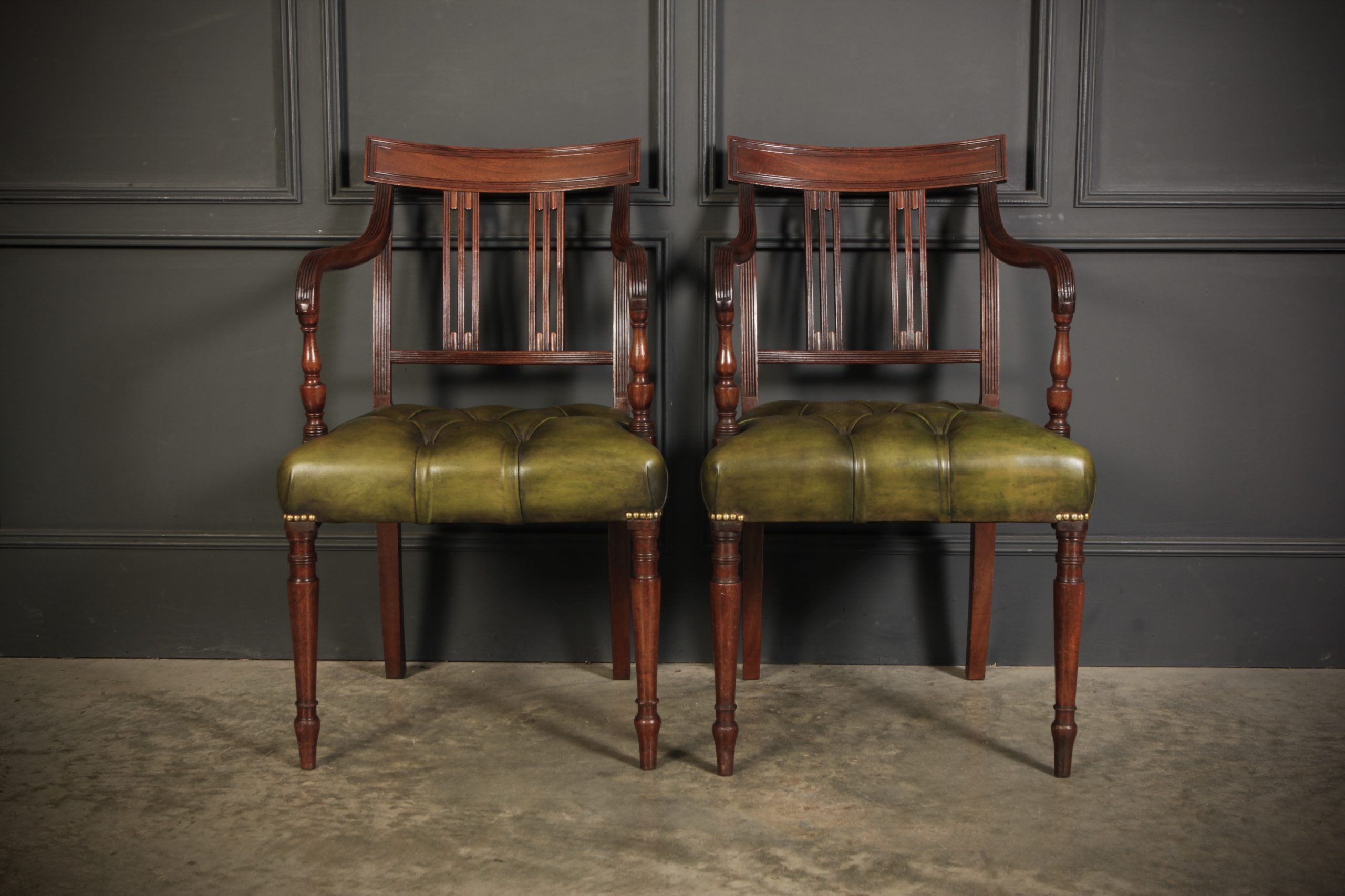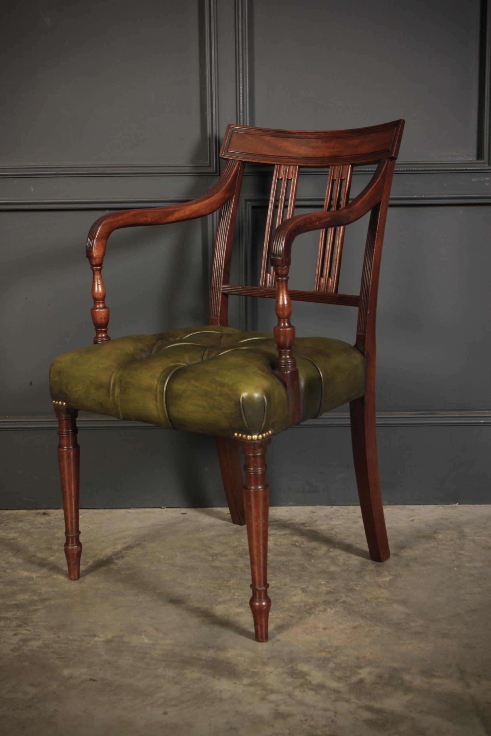 The mahogany frames have bar back supports, with reeded detailing down the arms and lovely turned legs.