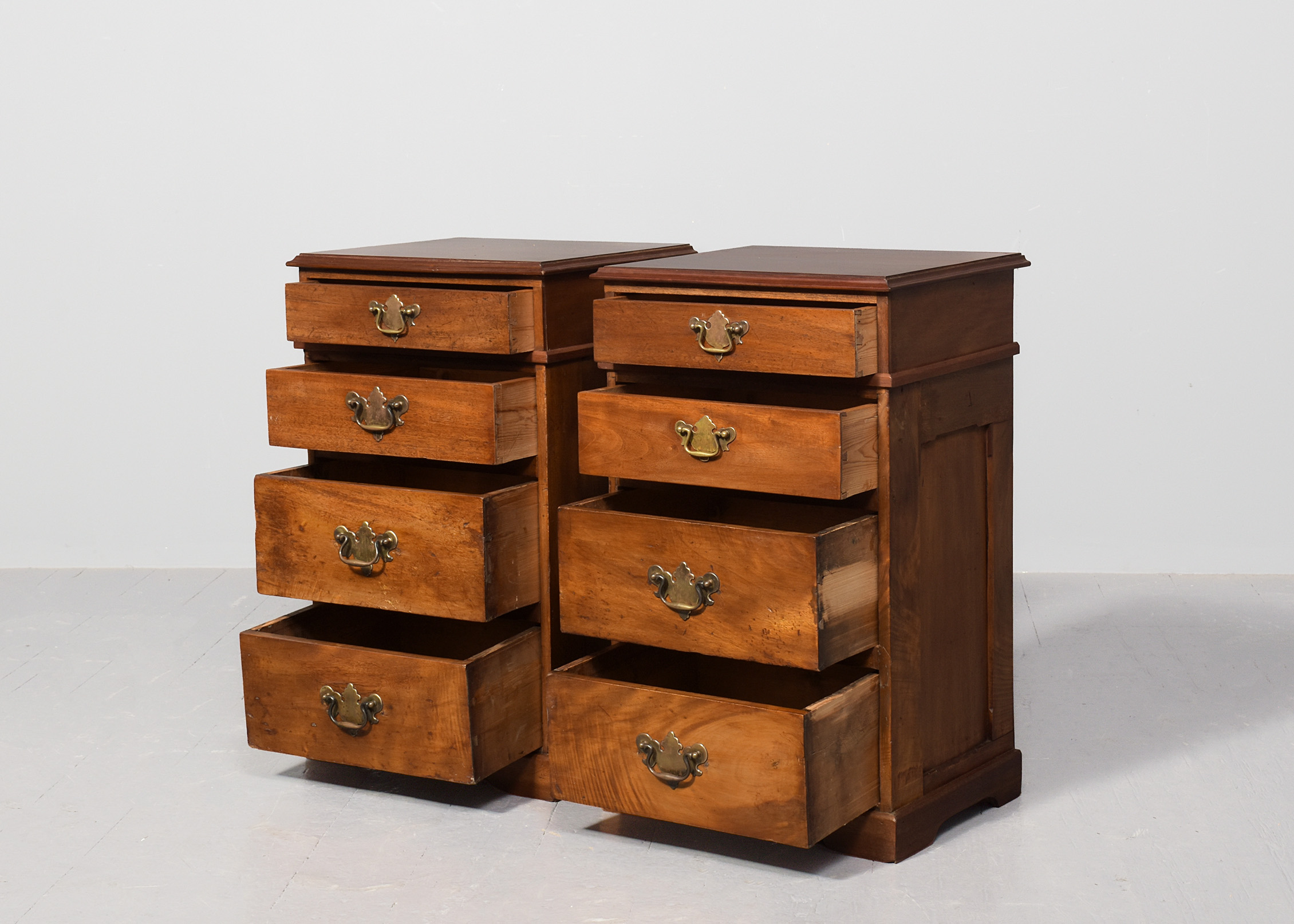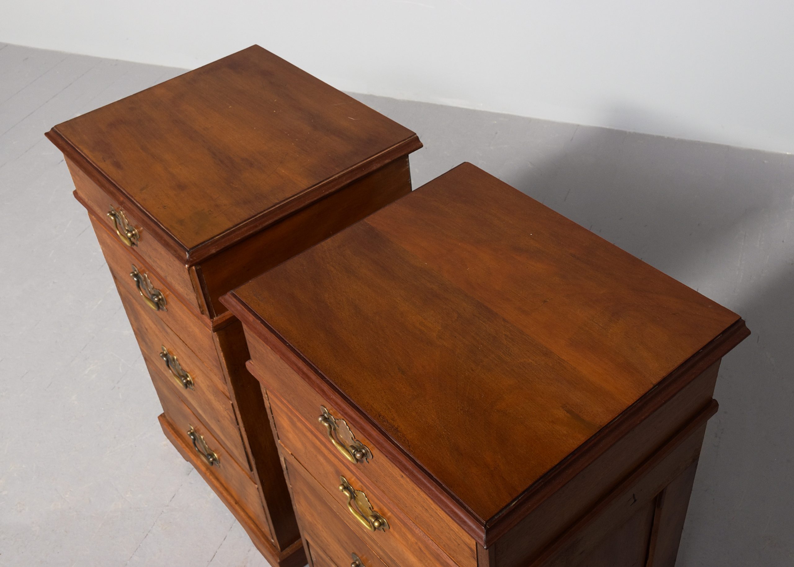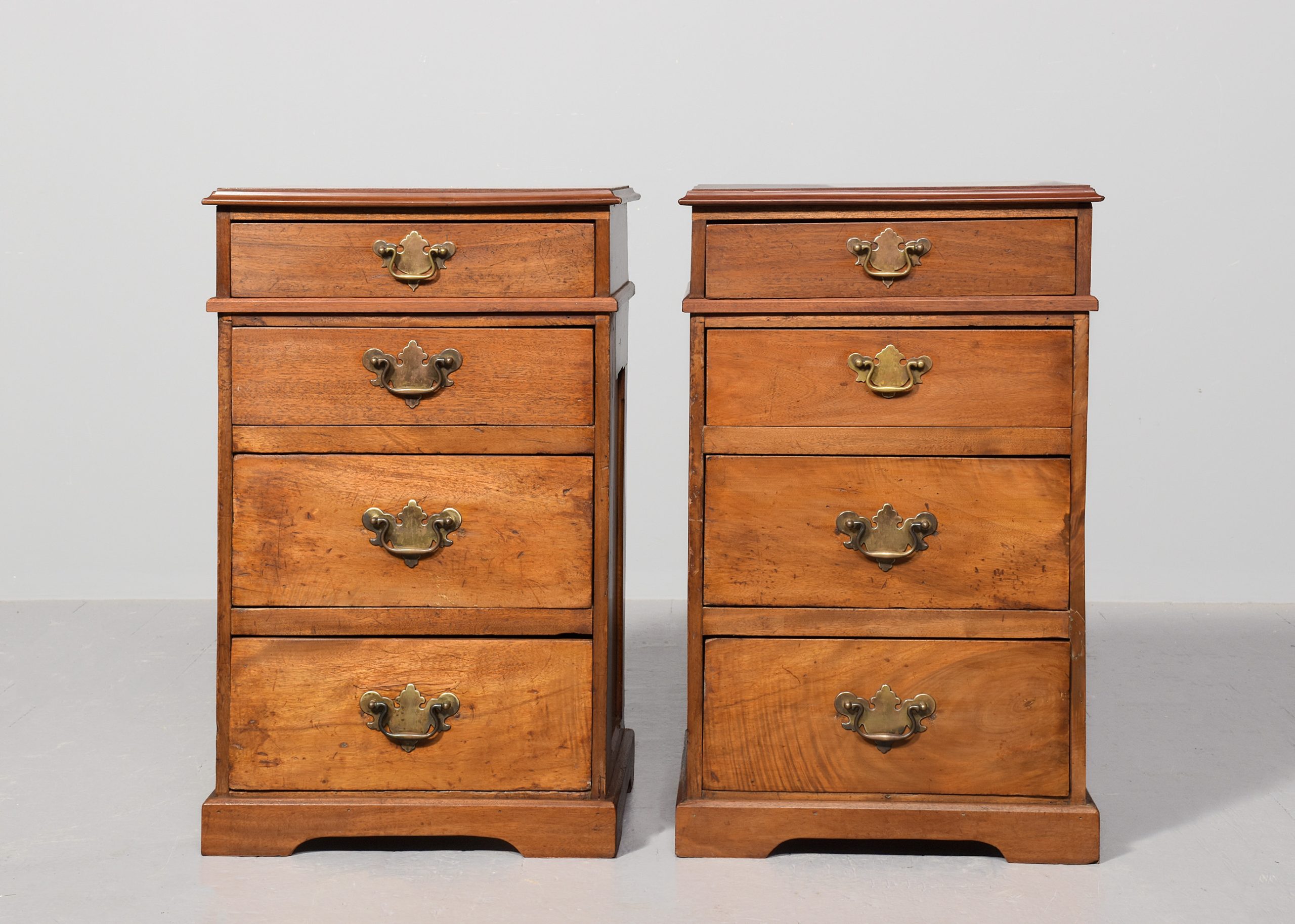 Circa 1850 with adaptations. Pair of Georgian-style. neat-sized chest of drawers/bedside lockers. The rectangular tops in nicely figured mahogany with a moulded fore edge above four graduated drawers with Georgia style cut brass handles and all supported on neat bracket feet.