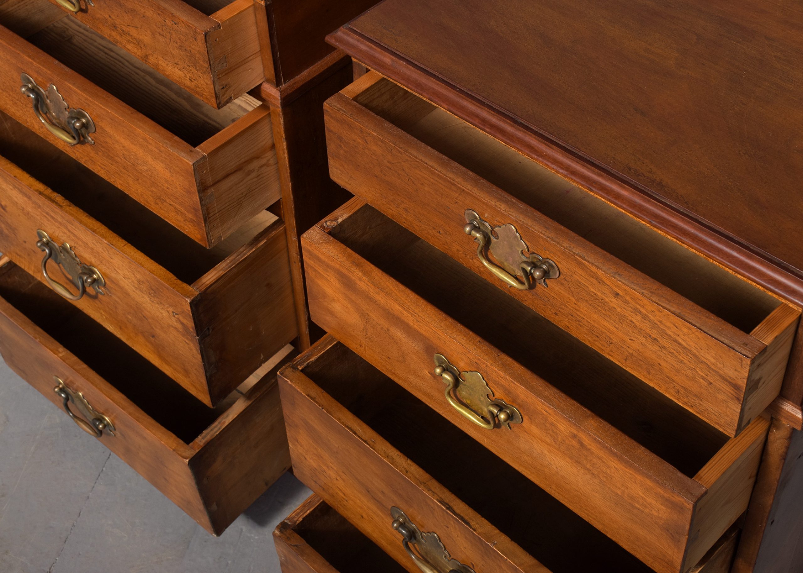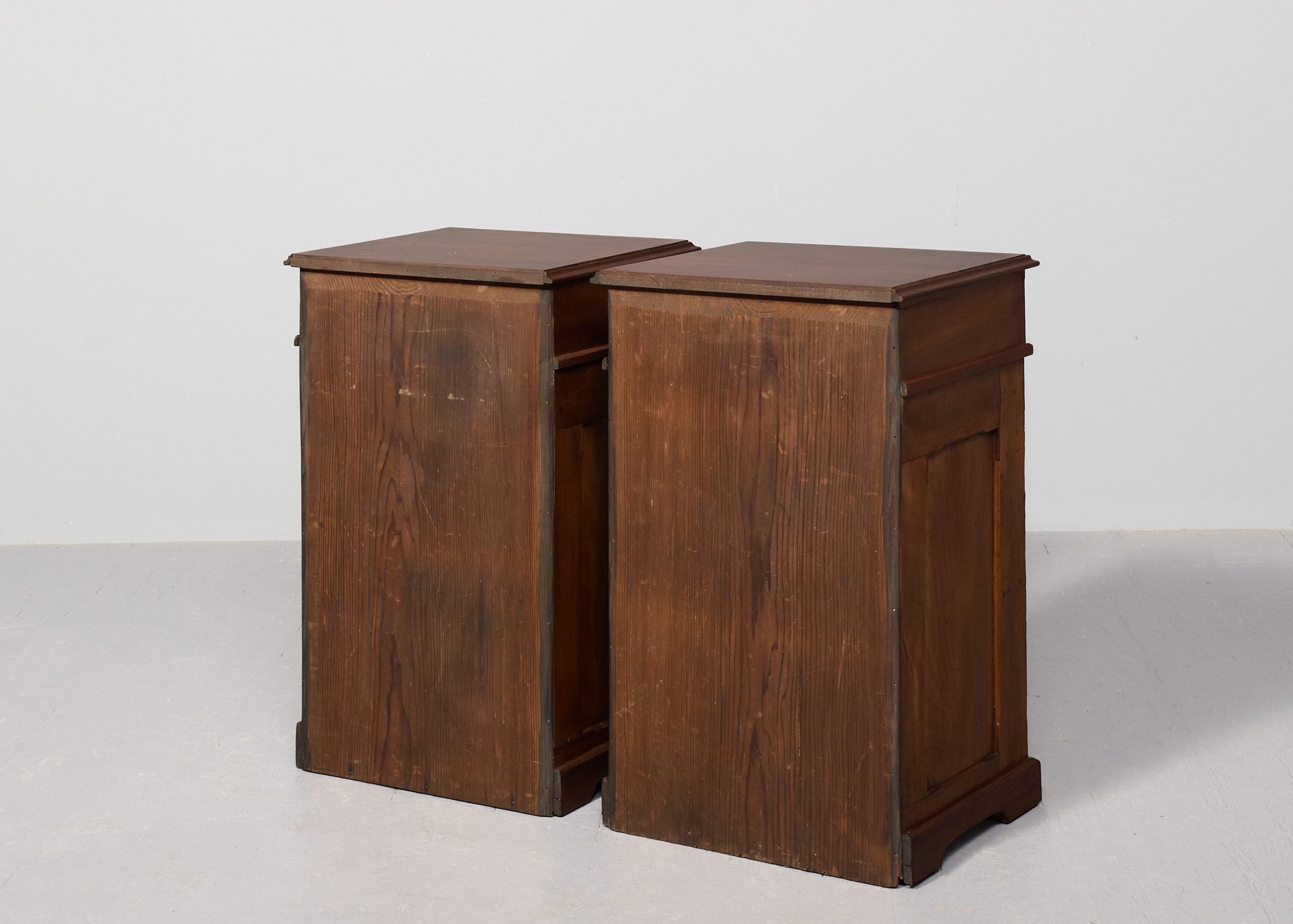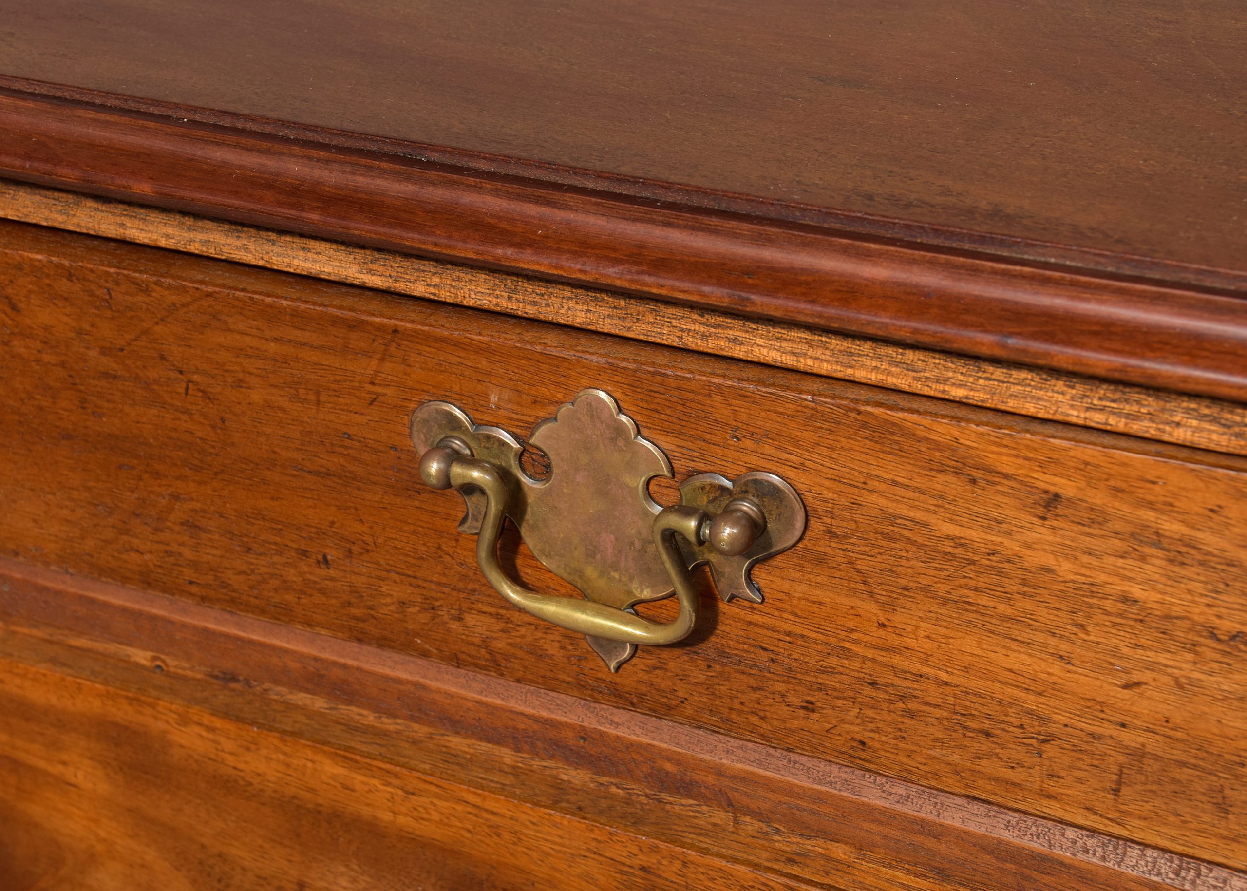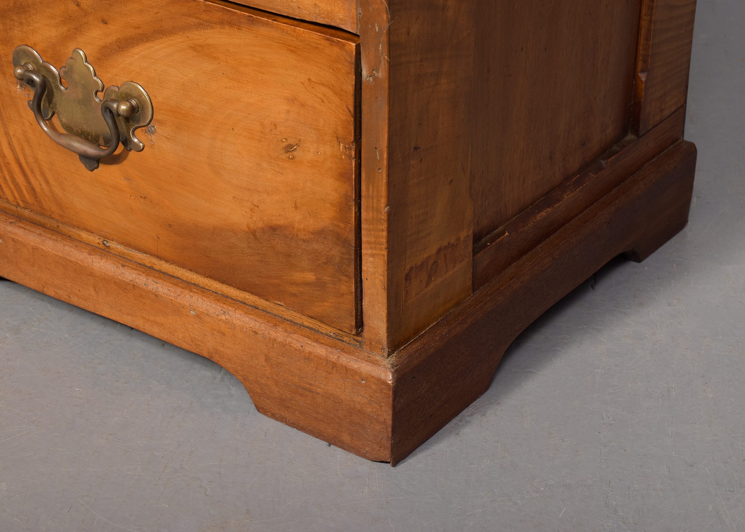 Circa 1850 with adaptations. Pair of Georgian-style. neat-sized chest of drawers/bedside lockers. The rectangular tops in nicely figured mahogany with a moulded fore edge above four graduated drawers with Georgia style cut brass handles and all supported on neat bracket feet.