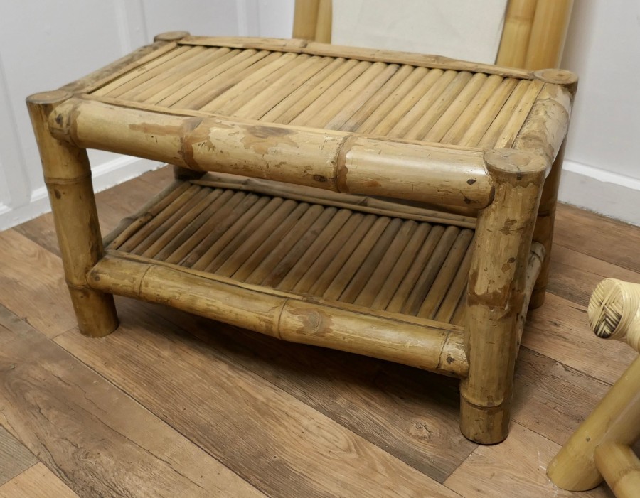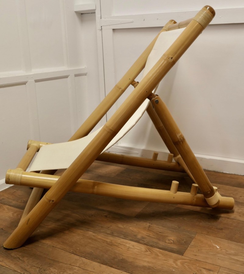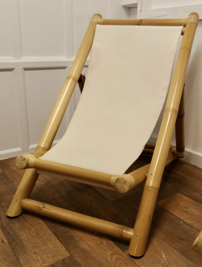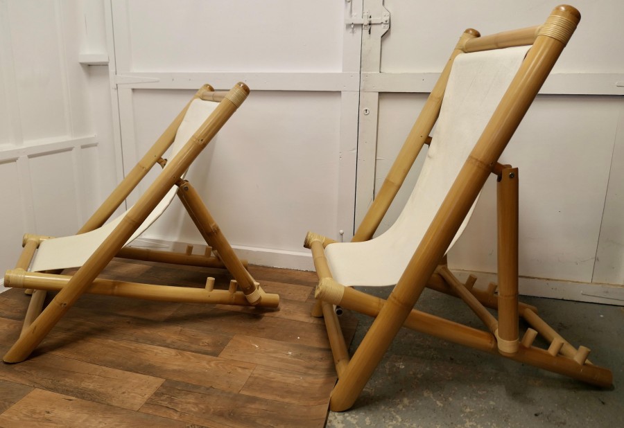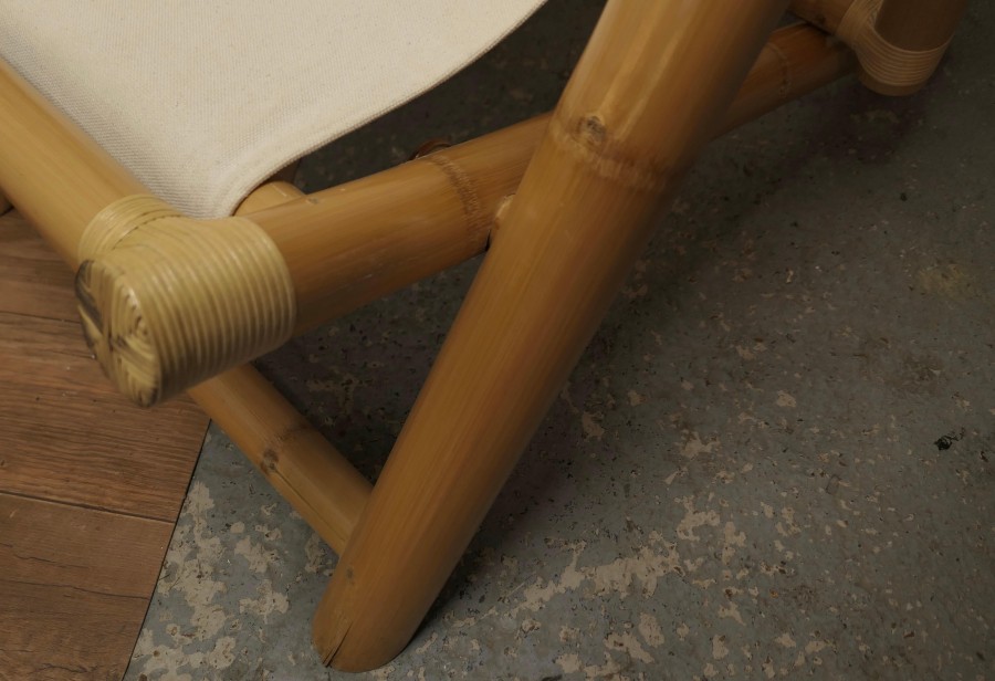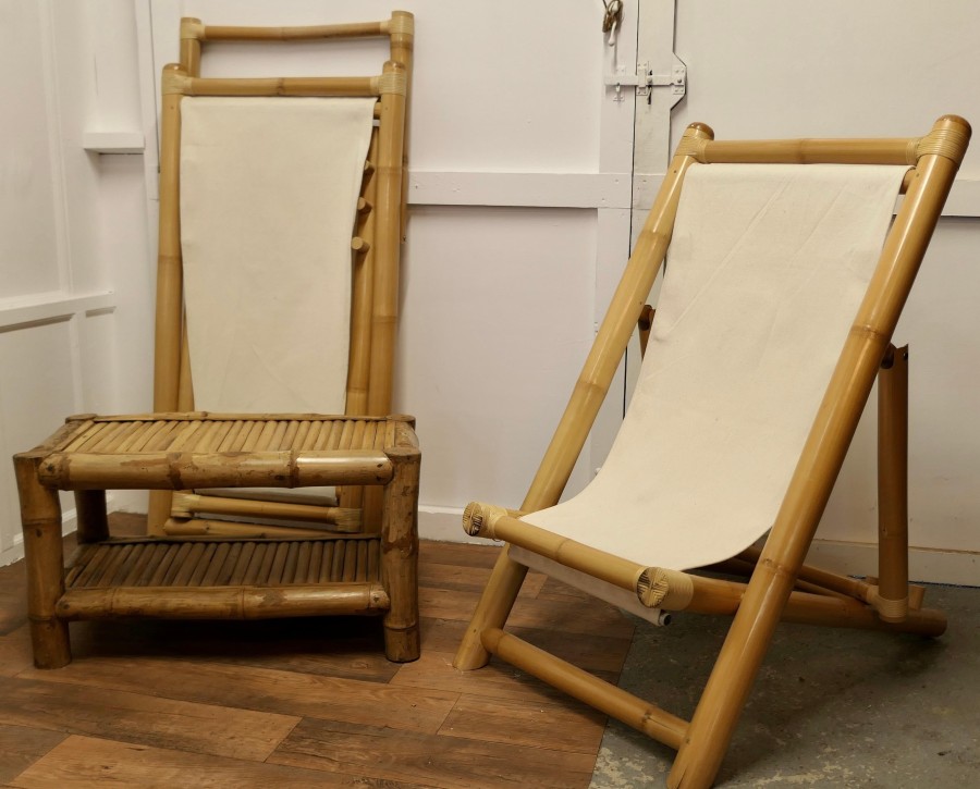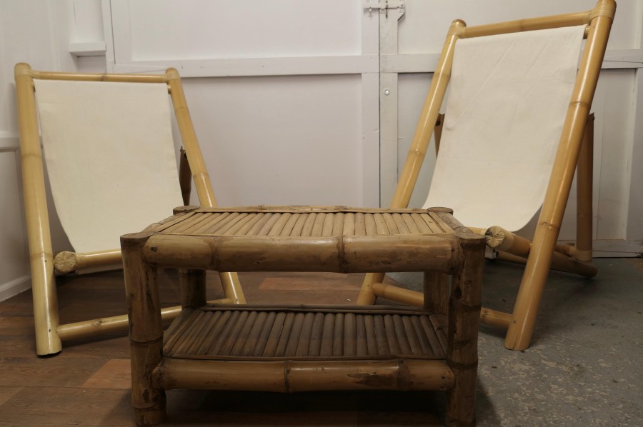 A Pair of Giant Bamboo Deck Chair Set with Coffee Table These super folding Chairs are meds with giant bamboo and have canvas sail cloth seats, they are in very good condition, we have matched then with a giant bamboo boat shaped coffee table with an undertier The chairs fold and are completely adjustable, they are 50” x 29” wide and 45” at the floor The coffee table is 20 high, and 36” x 22” MS91. Manufacture Date : 1960 Materials : Bamboo