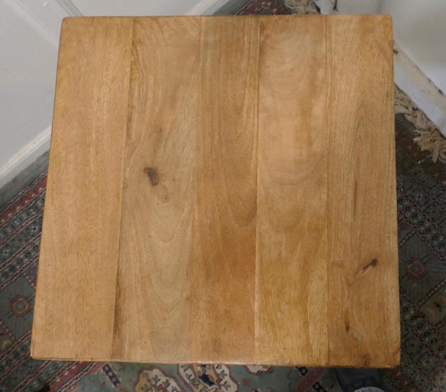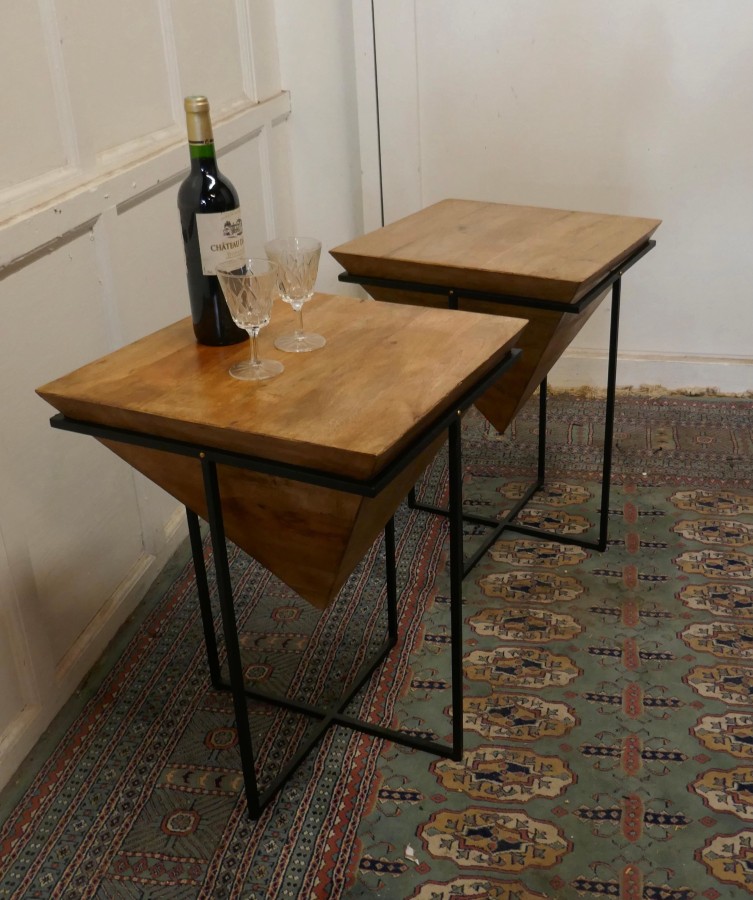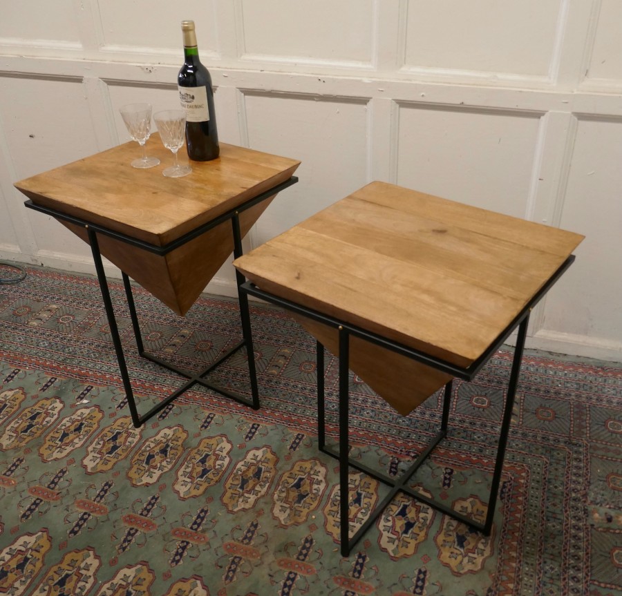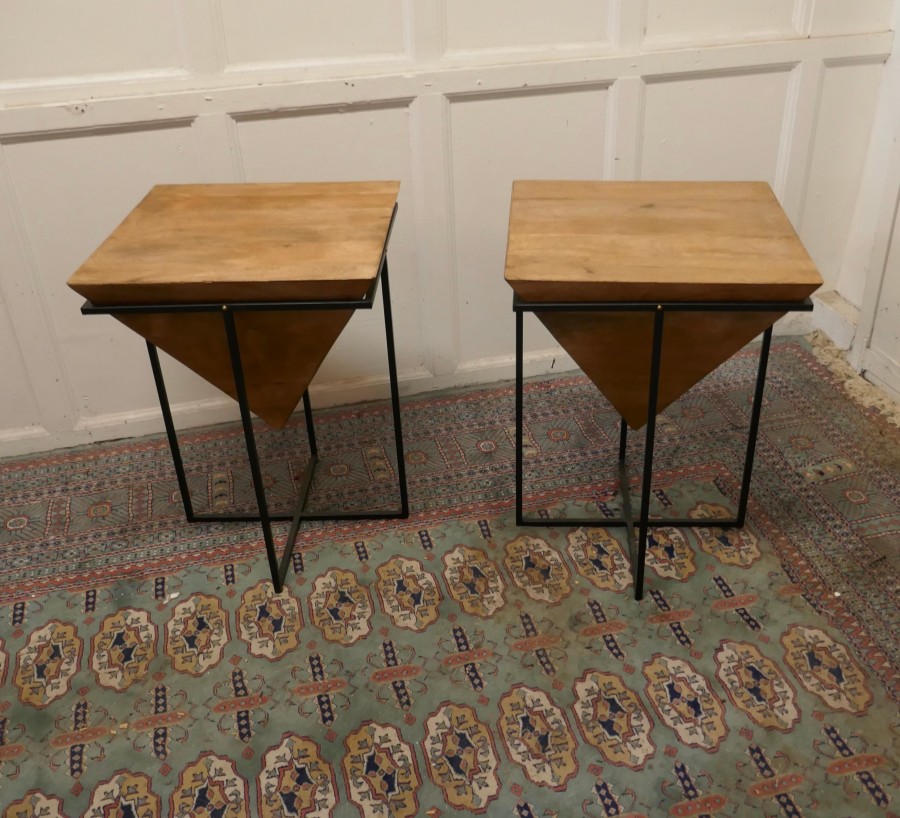 A pair of inverted pyramid occasional tables The tables are made from very precisely cut fruit wood in a pyramid shape which is inverted and set in a black steel frame These unusual table make excellent Side tables, they are 24” tall and 18” square TNV160. Manufacture Date : 1960 Materials : Fruitwood