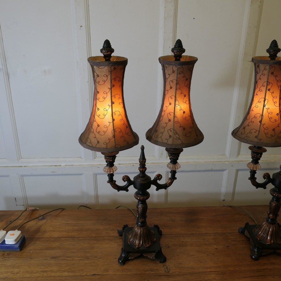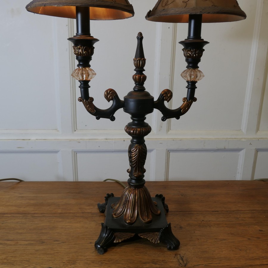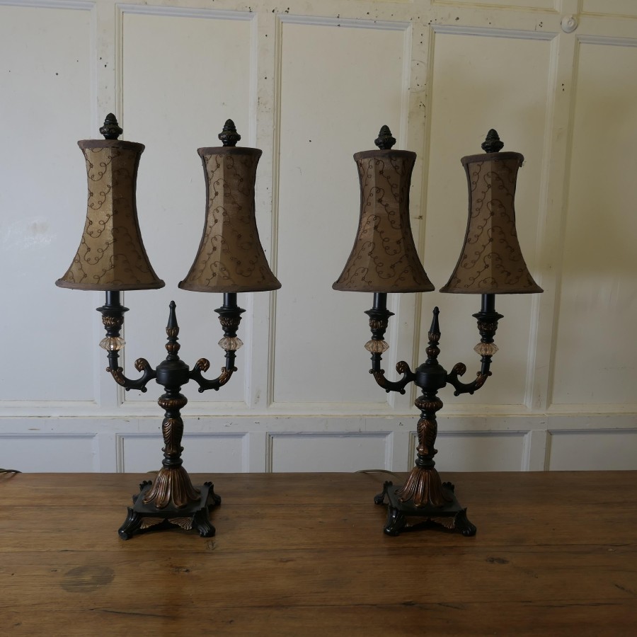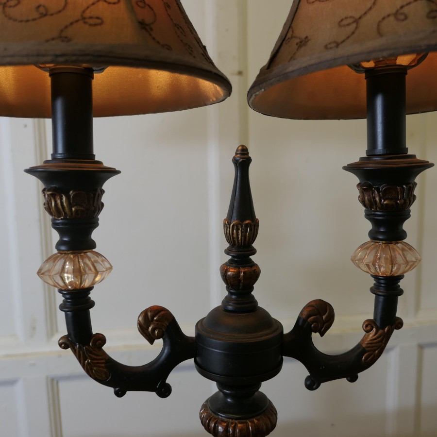 Pair of Large Art Deco Hollywood Regency Twin Table Lamps These are grand looking pieces, the lamps are black with coper gilding and jewelled decoration, they each have 2 large branches topped with a tall hand made lampshade All in good working condition with an age related patina The lamps are 30” tall, 15” wide and 7” deep CS205 Manufacture Date : 1970 Materials : Resin