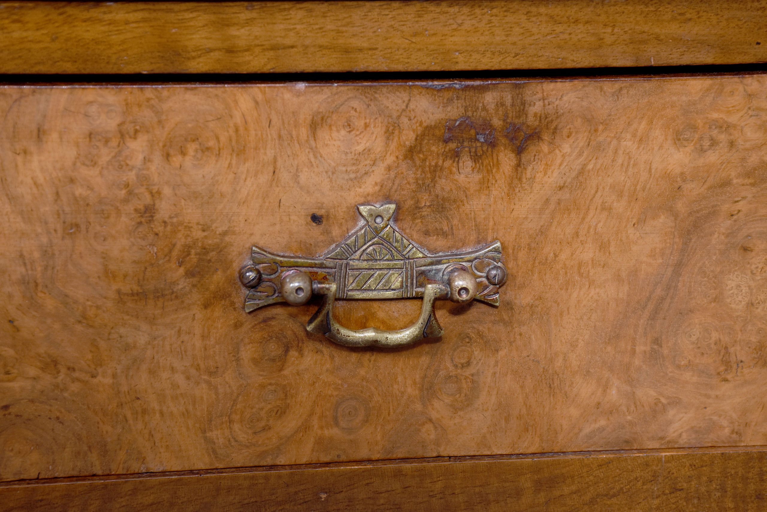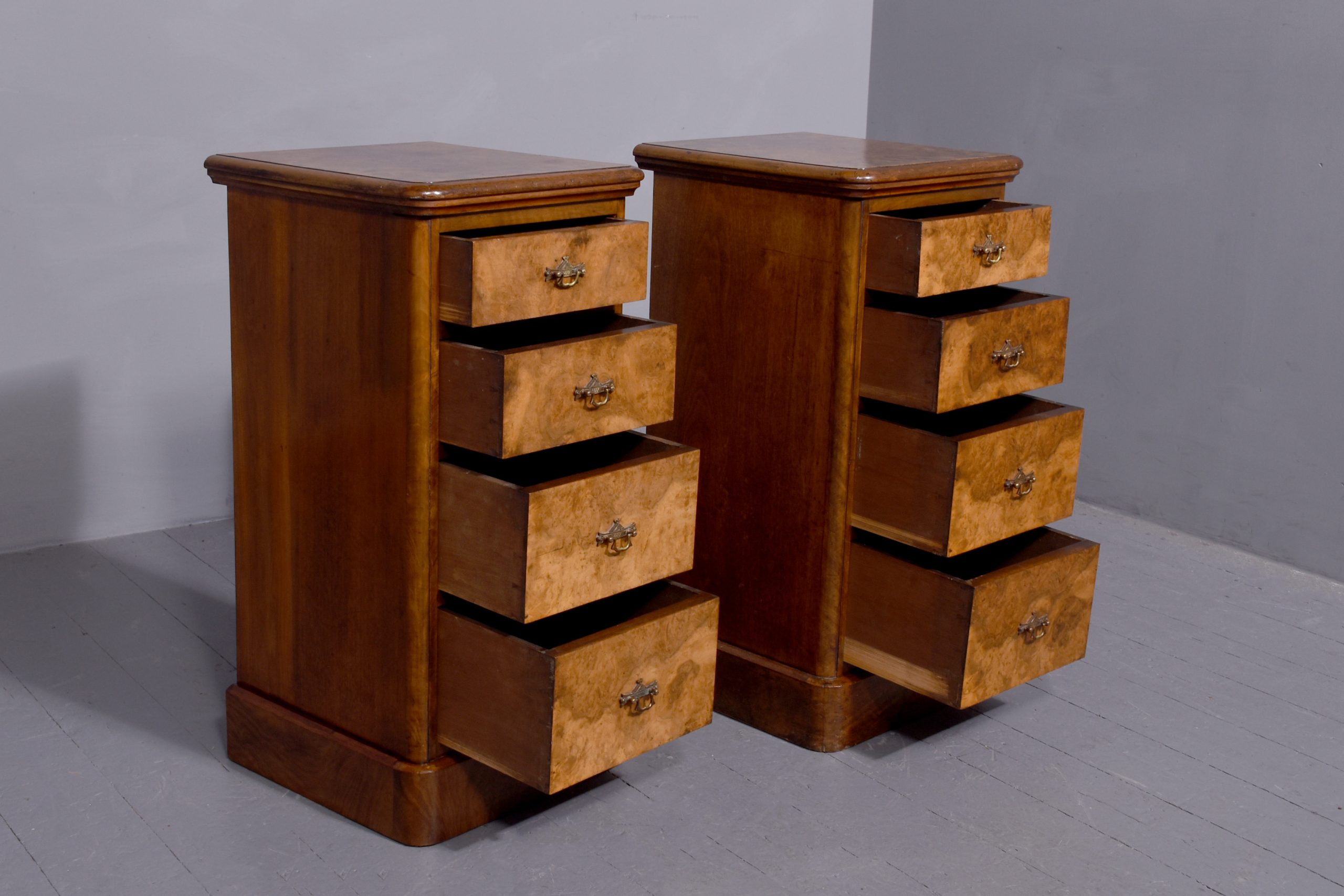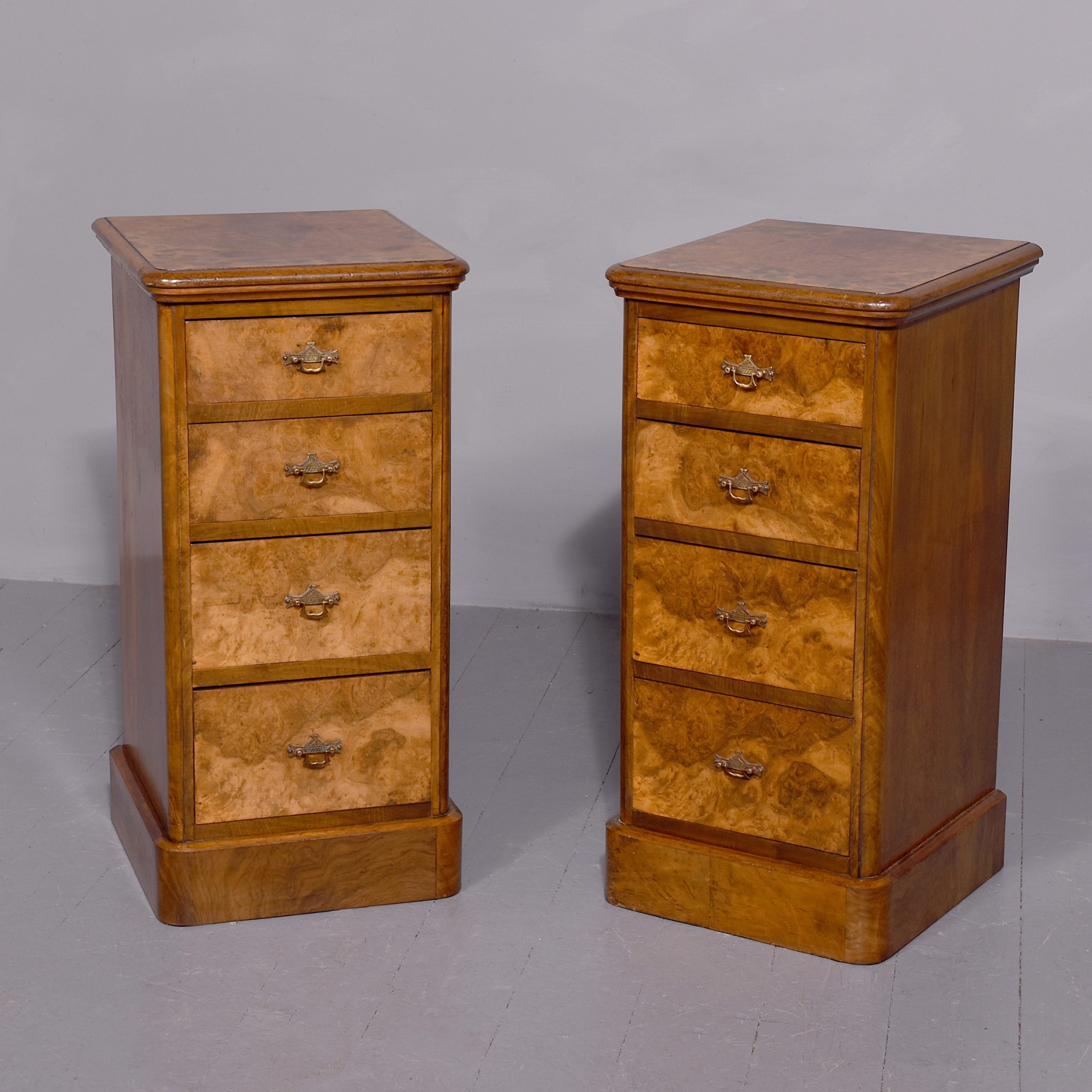 Circa 1880 with adaptations. Pair of late Victorian burr walnut small chests of drawers/bedside lockers. The rectangular tops with finely figured burr walnut and multiforme-edge above four graduated drawers with Arts and Crafts engraved solid brass handles. The chests with rounded corners are supported on moulded enclosed plinth bases. Both in perfect condition.