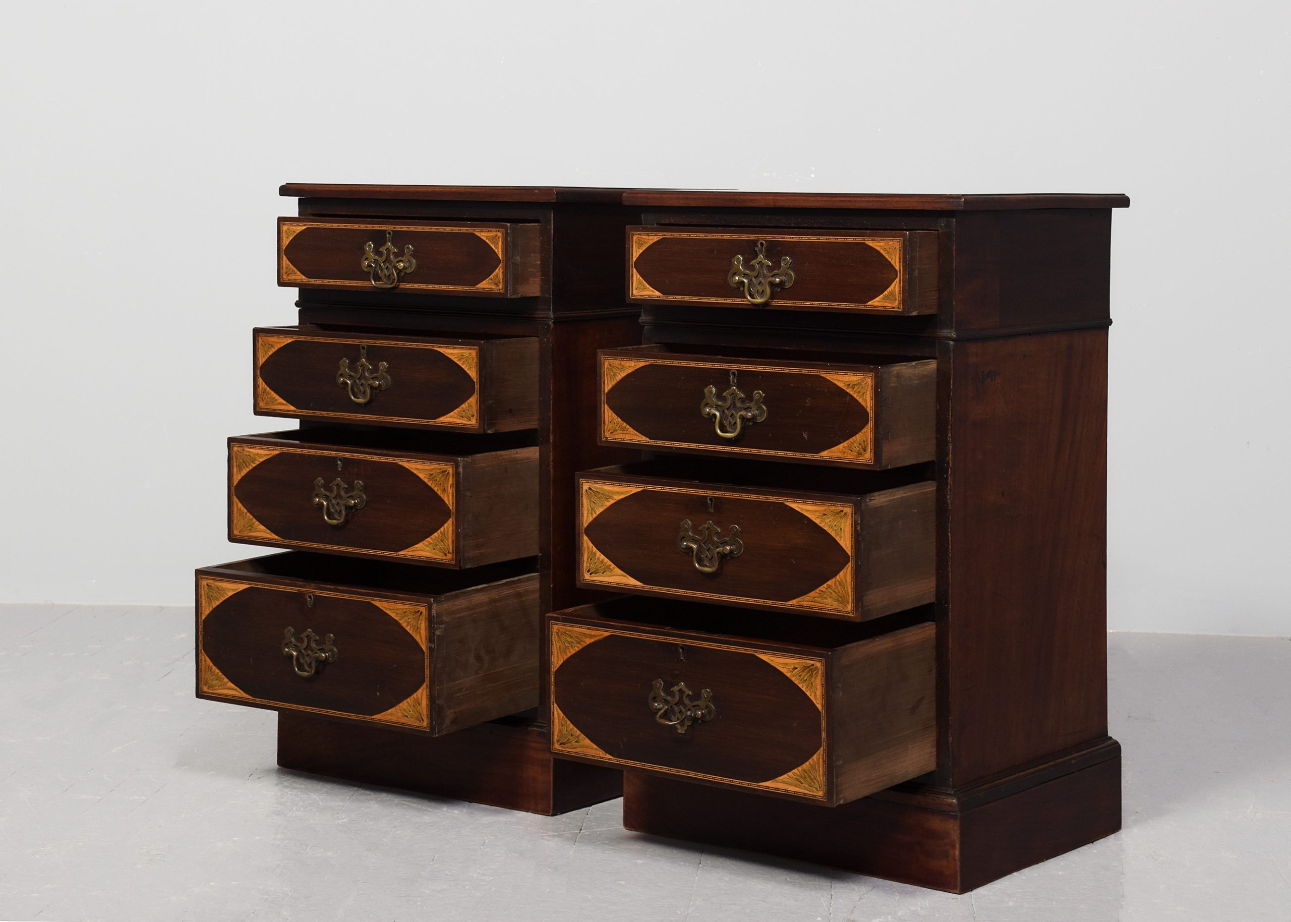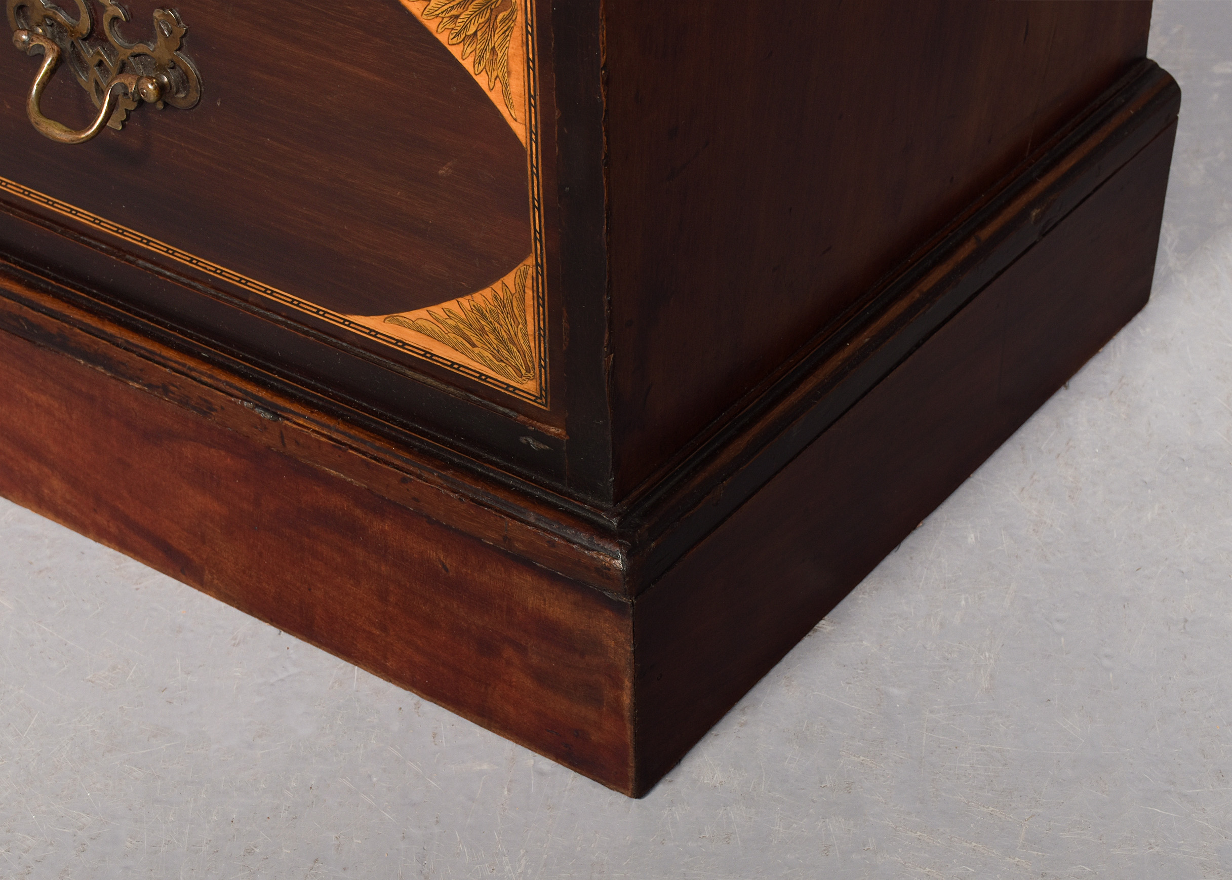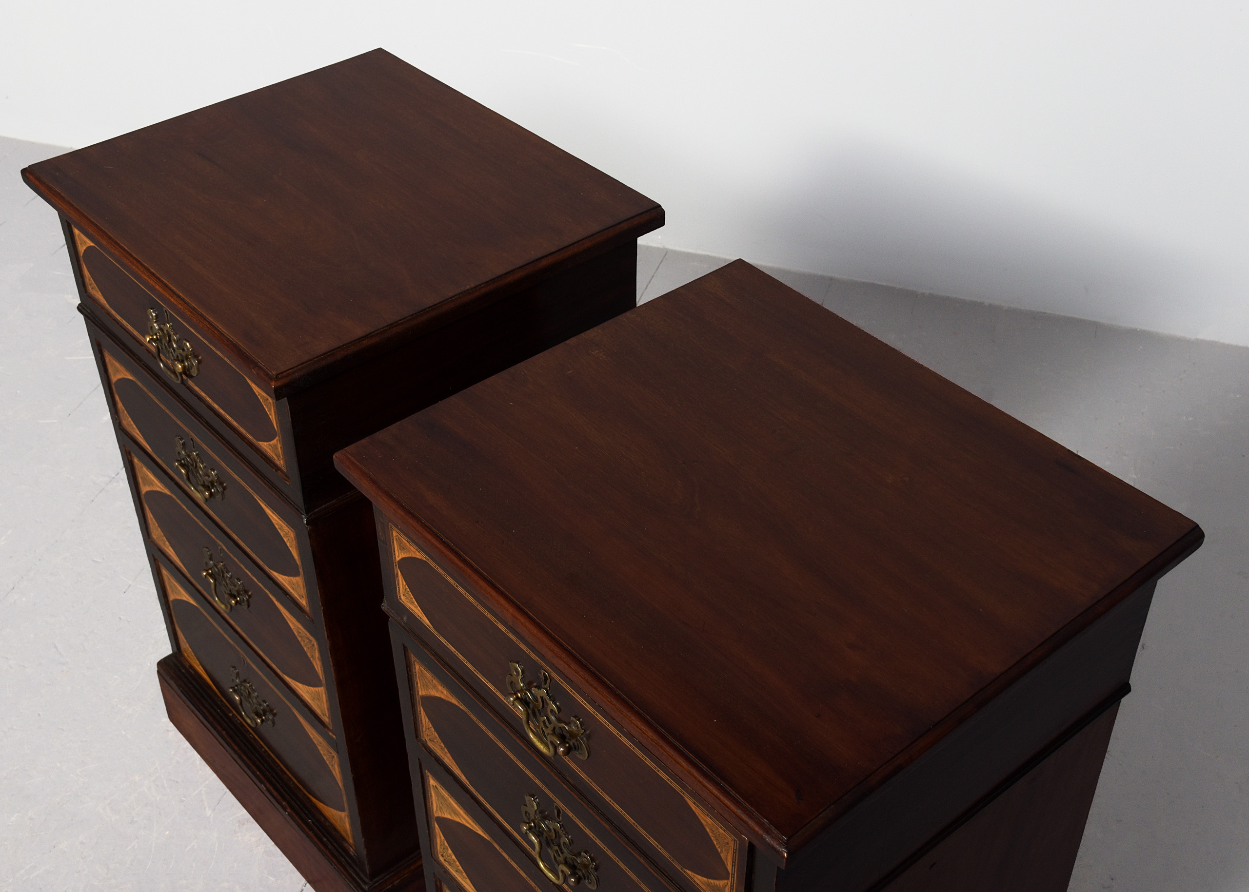 Circa 1880 with adaptations. Pair of late Victorian mahogany neat-size chest of drawers/bedside lockers. The rectangular tops with moulded fore-edges above four graduated drawers with solid mahogany drawer linings (sign of quality). The drawer fronts with satinwood and boxwood parquetry inlay with foliate inlaid corners. All supported on enclosed plinth bases.
