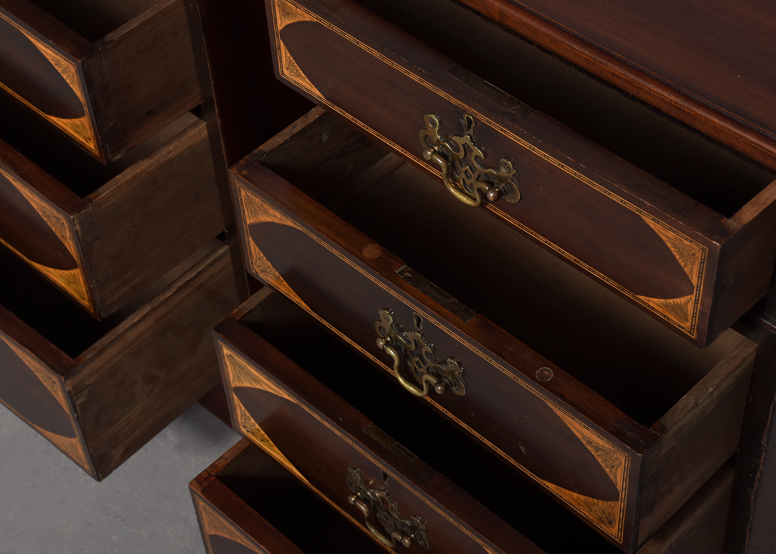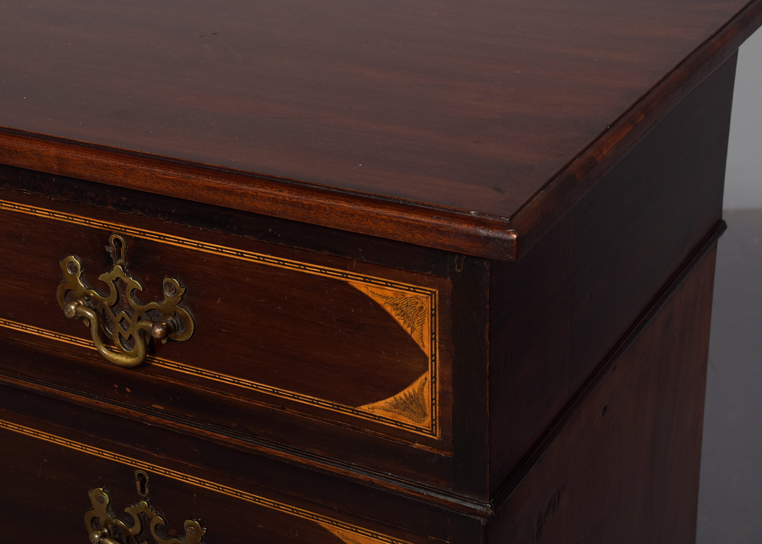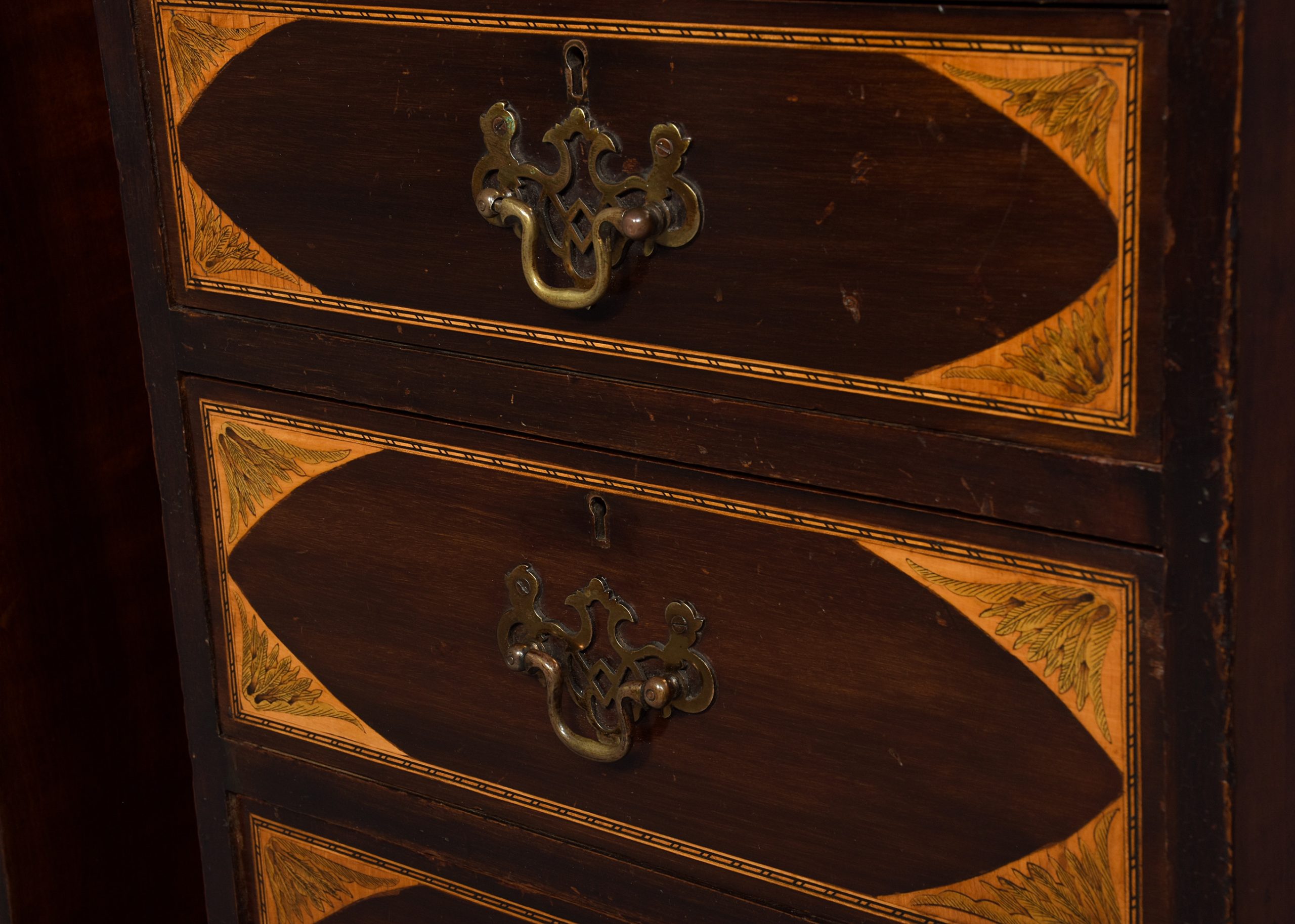 Circa 1880 with adaptations. Pair of late Victorian mahogany neat-size chest of drawers/bedside lockers. The rectangular tops with moulded fore-edges above four graduated drawers with solid mahogany drawer linings (sign of quality). The drawer fronts with satinwood and boxwood parquetry inlay with foliate inlaid corners. All supported on enclosed plinth bases.