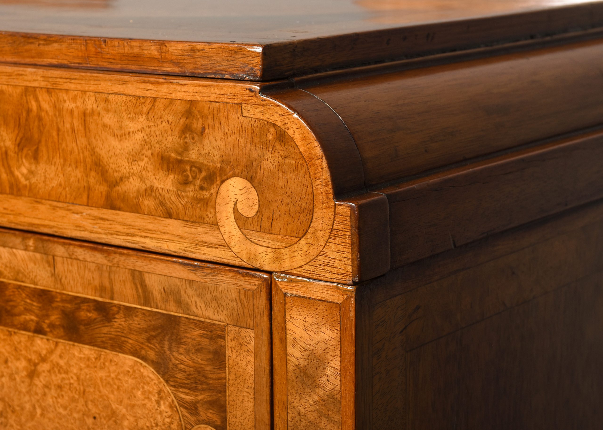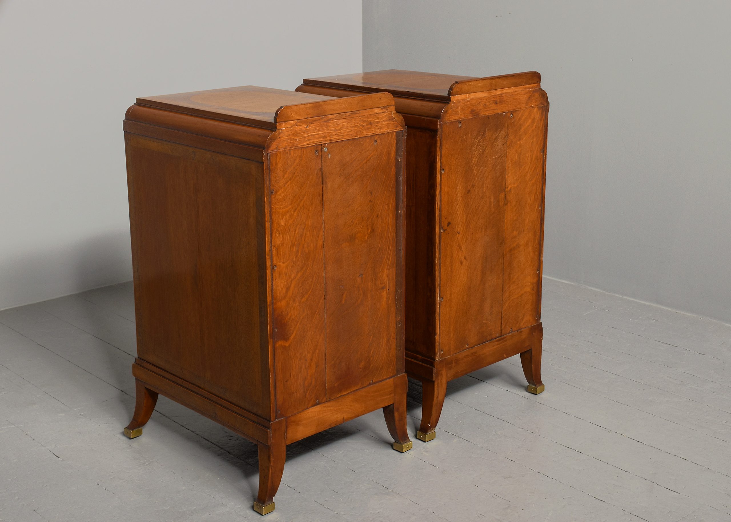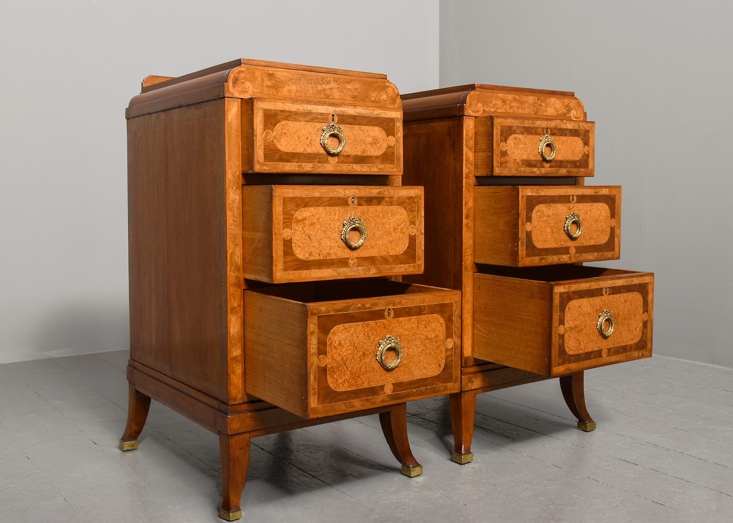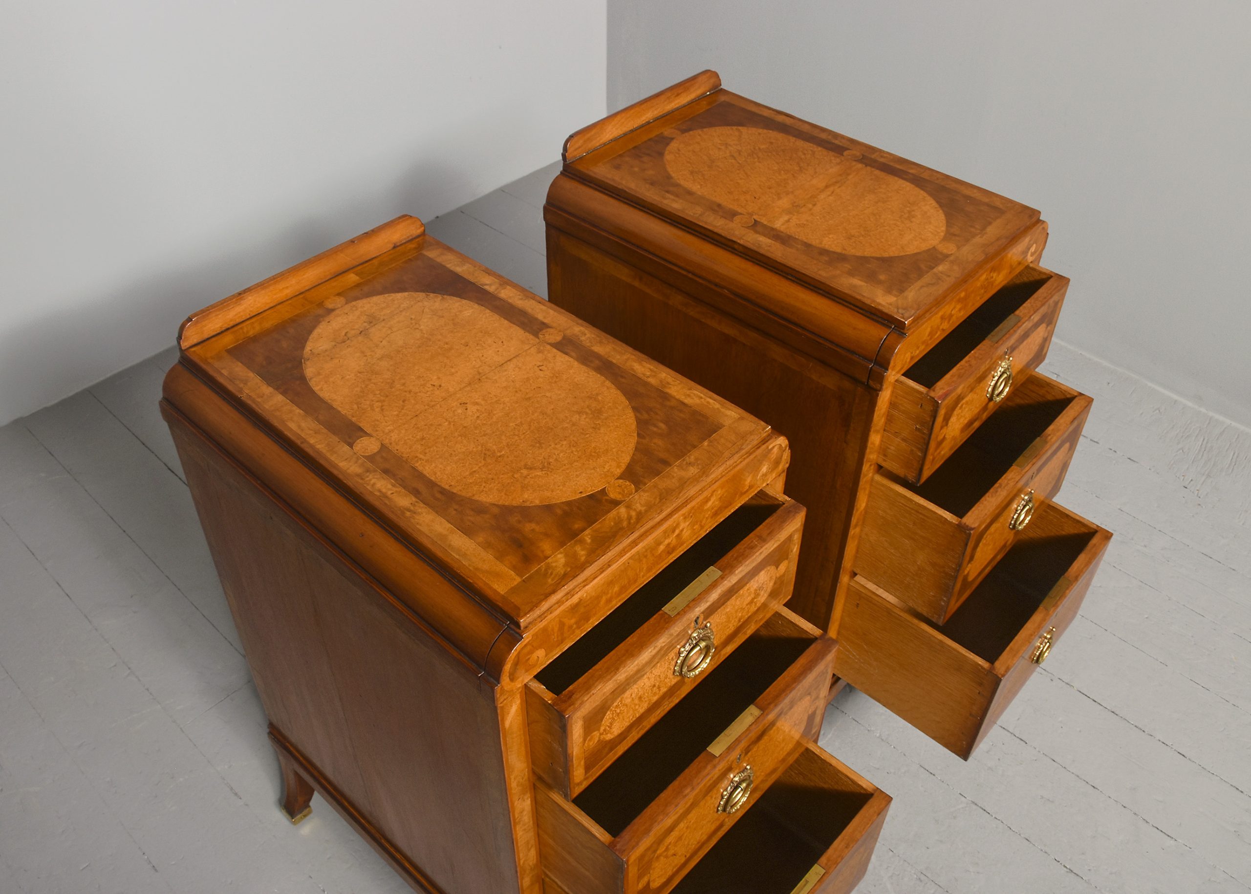 Circa 1880. Pair of late Victorian pedestals/bedside lockers in walnut, burr elm and harewood. The rectangular tops with inlaid panels of Burr Elm and Boxwood inlay, above hidden secret top drawers and three graduated drawers with matching burr Elm and boxwood inlay and elaborate brass handles. Flanked by Burr Walnut pilasters and all sitting on a rectangular base over shaped feet with brass toes. Unusual and quality items with solid oak drawer linings, brass locks, and solid oak backs.