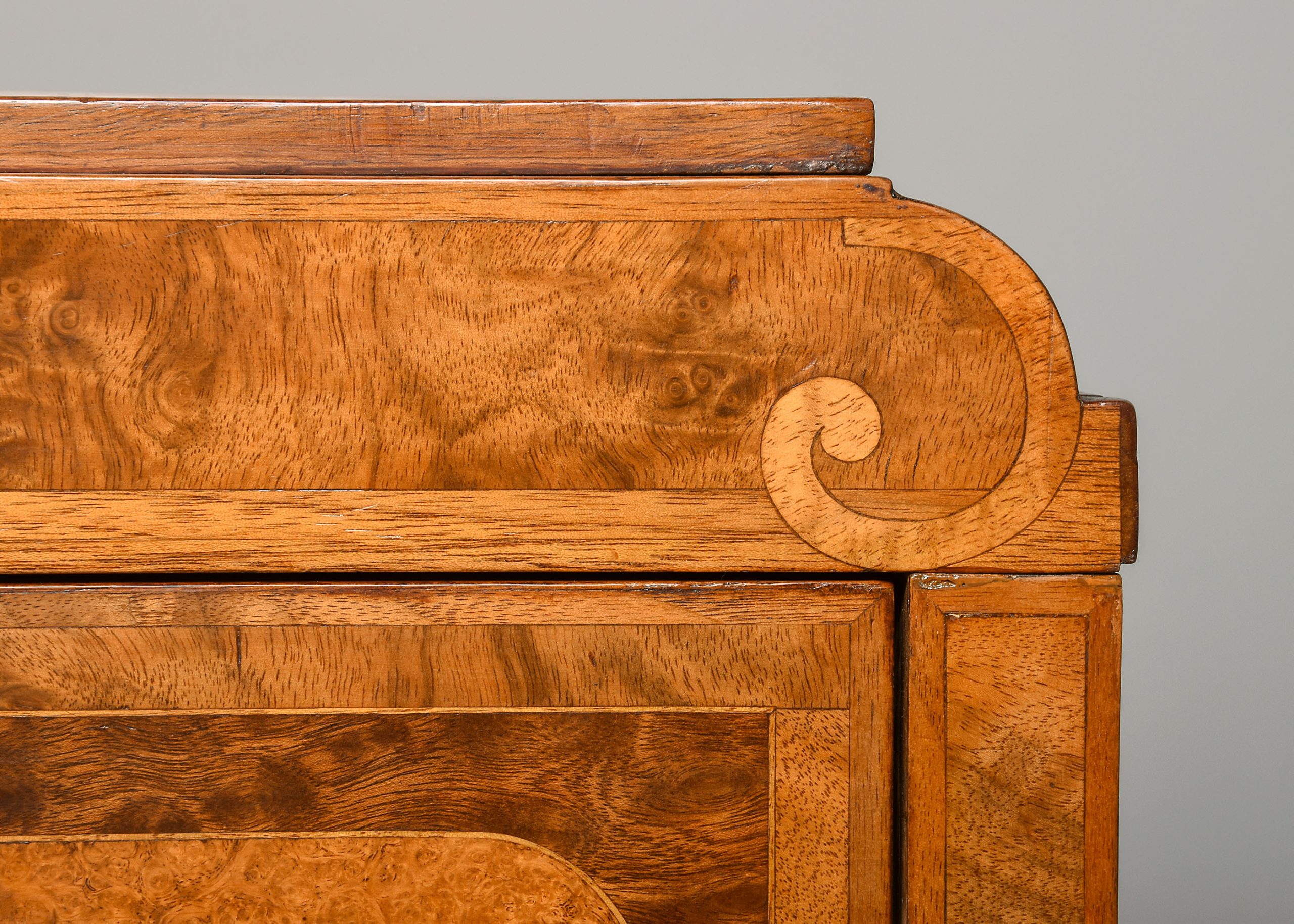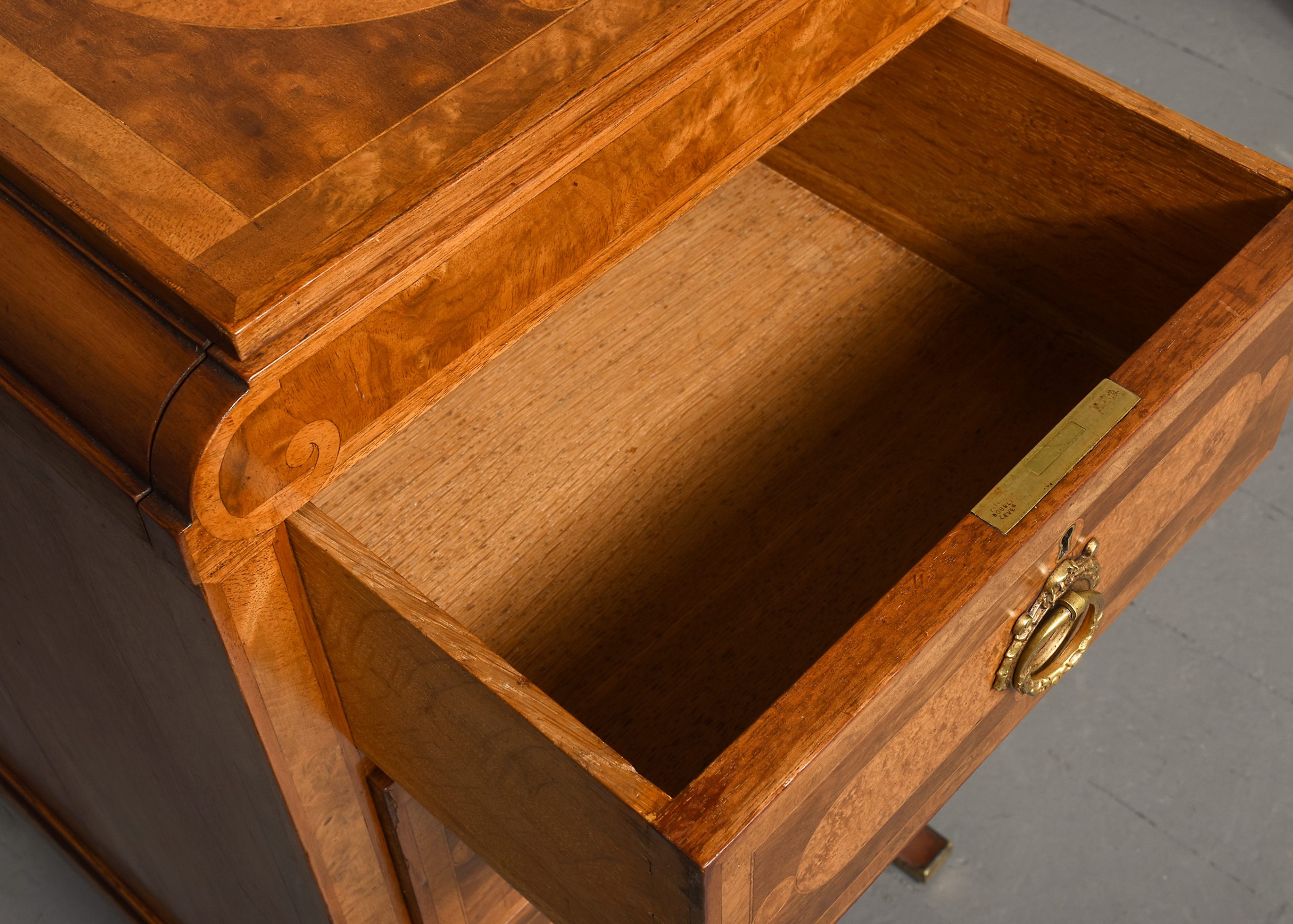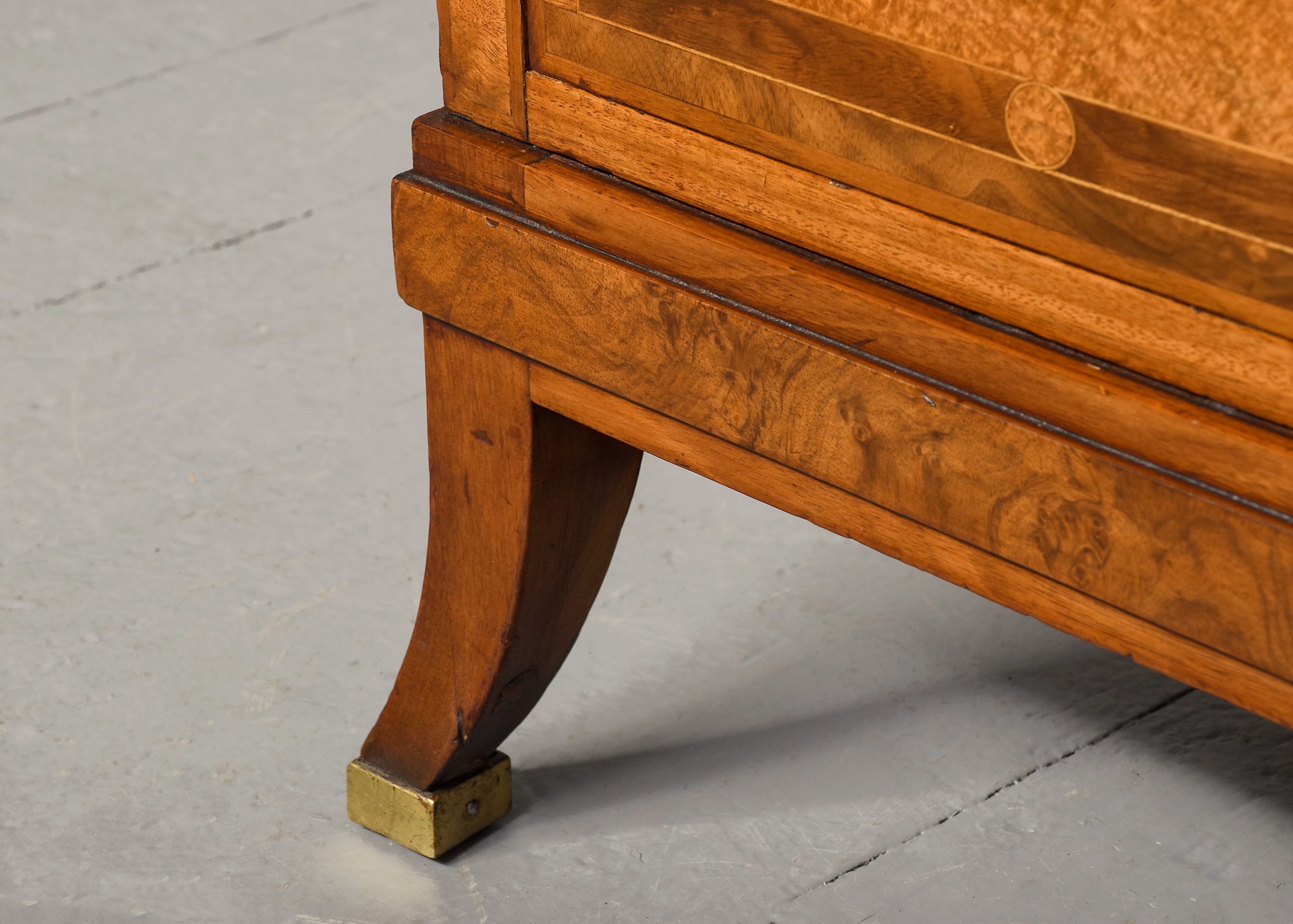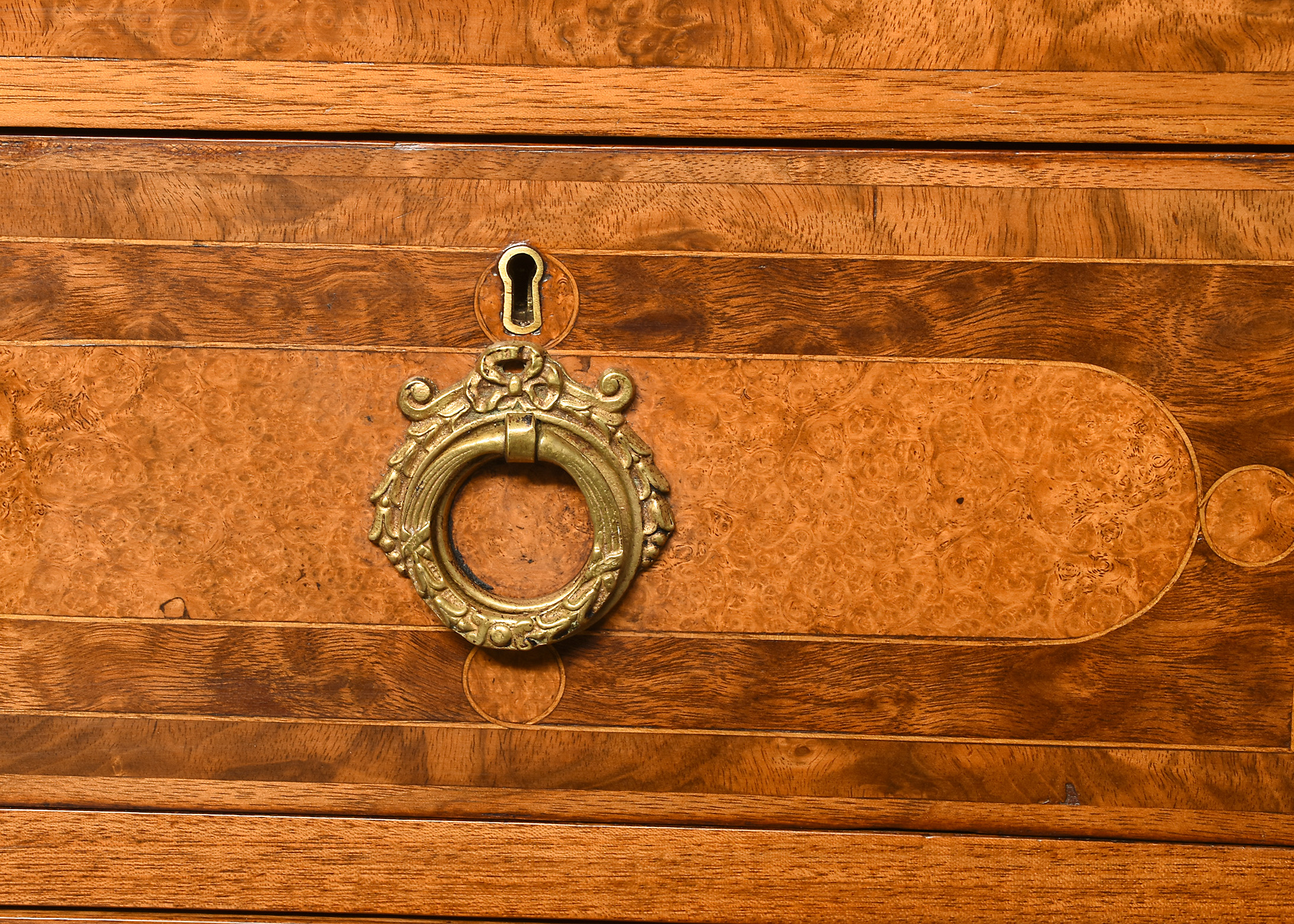 Circa 1880. Pair of late Victorian pedestals/bedside lockers in walnut, burr elm and harewood. The rectangular tops with inlaid panels of Burr Elm and Boxwood inlay, above hidden secret top drawers and three graduated drawers with matching burr Elm and boxwood inlay and elaborate brass handles. Flanked by Burr Walnut pilasters and all sitting on a rectangular base over shaped feet with brass toes. Unusual and quality items with solid oak drawer linings, brass locks, and solid oak backs.