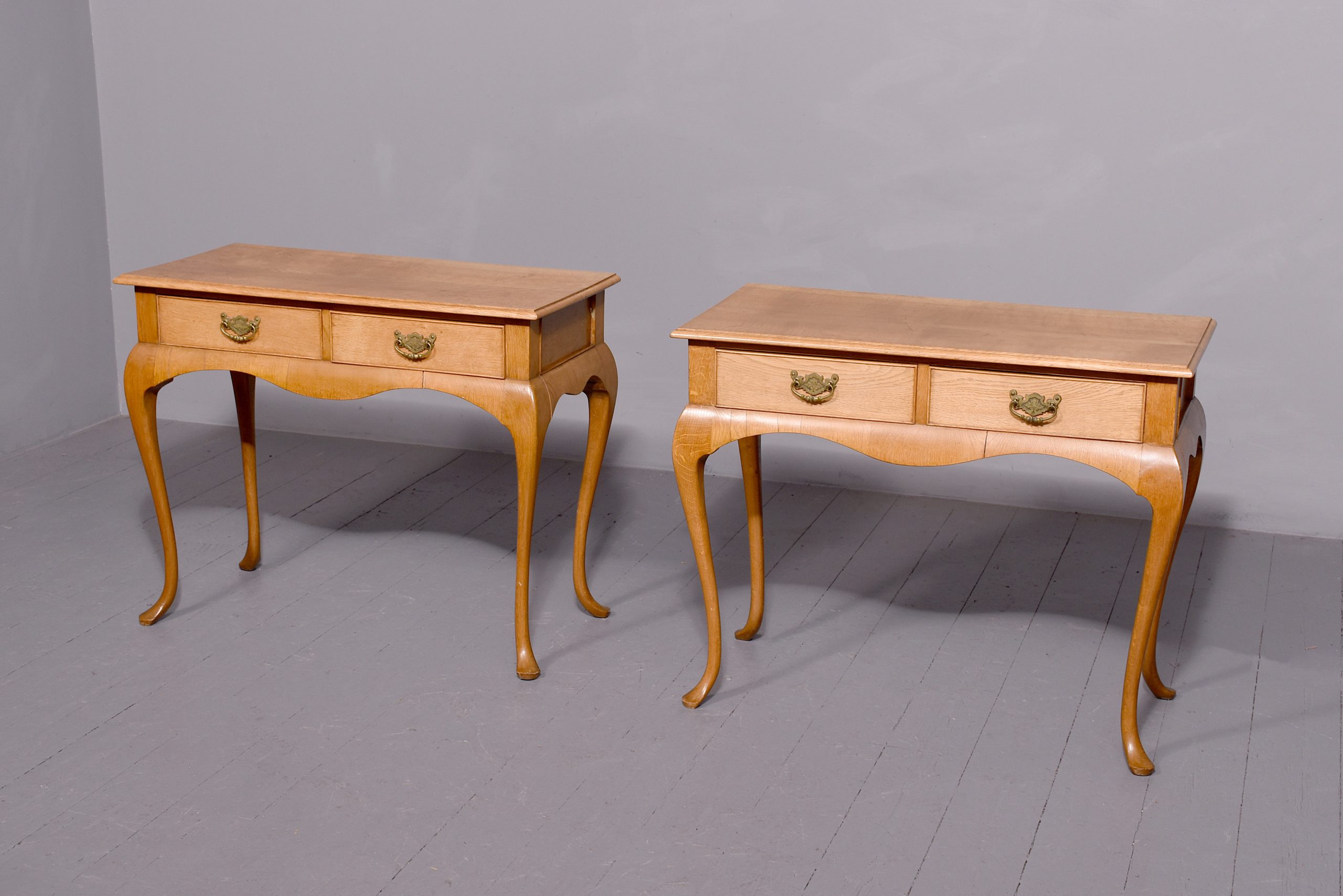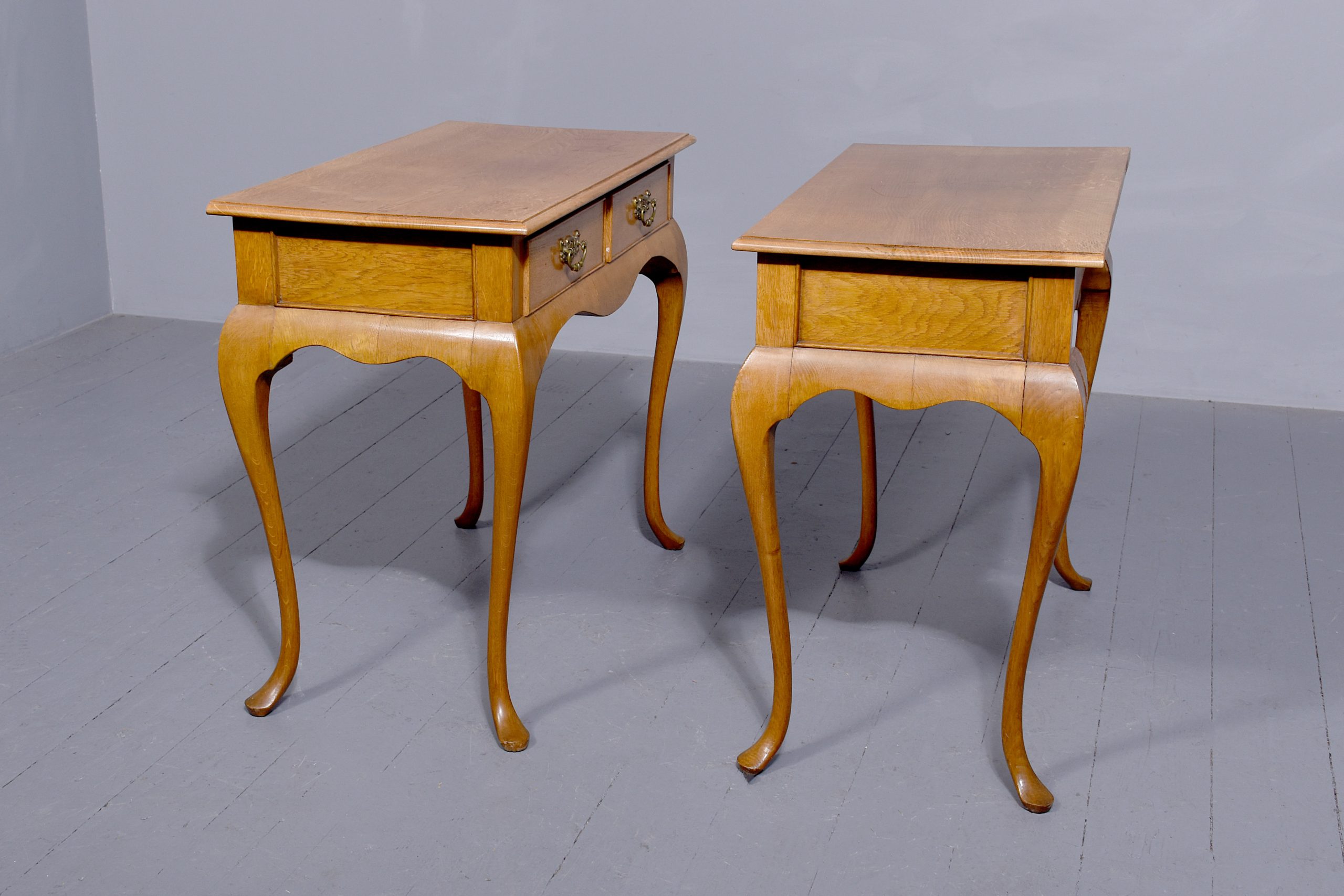 Circa 1920s. A stylish pair of Queen Anne style oak two drawer side tables, the solid tops in quarter sawn oak with an elegant moulded fore-edge, pair of drawers at the front with cock beadings and cast brass and pierced handles, the liners in solid oak, beneath the drawers is a shaped and curved frieze to the front and sides, all supported on four elegant cabriole legs finishing with a stylized pad foot, both with mellow colour.