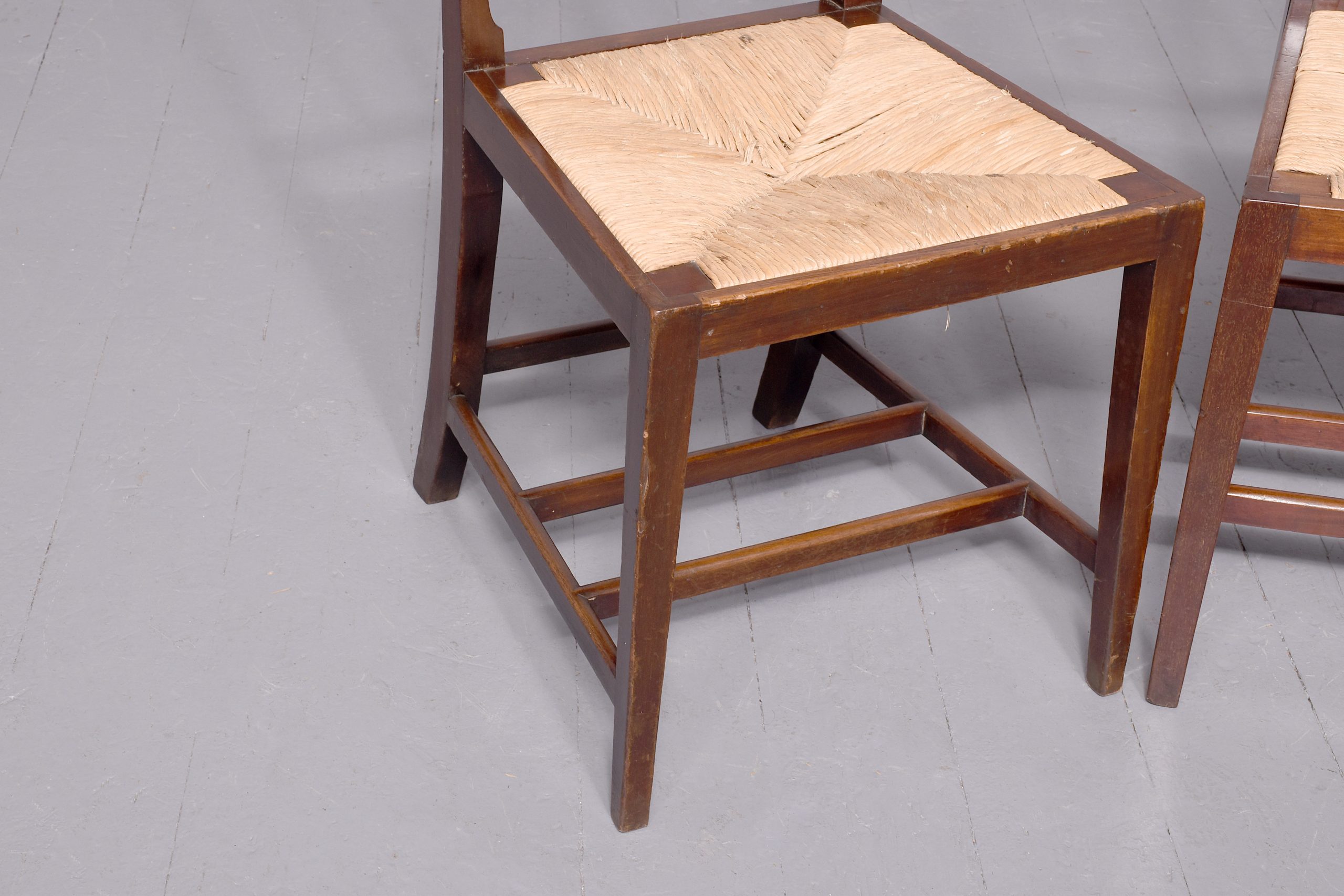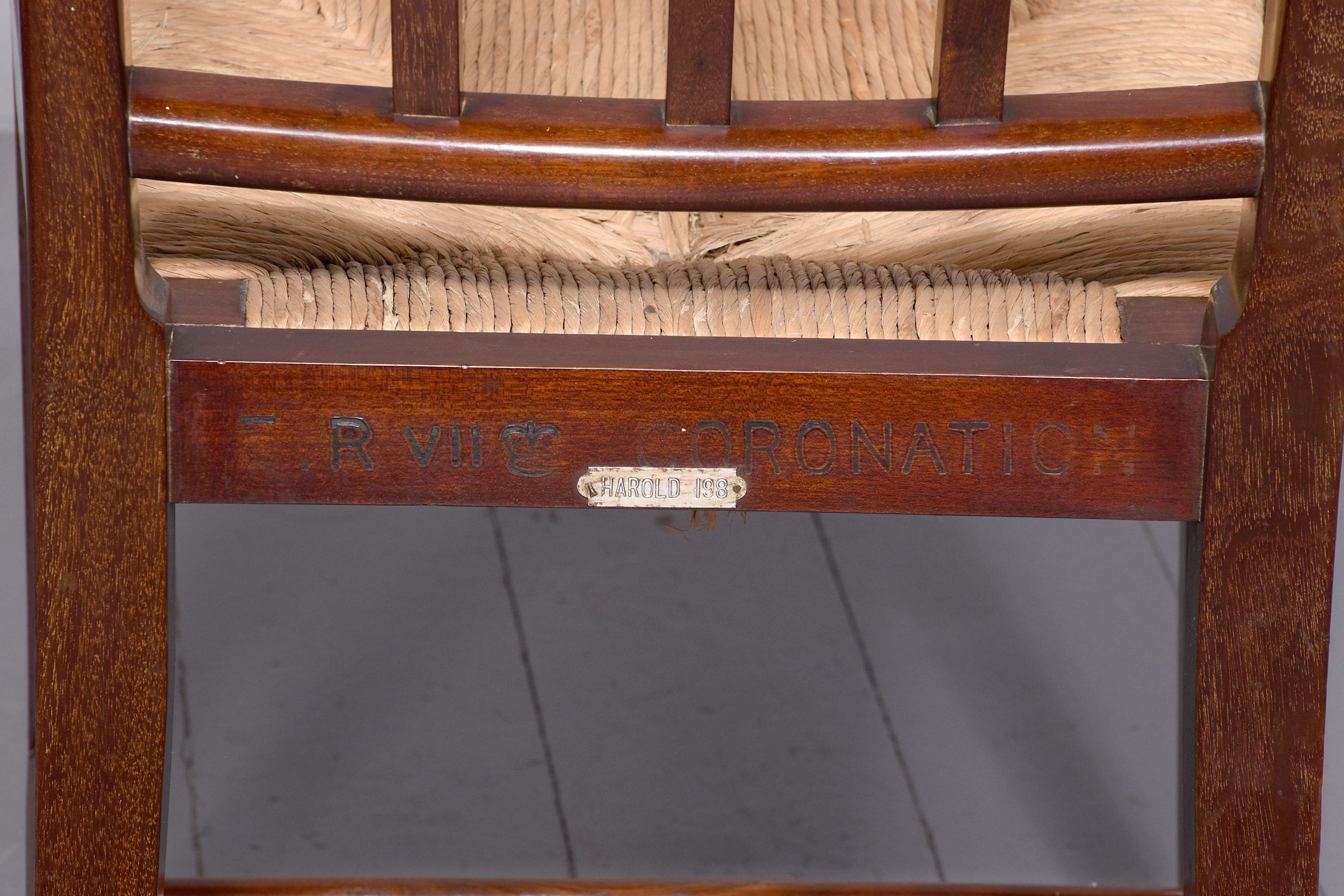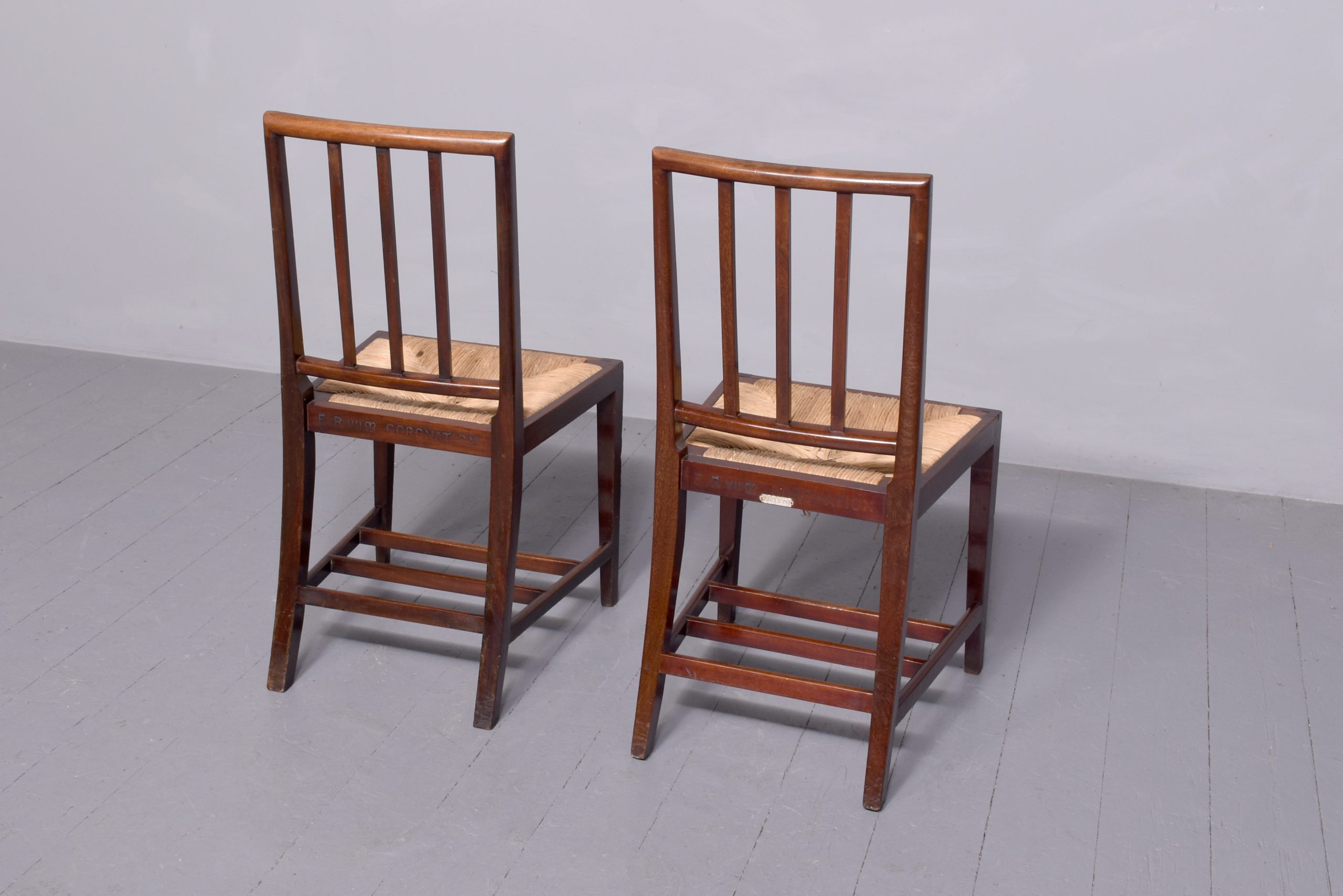 A pair of mahogany chairs from King Edward VII coronation, which was held in August 1902, the pair with simple top rail, spar back and drop in marram grass seat with simple seat rails, resting on four square legs, back legs slightly splayed, the legs braced by conforming stretchers, the back of each chair has a stamp on it ‘ERV11, a crown and coronation’ with one chair with another plaque; ‘Harold 198’ In excellent condition, sturdy with good colour and style.