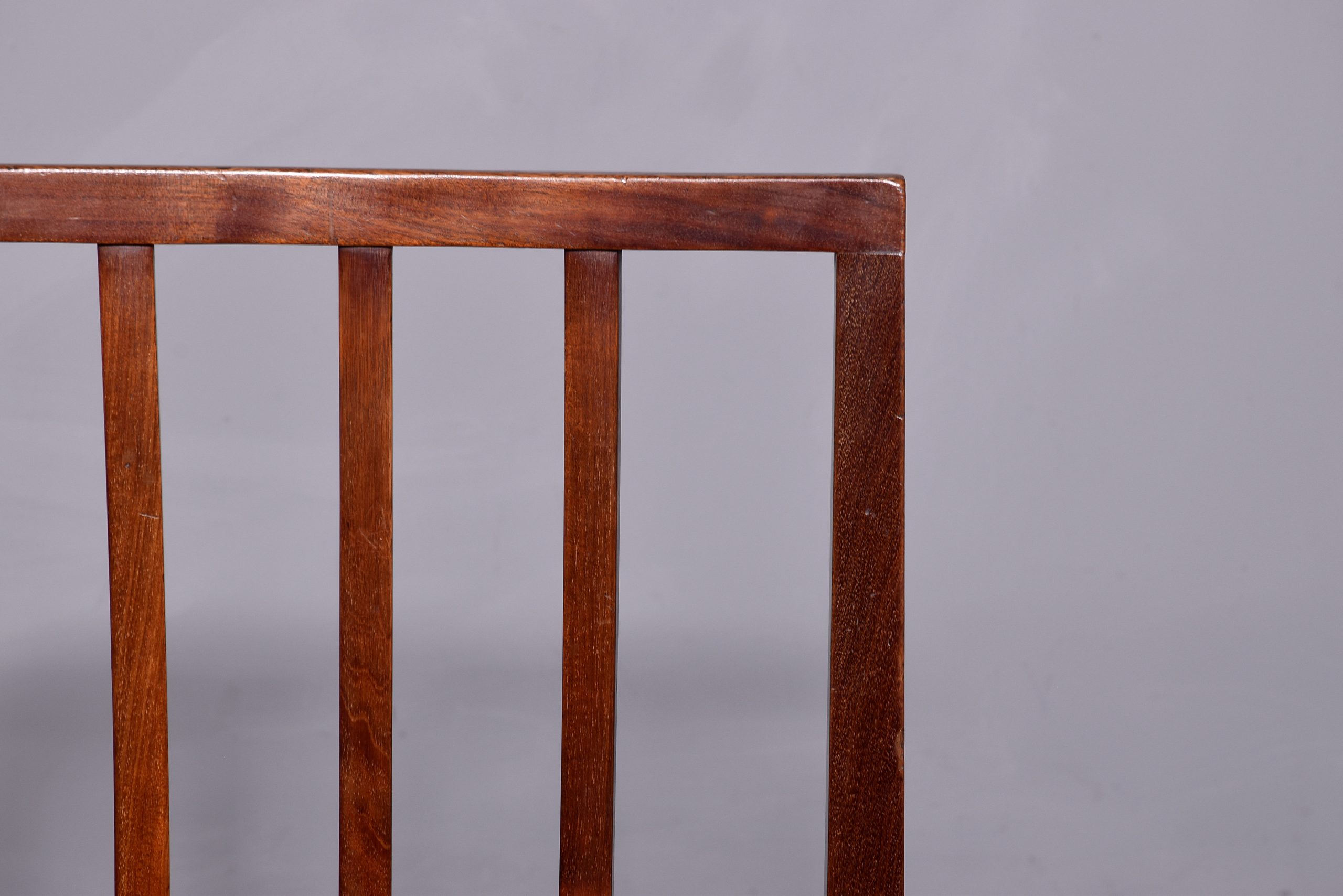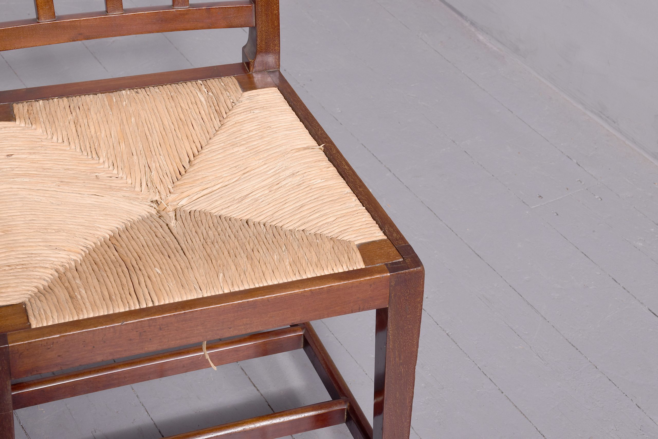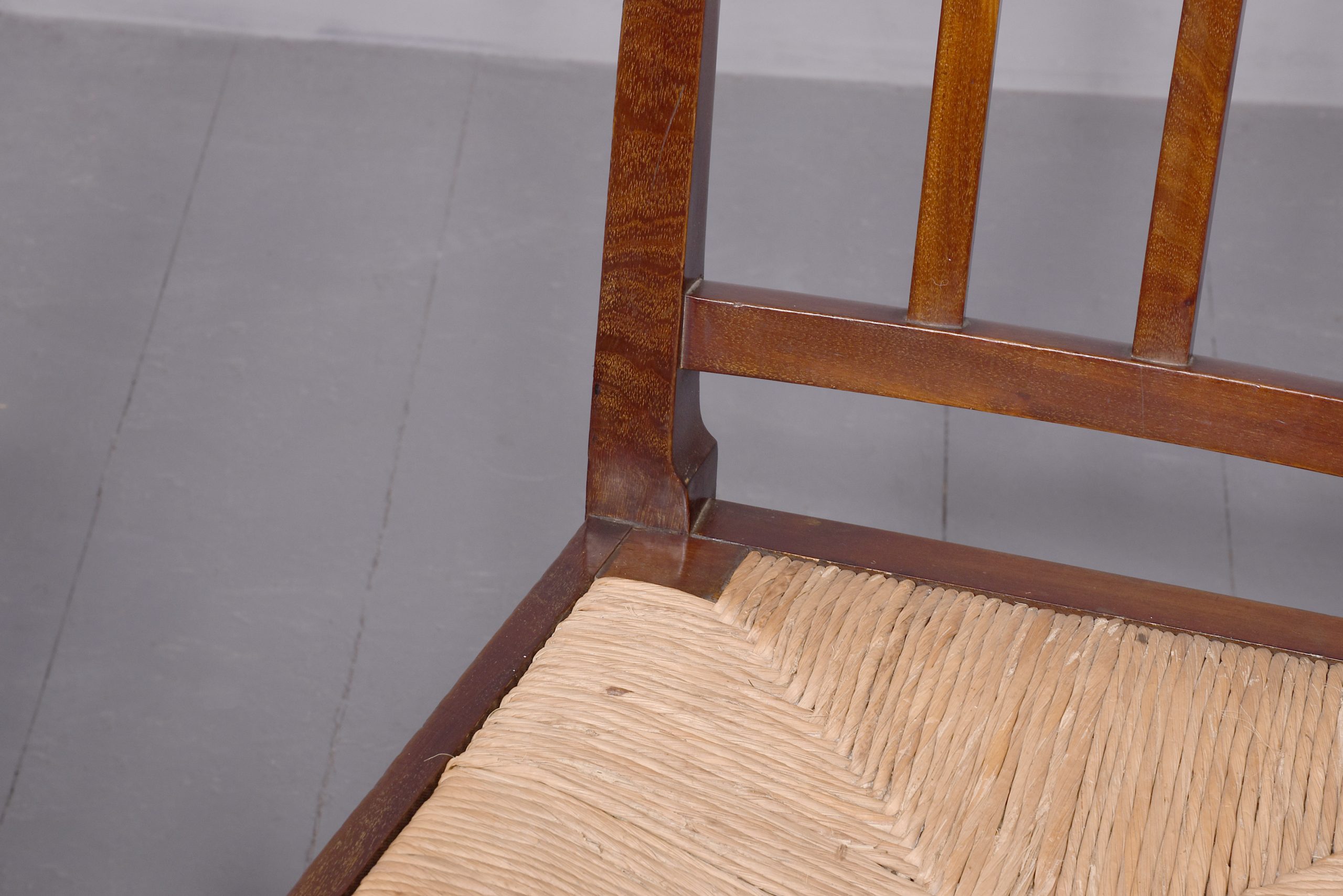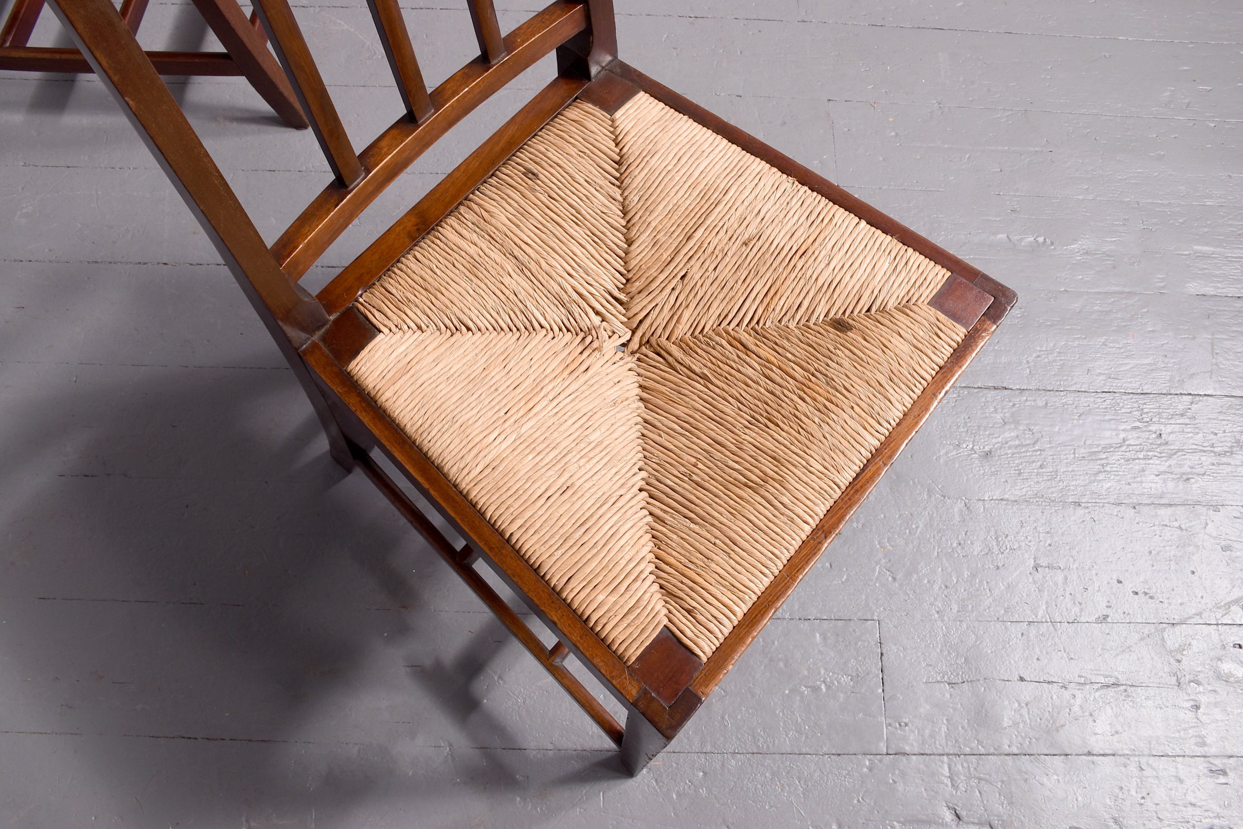 A pair of mahogany chairs from King Edward VII coronation, which was held in August 1902, the pair with simple top rail, spar back and drop in marram grass seat with simple seat rails, resting on four square legs, back legs slightly splayed, the legs braced by conforming stretchers, the back of each chair has a stamp on it ‘ERV11, a crown and coronation’ with one chair with another plaque; ‘Harold 198’ In excellent condition, sturdy with good colour and style.
