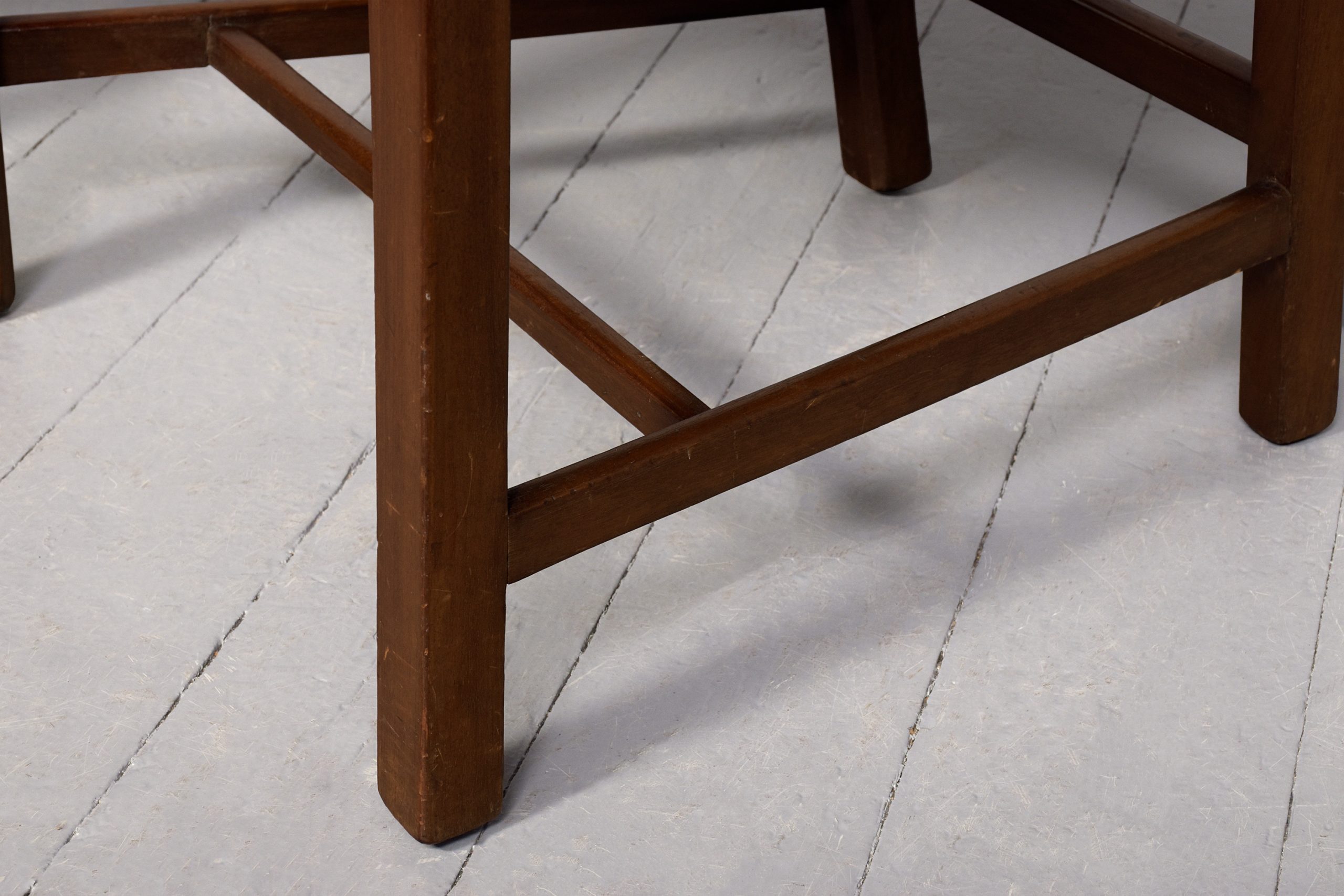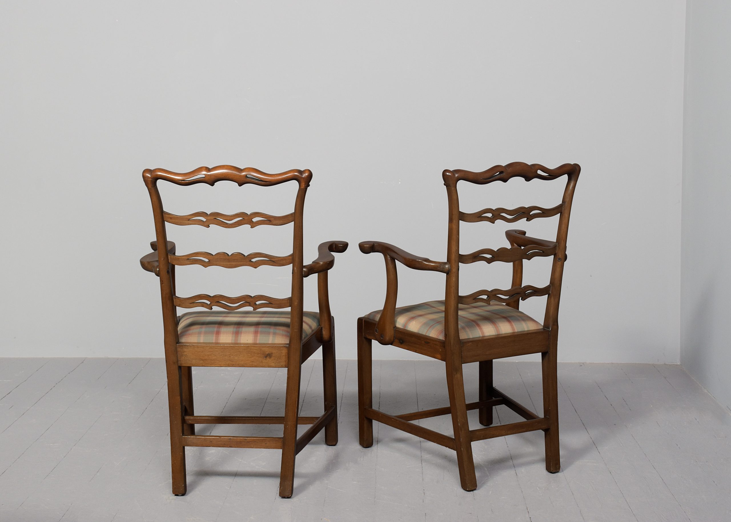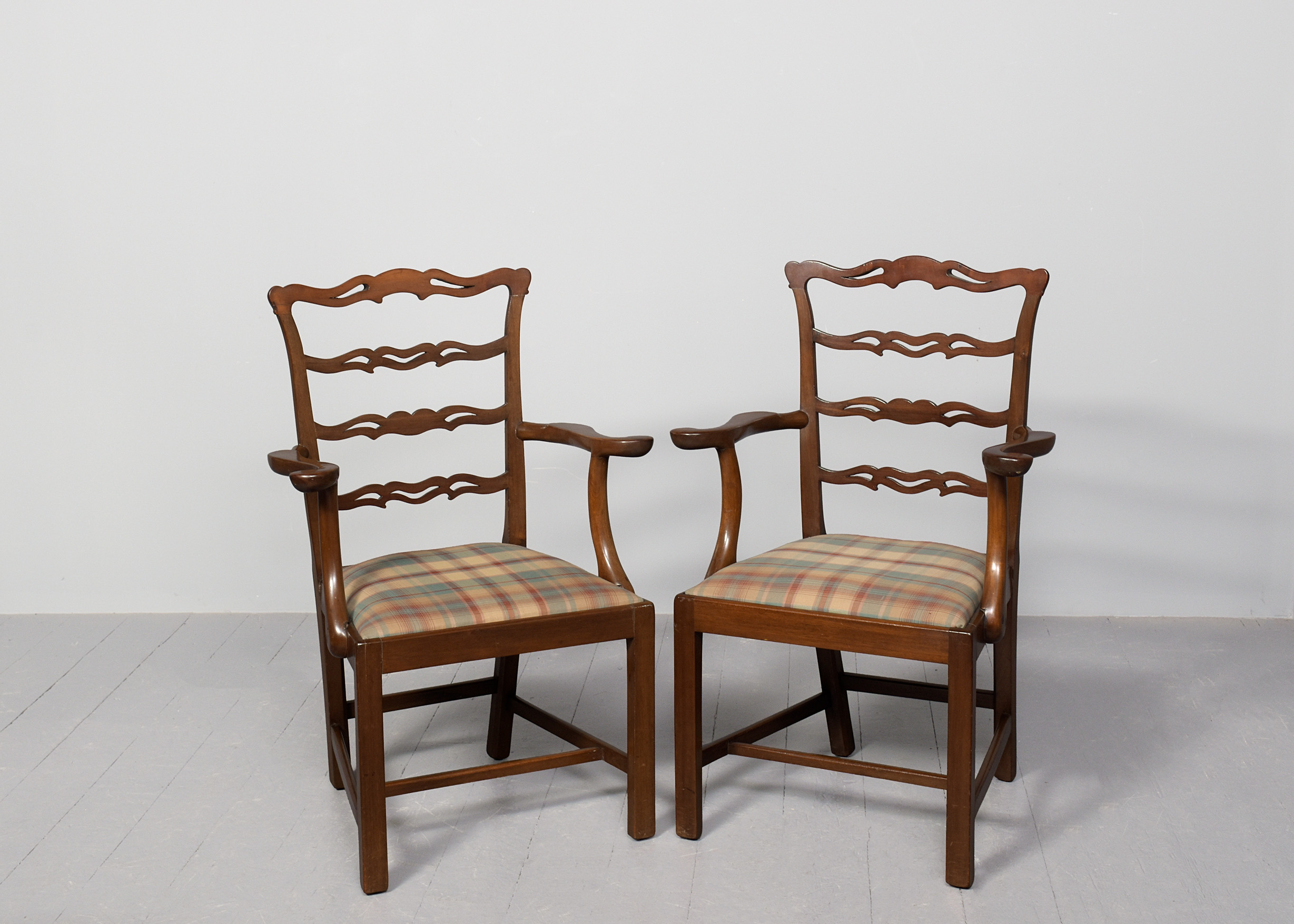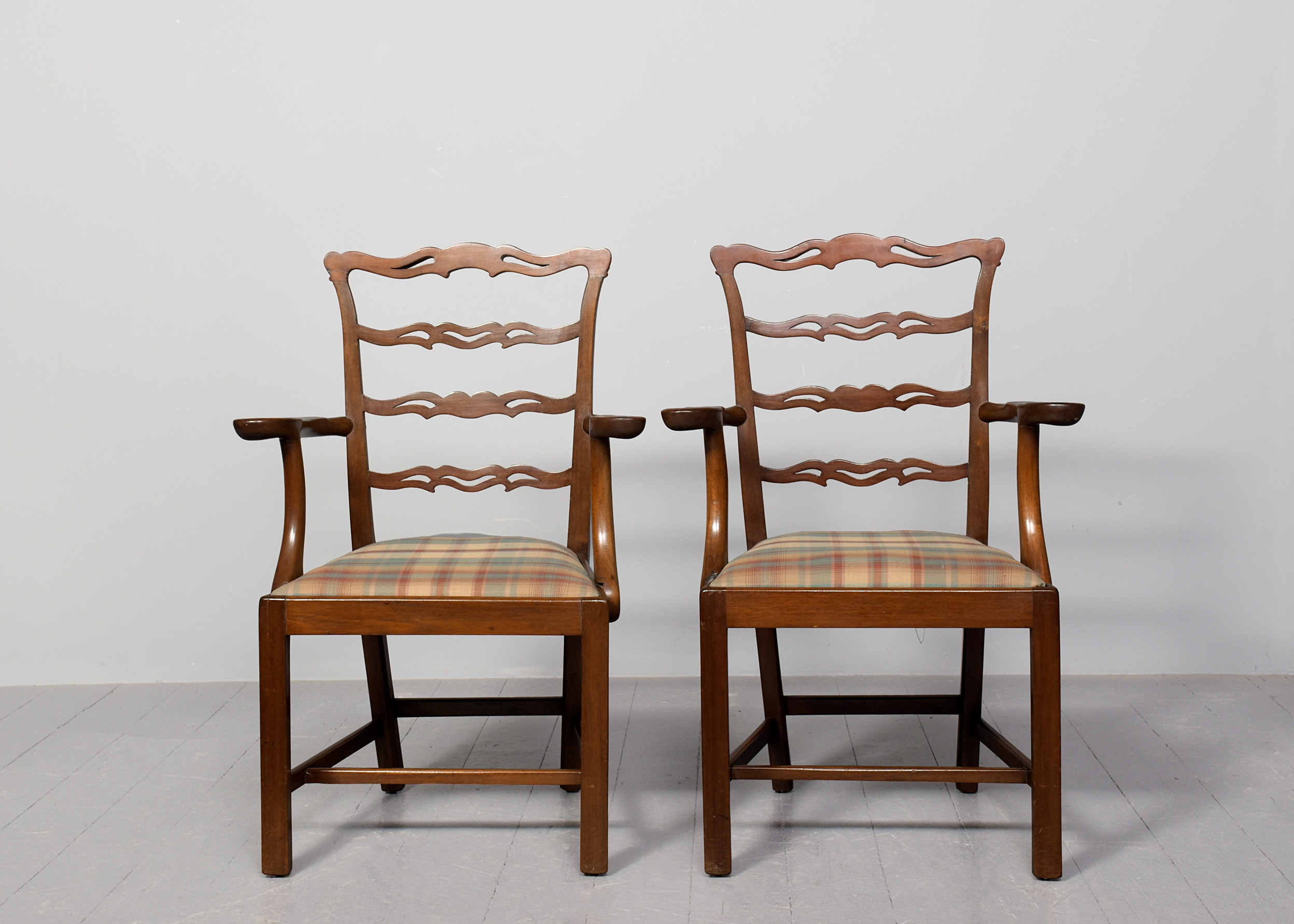 Circa 1920s. A pair of George III style mahogany ladder-back chairs, the shaped and pierced cresting rail with three pierced rails beneath, the curvaceous arms supported on shaped uprights, the drop in upholstered seat with simple seat rail, back legs are square and slightly out swept, the front legs are square with a small chamfer on the inside, all braced by conforming stretchers.