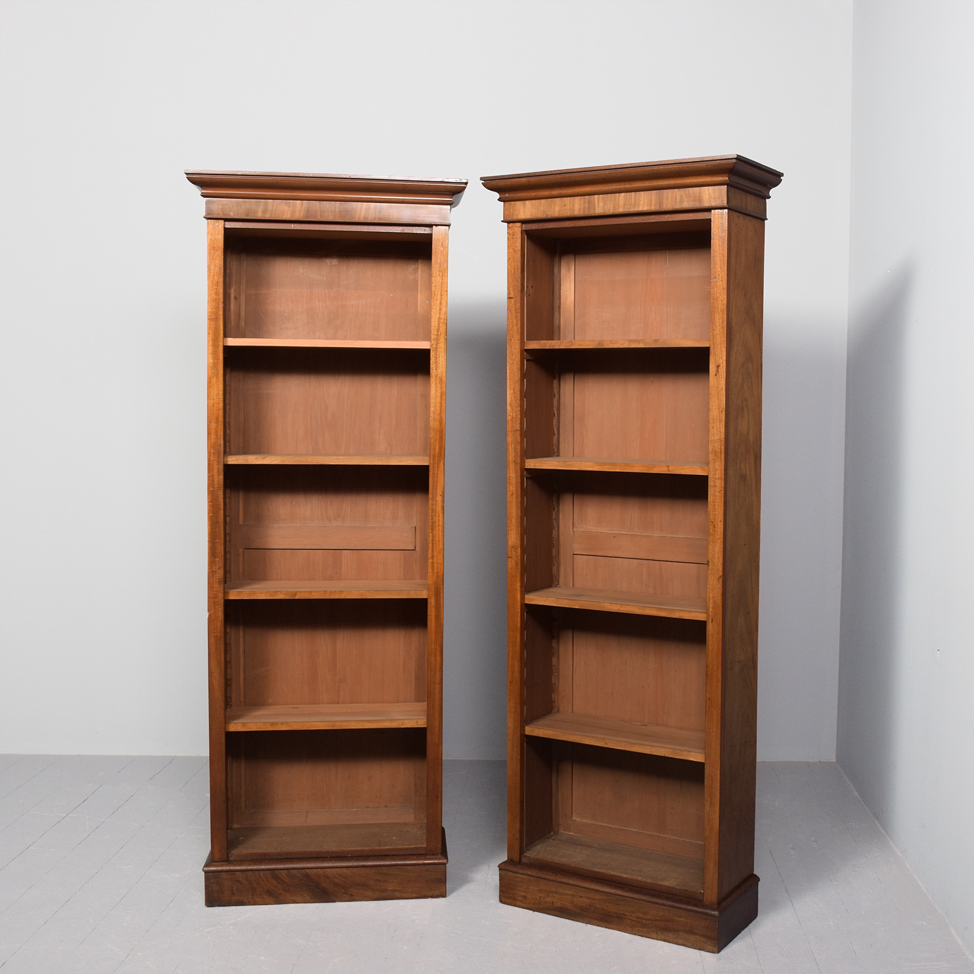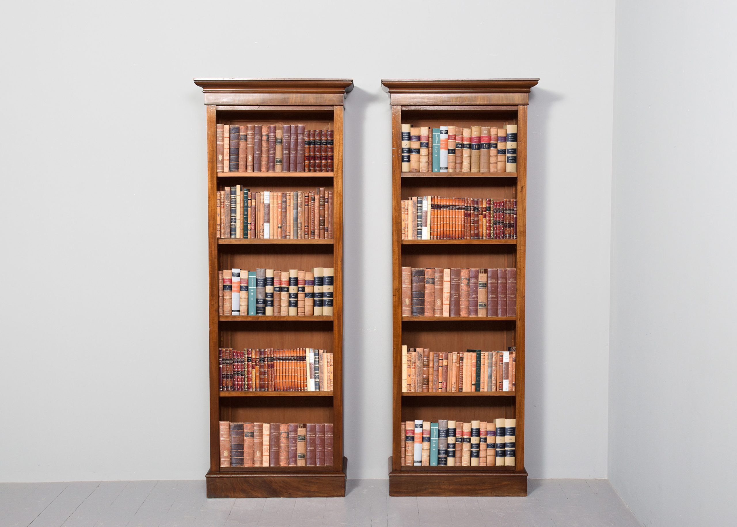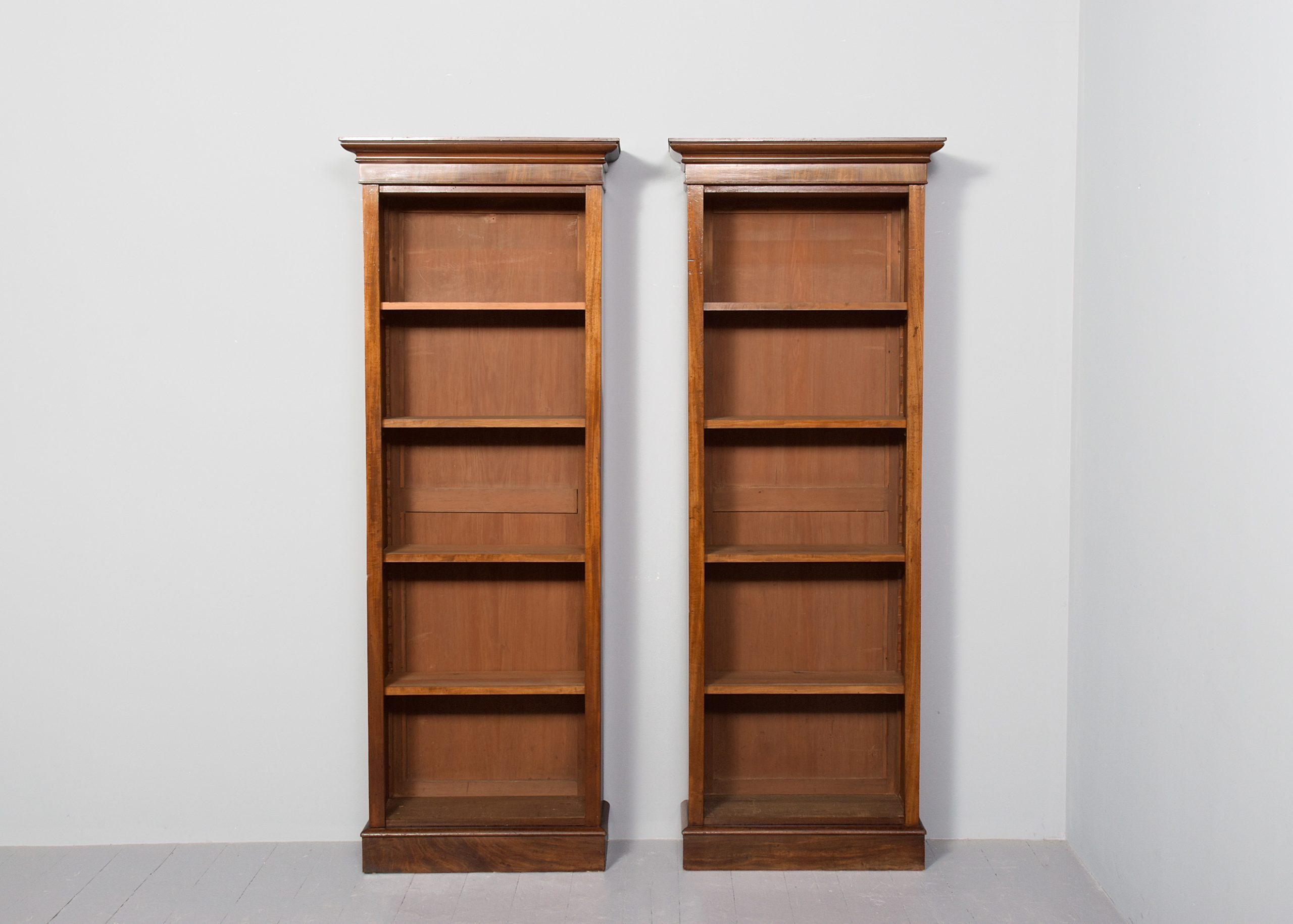 Circa 1870 (with alterations). Pair of Mid-Victorian tall mahogany open bookcases. Surmounted by classical moulded cornices and figured mahogany friezes, the open bookcases each with four adjustable shelves, flanked by simple mahogany pilasters and sitting on enclosed plinth bases. Nice mellow colour and in excellent condition. Attractive, simple design and functional – would suit a contemporary or traditional setting.