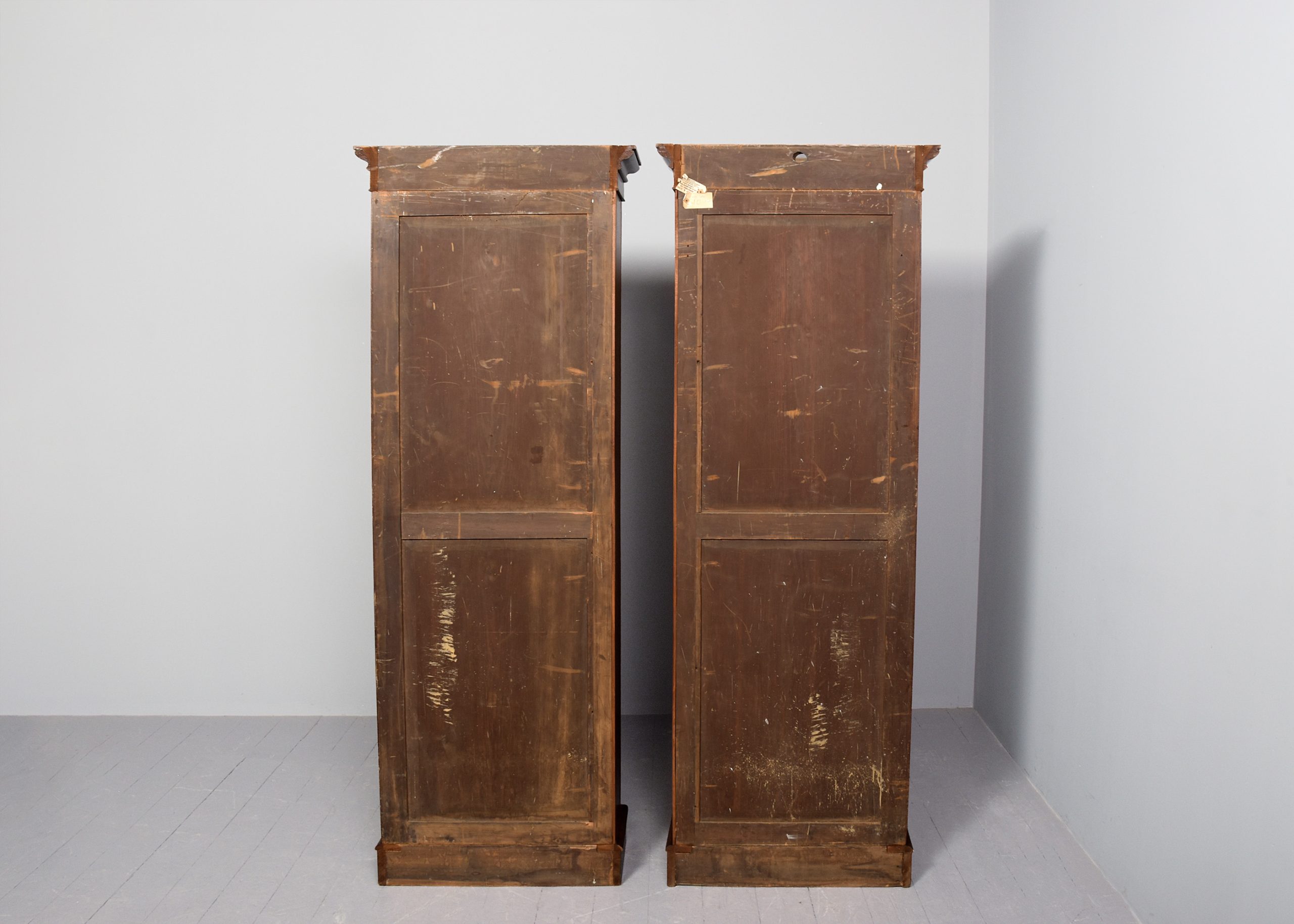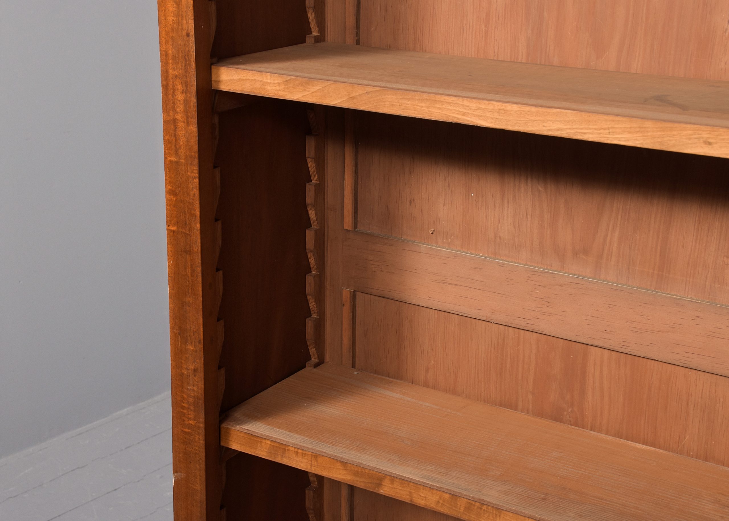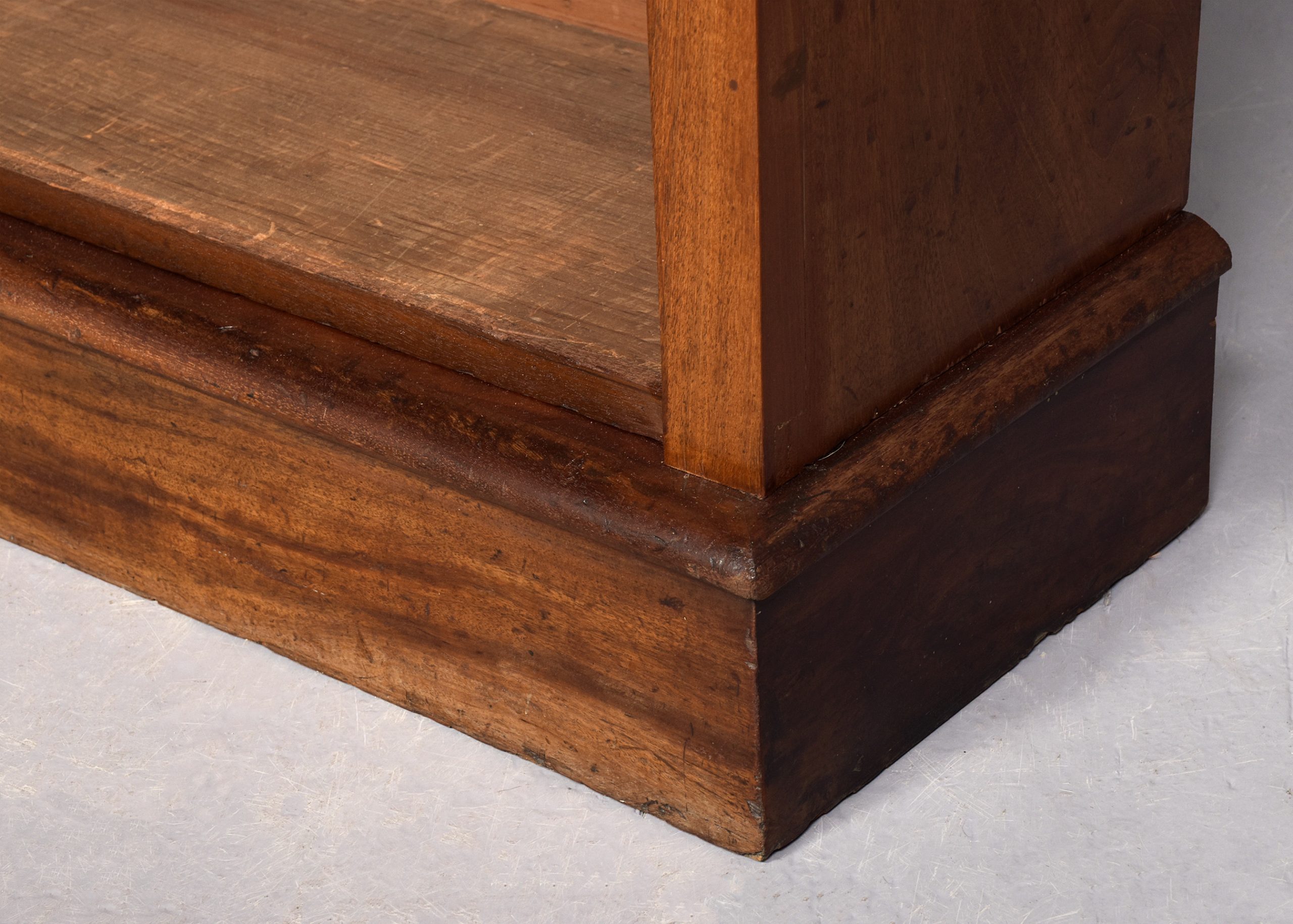 Circa 1870 (with alterations). Pair of Mid-Victorian tall mahogany open bookcases. Surmounted by classical moulded cornices and figured mahogany friezes, the open bookcases each with four adjustable shelves, flanked by simple mahogany pilasters and sitting on enclosed plinth bases. Nice mellow colour and in excellent condition. Attractive, simple design and functional – would suit a contemporary or traditional setting.
