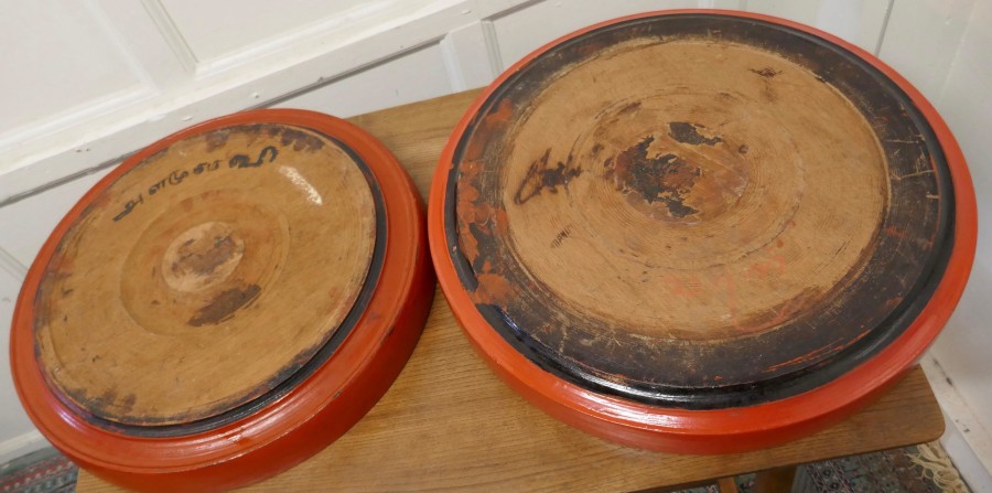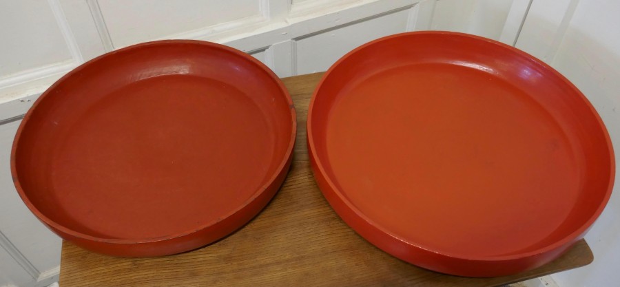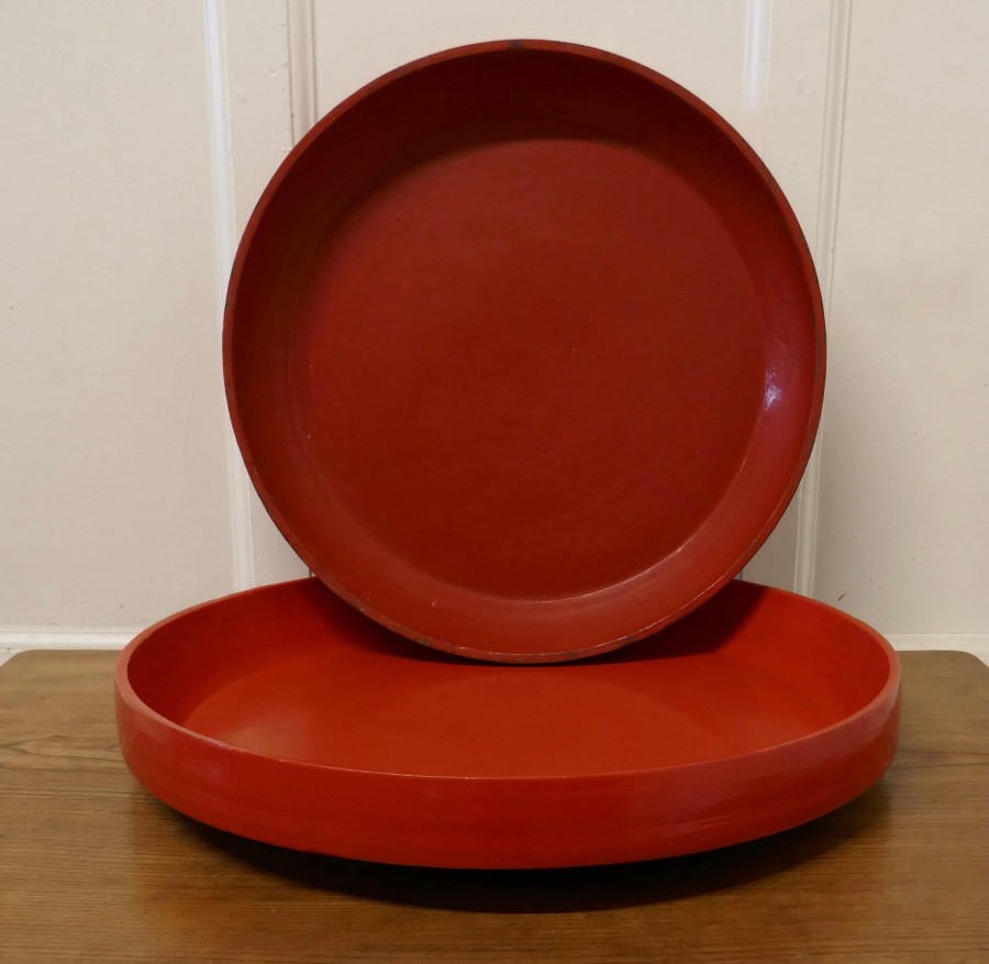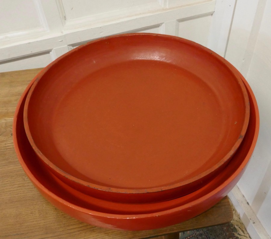 A Pair of North African Folk Art Hand Made Red Ochre Dishes 2 Lovely Large Dishes, brightly painted in Red Ochre, the dishes are each hand turned from one piece of wood The painted finish is hard and very durable The largest dish is 21” in diameter and 3” high NV81. Manufacture Date : 1950 Materials : Softwood