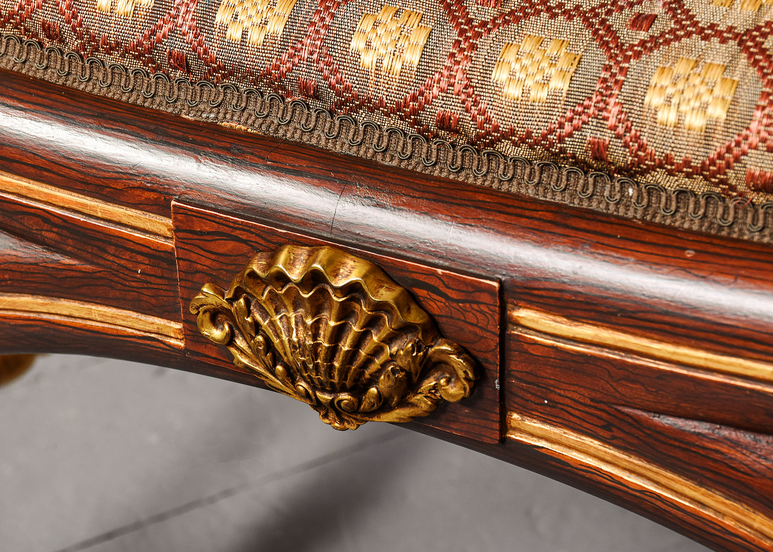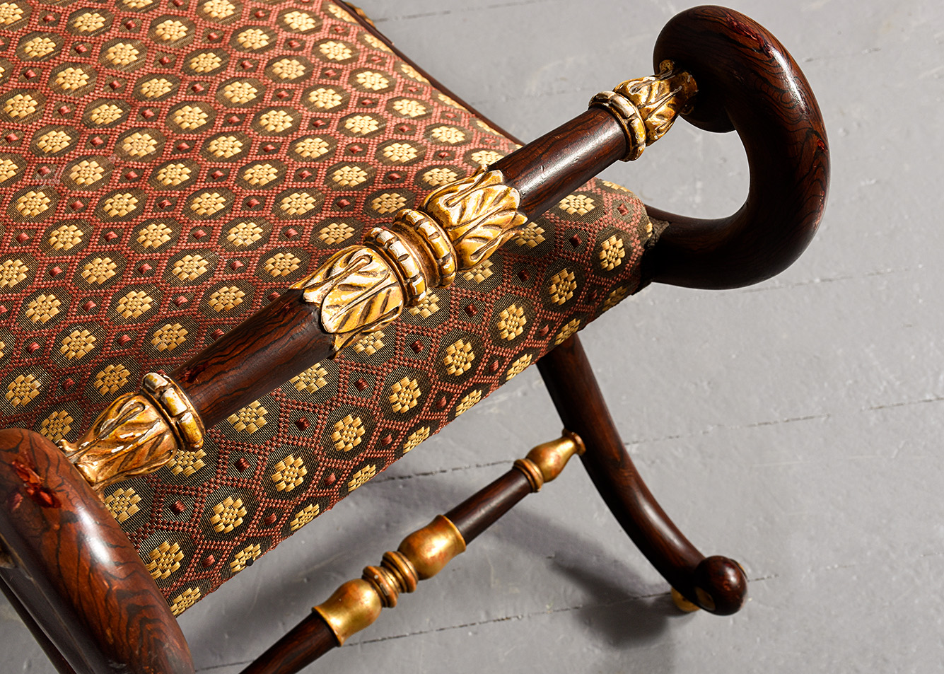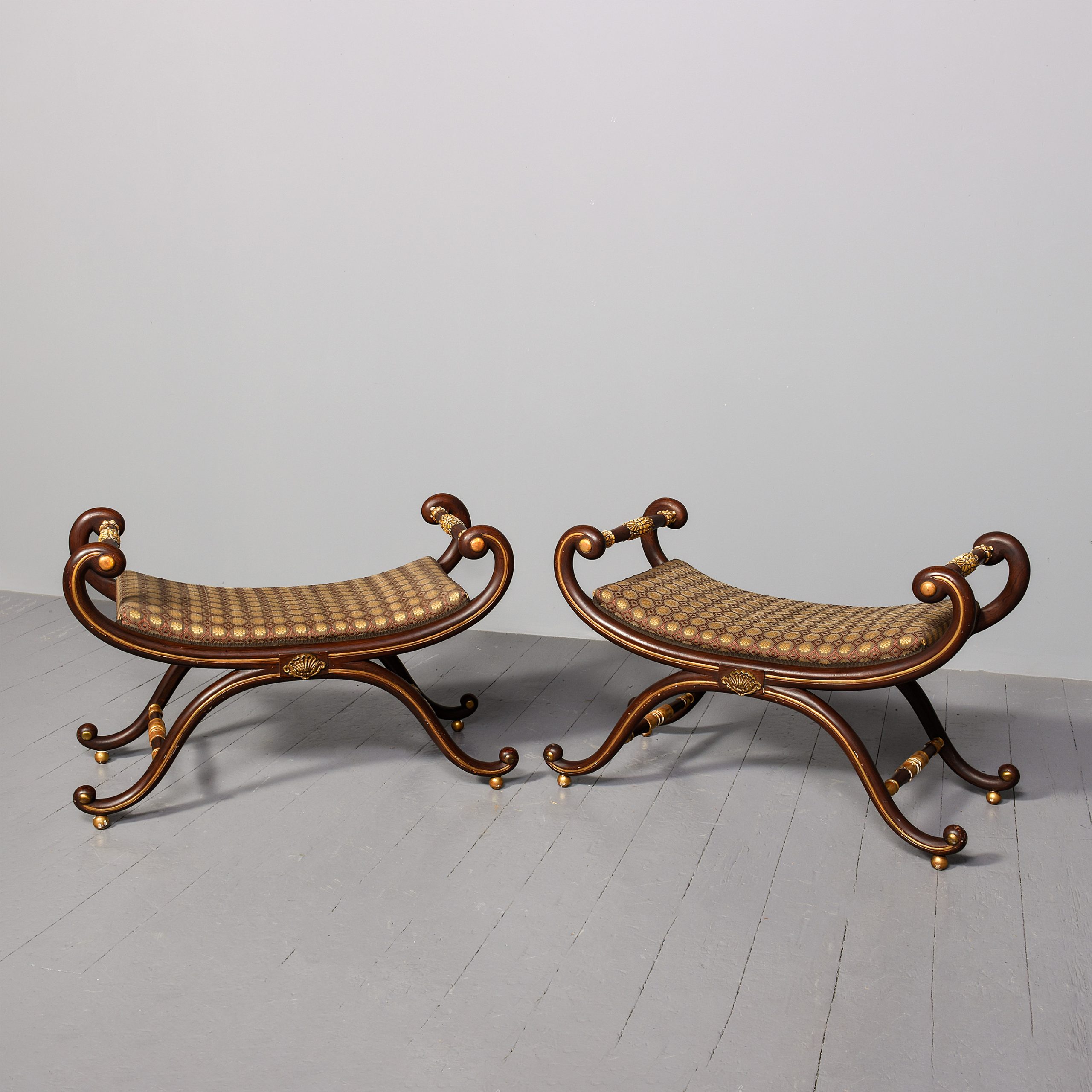 Circa 1970s. A quality pair of Regency style scumbled and gilded X framed window seats, the curved seats upholstered in patterned horse hair, supported on curved rails scumbled and gilded, the curvaceous top rail supporting two lifting handles centered with gilded acanthus leaves, the crossover section is headed by a gilded scallop shell with foliate carving, the sweeping legs are braced by gilded stretchers, finishing on a curled foot with gilded balls beneath. Both stools are in excellent condition, clean and stylish.