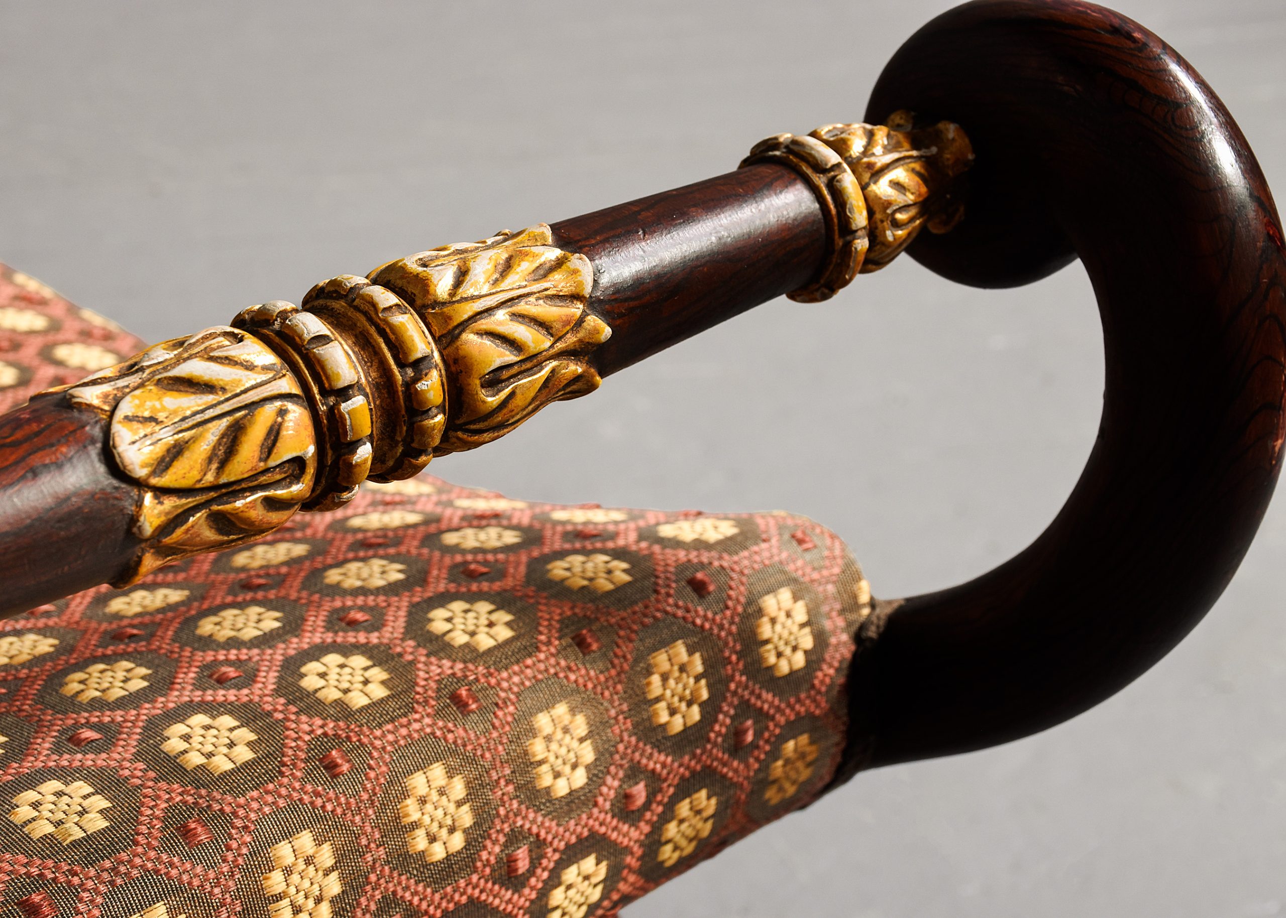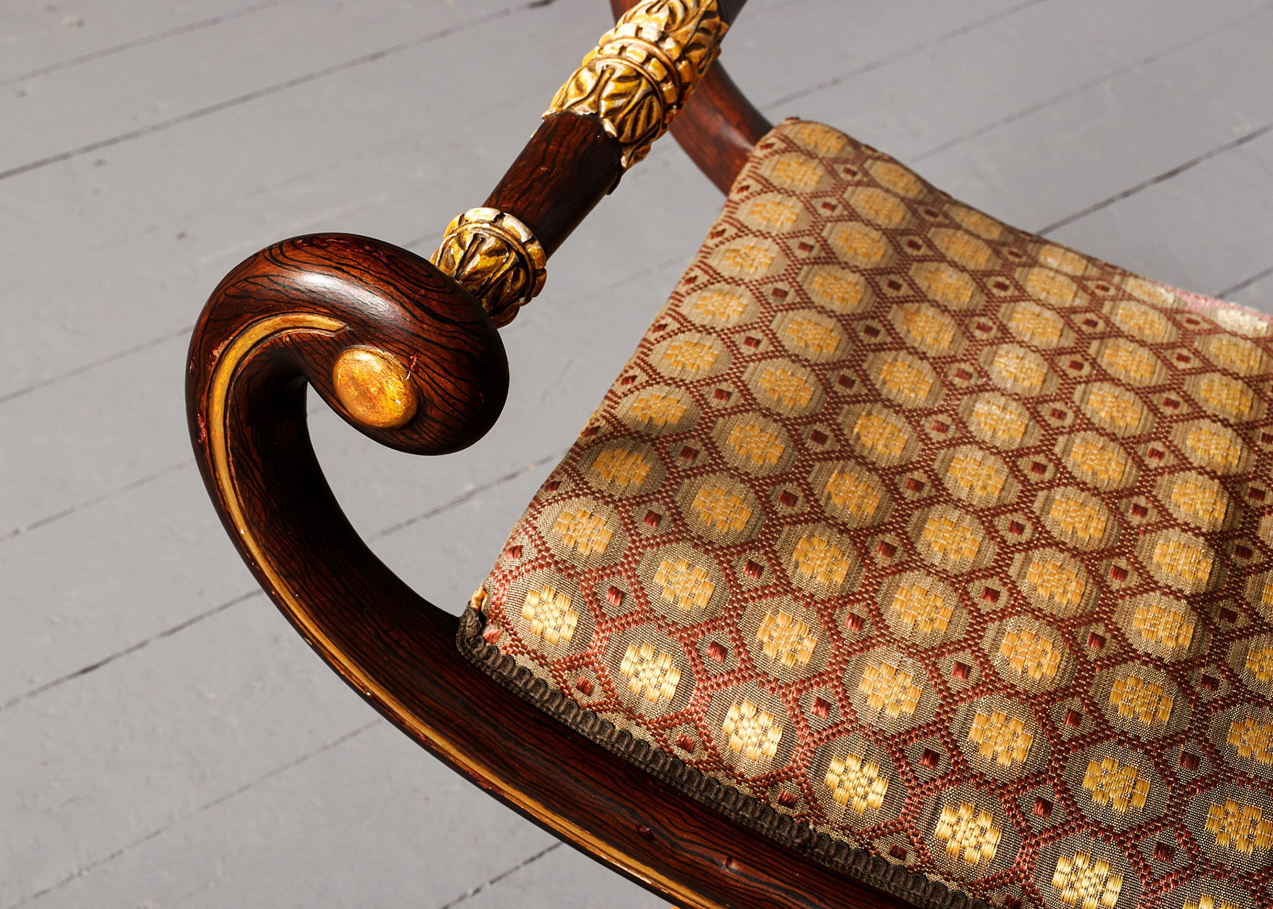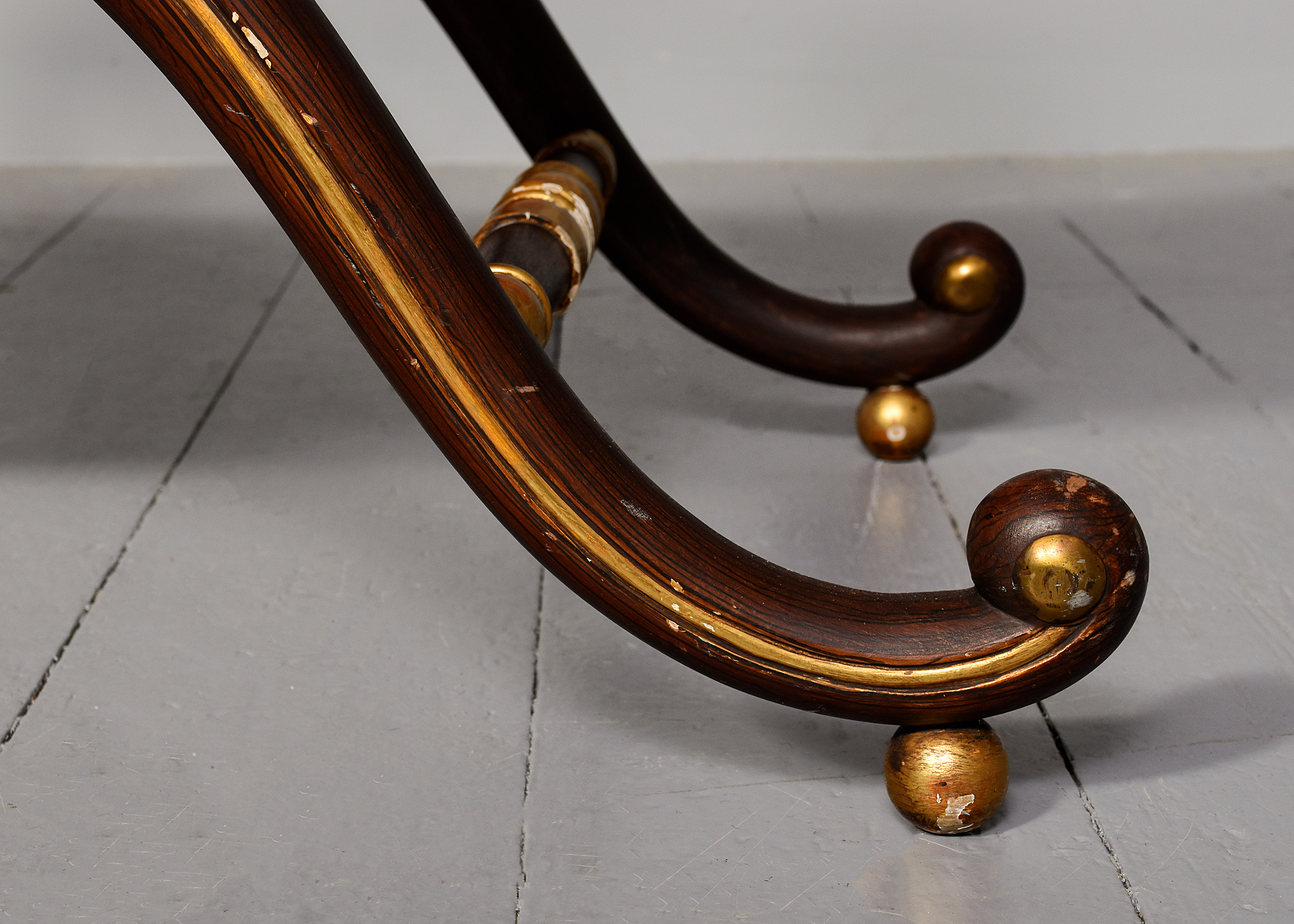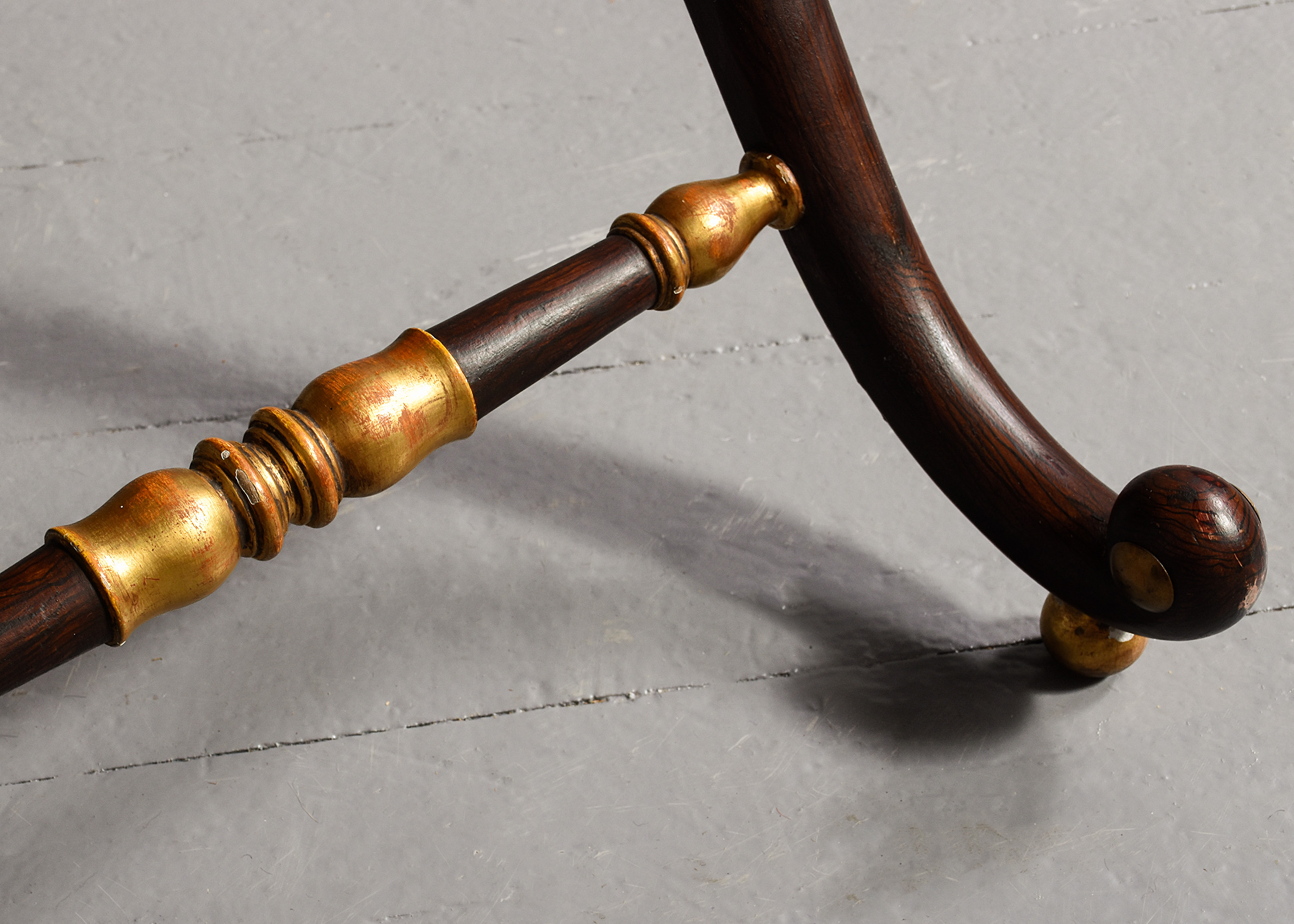 Circa 1970s. A quality pair of Regency style scumbled and gilded X framed window seats, the curved seats upholstered in patterned horse hair, supported on curved rails scumbled and gilded, the curvaceous top rail supporting two lifting handles centered with gilded acanthus leaves, the crossover section is headed by a gilded scallop shell with foliate carving, the sweeping legs are braced by gilded stretchers, finishing on a curled foot with gilded balls beneath. Both stools are in excellent condition, clean and stylish.