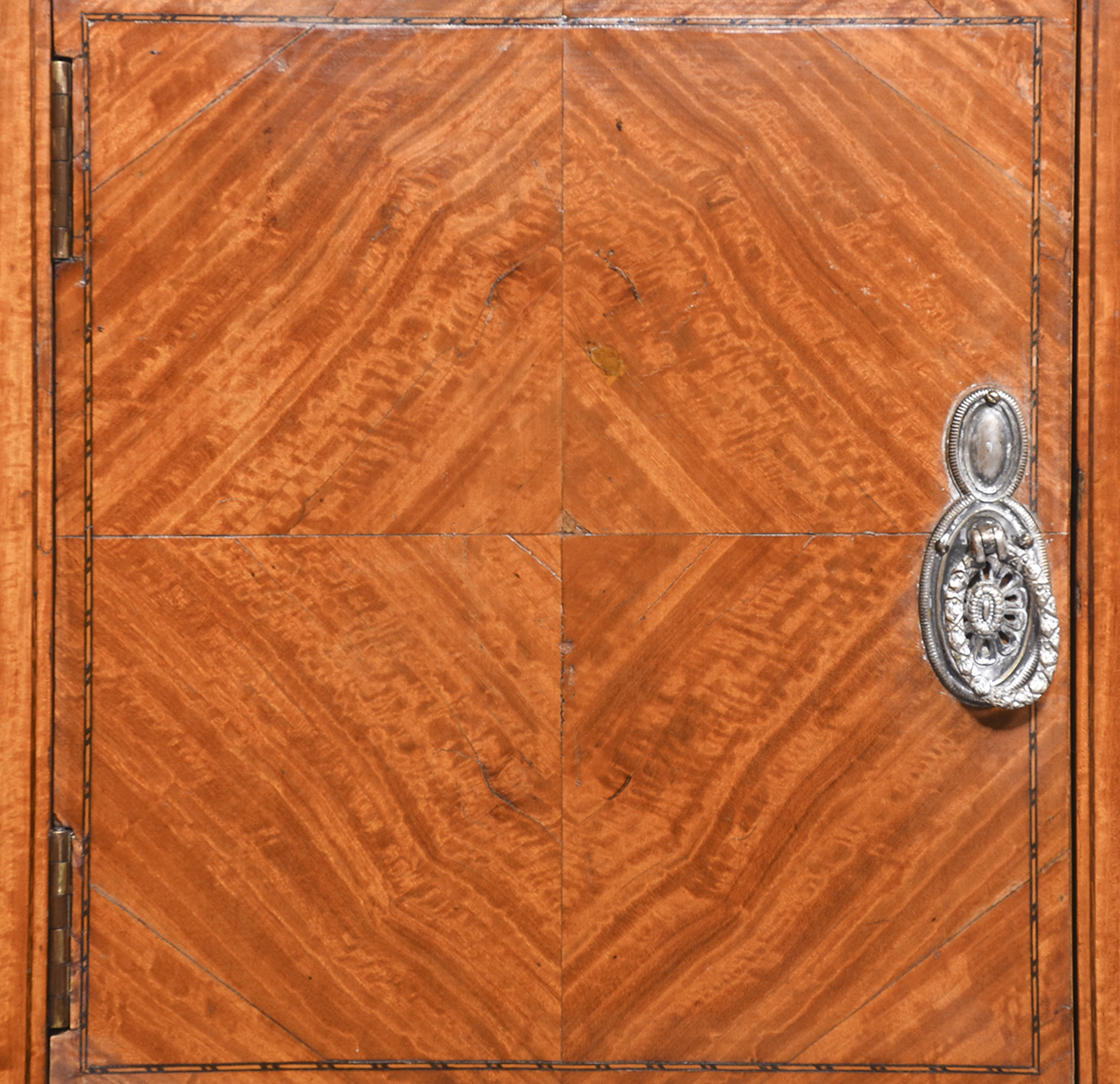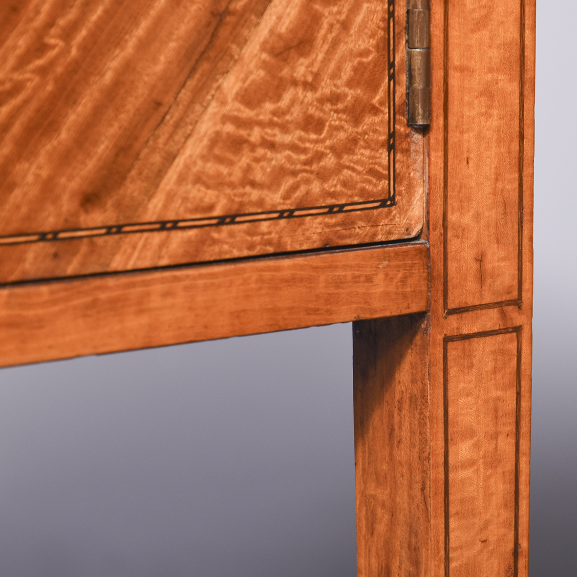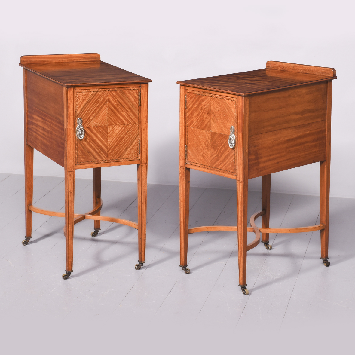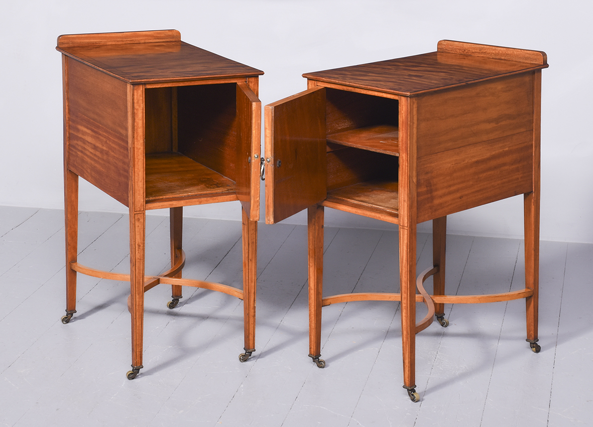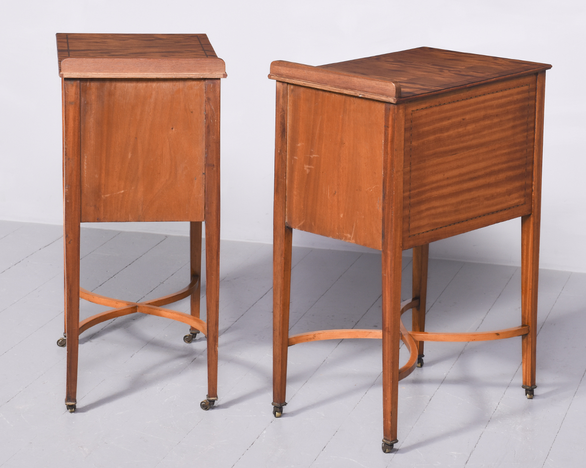 Circa 1890 An unusual stylish pair of satinwood and inlaid bedside cabinets, the tops with lovely rippled and silky satinwood with checkered inlay and a small upright, with 1 full length door with quarter matching veneer, similar banding with an elegant silvered handle, inside with uninterrupted space, the bedsides rest on 4 square tapering in laid legs braced by overlapping elegant wavy stretchers finishing with a brass bezel with original brass castors beneath.