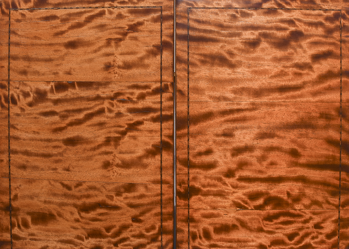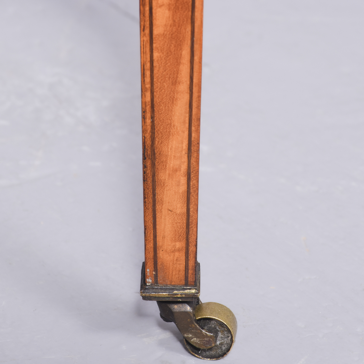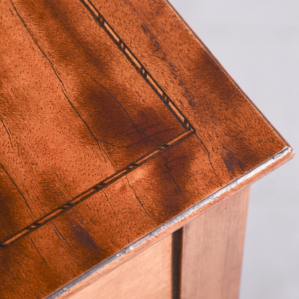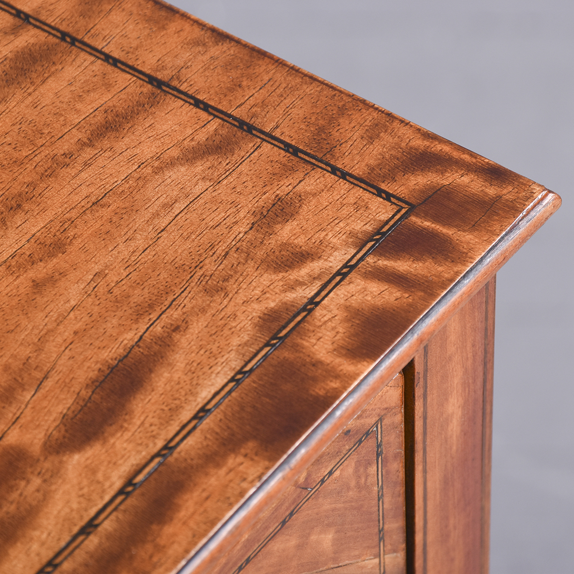 Circa 1890 An unusual stylish pair of satinwood and inlaid bedside cabinets, the tops with lovely rippled and silky satinwood with checkered inlay and a small upright, with 1 full length door with quarter matching veneer, similar banding with an elegant silvered handle, inside with uninterrupted space, the bedsides rest on 4 square tapering in laid legs braced by overlapping elegant wavy stretchers finishing with a brass bezel with original brass castors beneath.