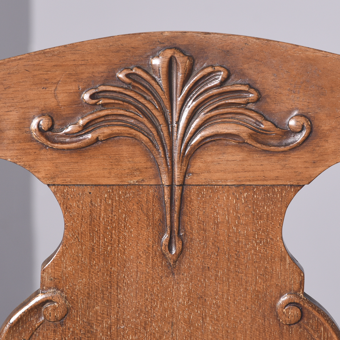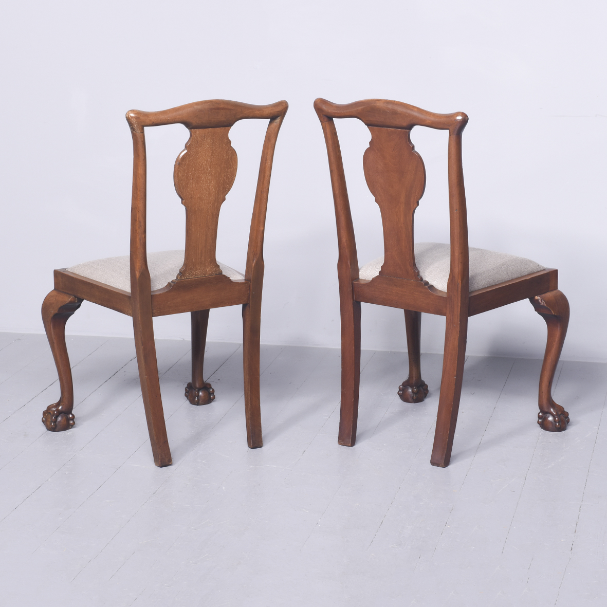 Circa 1920’s. A pair of mahogany and satinwood side chairs by ‘Whytock & Reid of Edinburgh’, with shaped cresting rail with a simple splat in book matched satinwood, the drop in upholstered seat held in place by a simple seat rail with rounded top and shaped frieze at the front, the back legs are slightly out swept, the front with elegant cabriole legs with carving on the knees, finishing on a well carved toe resting on a faceted foot