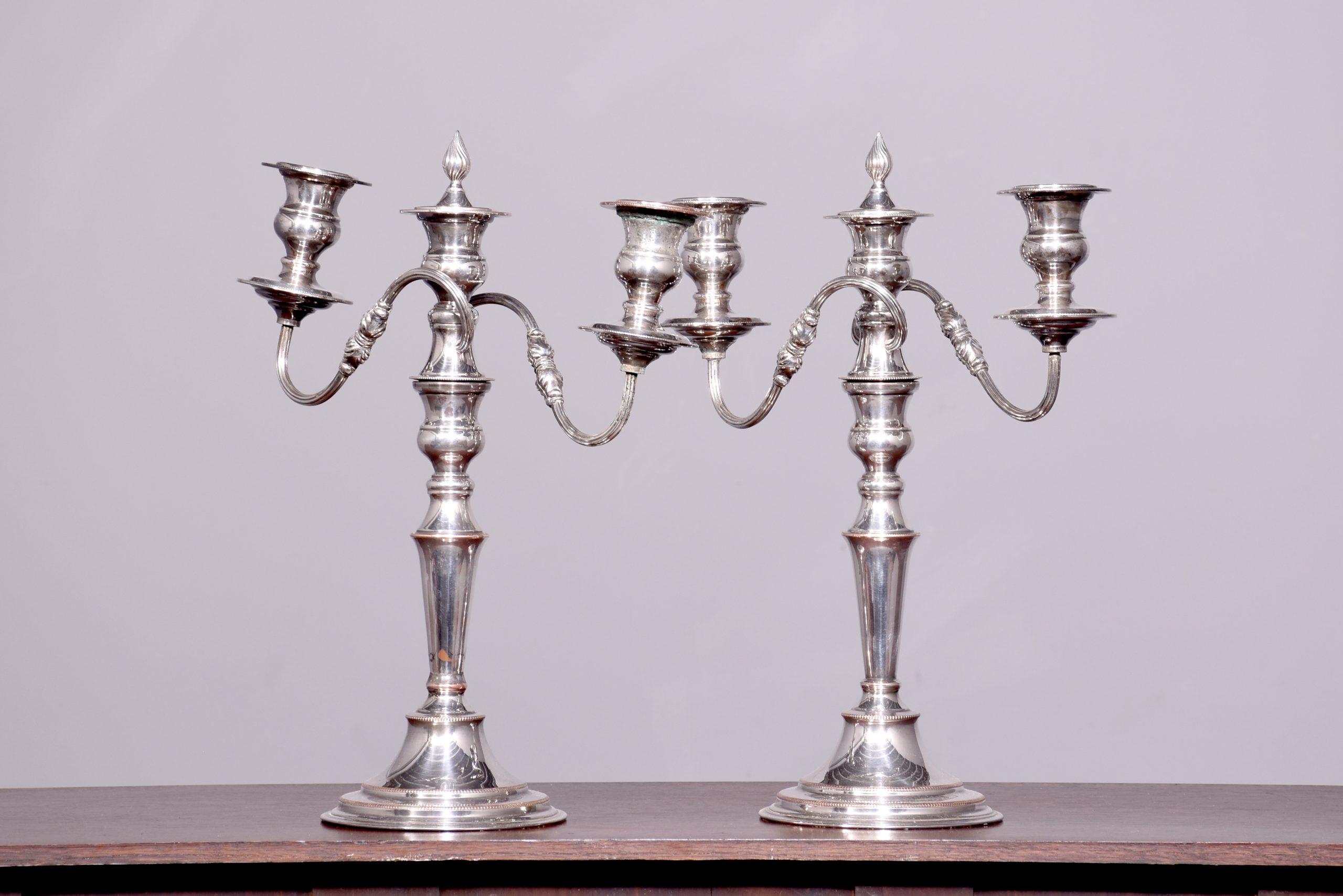 Circa 1890. A pair of Electroplated Nickel Silver (EPNS) candelabra, the central turned stem surmounted by a removable finial, the edges with fine decoration, issuing two shaped arms which support two candle holders with similar drip trays and removable nozzles, the candelabra can be used in 3 combinations