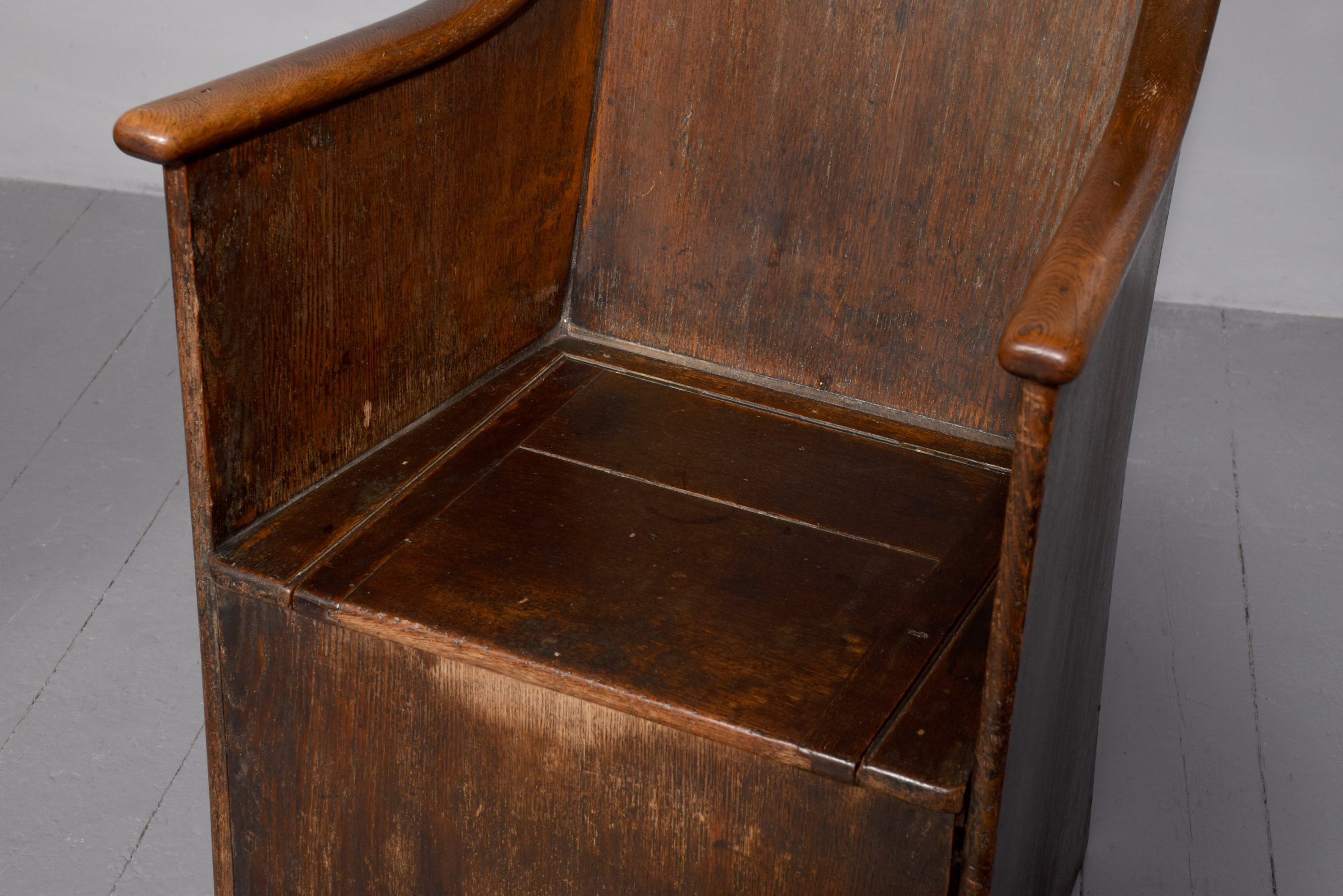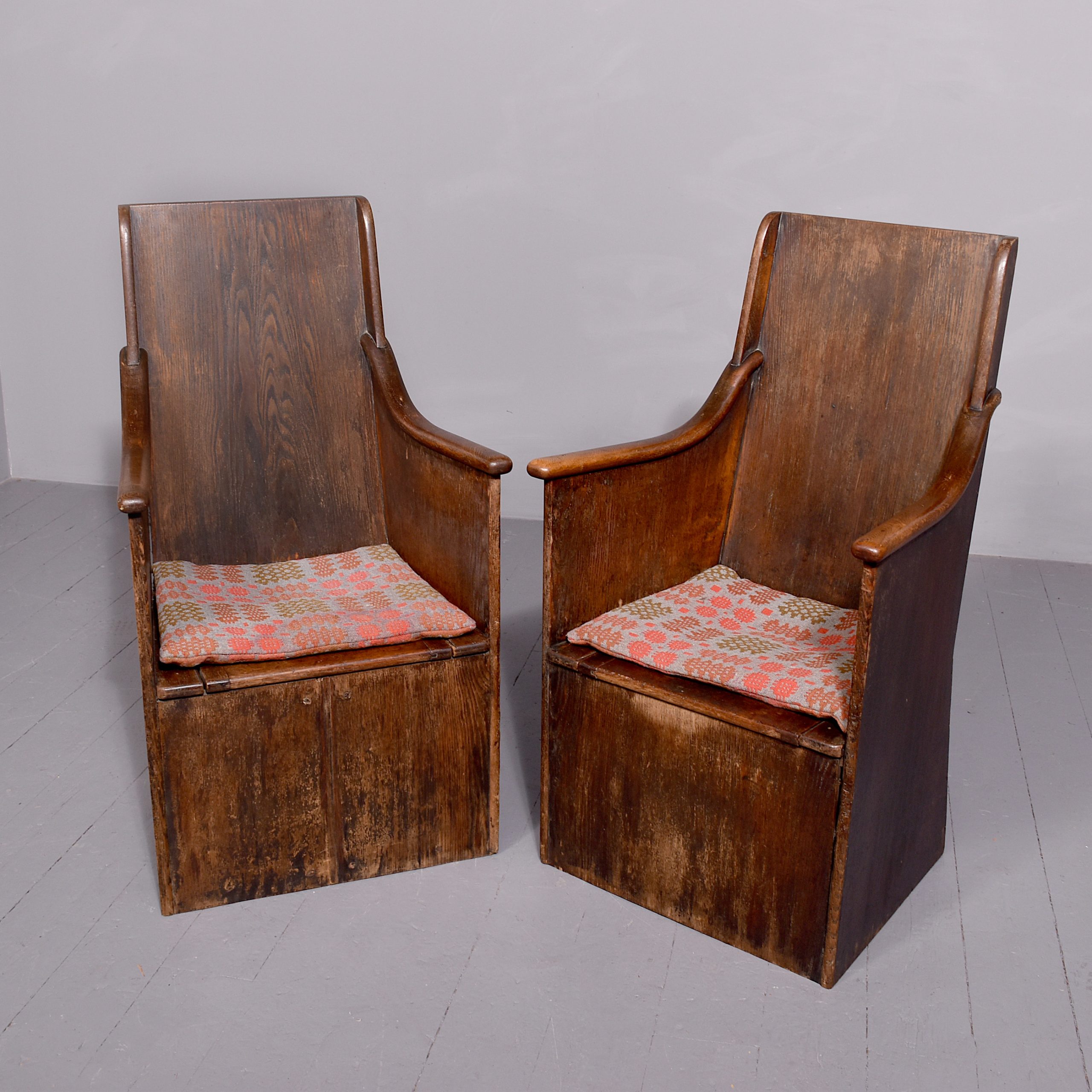 Circa 1860. A stylish pair of solid oak seat hall seats, the solid rectangular back with a flat fore-edge, the front with a shaped molding, the two shaped arms supported on solid gables, the seat which is hinged and opens to reveal interior with no bottom, each of the chairs comes with a hand-woven needle-point removable cushion, the fronts and sides all sit flush to the floor.
