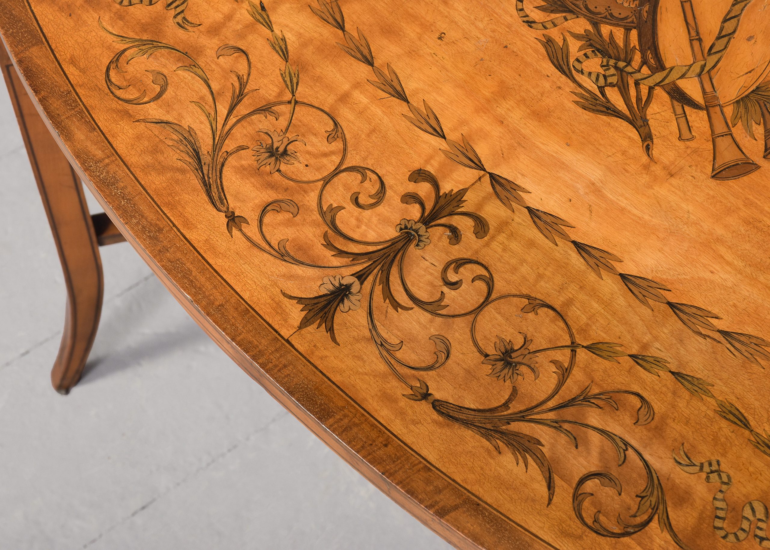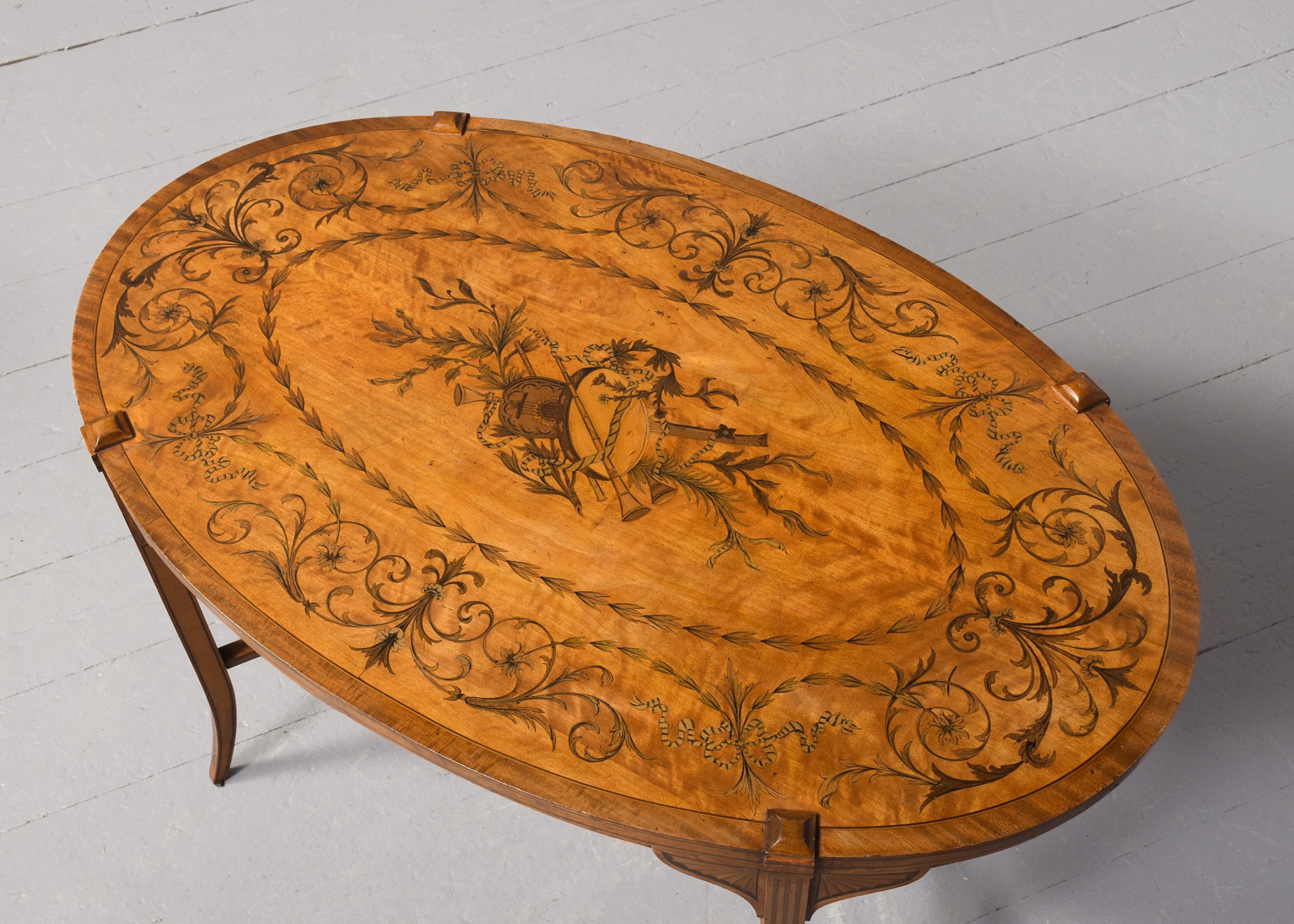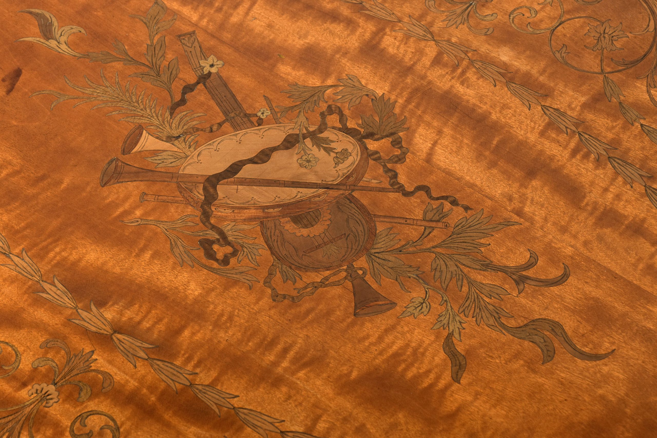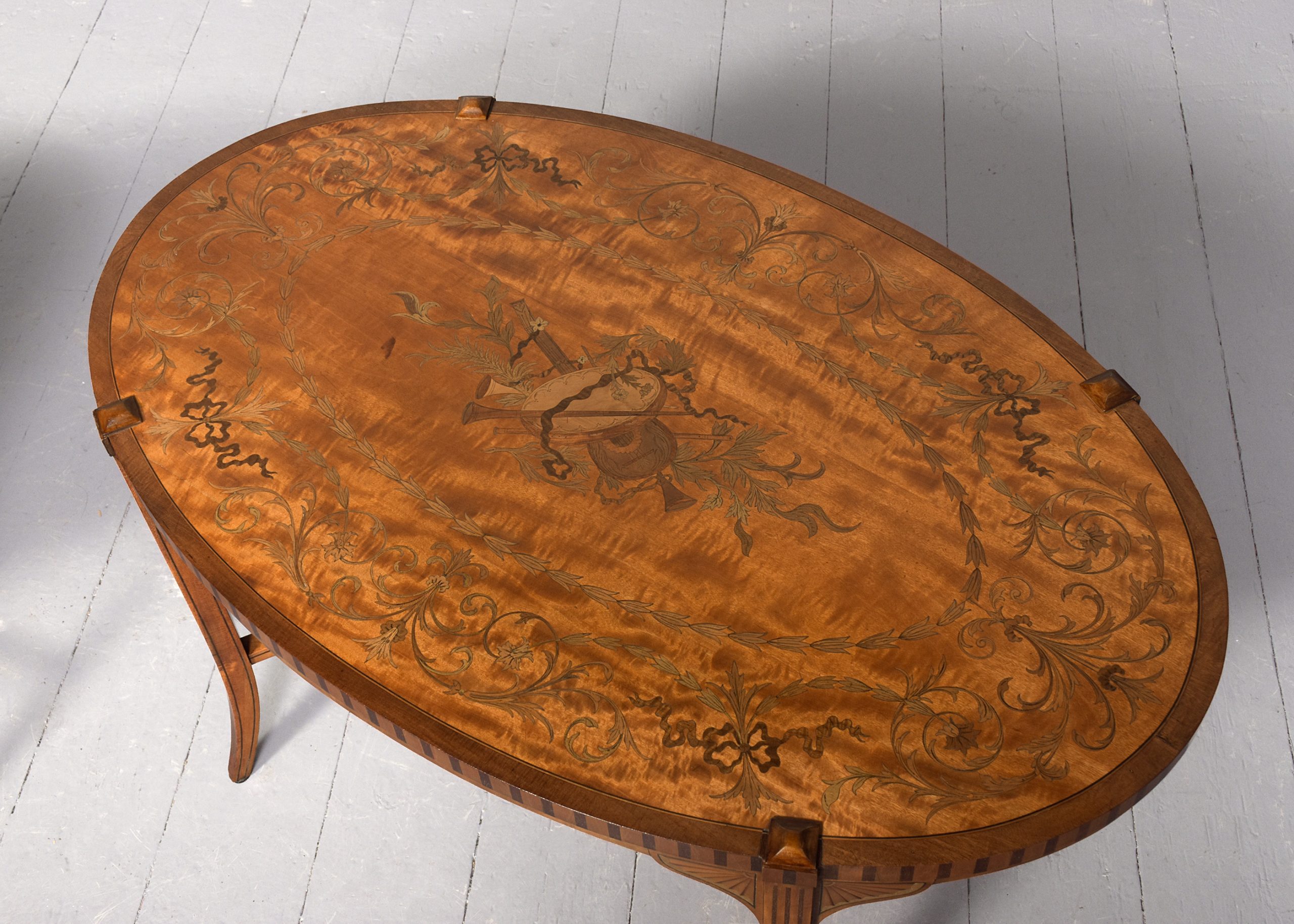 Circa 1890. Pair of superb quality late Victorian marquetry inlaid satinwood coffee tables by Edwards and Roberts, Picadilly, London. The oval tops with mahogany boxwood and ebony banding and central satinwood panels with exquisite marquetry inlay of musical instruments, surrounded by husk chains and ribbon-bound foliate garlands. With chequered fore-edges over inlaid splayed feet with crinoline under-stretchers. Bearing label ‘Edwards and Roberts, Picadilly, London’.
