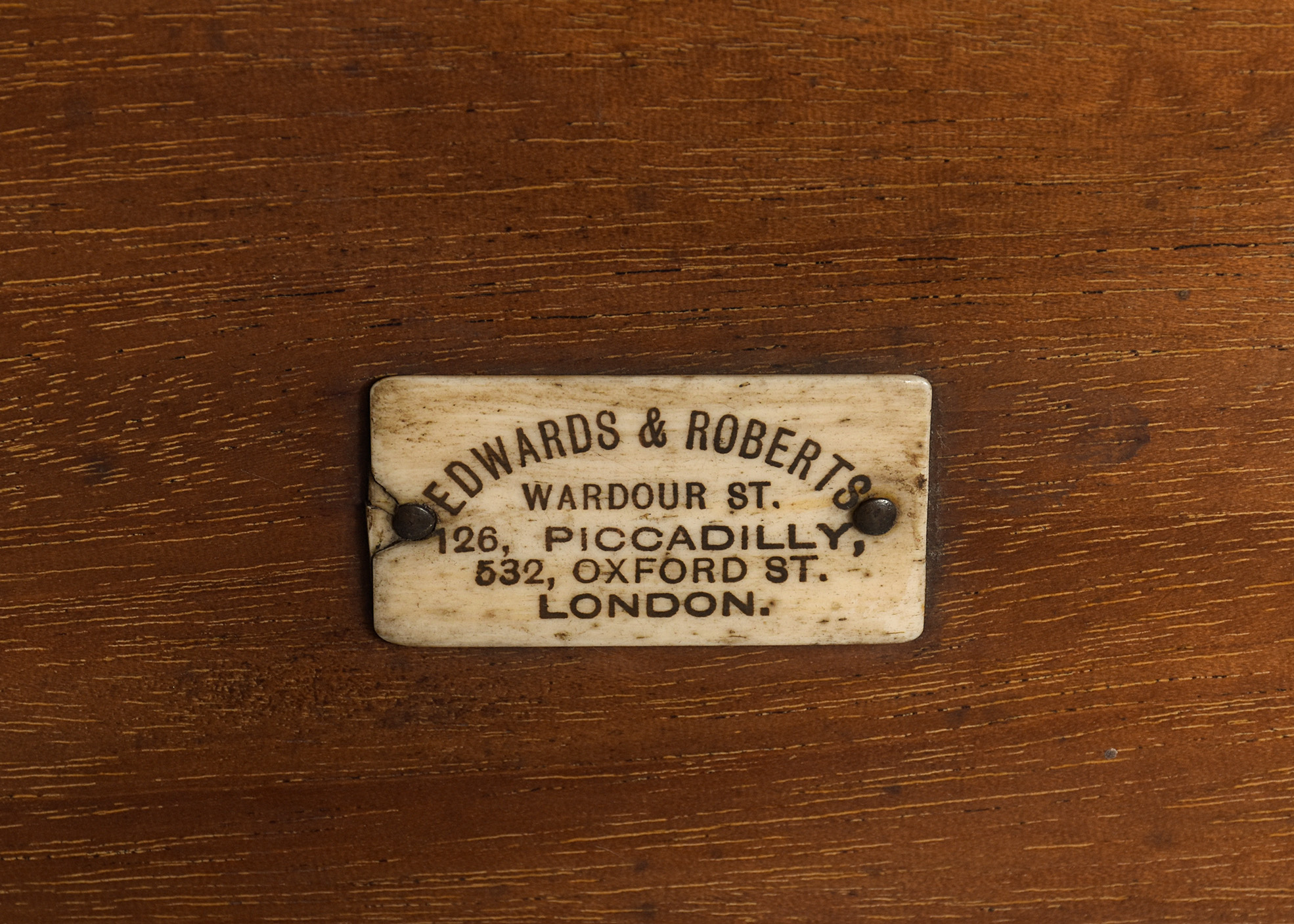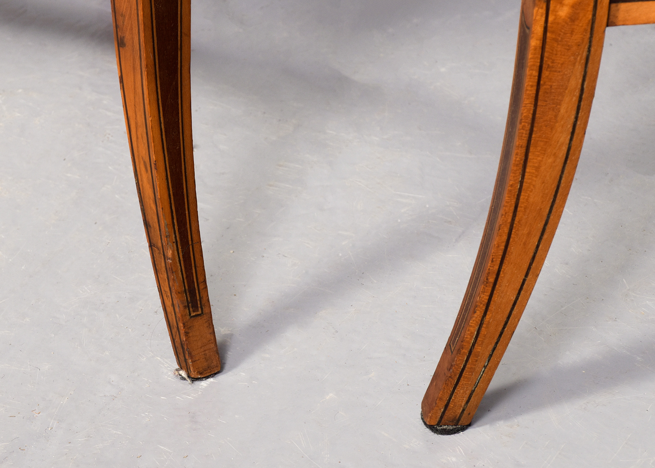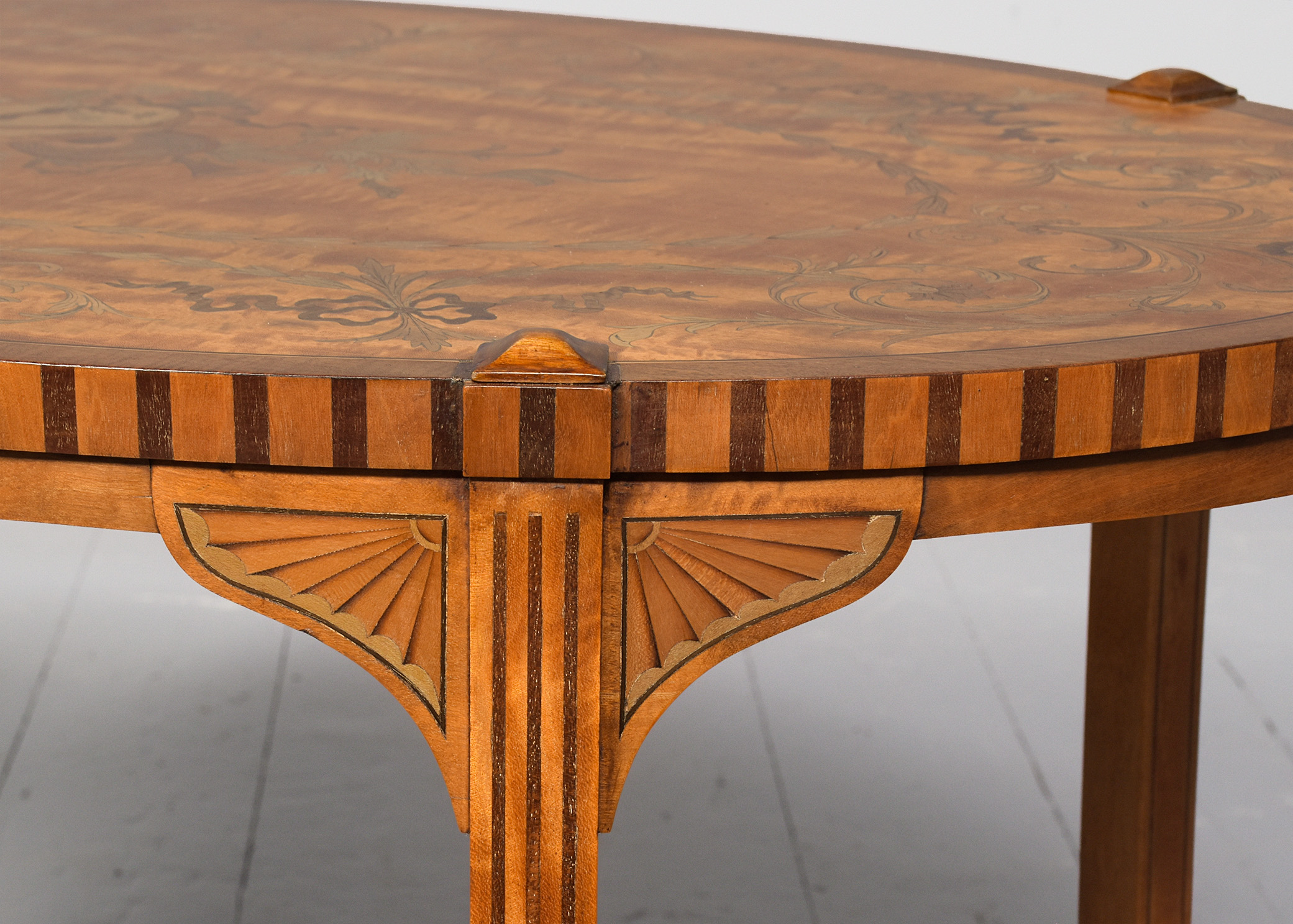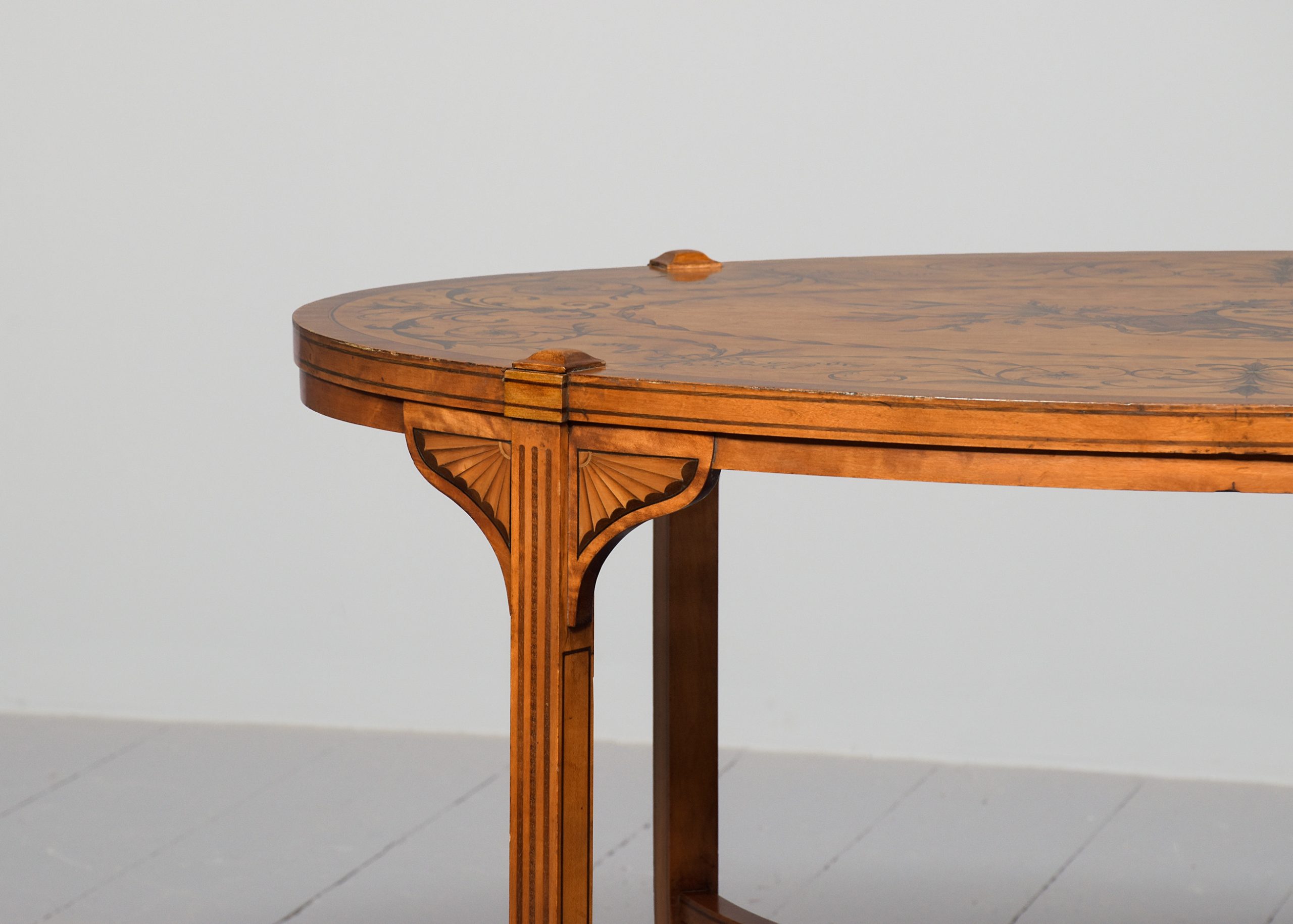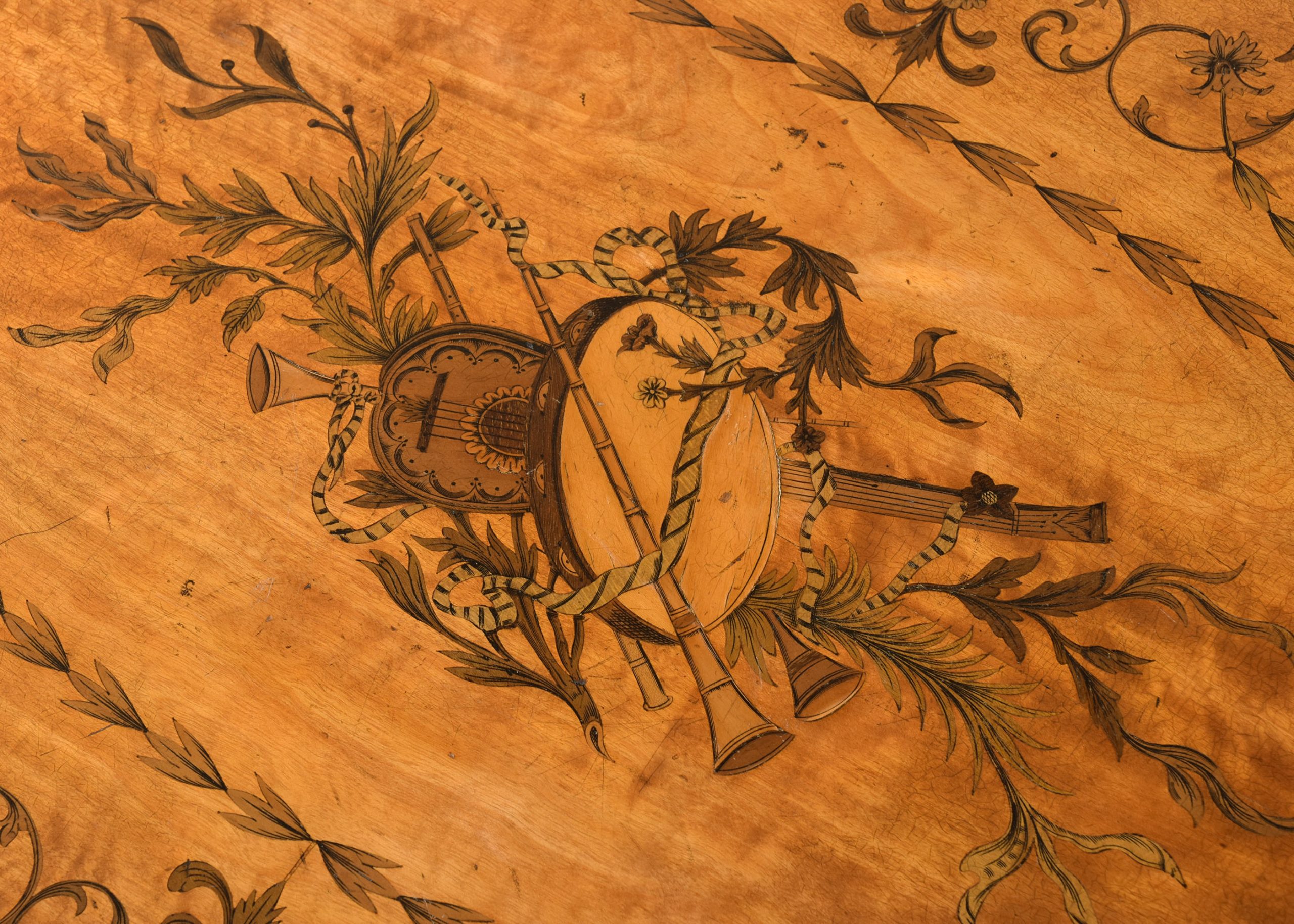 Circa 1890. Pair of superb quality late Victorian marquetry inlaid satinwood coffee tables by Edwards and Roberts, Picadilly, London. The oval tops with mahogany boxwood and ebony banding and central satinwood panels with exquisite marquetry inlay of musical instruments, surrounded by husk chains and ribbon-bound foliate garlands. With chequered fore-edges over inlaid splayed feet with crinoline under-stretchers. Bearing label ‘Edwards and Roberts, Picadilly, London’.