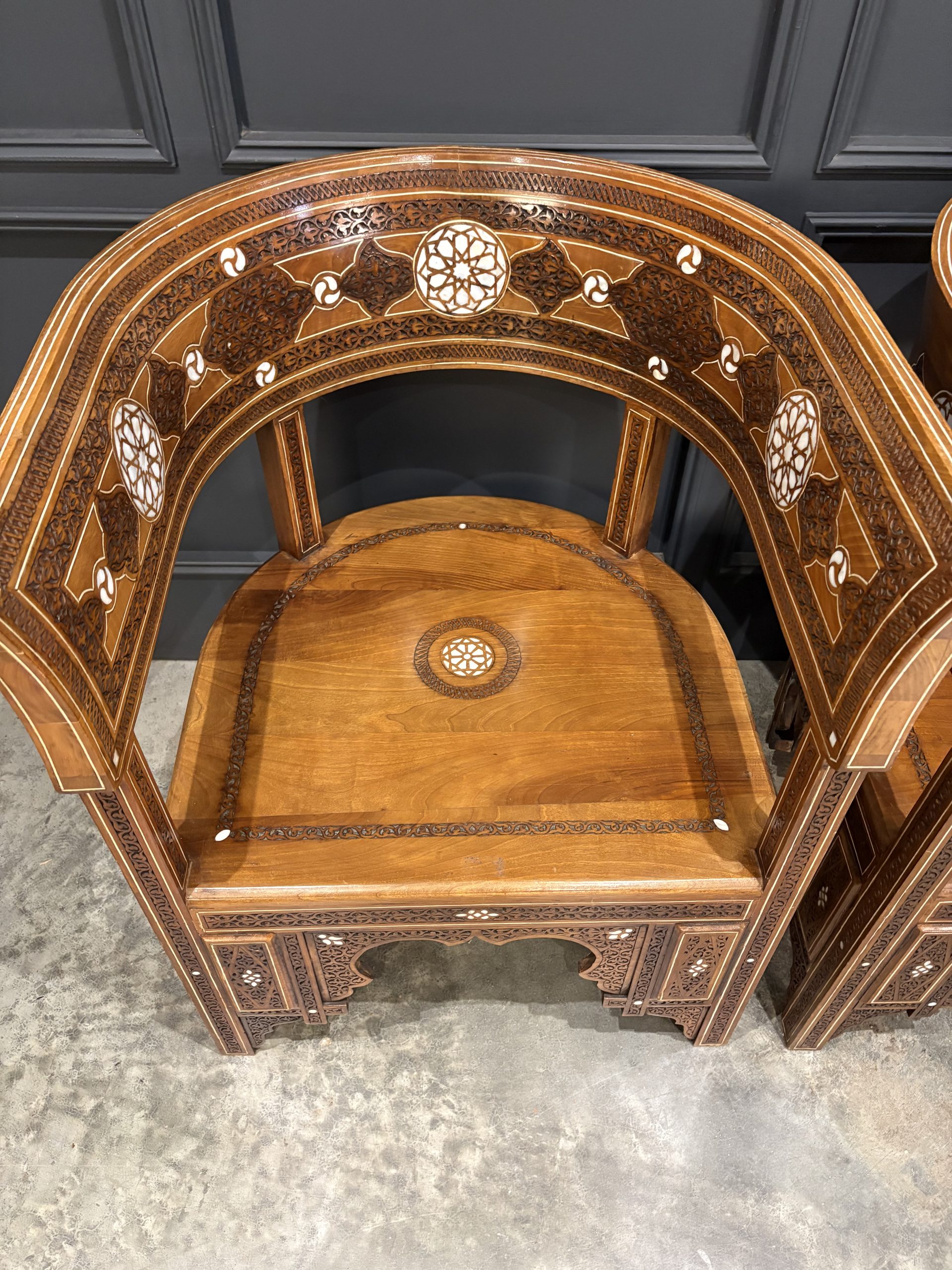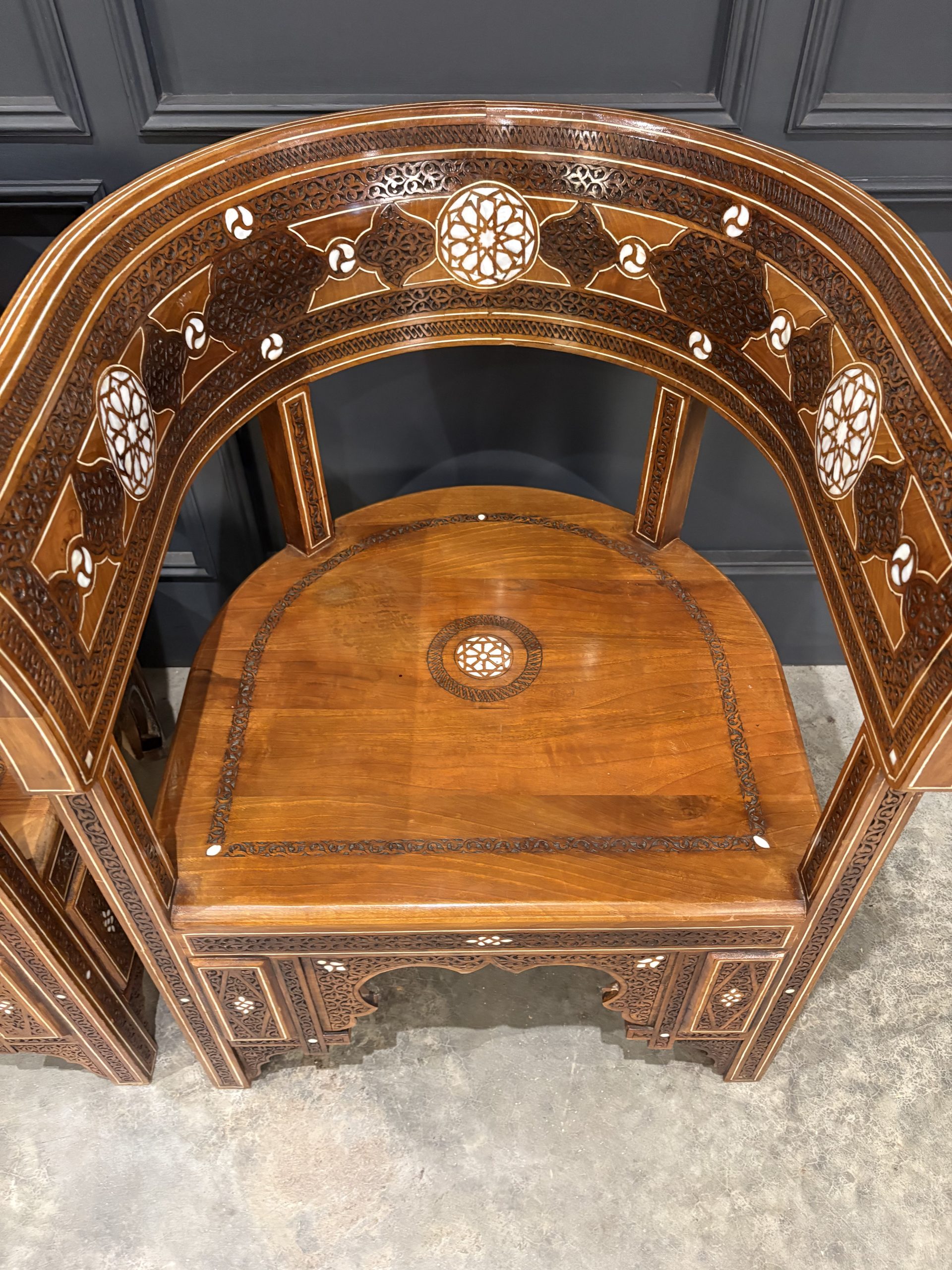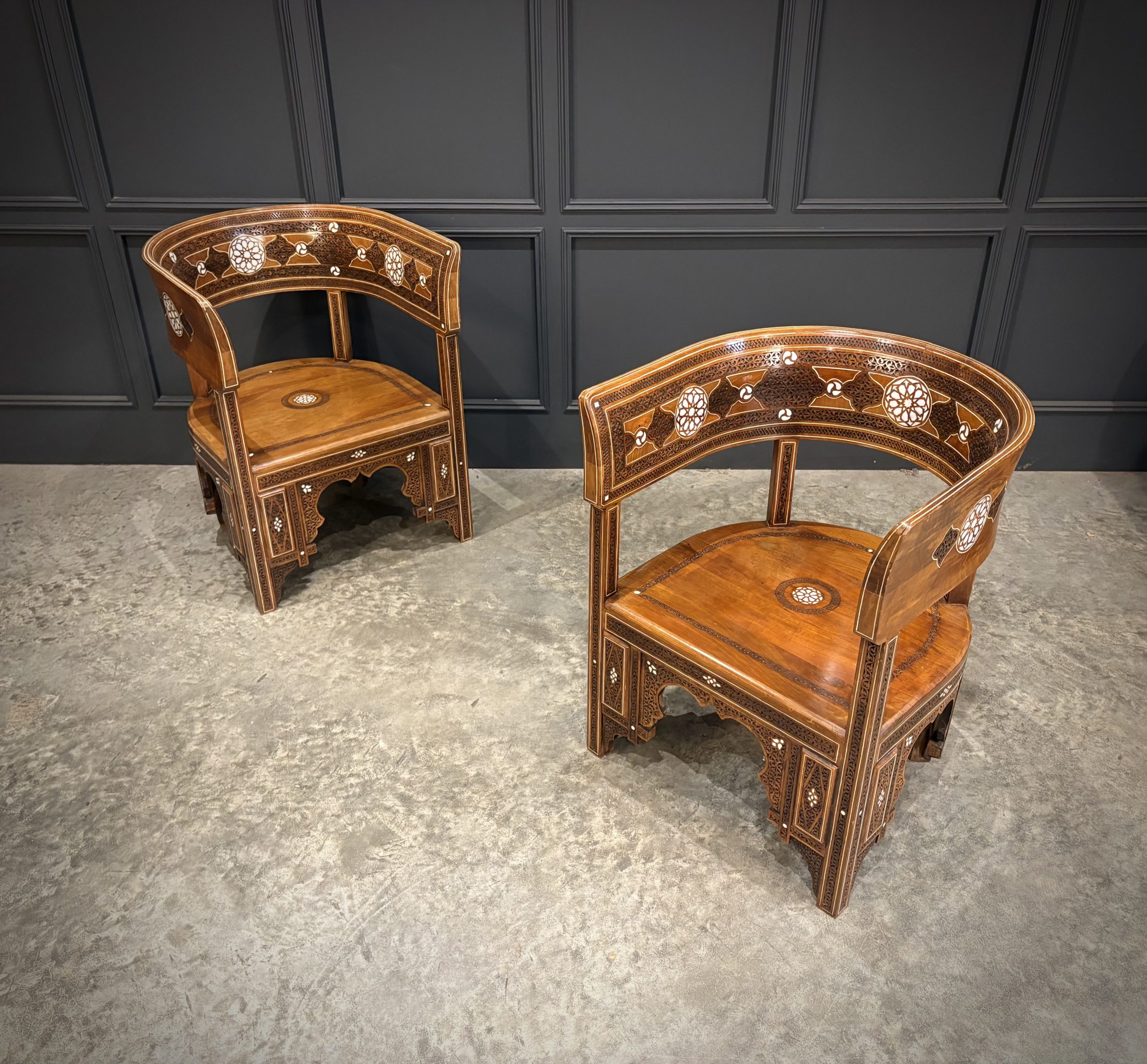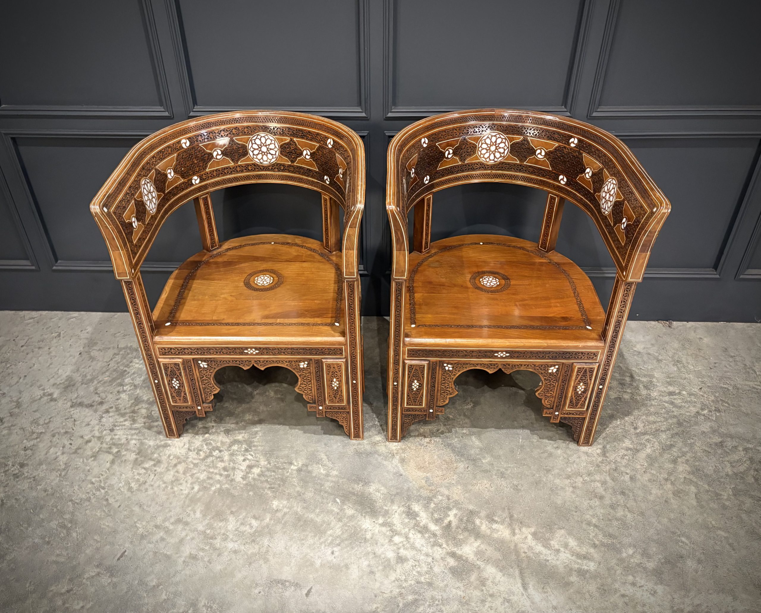 A decorative pair of Syrian walnut armchairs, each finely inlaid with mother-of-pearl geometric and floral patterns.