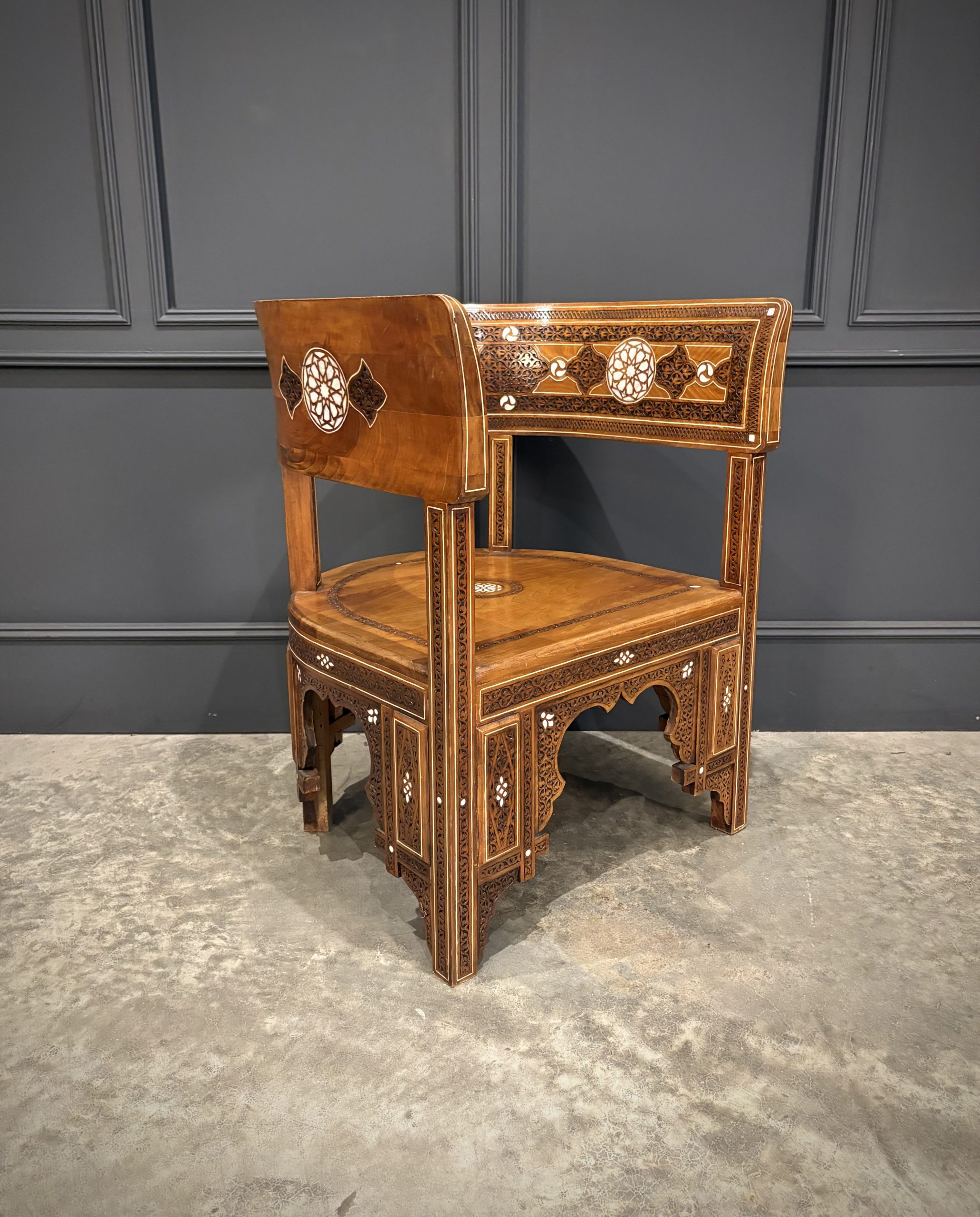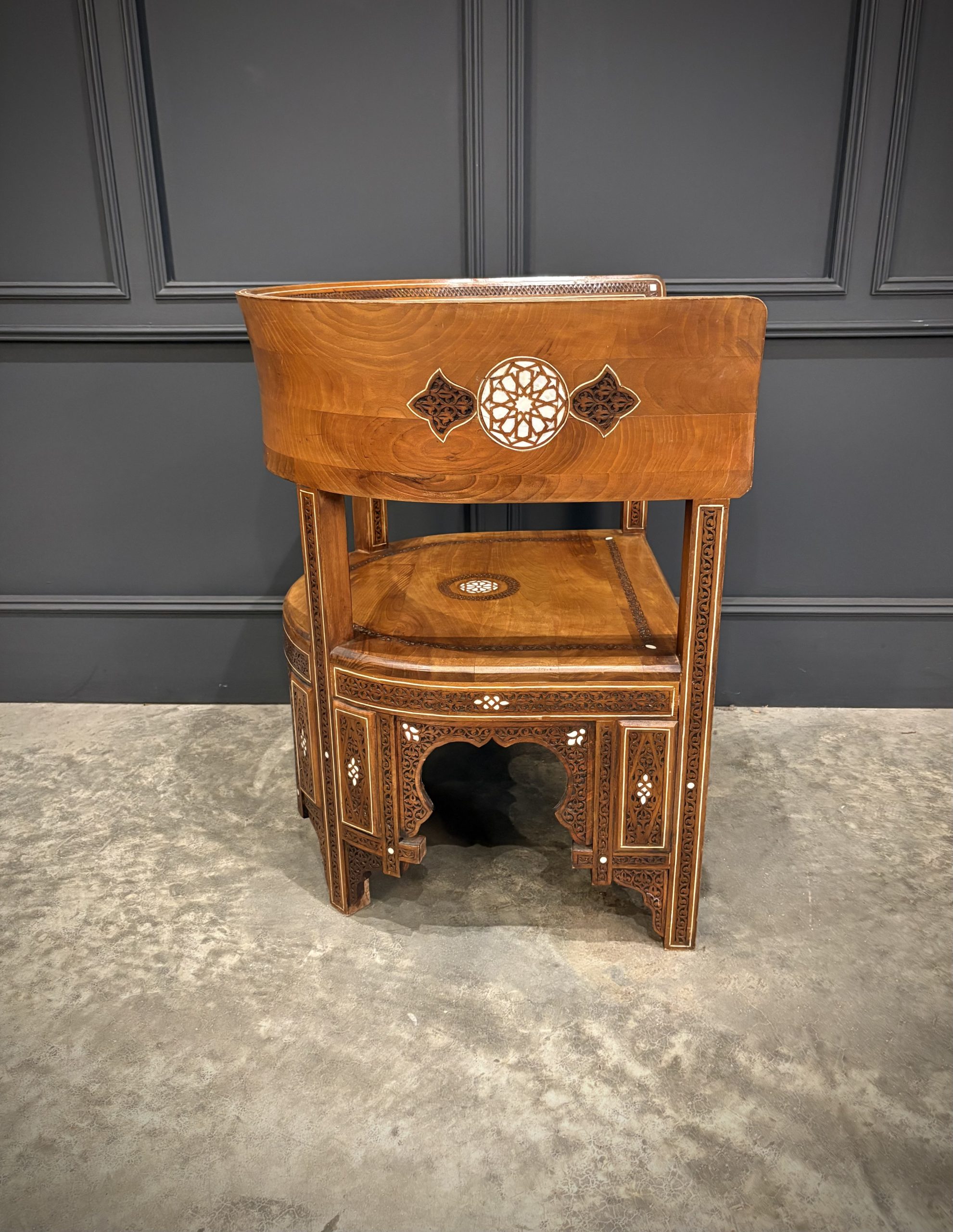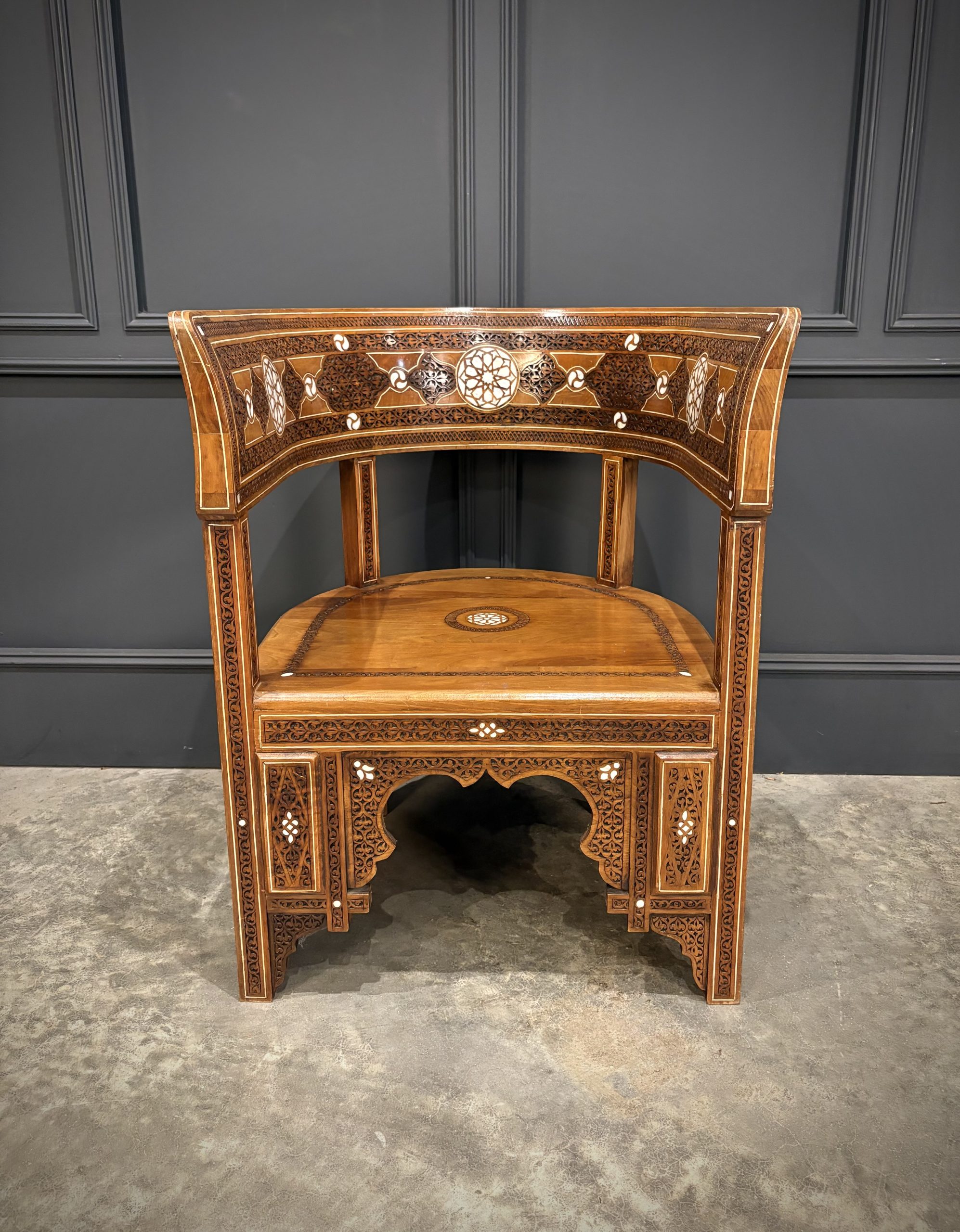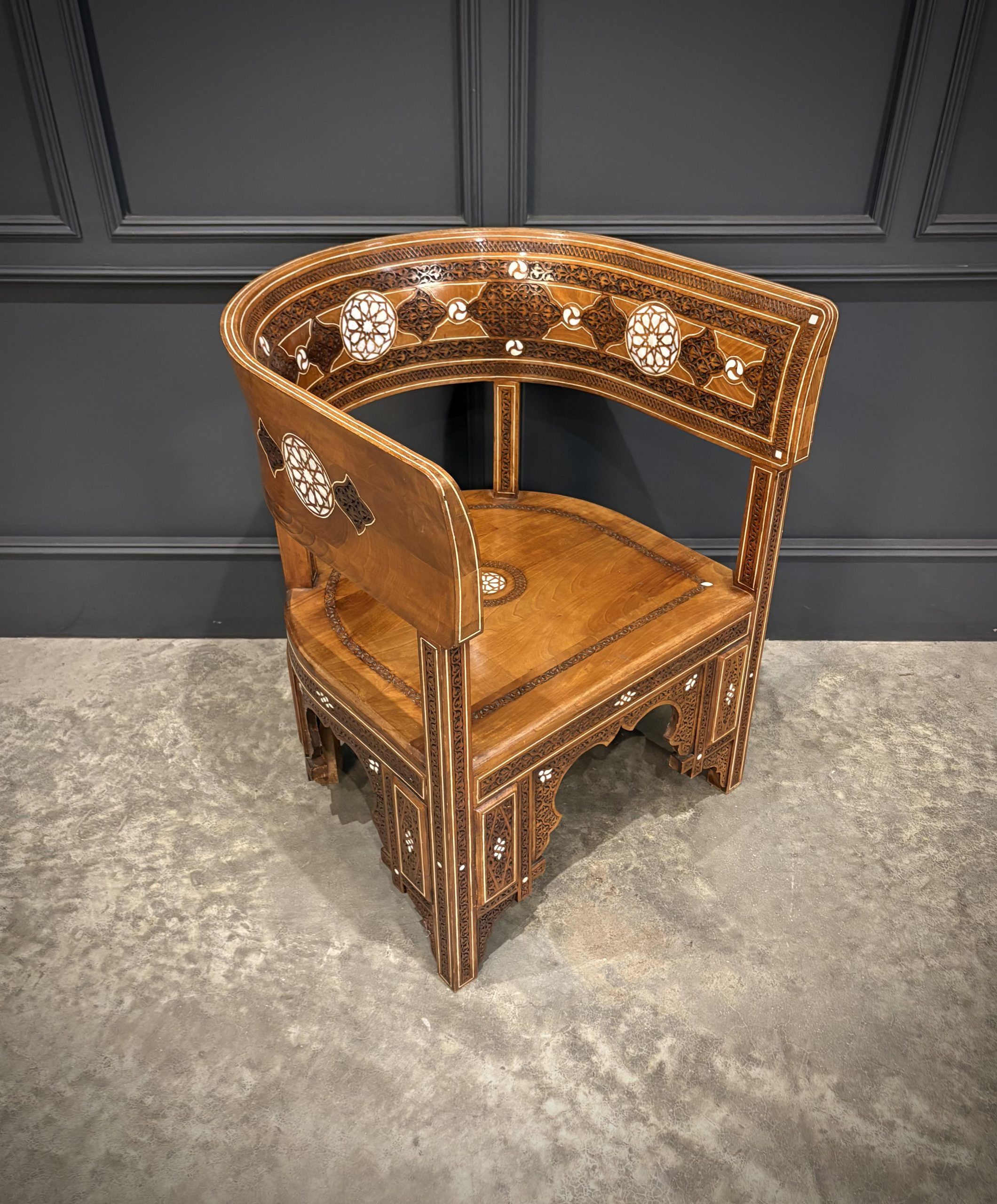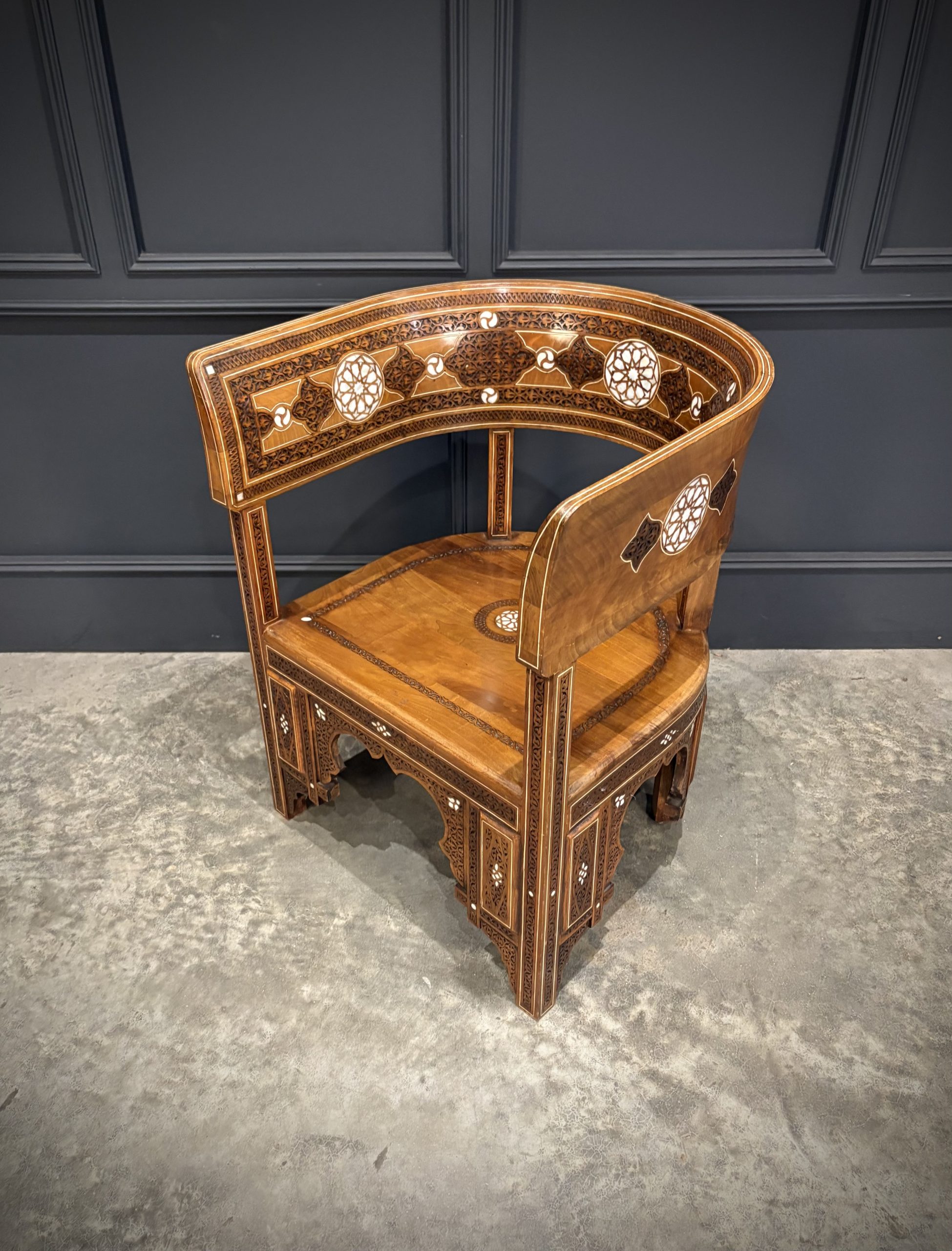 A decorative pair of Syrian walnut armchairs, each finely inlaid with mother-of-pearl geometric and floral patterns.